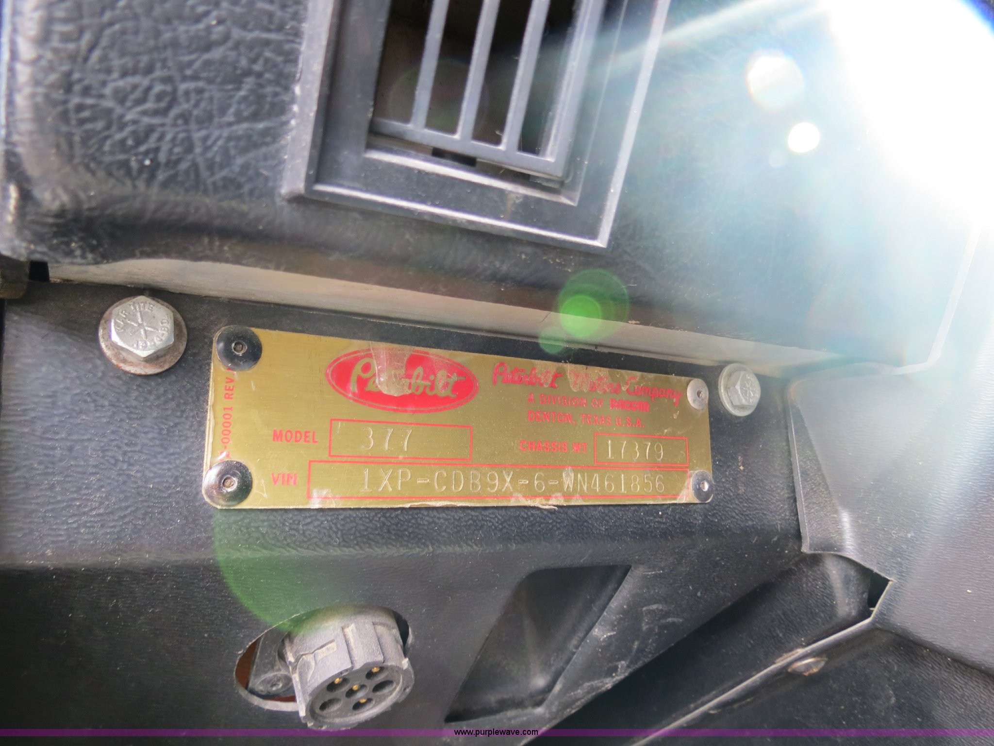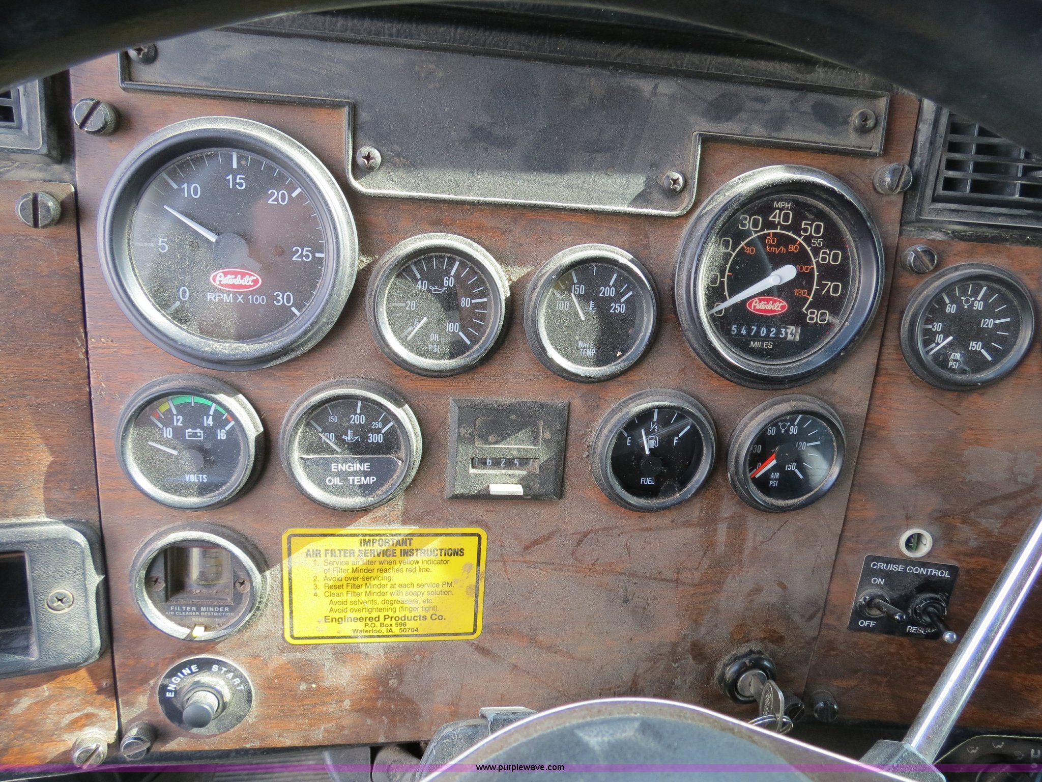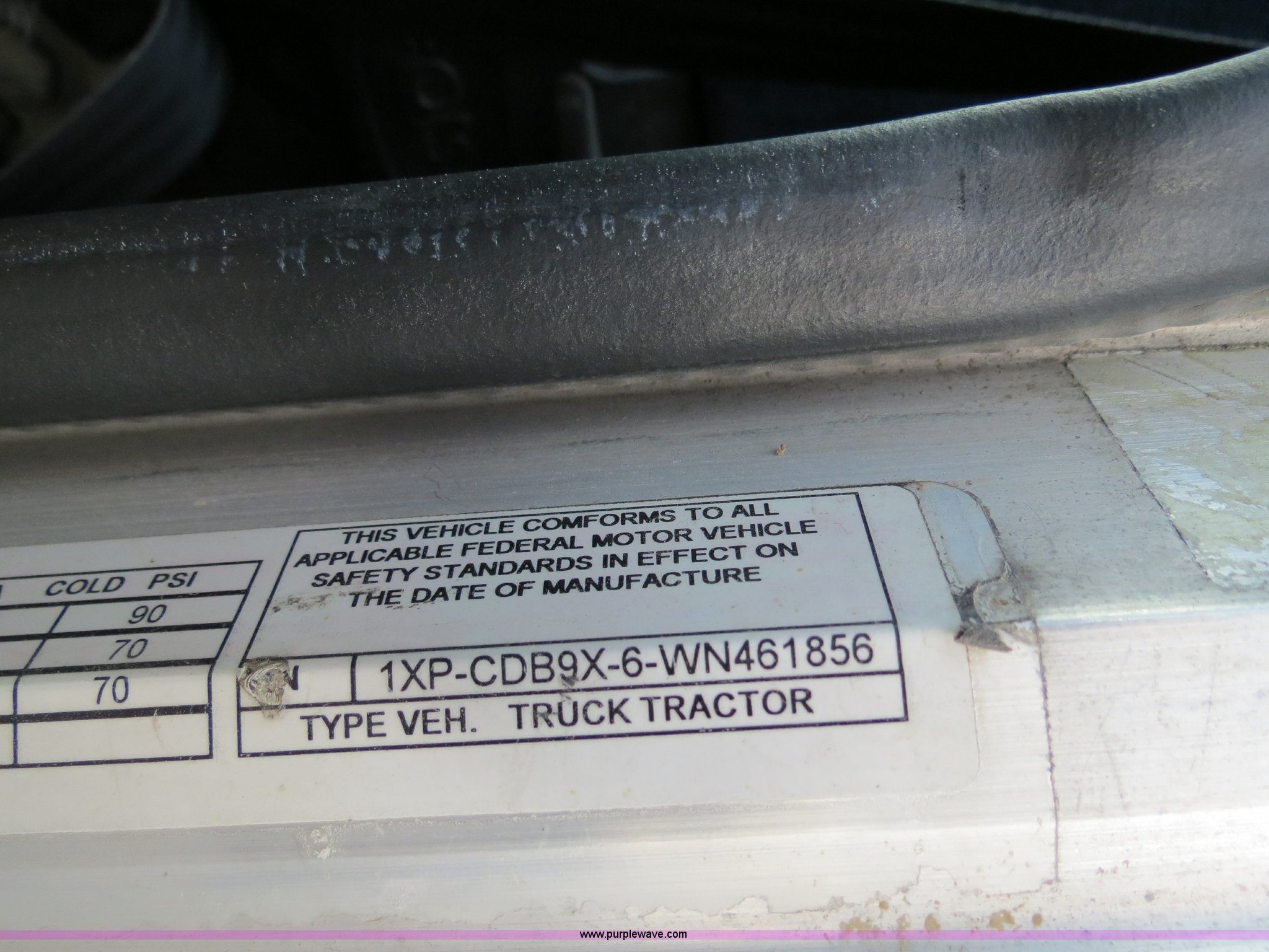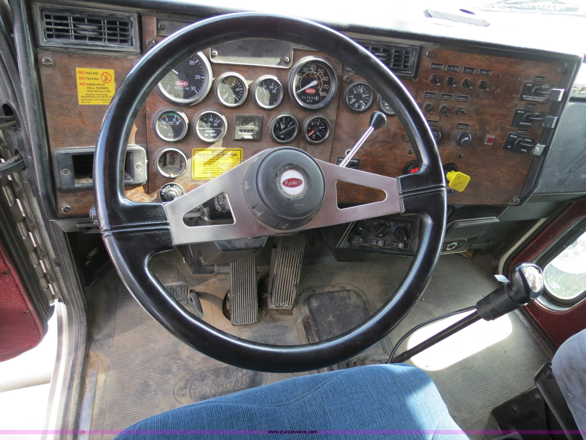 Purple Wave is selling a used Truck Tractor in Texas. This item is a 1998 Peterbilt 377 semi truck with the following: 1,547,023 miles on odometer, Caterpillar 3406 14.6L diesel engine, 435 HP, Serial 1LW04309, Eaton Fuller 10 speed manual transmission, Model FRO16210C, Twin screw, AC and heat, Cruise, AM/FM/CD, Passenger daylight door, Air suspension seat, Power and heated mirrors, Air ride cab, Single bunk sleeper, Storage, Visor, Chrome bumper, Air slide fifth wheel, Dual 110 gallon fuel tanks, Single rear exhaust stack, Aluminum deck plate, Dump valves, Air suspension, Air brakes, 295/75R22.5 tires, GVWR 50,000 lbs, FAWR 12,000 lbs, IAWR 19,000 lbs, RAWR 19,000 lbs, 3.70 gear ratio, Unit# 9882