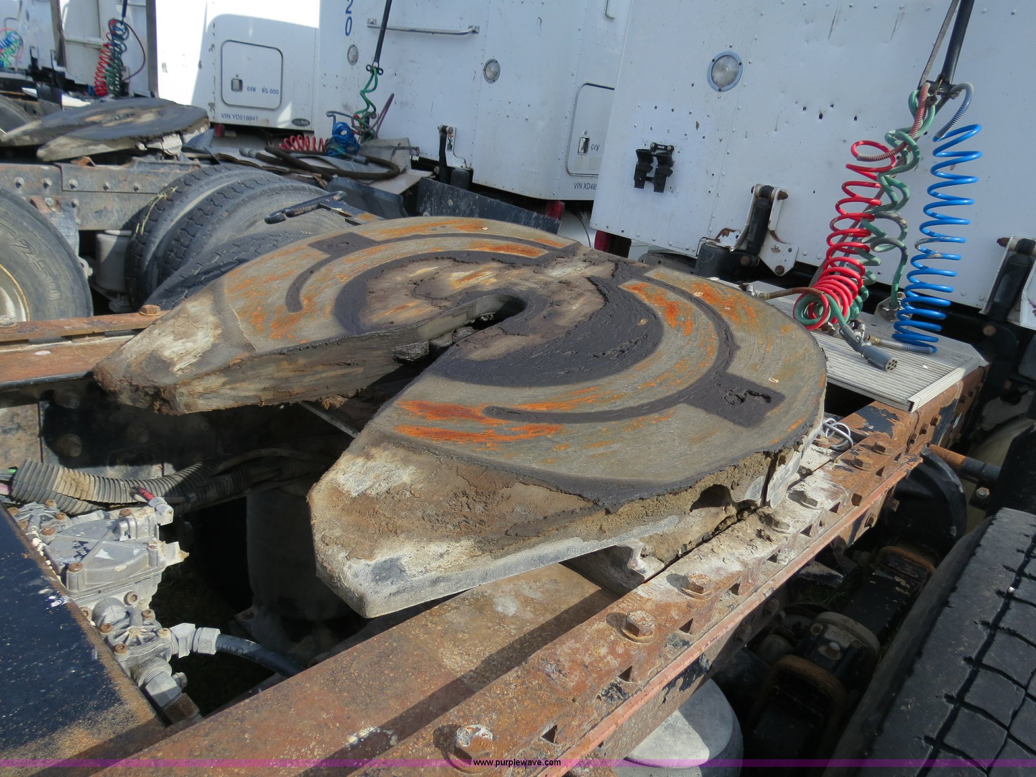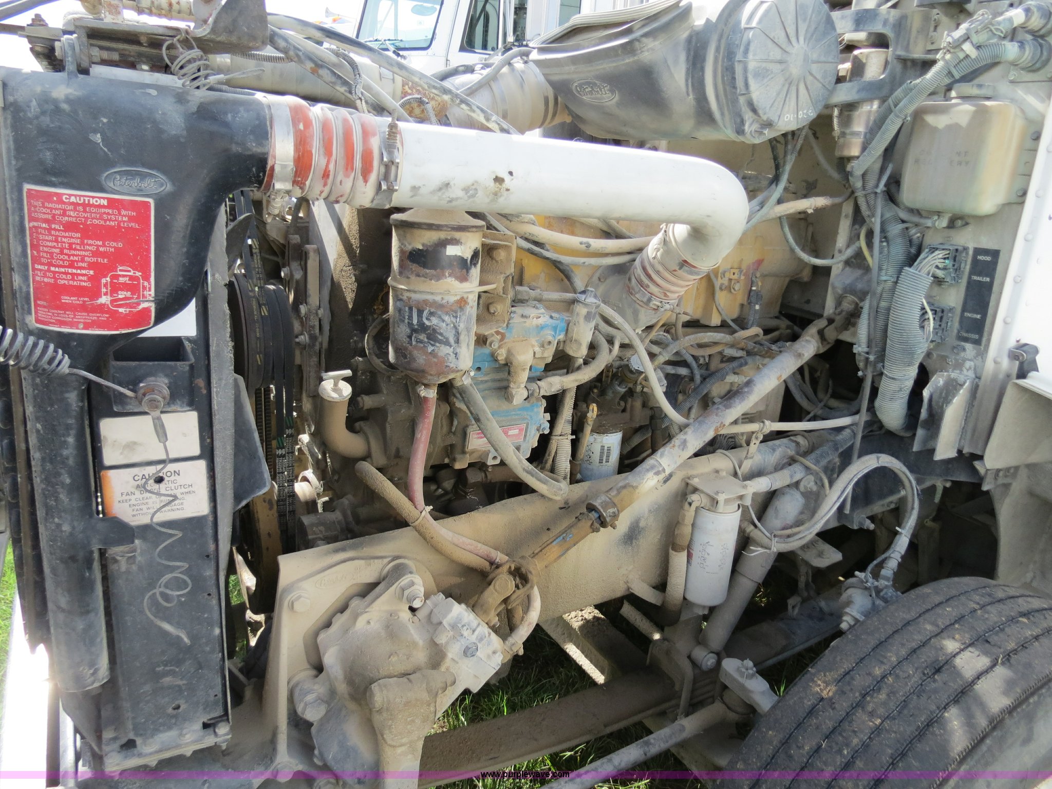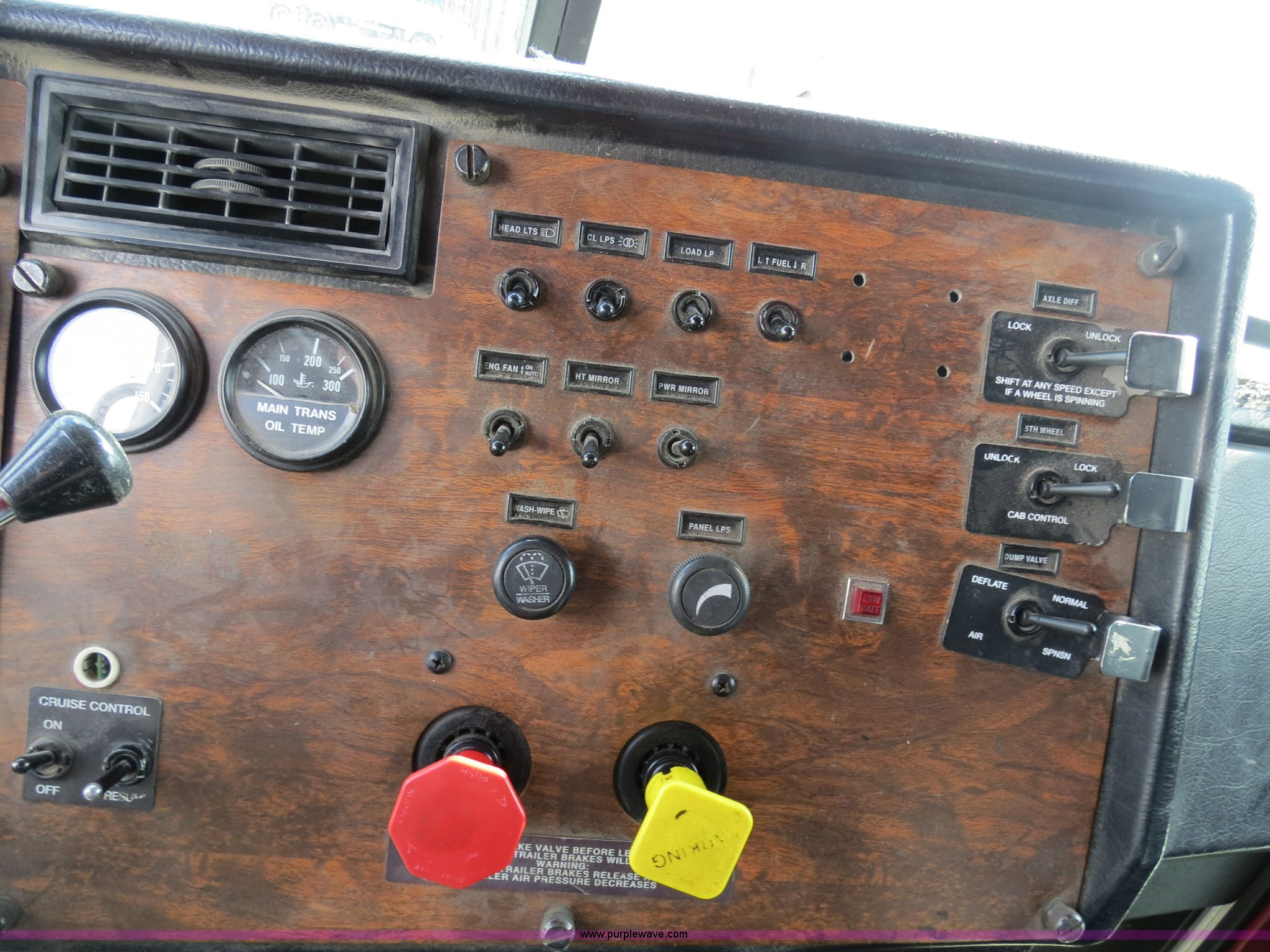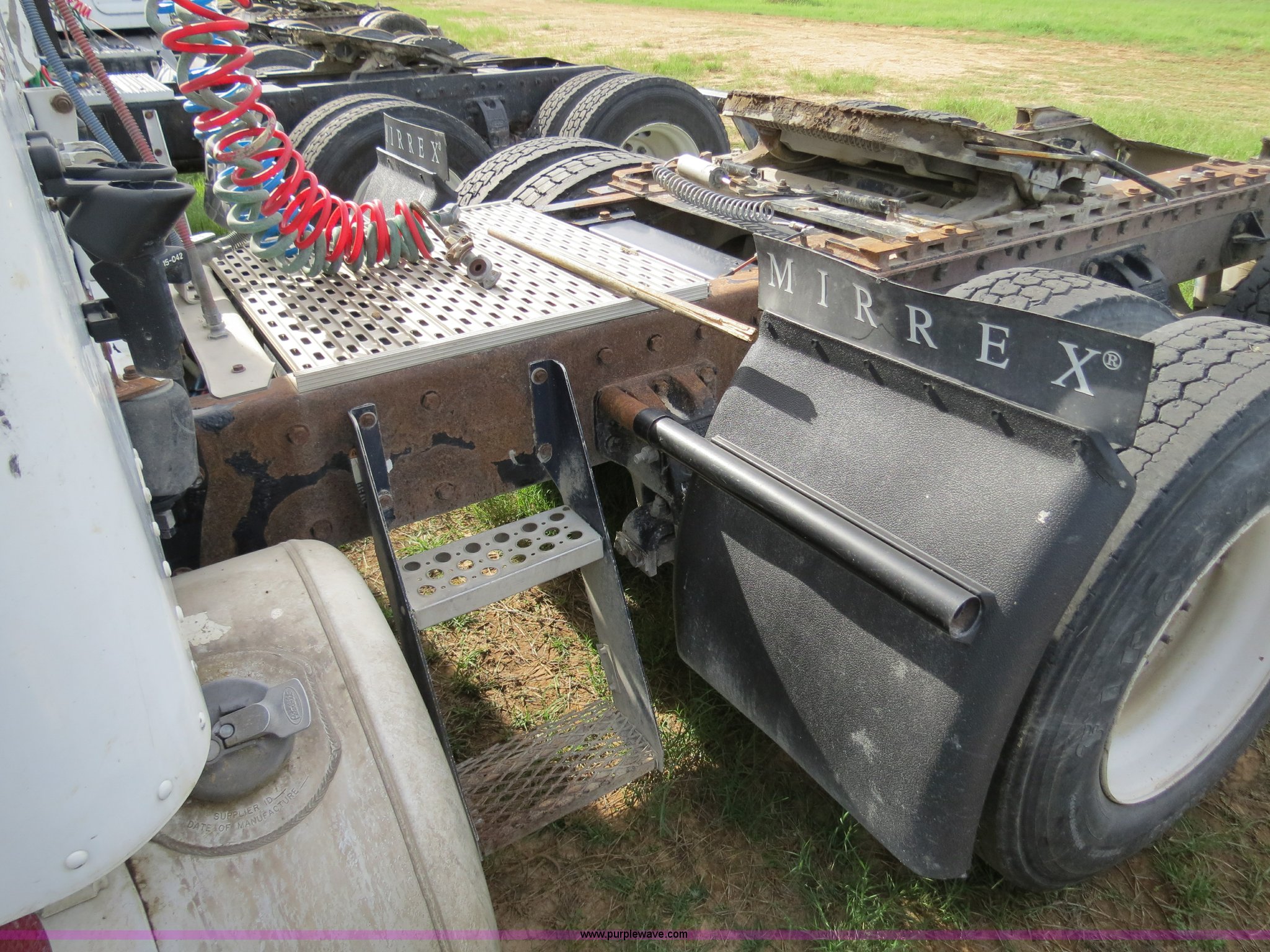 Purple Wave is selling a used Truck Tractor in Texas. This item is a 1998 Peterbilt 377 semi truck with the following: 1,547,023 miles on odometer, Caterpillar 3406 14.6L diesel engine, 435 HP, Serial 1LW04309, Eaton Fuller 10 speed manual transmission, Model FRO16210C, Twin screw, AC and heat, Cruise, AM/FM/CD, Passenger daylight door, Air suspension seat, Power and heated mirrors, Air ride cab, Single bunk sleeper, Storage, Visor, Chrome bumper, Air slide fifth wheel, Dual 110 gallon fuel tanks, Single rear exhaust stack, Aluminum deck plate, Dump valves, Air suspension, Air brakes, 295/75R22.5 tires, GVWR 50,000 lbs, FAWR 12,000 lbs, IAWR 19,000 lbs, RAWR 19,000 lbs, 3.70 gear ratio, Unit# 9882