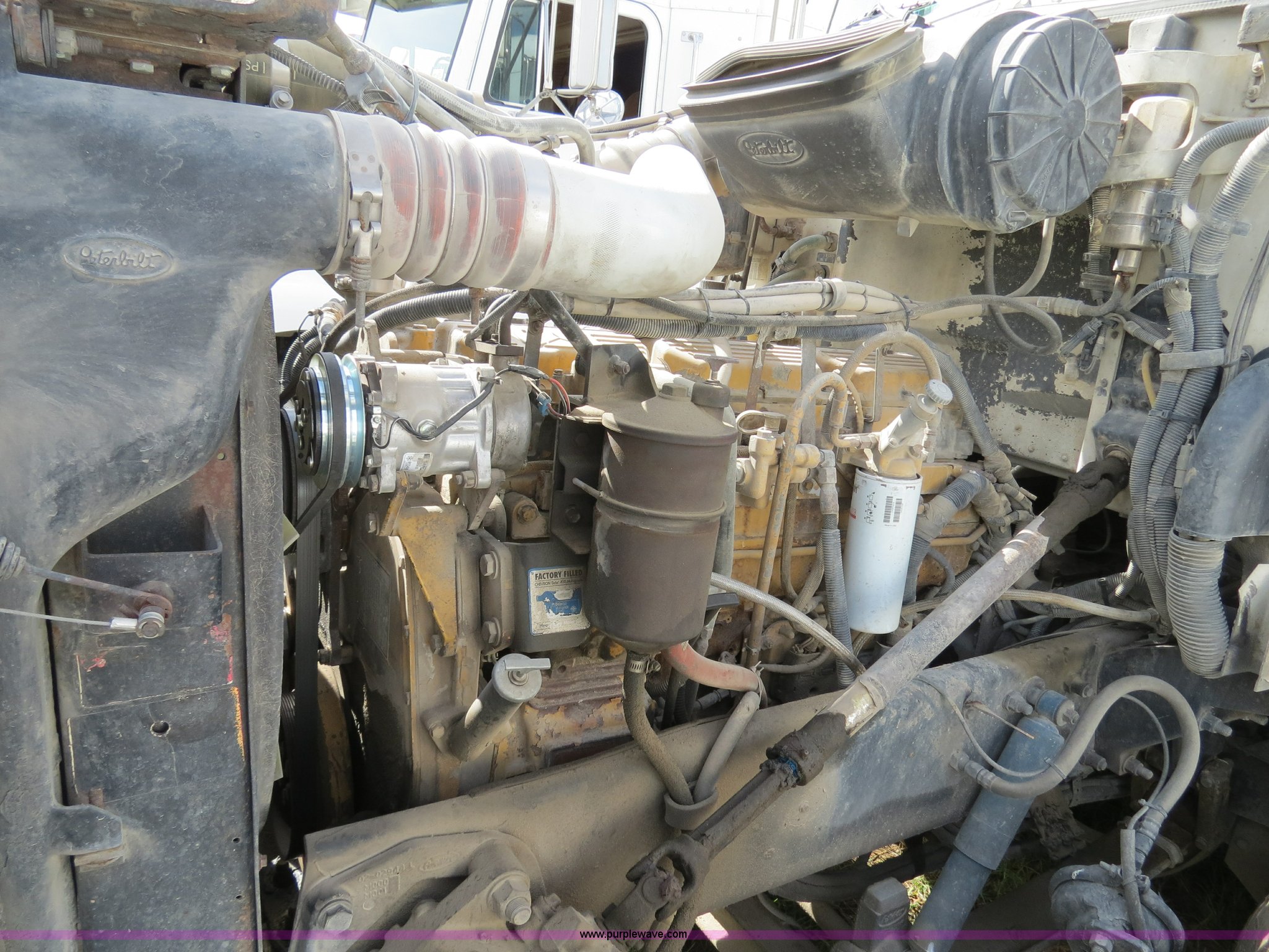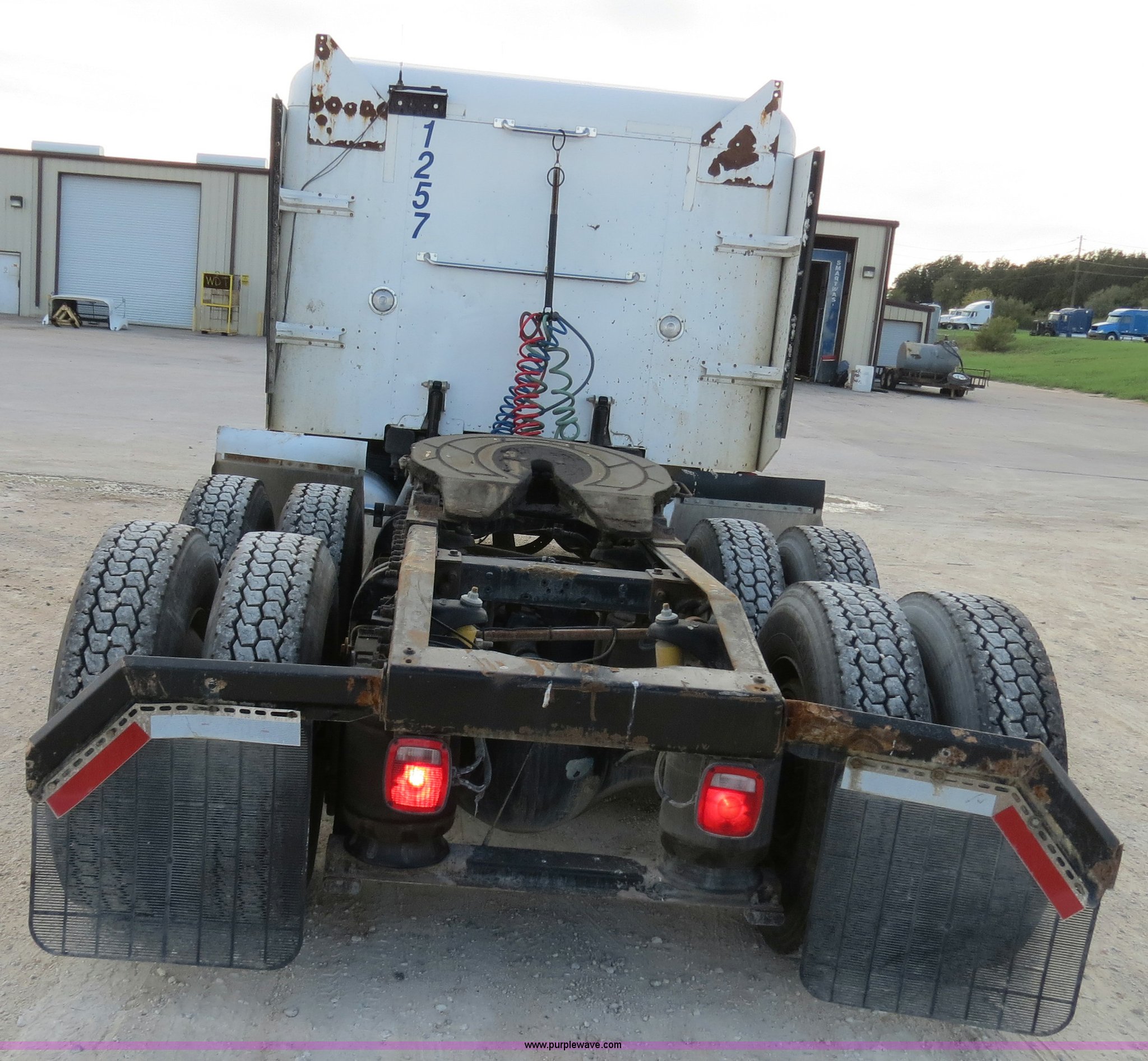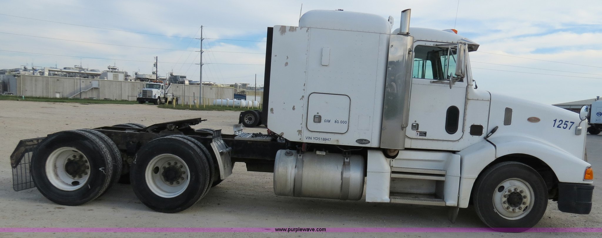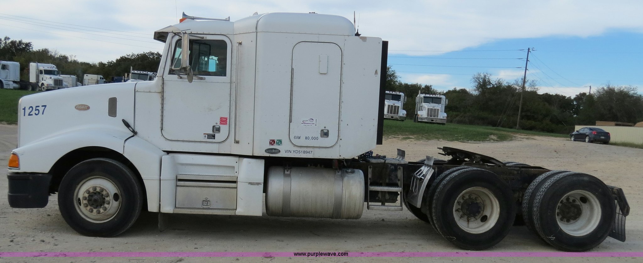 Purple Wave is selling a used Truck Tractor in Texas. This item is a 2000 Peterbilt 377 semi truck with the following: 1,185,969 miles on odometer, Caterpillar C12 12.0L diesel engine, 355 HP, Serial 2KS10984, Eaton Fuller 10 speed manual transmission, Model RTLO-14-610-BT2, Twin screw, AC and heat, Tilt, Cruise, AM/FM/cassette, Passenger daylight door, Air suspension seat, Heated mirrors, Air ride cab, Single bunk sleeper, Storage, Visor, Chrome bumper, Dual 110 gallon fuel tanks, Single rear exhaust stack, Aluminum deck plate, Dump valves, Air suspension, Air brakes, 295/75R22.5 tires, GVWR 50,000 lbs, FAWR 12,000 lbs, IAWR 19,000 lbs, RAWR 19,000 lbs, 3.70 gear ratio, Unit# 1257