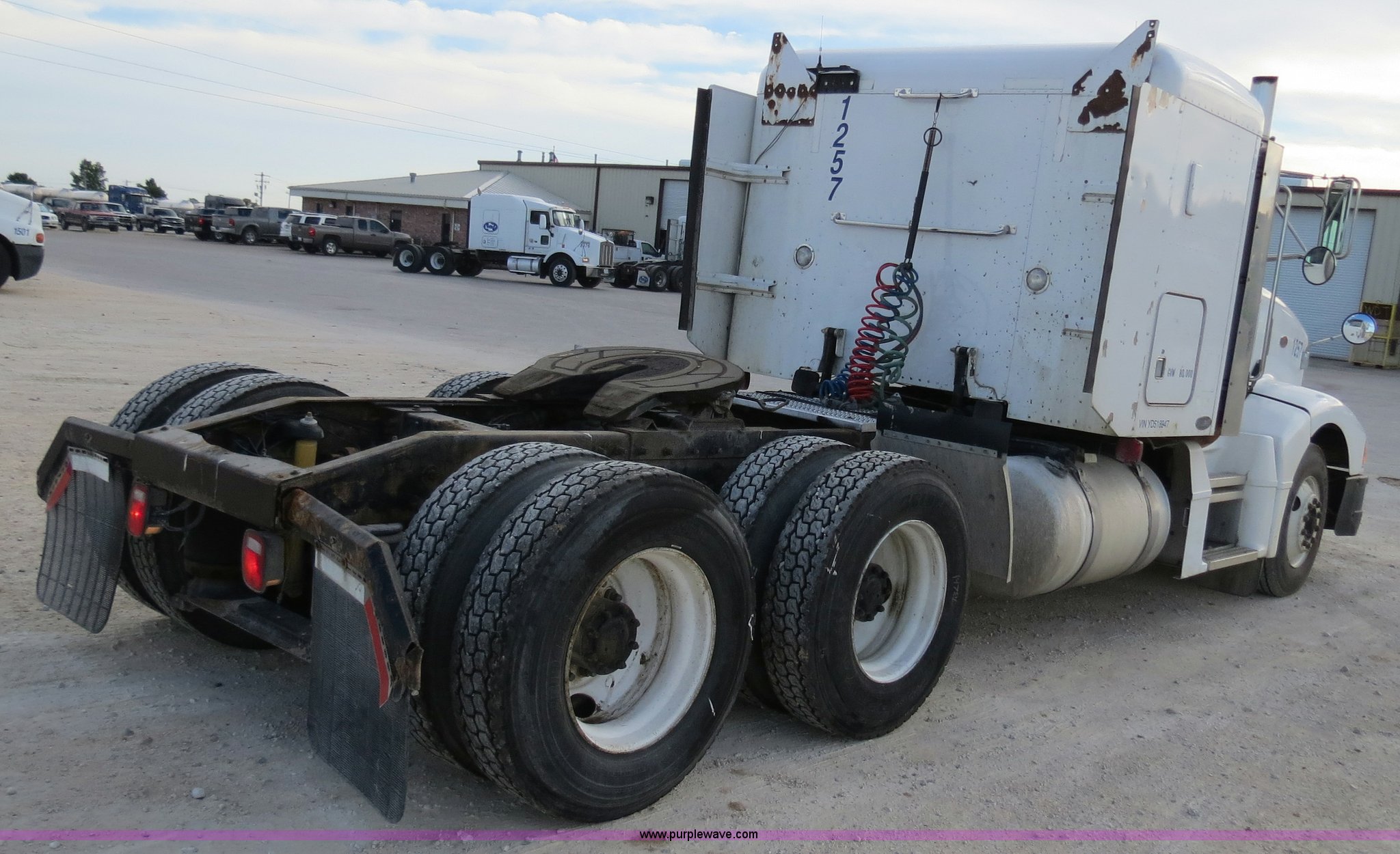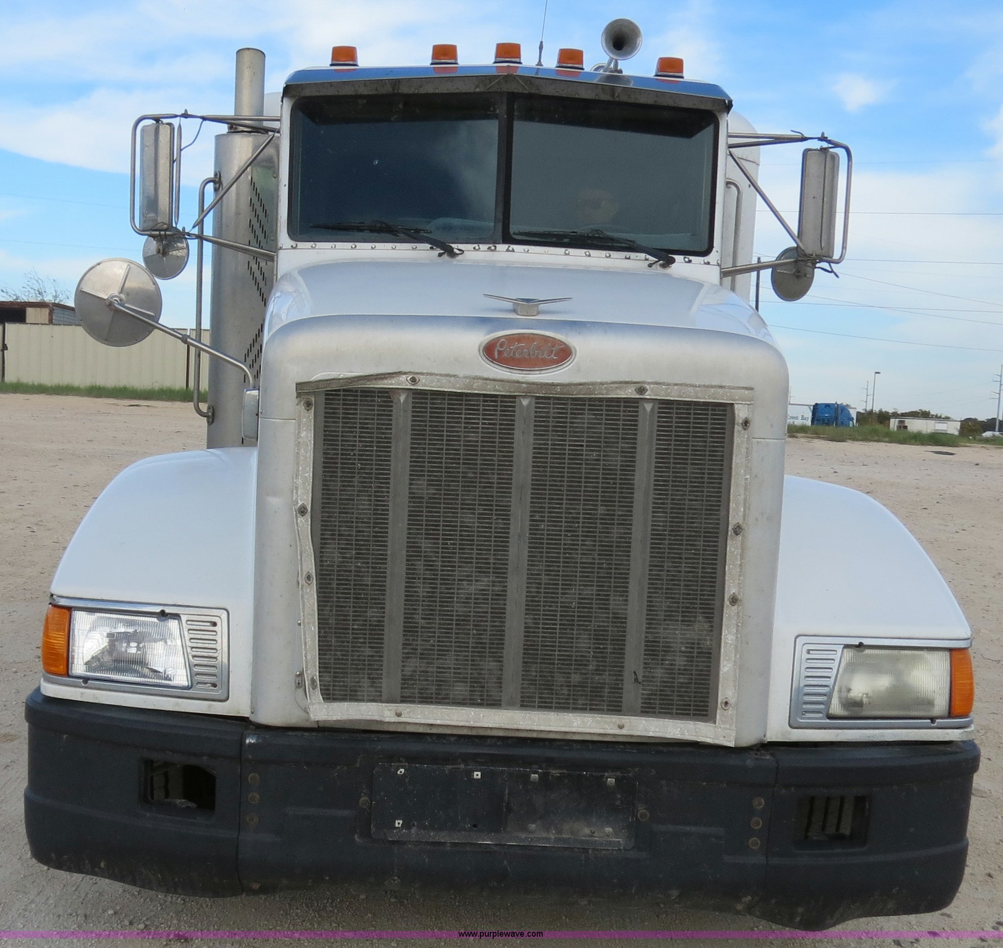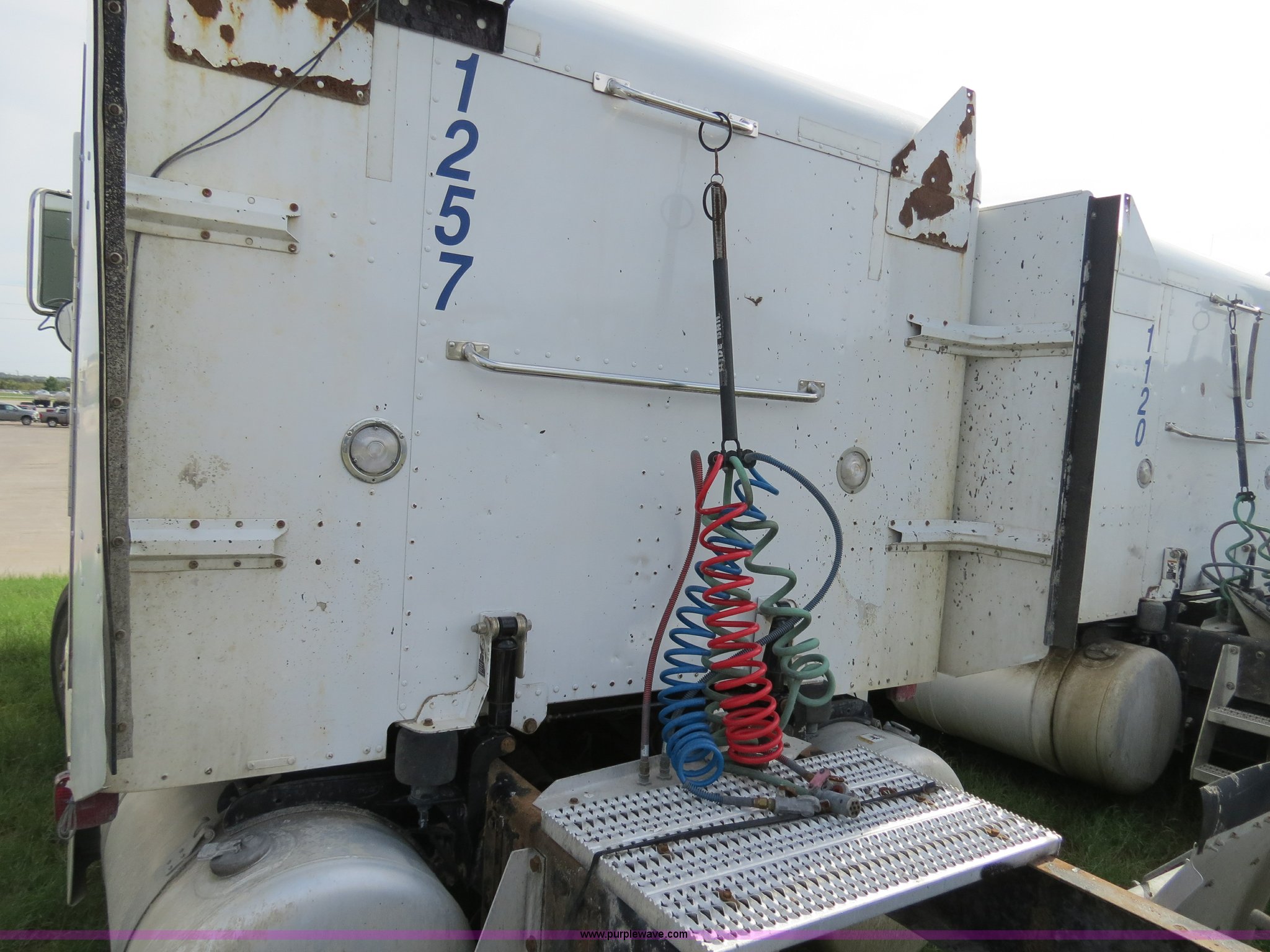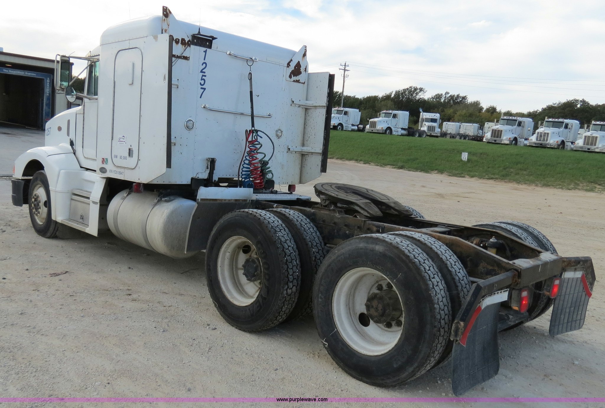 Purple Wave is selling a used Truck Tractor in Texas. This item is a 2000 Peterbilt 377 semi truck with the following: 1,185,969 miles on odometer, Caterpillar C12 12.0L diesel engine, 355 HP, Serial 2KS10984, Eaton Fuller 10 speed manual transmission, Model RTLO-14-610-BT2, Twin screw, AC and heat, Tilt, Cruise, AM/FM/cassette, Passenger daylight door, Air suspension seat, Heated mirrors, Air ride cab, Single bunk sleeper, Storage, Visor, Chrome bumper, Dual 110 gallon fuel tanks, Single rear exhaust stack, Aluminum deck plate, Dump valves, Air suspension, Air brakes, 295/75R22.5 tires, GVWR 50,000 lbs, FAWR 12,000 lbs, IAWR 19,000 lbs, RAWR 19,000 lbs, 3.70 gear ratio, Unit# 1257