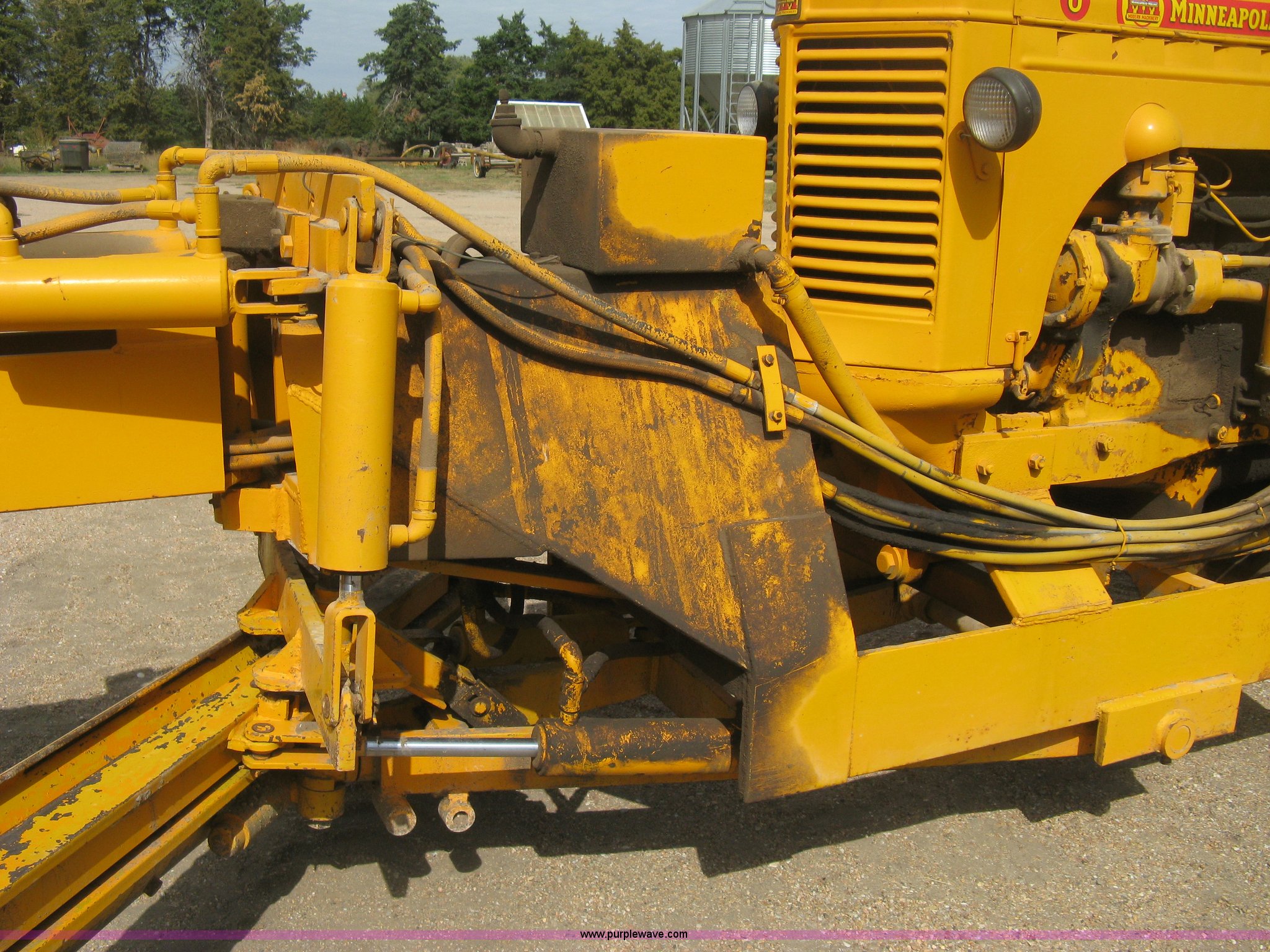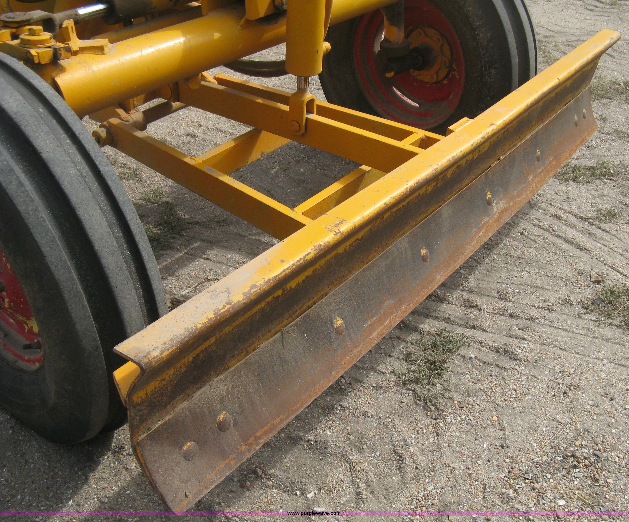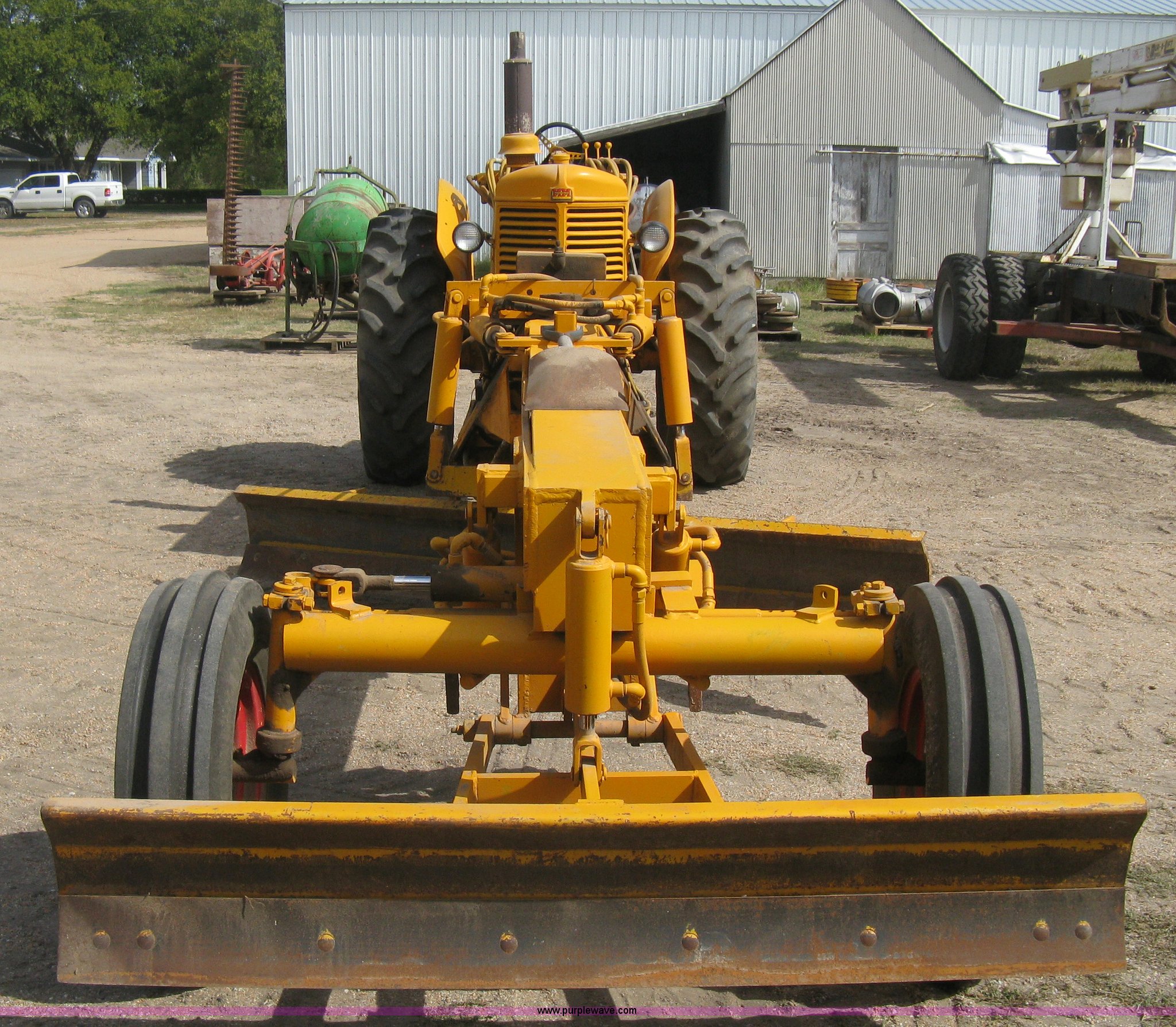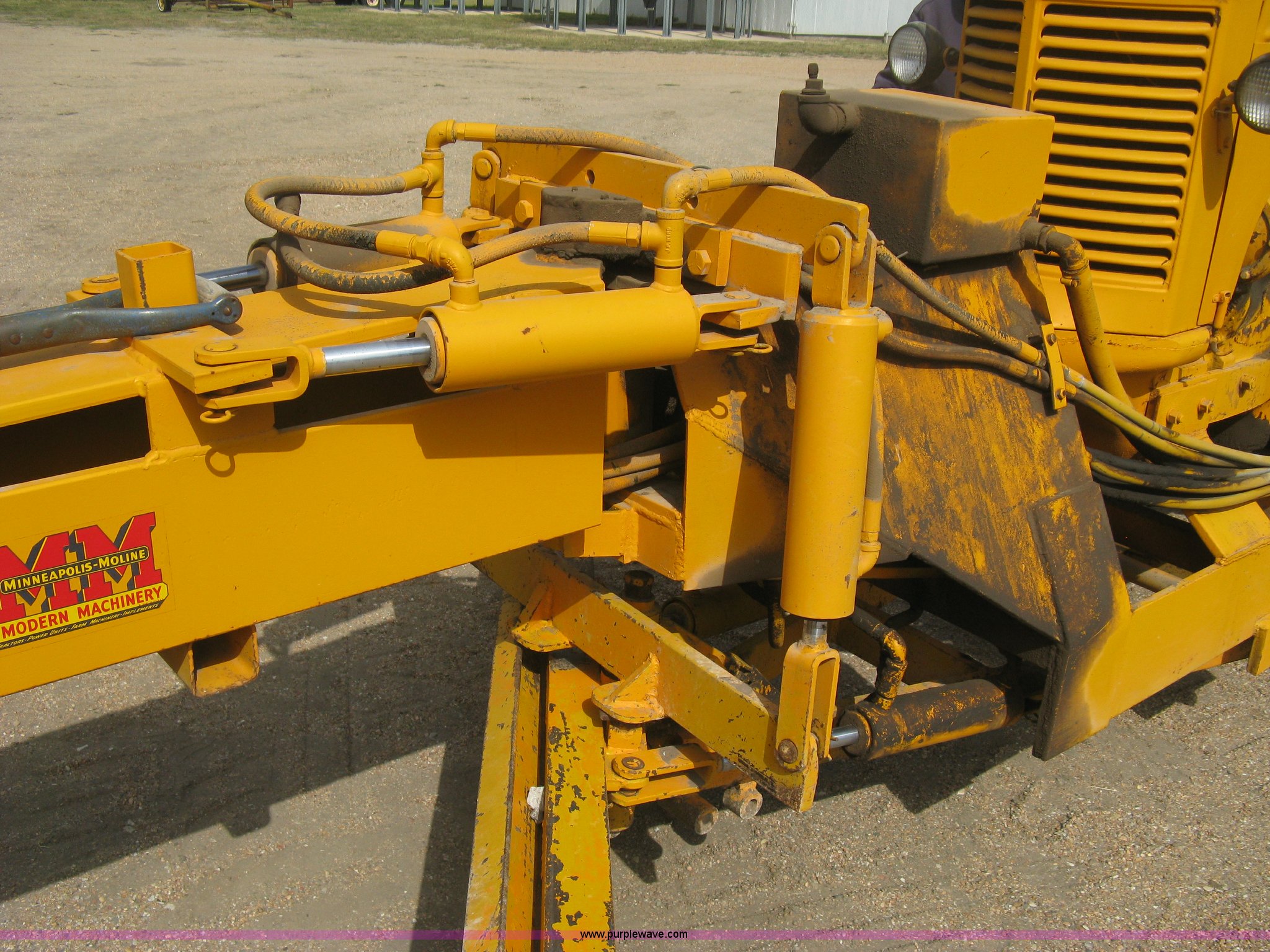 Purple Wave is selling a used Motor Grader in Kansas. This item is a Minneapolis Moline U tractor/custom design motor grader with the following: Four cylinder gas engine, Five speed transmission, Push button start, Custom design articulating grader body, 9' grader blade, Bolt-on edge, Hydraulic four tine scarifier, 6' front mount push blade, Approx. 11.9' from tractor nose to front blade, Adjustable angle draw bar, Pressed seat, 7.50-16SL front tires, 16.9-30 rear tires, (2) MM wheel weight per hub, Serial 01206129