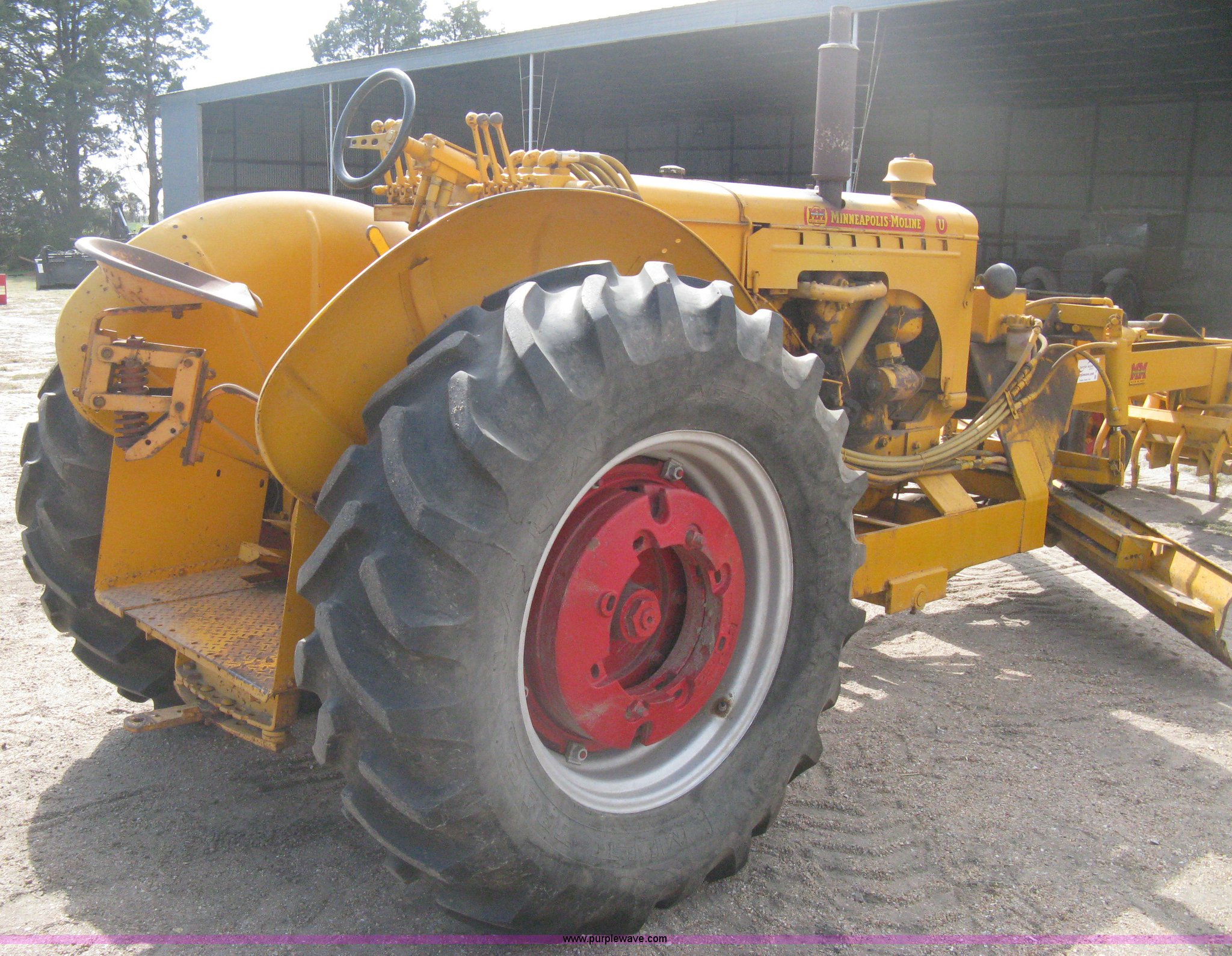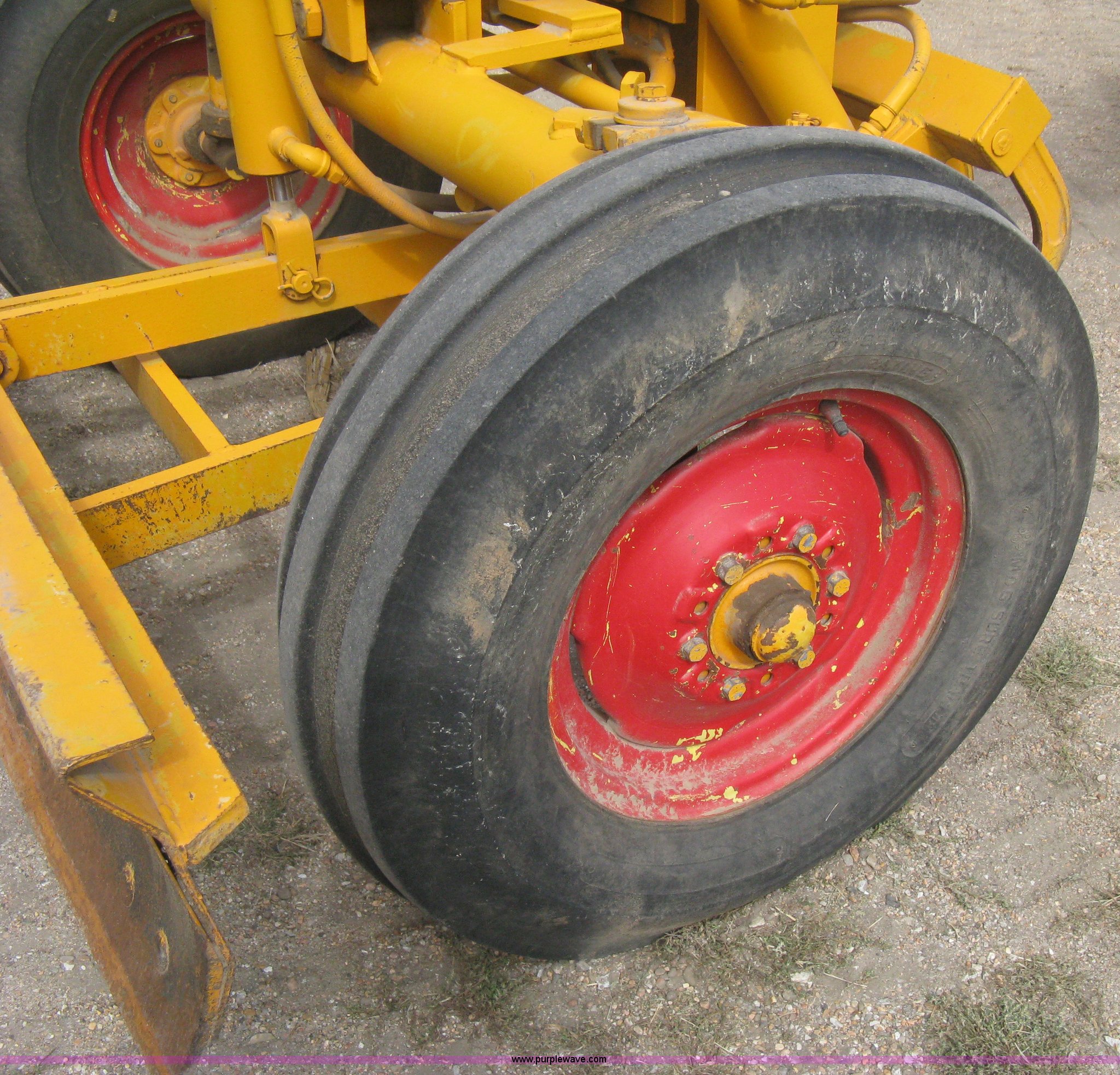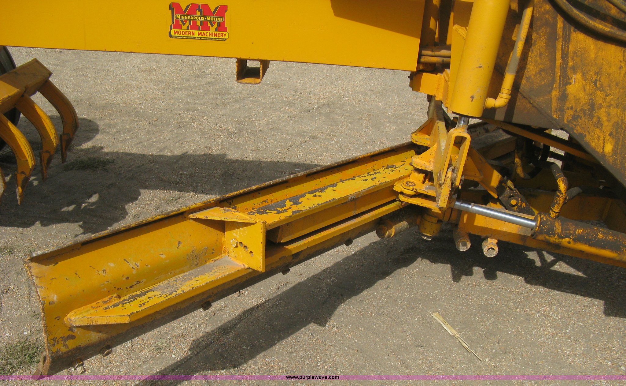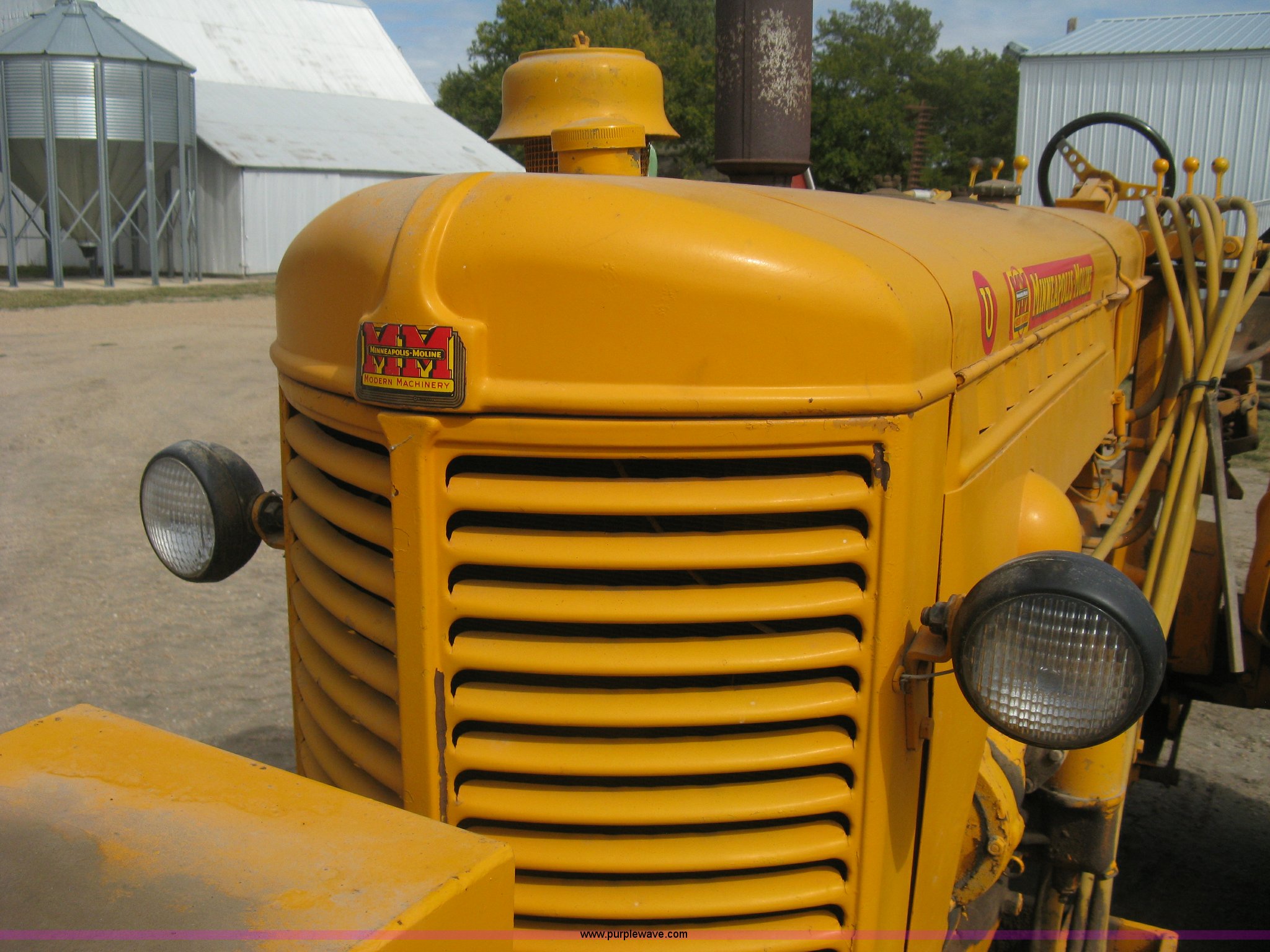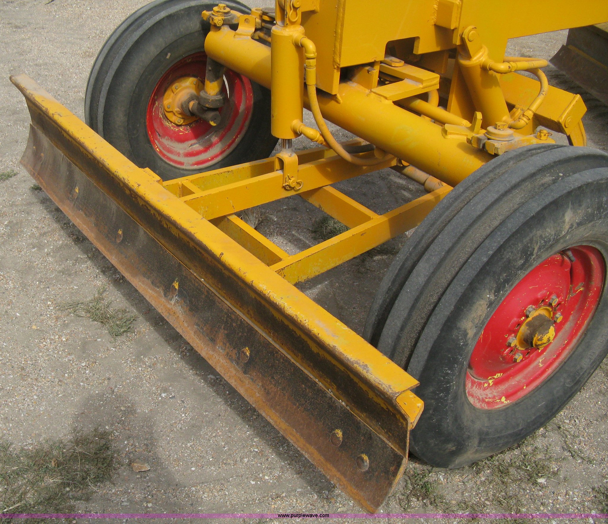 Purple Wave is selling a used Motor Grader in Kansas. This item is a Minneapolis Moline U tractor/custom design motor grader with the following: Four cylinder gas engine, Five speed transmission, Push button start, Custom design articulating grader body, 9' grader blade, Bolt-on edge, Hydraulic four tine scarifier, 6' front mount push blade, Approx. 11.9' from tractor nose to front blade, Adjustable angle draw bar, Pressed seat, 7.50-16SL front tires, 16.9-30 rear tires, (2) MM wheel weight per hub, Serial 01206129