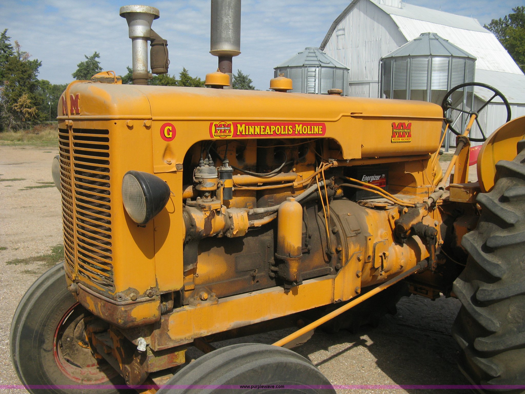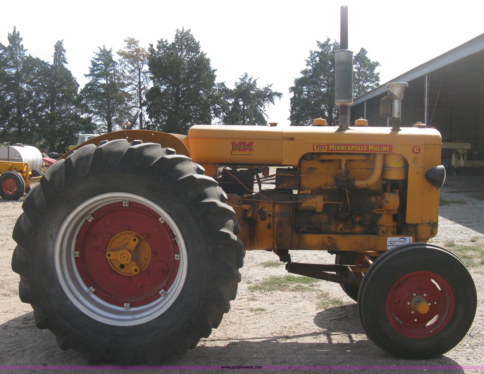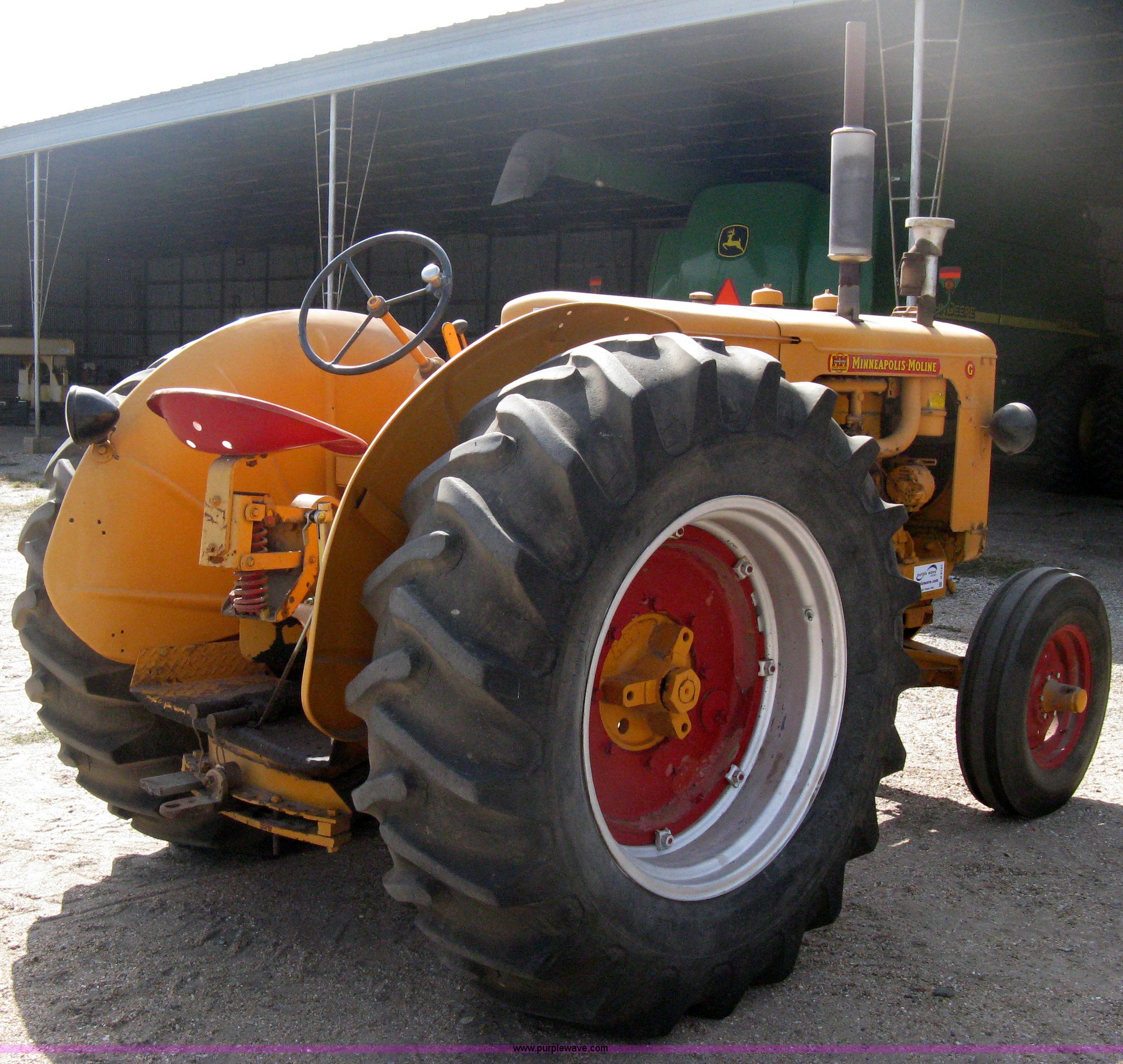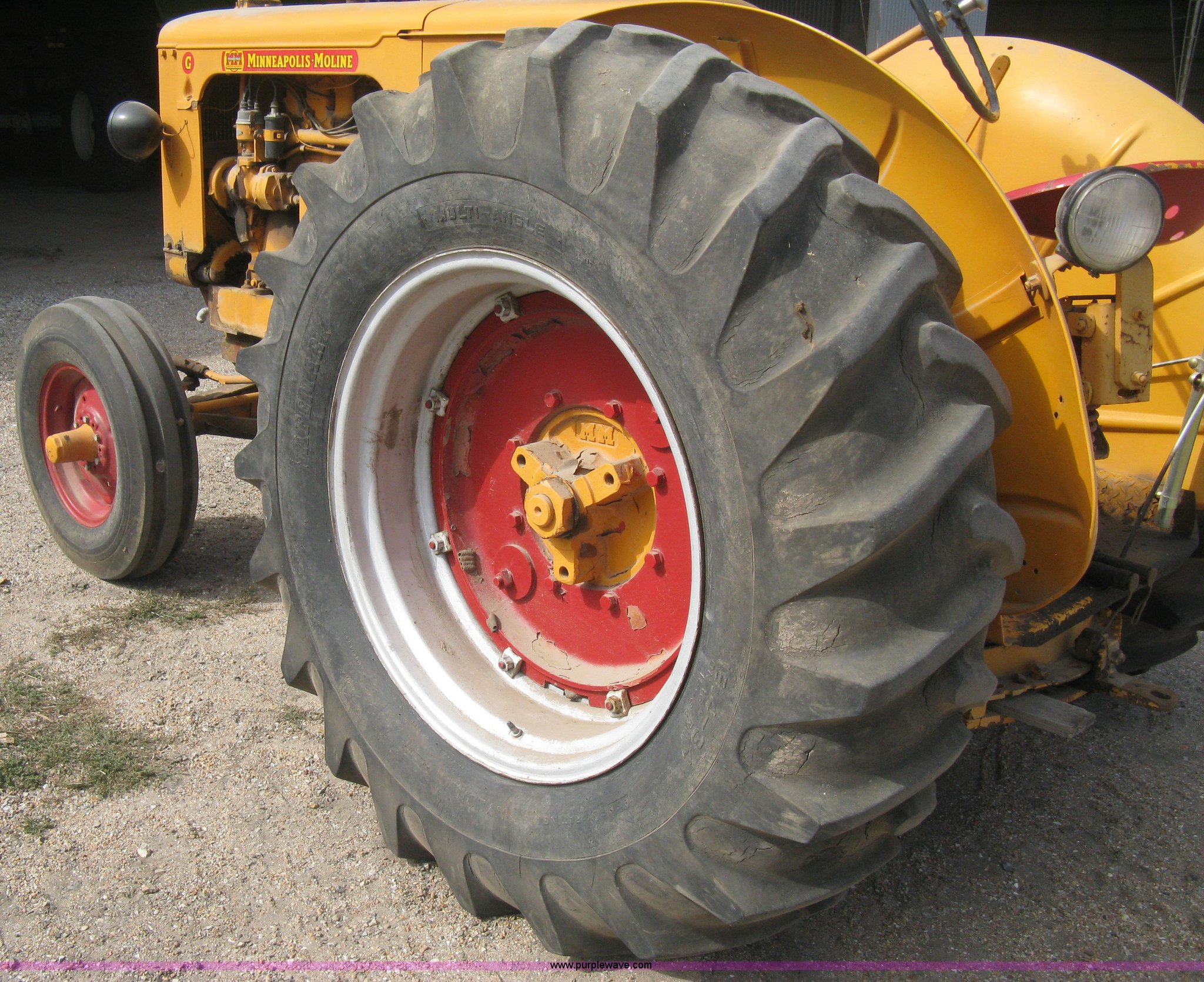 Purple Wave is selling a used Tractor in Kansas. This item is a Minneapolis Moline G tractor with the following: Four cylinder gas engine, Five speed transmission, Push button start, Hand start, 540 PTO, Hydraulic remotes, Adjustable angle draw bar, Pressed seat, Wide front, 7.50-18SL front tires, 18.4-34 rear tires, Umbrella pole holder not included, Serial 01602203