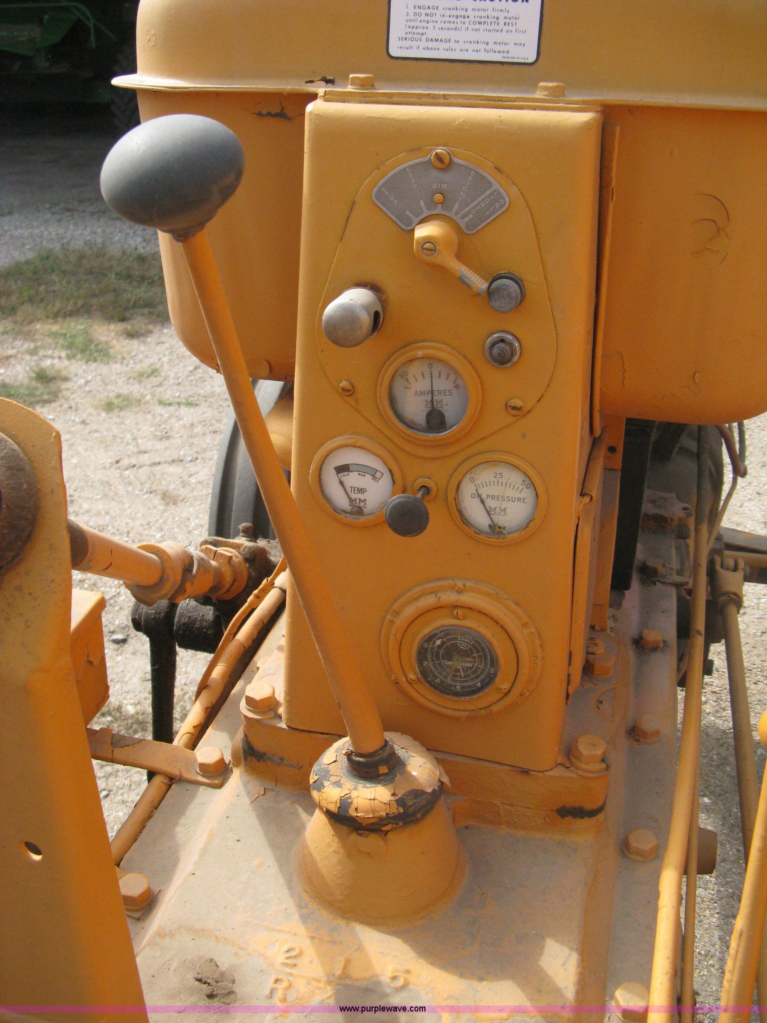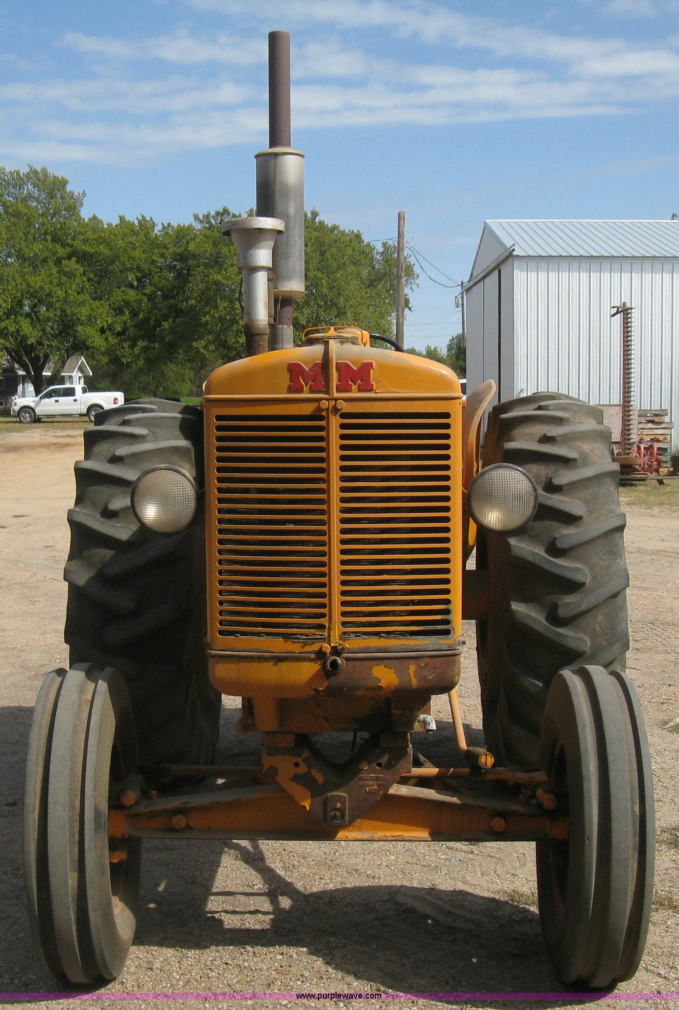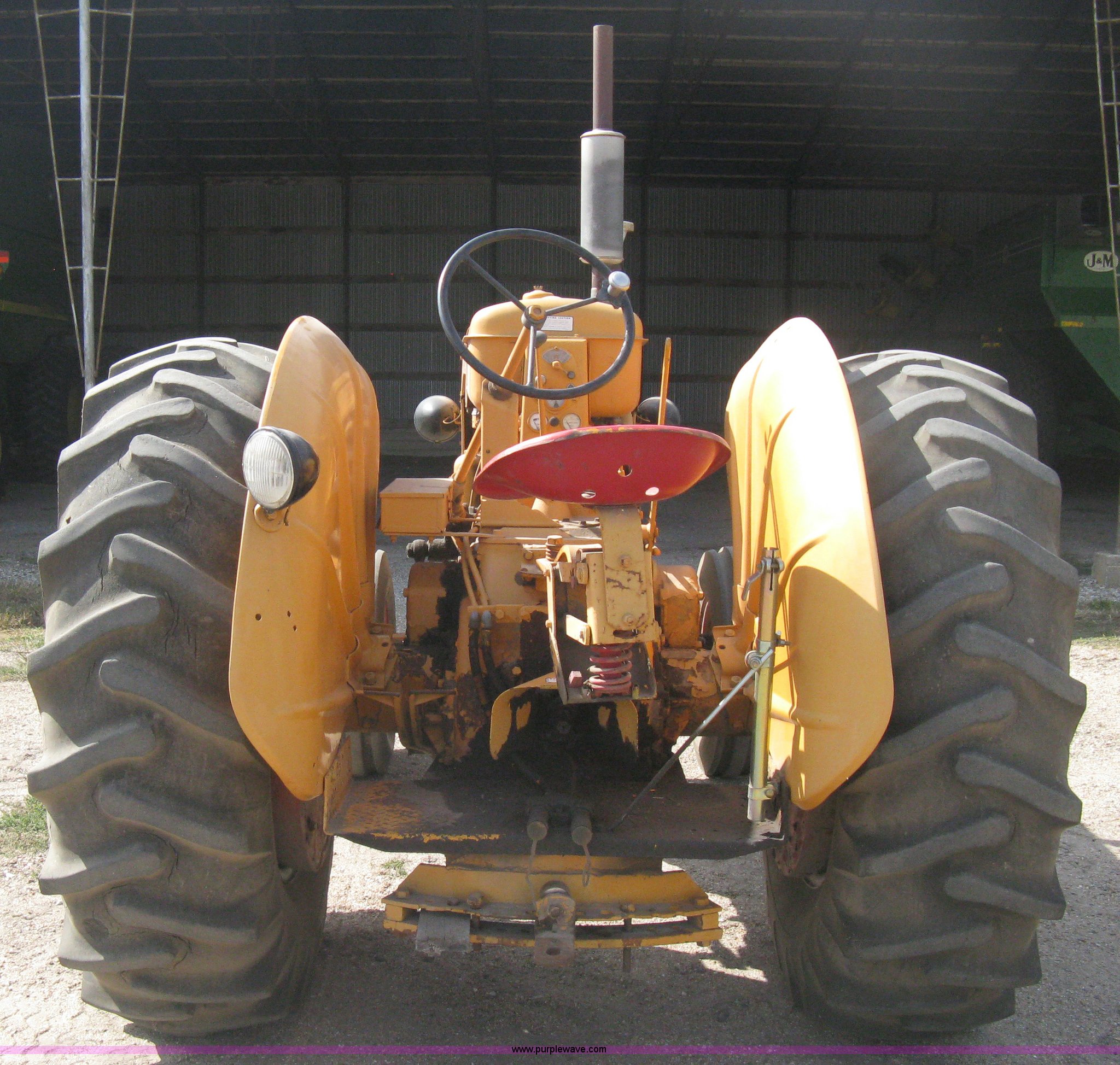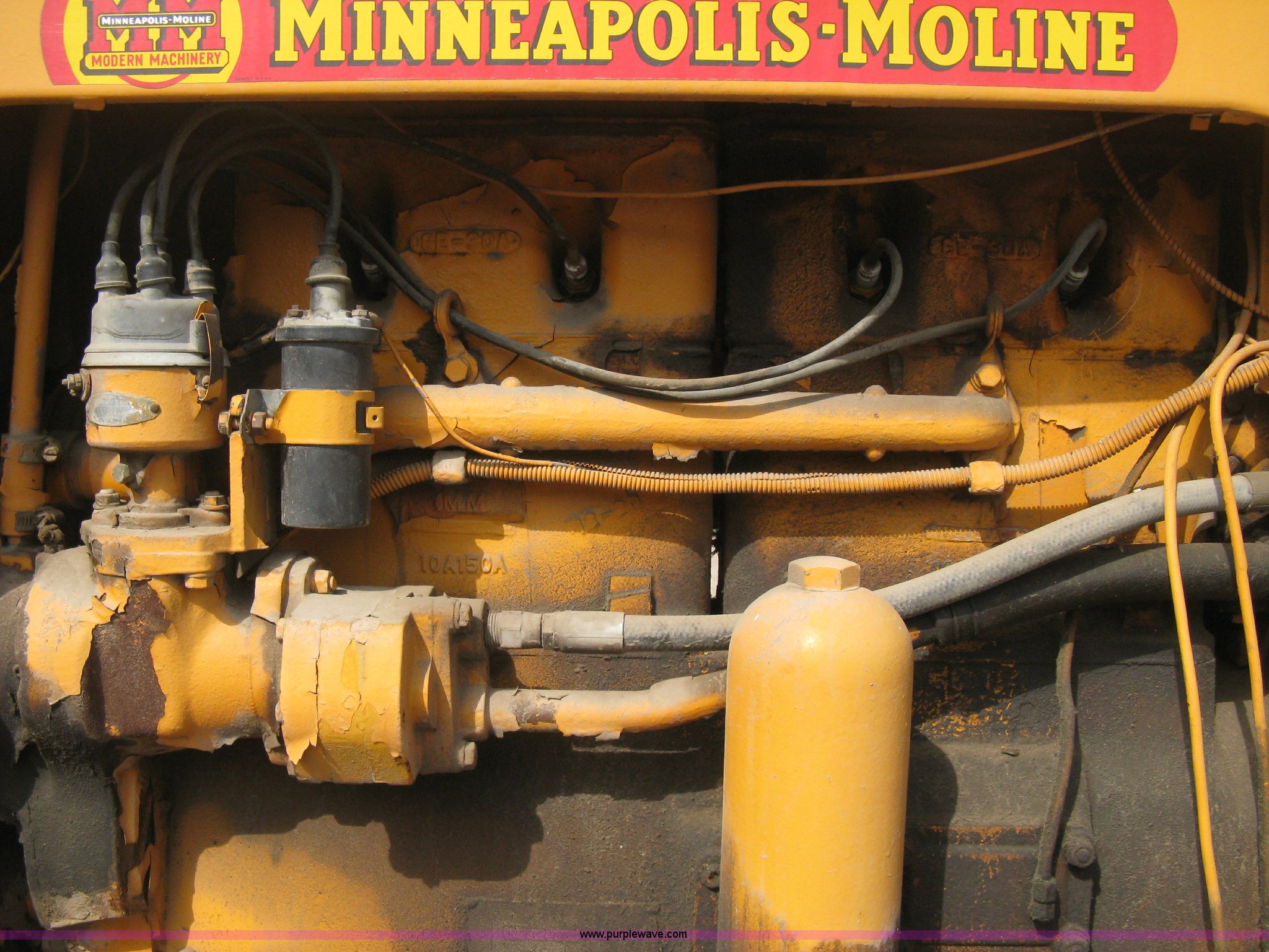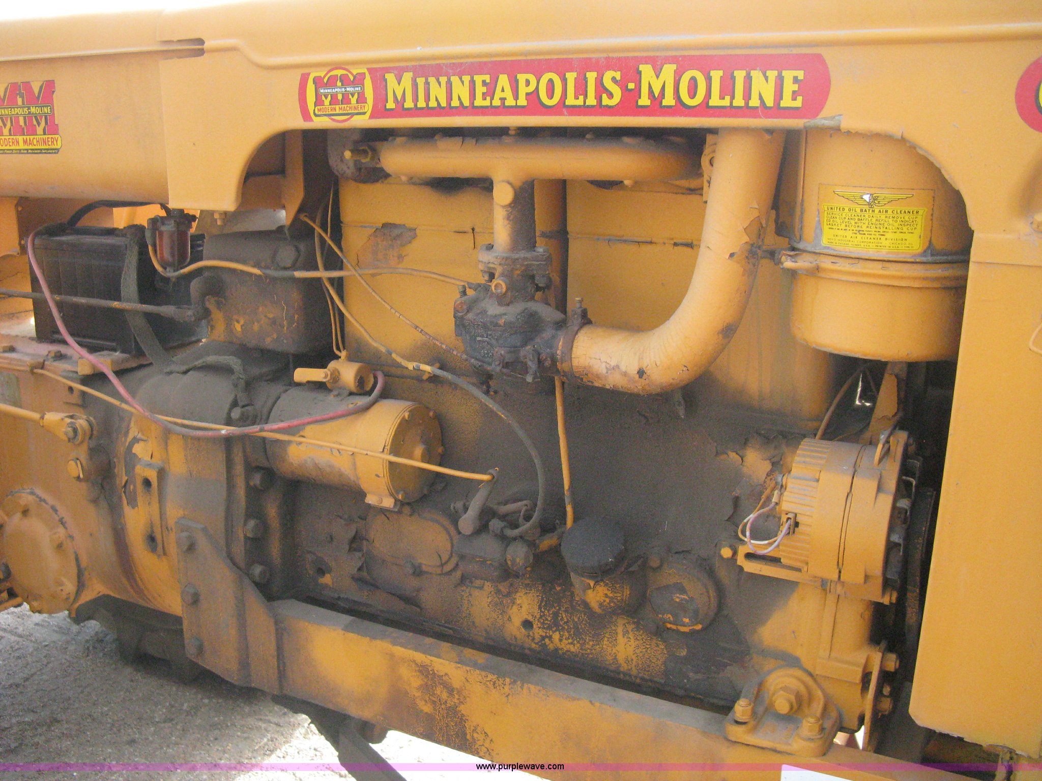 Purple Wave is selling a used Tractor in Kansas. This item is a Minneapolis Moline G tractor with the following: Four cylinder gas engine, Five speed transmission, Push button start, Hand start, 540 PTO, Hydraulic remotes, Adjustable angle draw bar, Pressed seat, Wide front, 7.50-18SL front tires, 18.4-34 rear tires, Umbrella pole holder not included, Serial 01602203