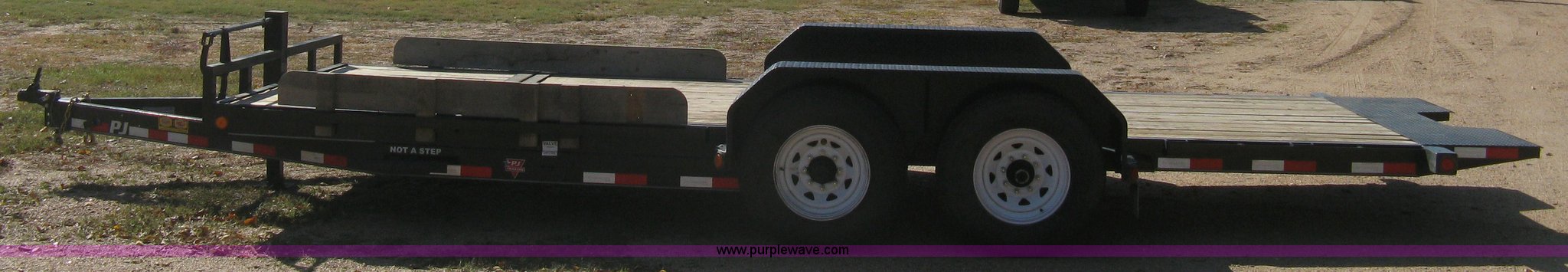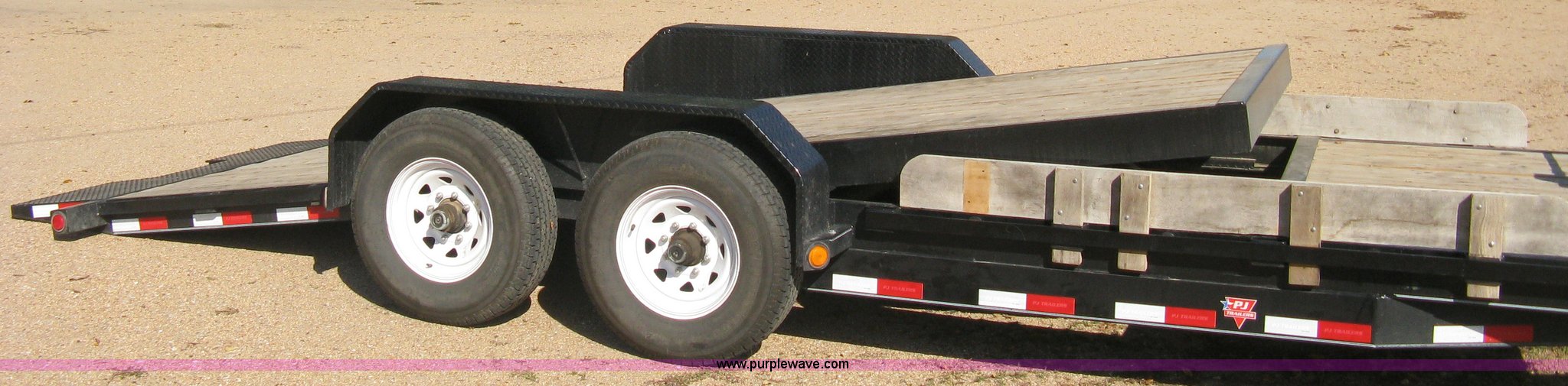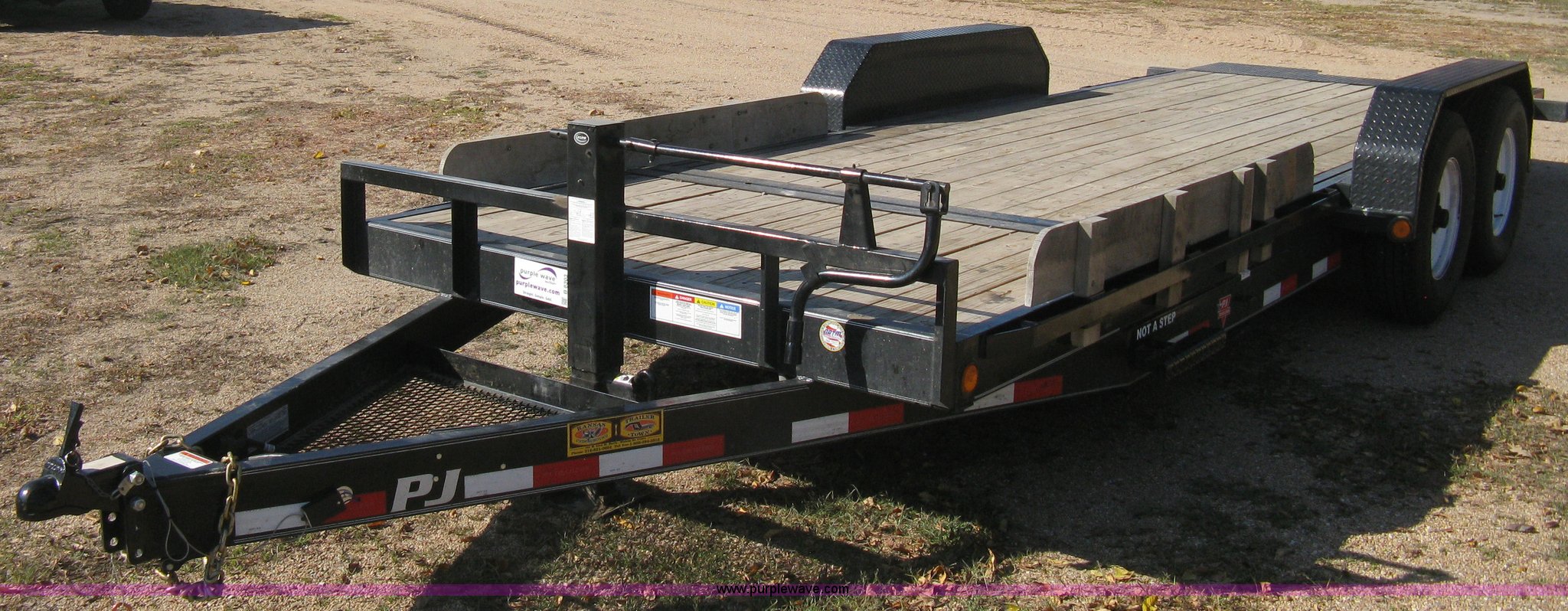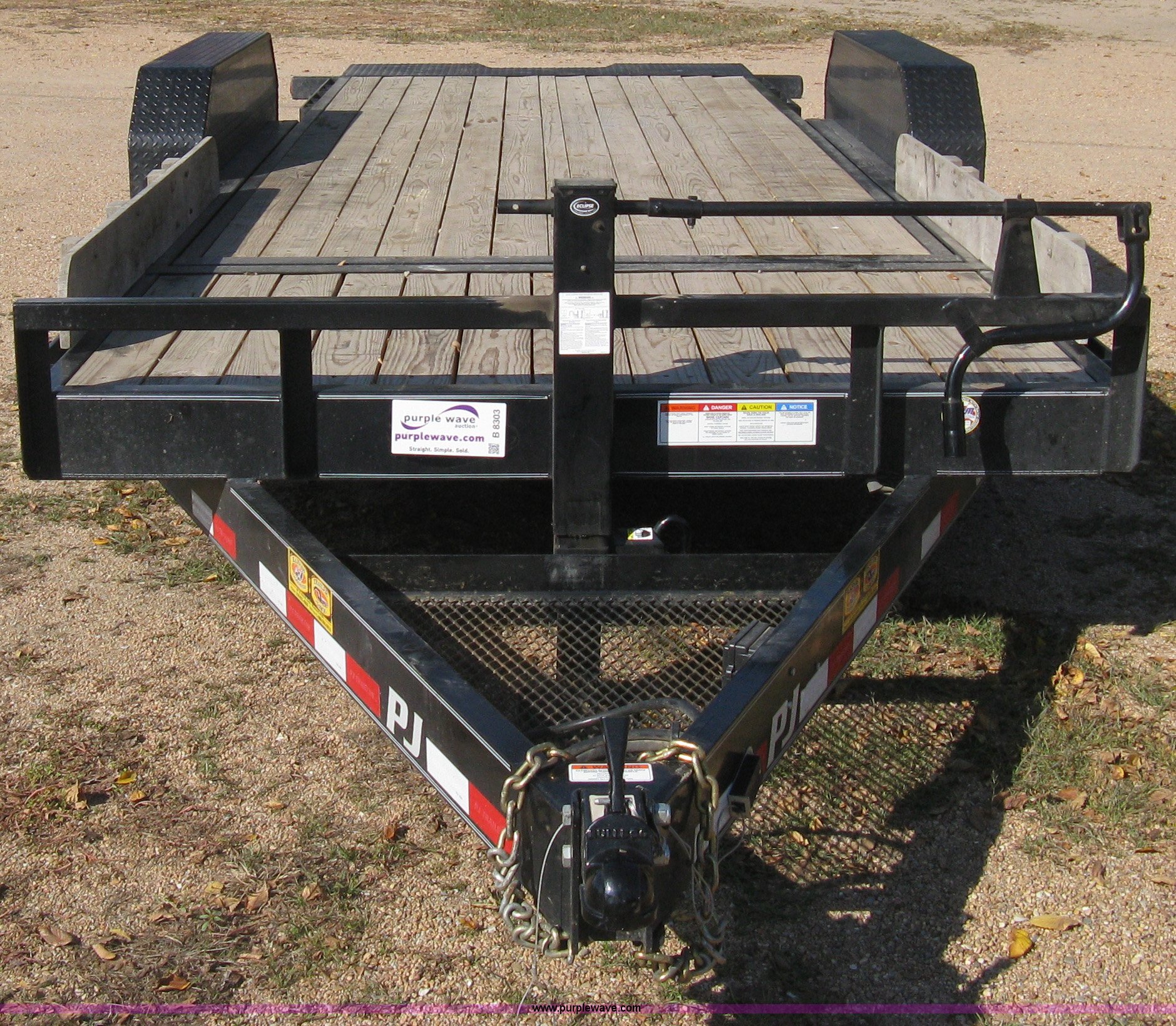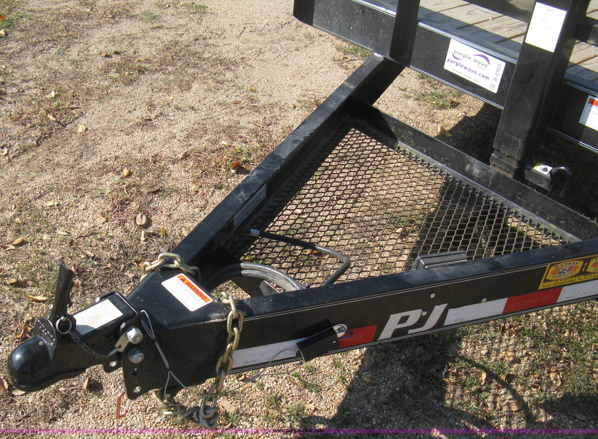 Purple Wave is selling a used Car or Utility Trailer in Kansas. This item is a 2010 PJ tilt flatbed trailer with the following: 21.3'L x 78"W deck, 17'L tilt deck, Hydraulic damper, Wood floor, 24" steel ramp tail, Stake side pockets, (2) 7" side boards, Diamond plate fenders, Bumper hitch, Adjustable 2 5/16" ball coupler, Break-away chains, Break-away brake controller, Chain/binder basket in tongue, Single post landing gear with spring loaded foot, Tandem axle, Easy lube hubs, Eight lug wheels, ST235/80R16 tires, GVWR 14,000 lbs
