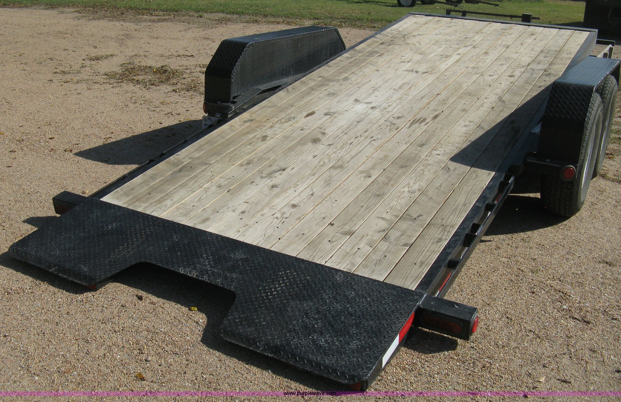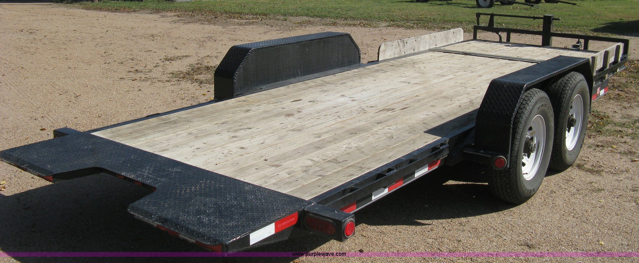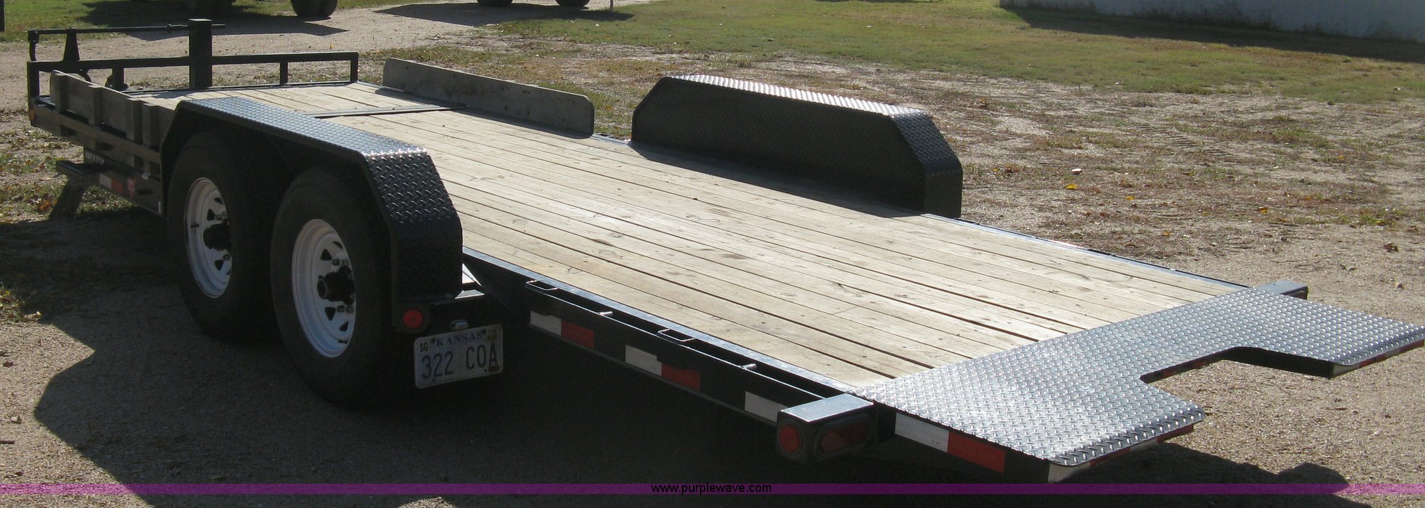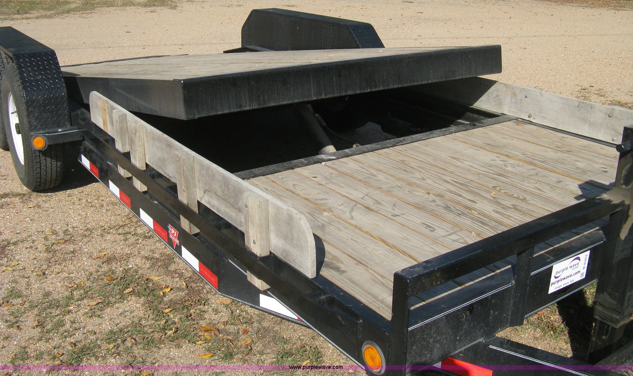 Purple Wave is selling a used Car or Utility Trailer in Kansas. This item is a 2010 PJ tilt flatbed trailer with the following: 21.3'L x 78"W deck, 17'L tilt deck, Hydraulic damper, Wood floor, 24" steel ramp tail, Stake side pockets, (2) 7" side boards, Diamond plate fenders, Bumper hitch, Adjustable 2 5/16" ball coupler, Break-away chains, Break-away brake controller, Chain/binder basket in tongue, Single post landing gear with spring loaded foot, Tandem axle, Easy lube hubs, Eight lug wheels, ST235/80R16 tires, GVWR 14,000 lbs
