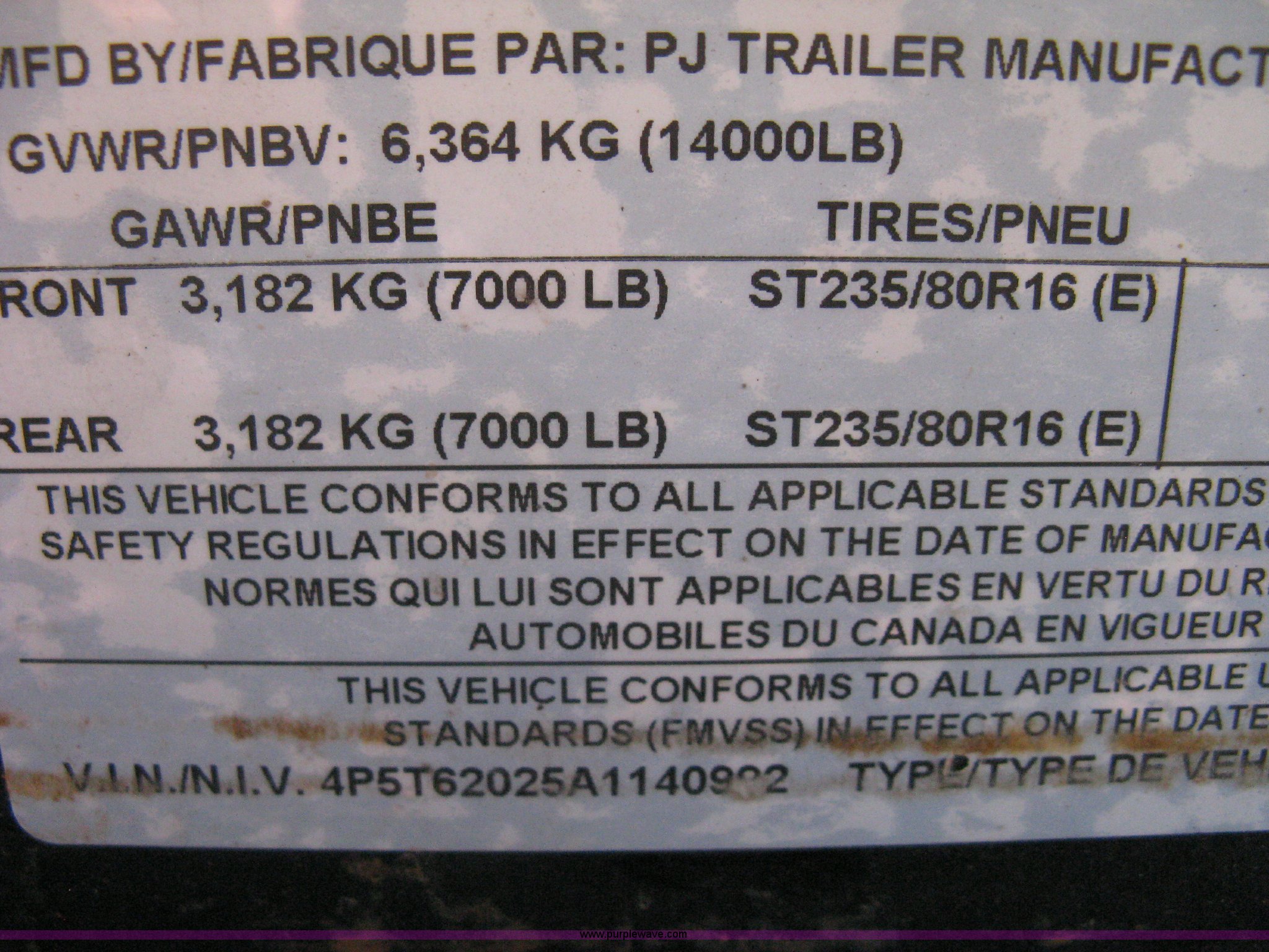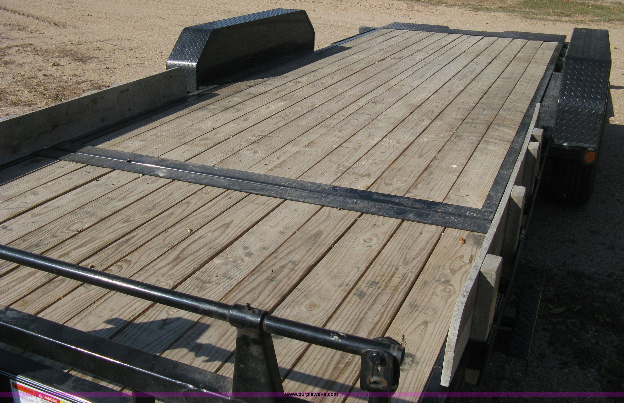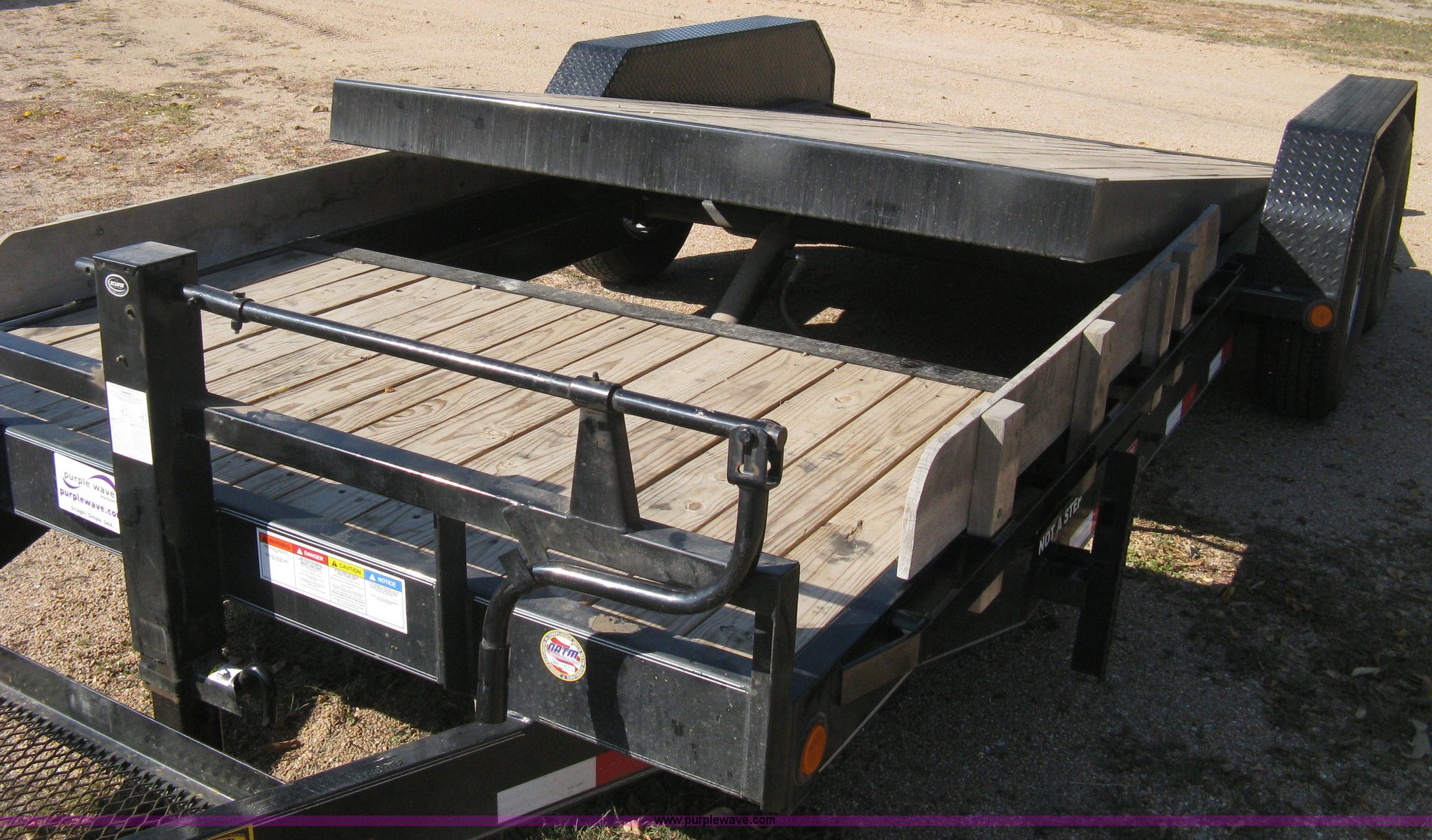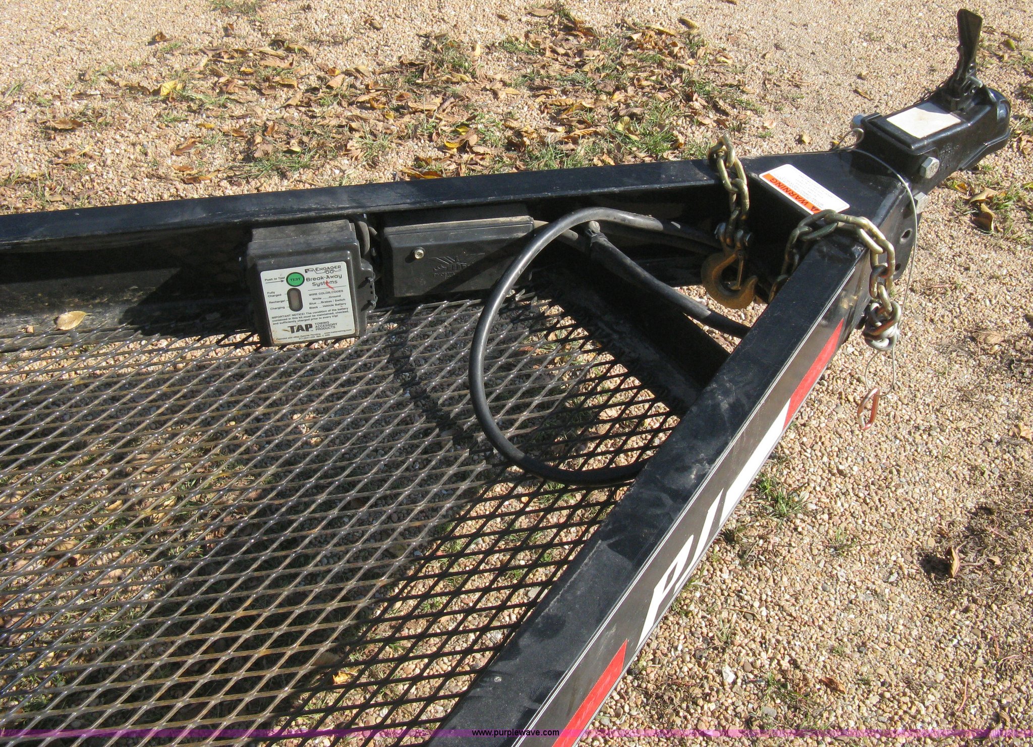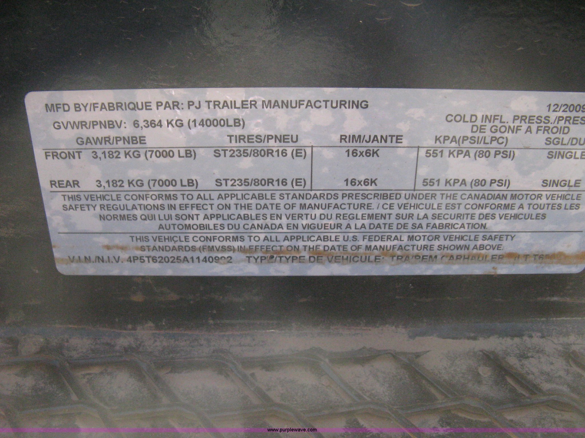 Purple Wave is selling a used Car or Utility Trailer in Kansas. This item is a 2010 PJ tilt flatbed trailer with the following: 21.3'L x 78"W deck, 17'L tilt deck, Hydraulic damper, Wood floor, 24" steel ramp tail, Stake side pockets, (2) 7" side boards, Diamond plate fenders, Bumper hitch, Adjustable 2 5/16" ball coupler, Break-away chains, Break-away brake controller, Chain/binder basket in tongue, Single post landing gear with spring loaded foot, Tandem axle, Easy lube hubs, Eight lug wheels, ST235/80R16 tires, GVWR 14,000 lbs