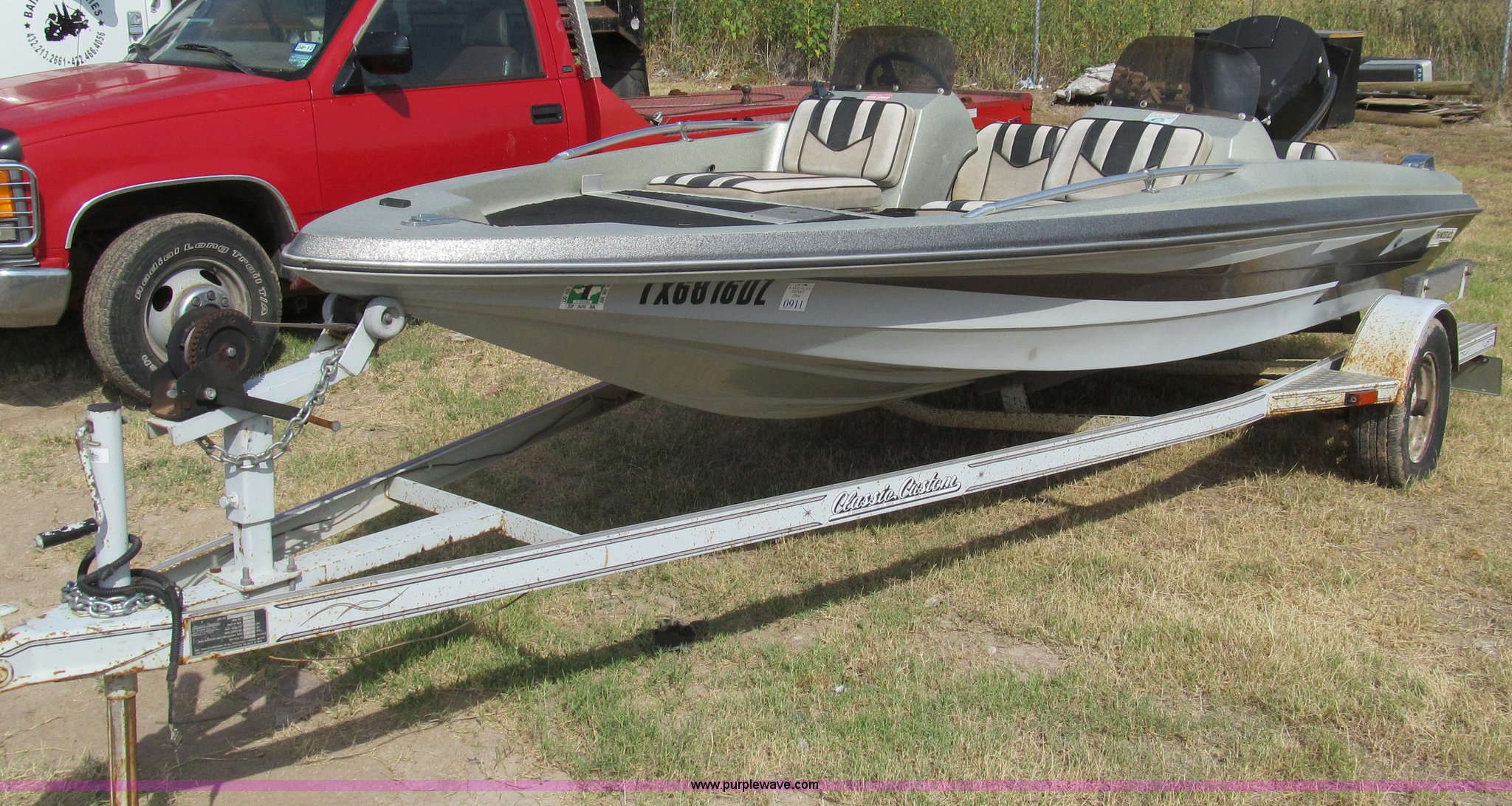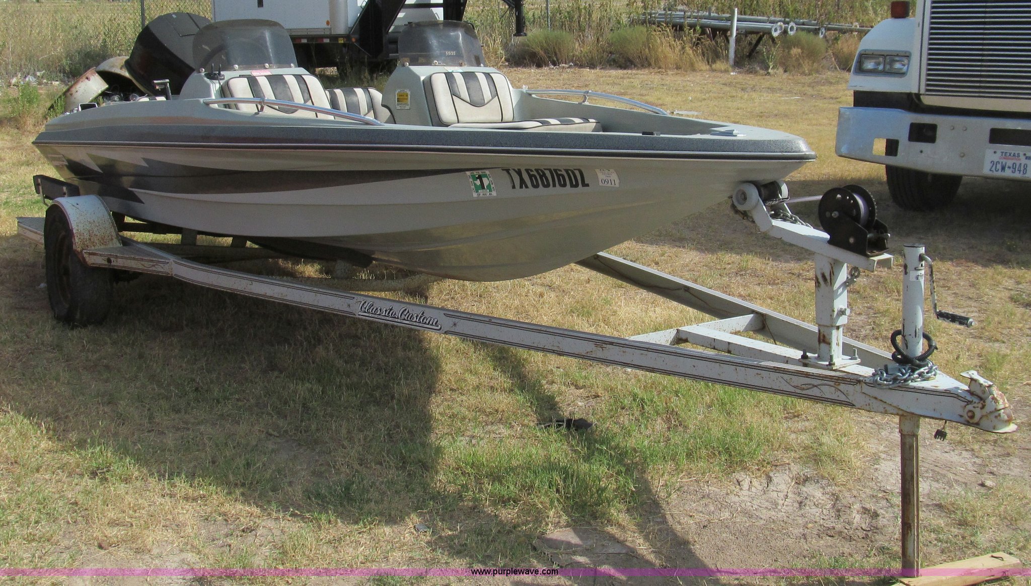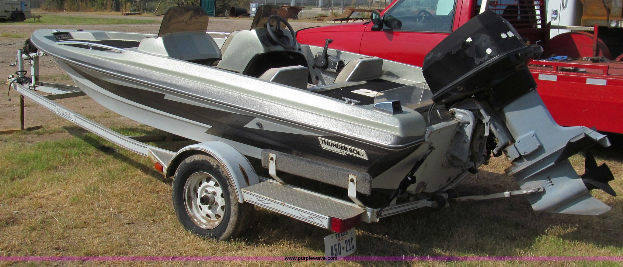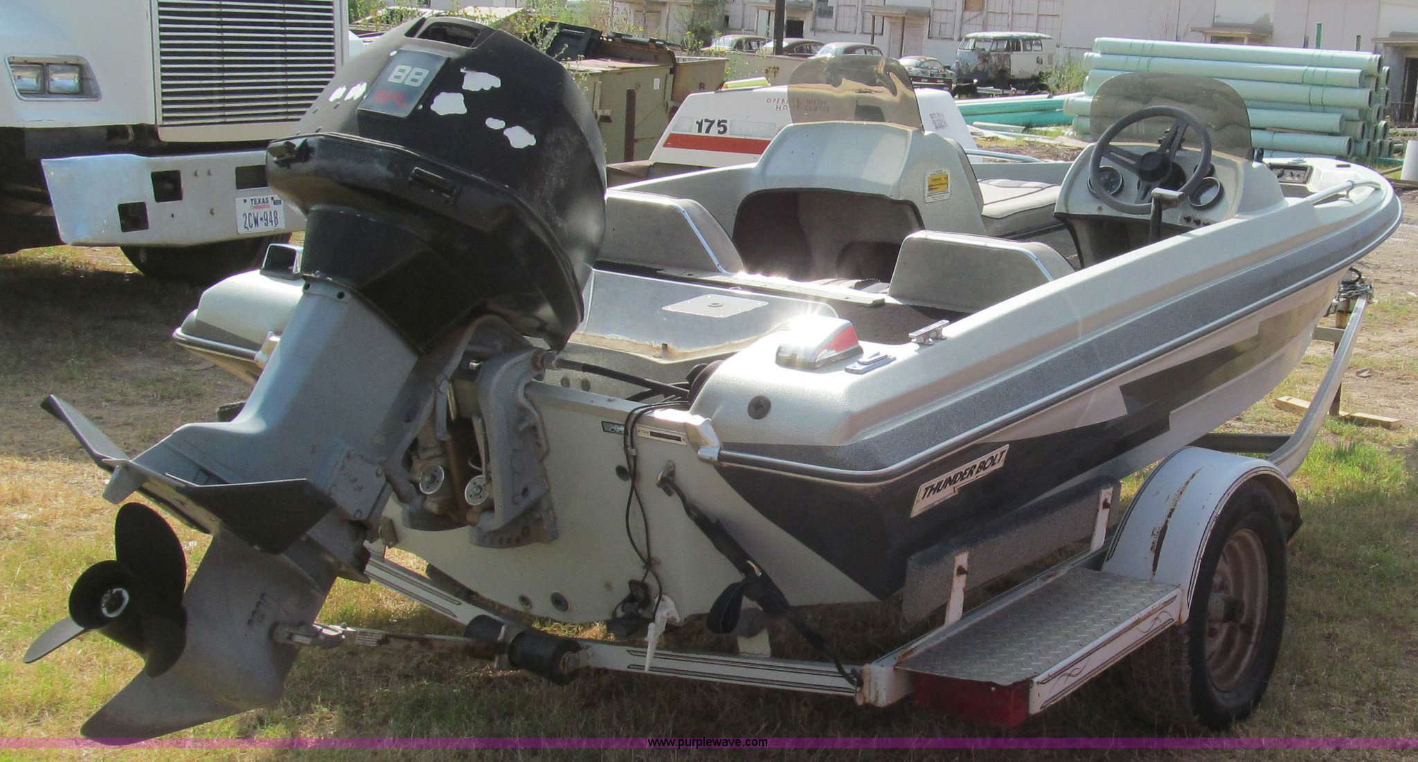 Purple Wave is selling a used Boat in Texas. This item is a 1987 Thunderbolt bass boat and trailer with the following: 15'5"L, (2) live wells, Four person or 600 lb capacity, Evinrude outboard engine, 88 HP, Serial R1482375, Custom Classic boat trailer, Model 155TB, Serial 983S3C28712, 1,500 lbs max load capacity, 2,000 lbs max gross weight, B78-13 tires, Serial THV00279D787