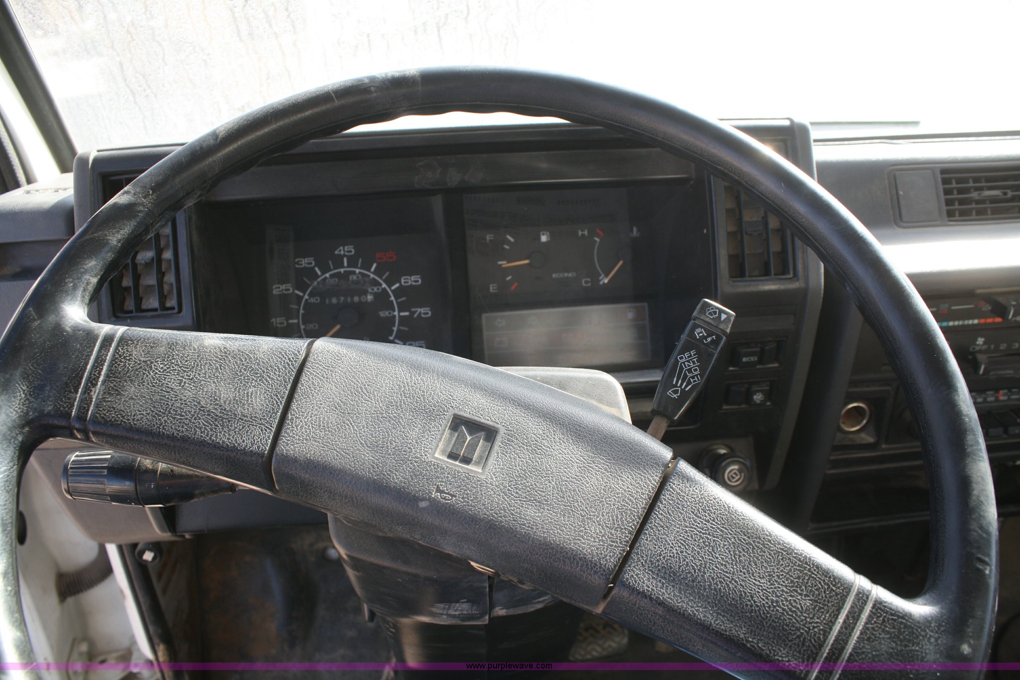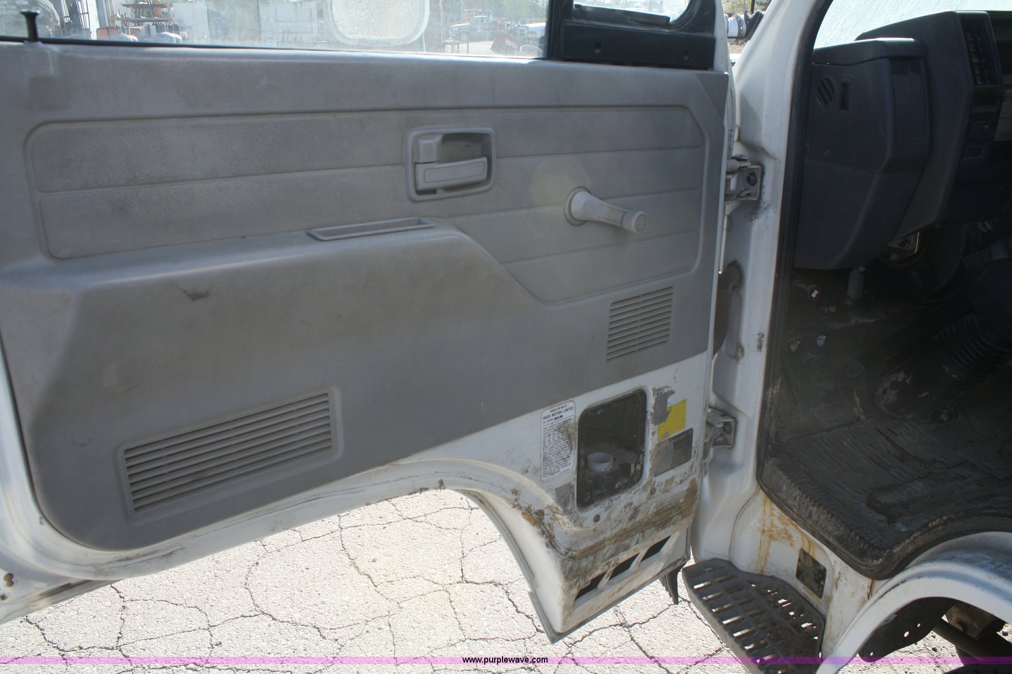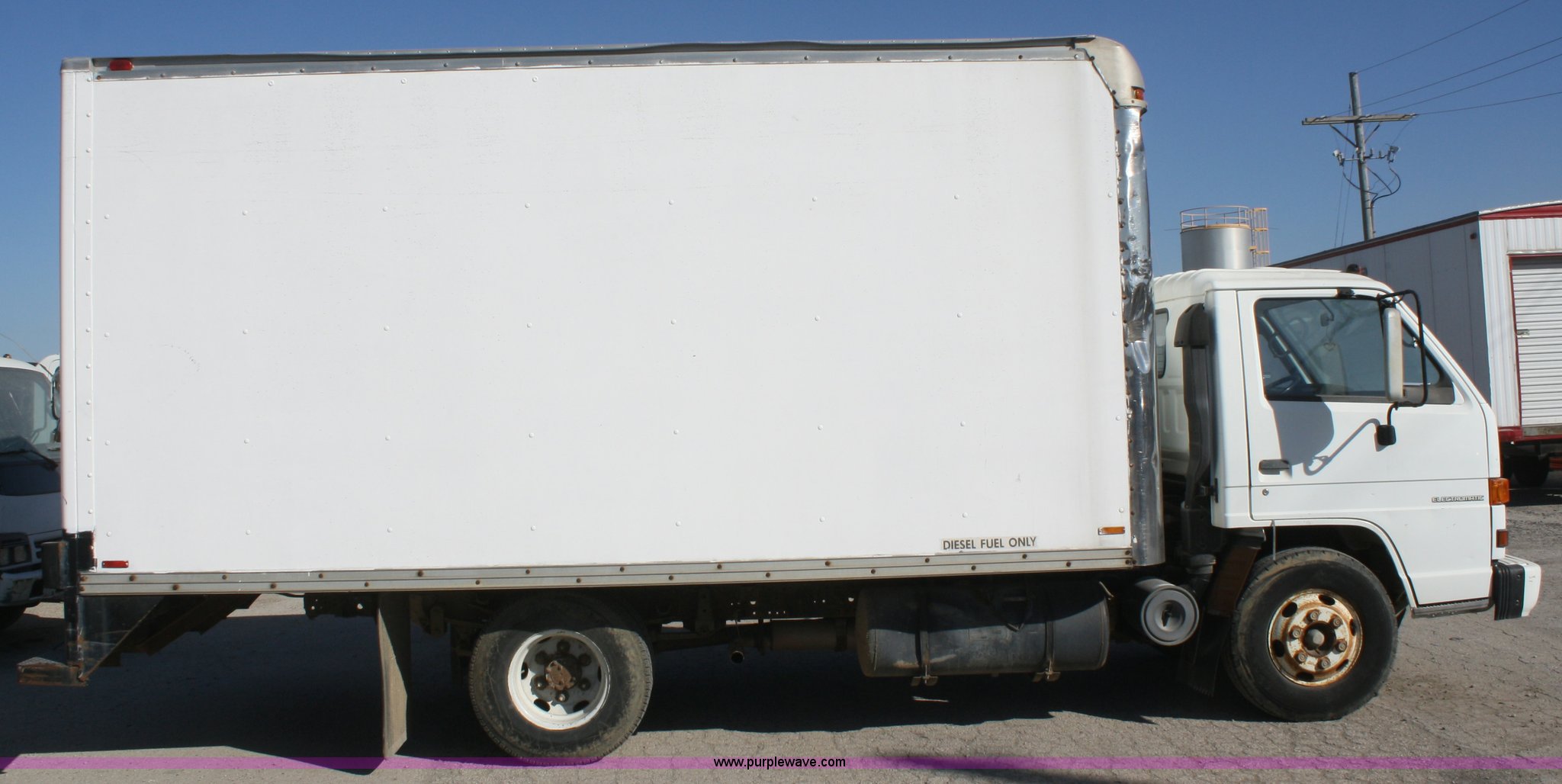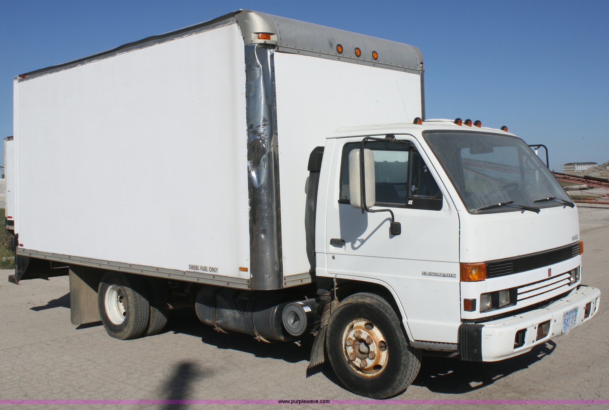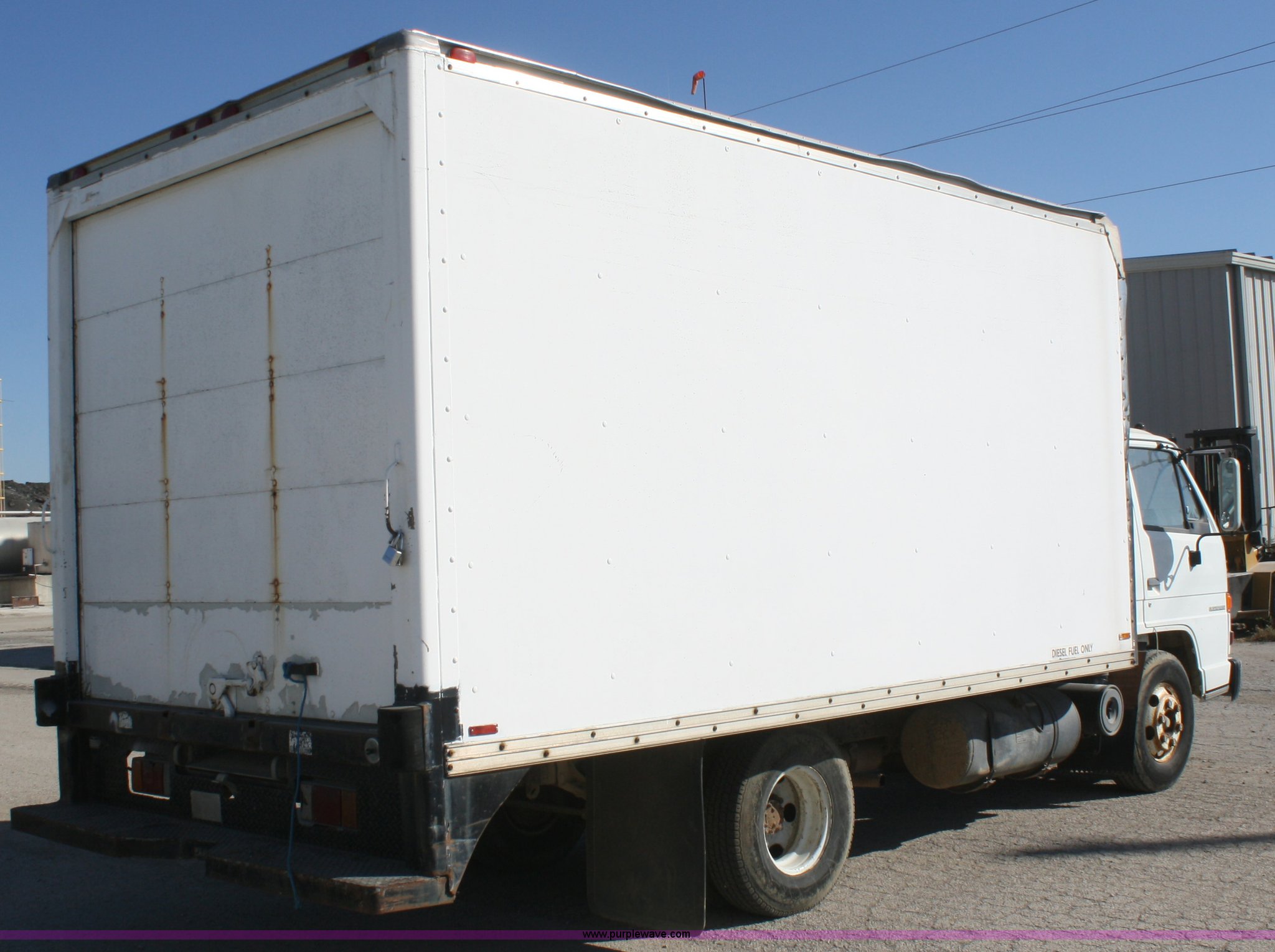 Purple Wave is selling a used Box Truck in Kansas. This item is a 1990 Isuzu box truck with the following: 167,180 miles on odometer, Isuzu four cylinder diesel engine, 121 HP, Automatic transmission, AC and heat, AM/FM, 15'L box, Roll-up door, 85"W x 6'5"H door openings, 235/85R16 tires