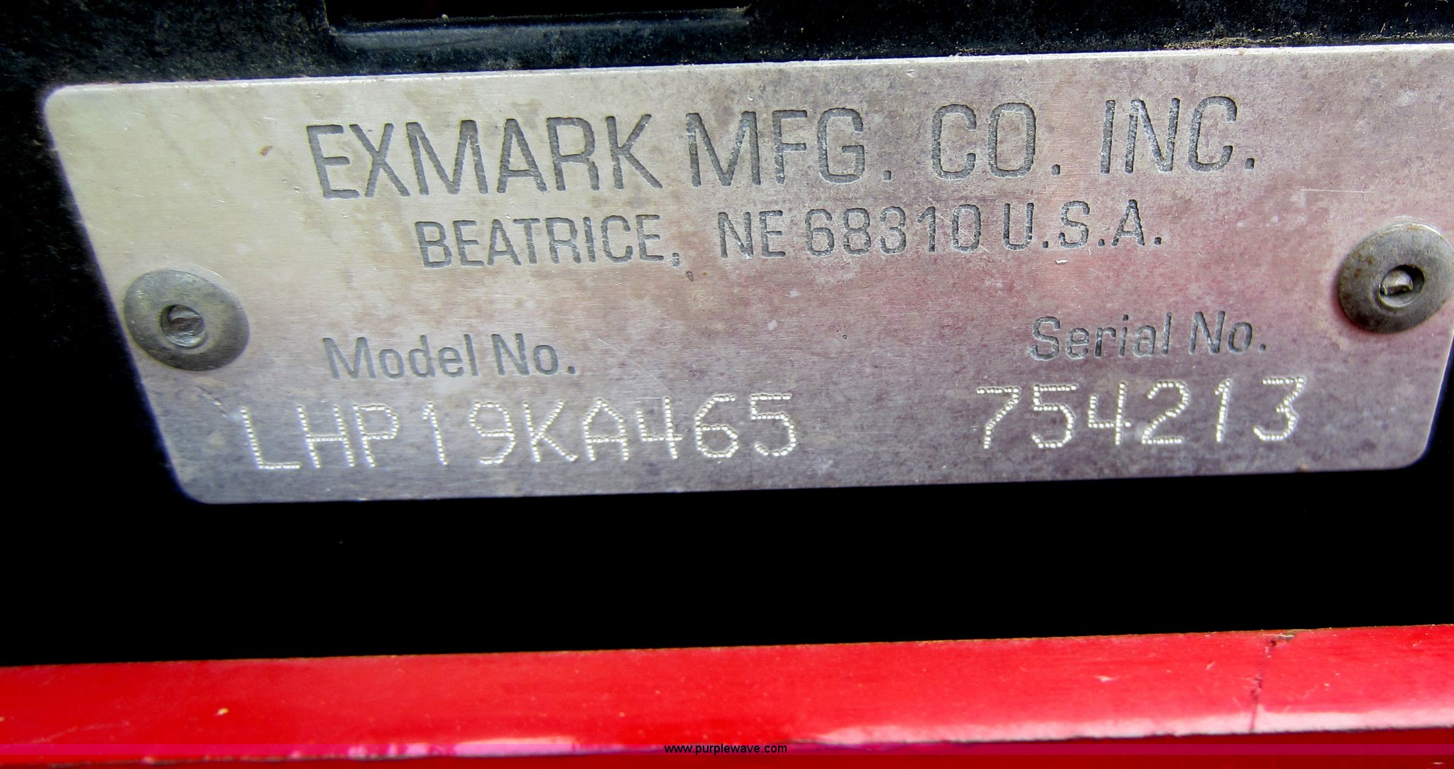Purple Wave is selling a used Commercial Turf Mower in Oklahoma. This item is a 2008 Ex Mark commercial lawn mower with the following: 1,505 hours on meter, Model LHP19KA465, 46" deck, Kawasaki 19 HP gas engine, Hydrostatic transmission, Ultravac bagger attachment, Serial 754213