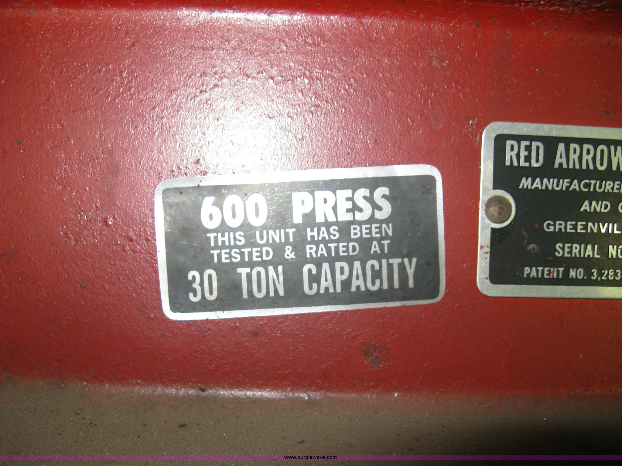 Red Arrow 30 ton hydraulic press has sold in Sedgwick, Kansas for $412.50. Item M9012 sold on October 31st, 2012.