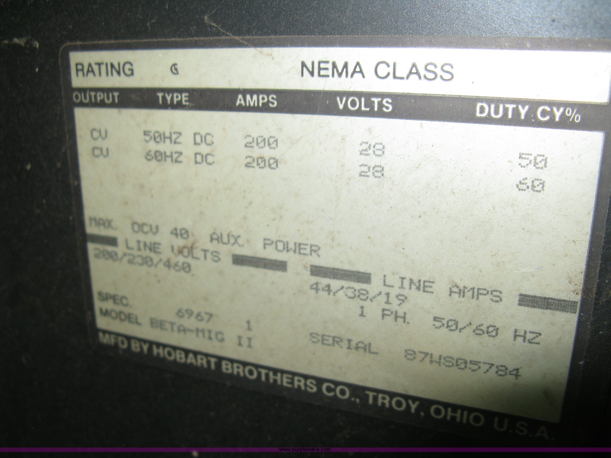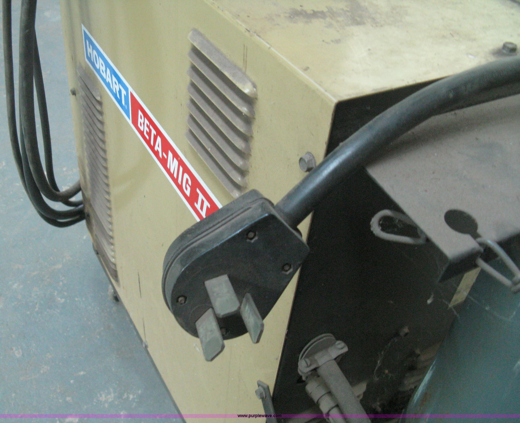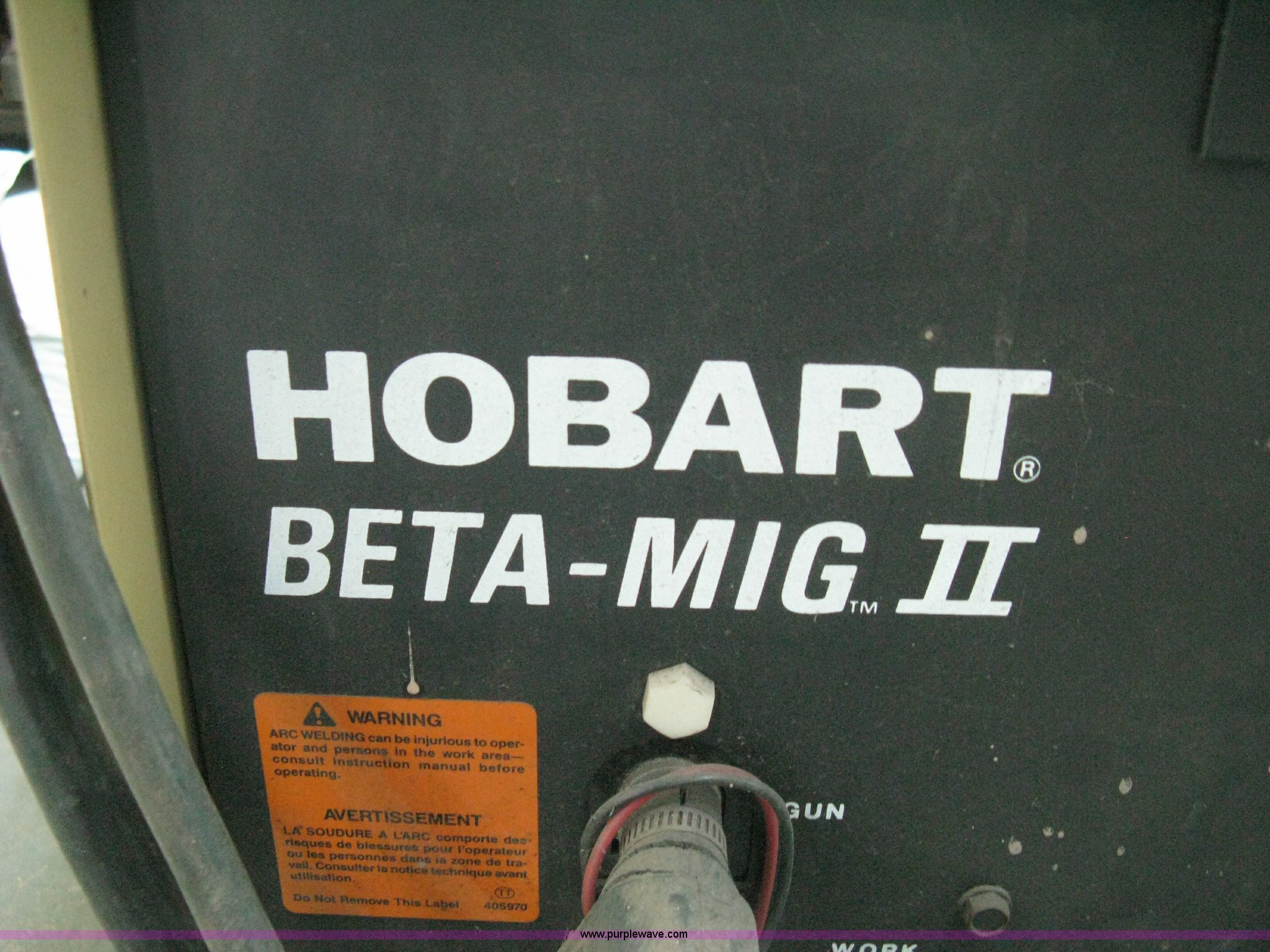Purple Wave is selling a used Welder (Manual) in Kansas. This item is a Hobart Beta-Mig II welder with the following: 200 amp, 28V, Single phase, 220V platform, Leads, Roll around cart with bottle rack, Gauge included, Bottle not included, Serial 87WS05784