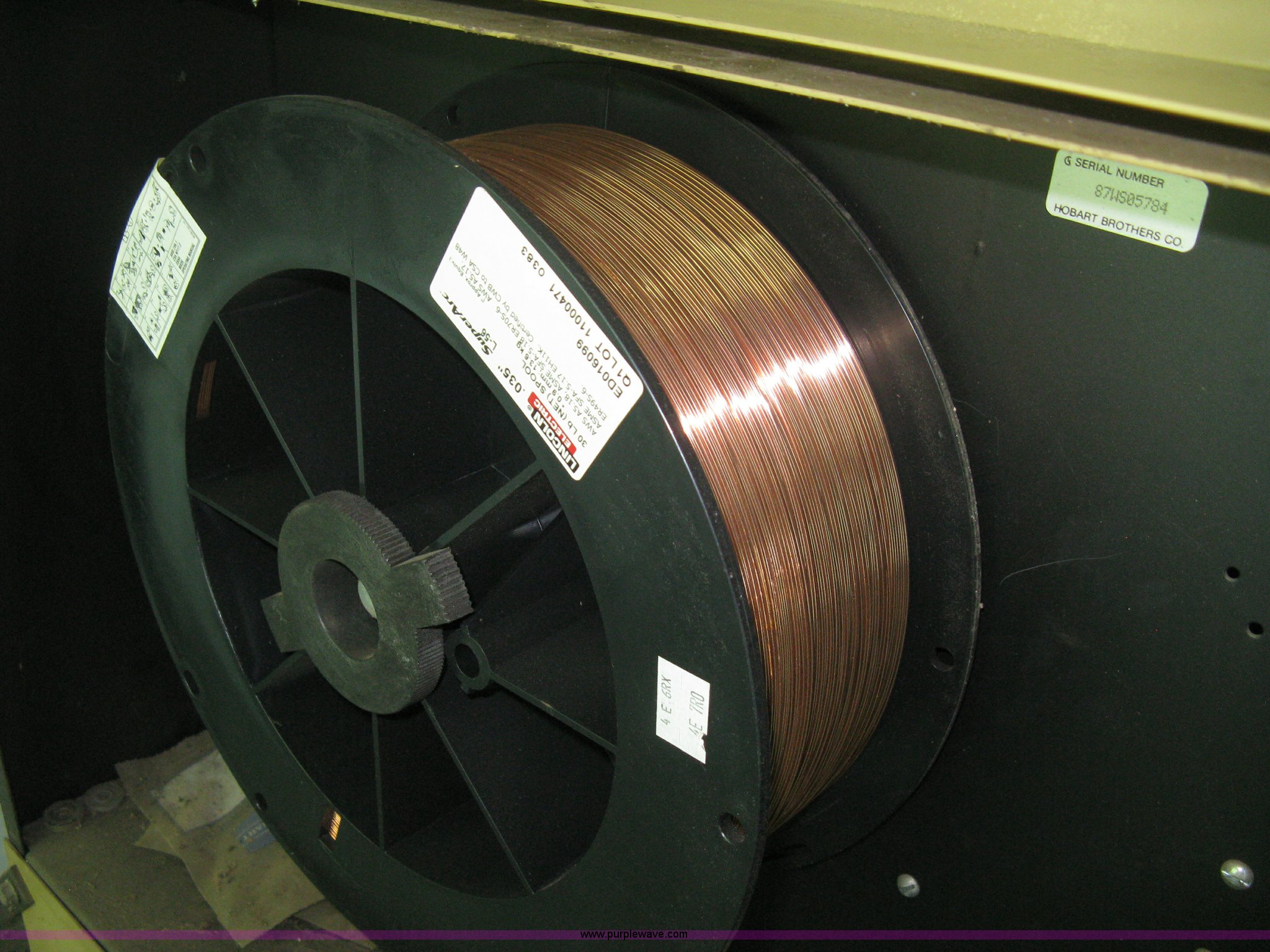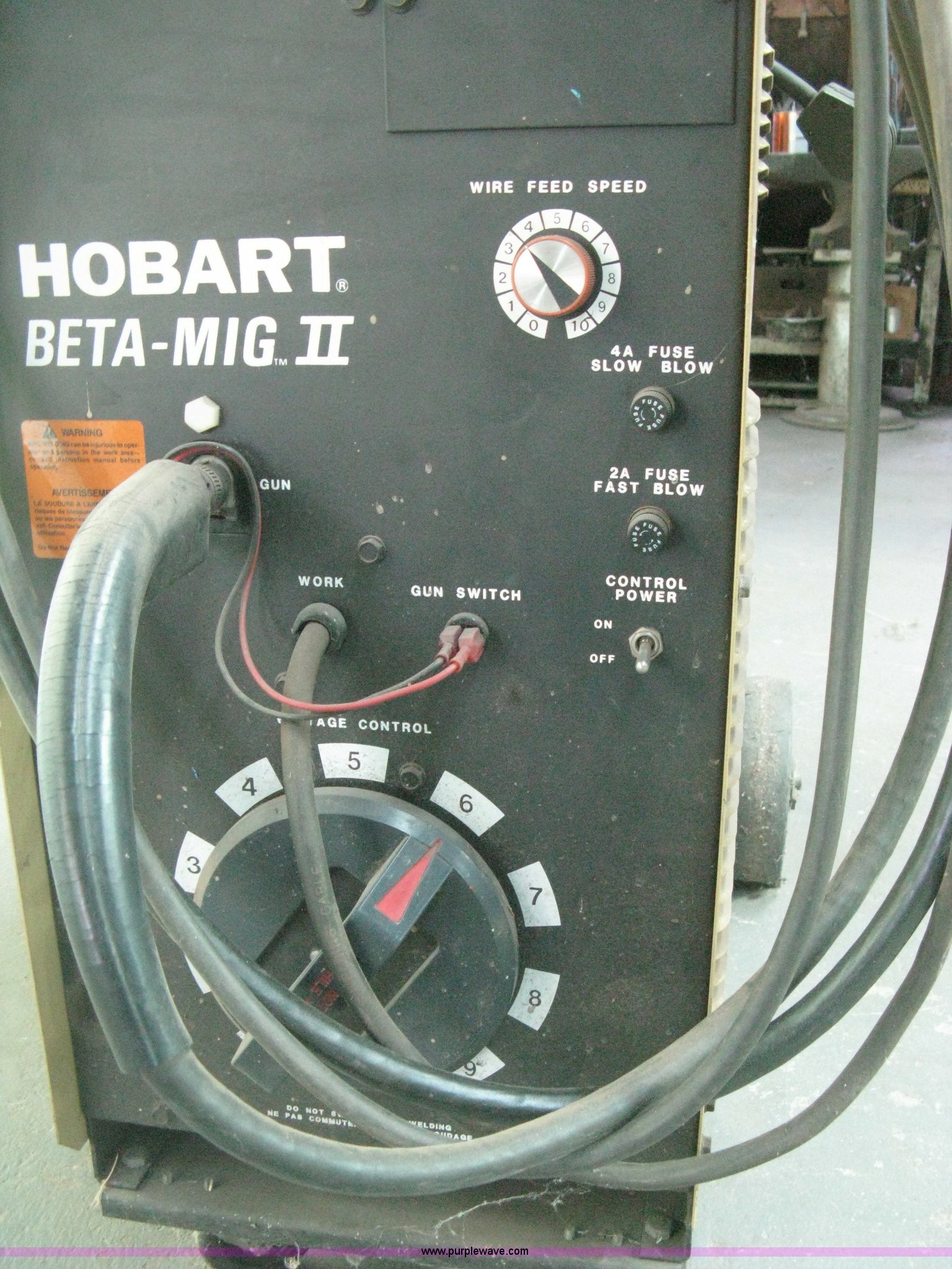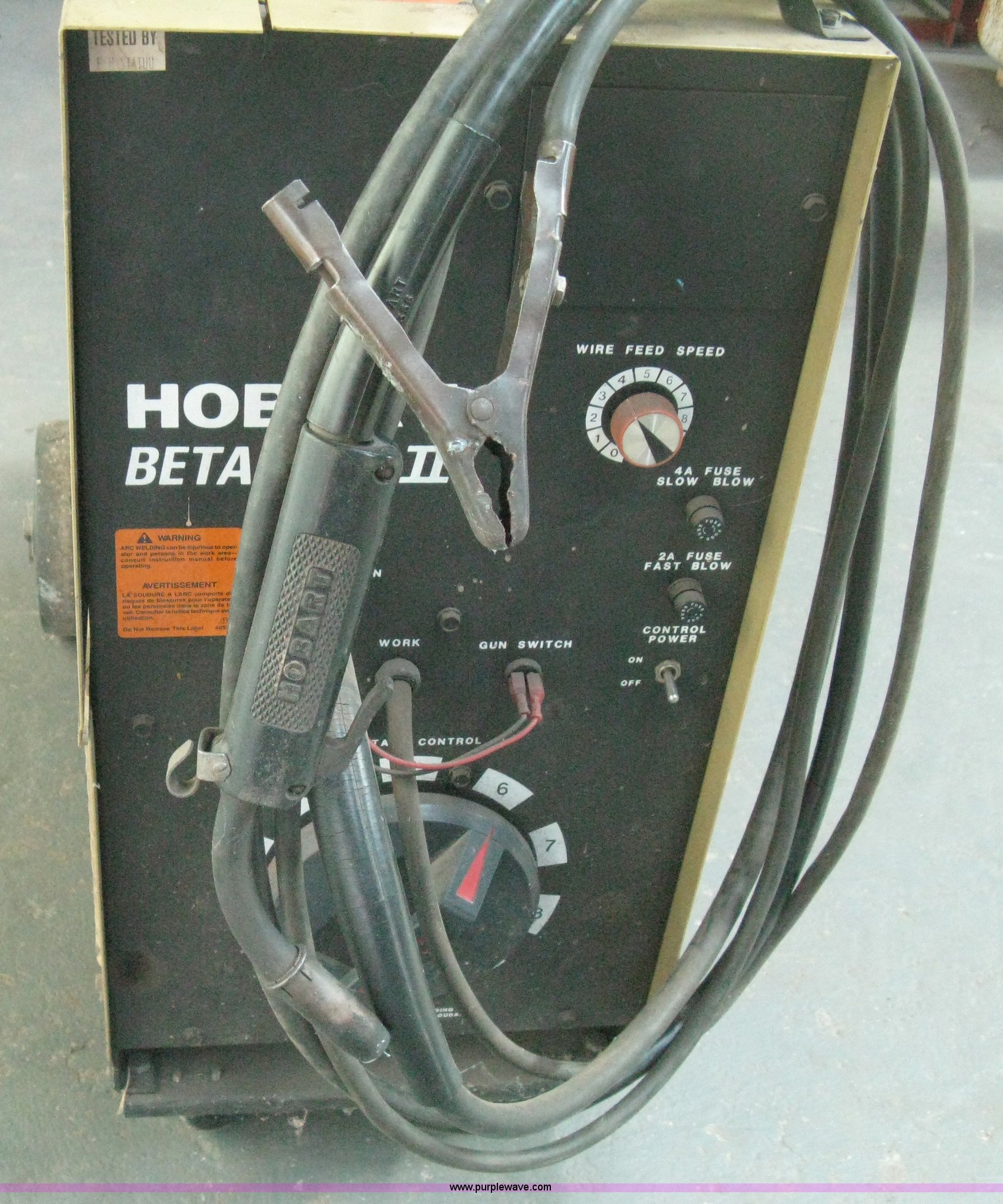 Purple Wave is selling a used Welder (Manual) in Kansas. This item is a Hobart Beta-Mig II welder with the following: 200 amp, 28V, Single phase, 220V platform, Leads, Roll around cart with bottle rack, Gauge included, Bottle not included, Serial 87WS05784