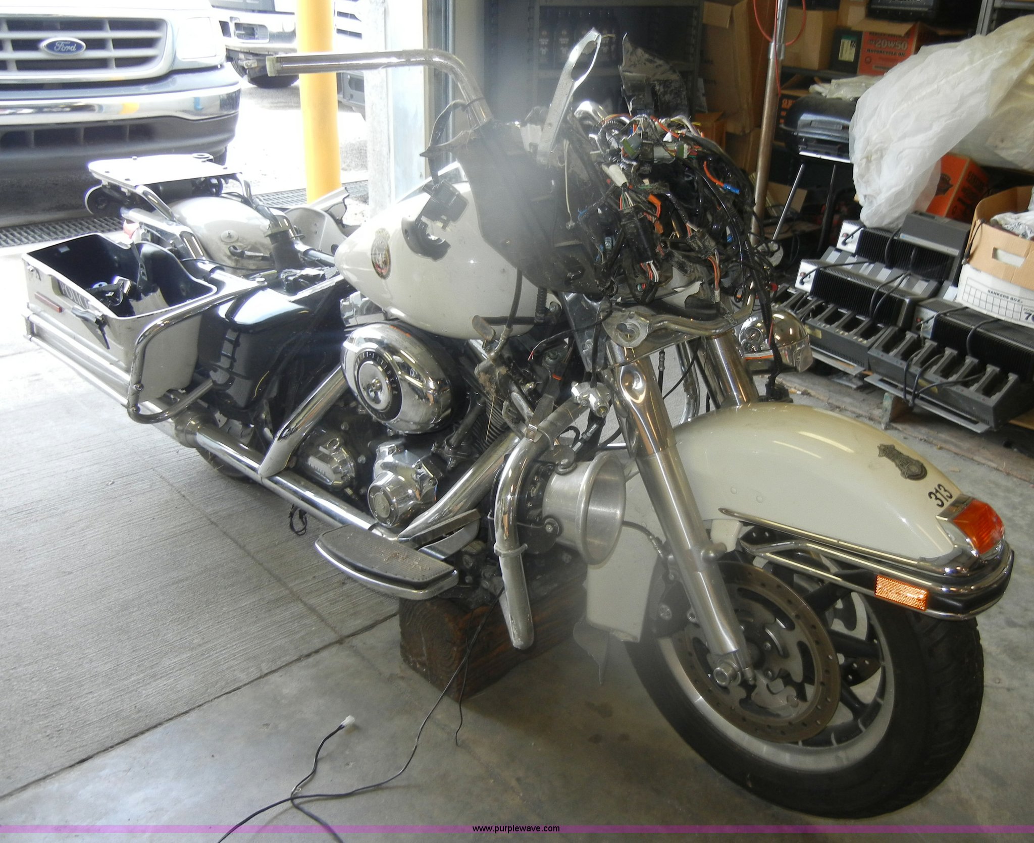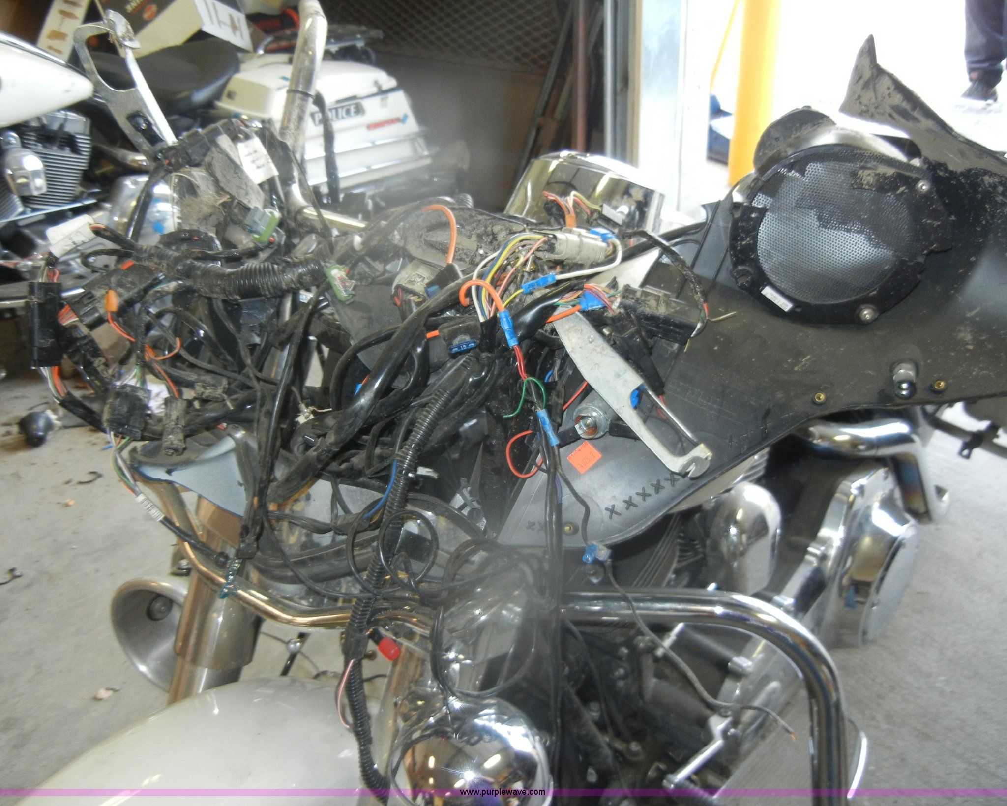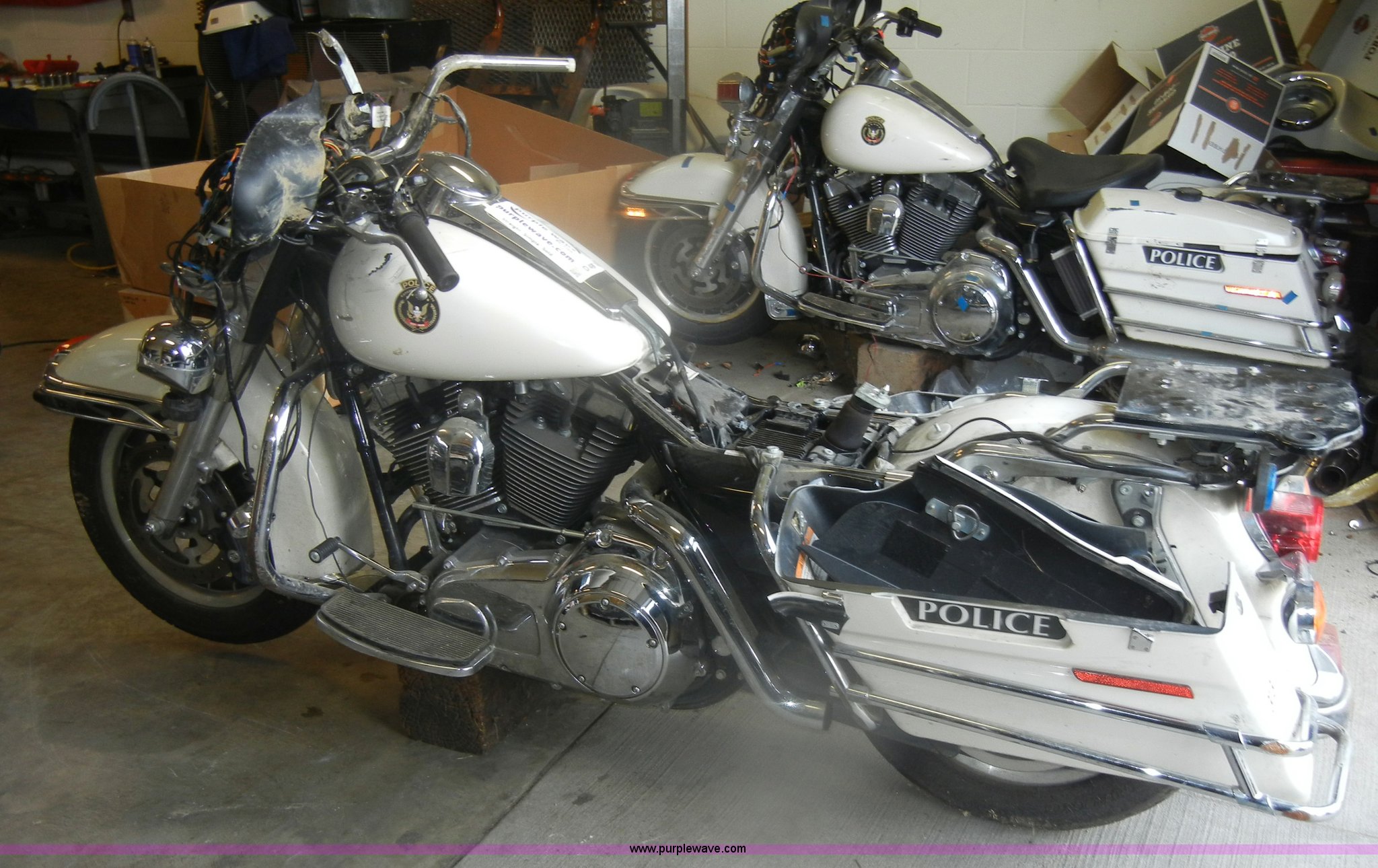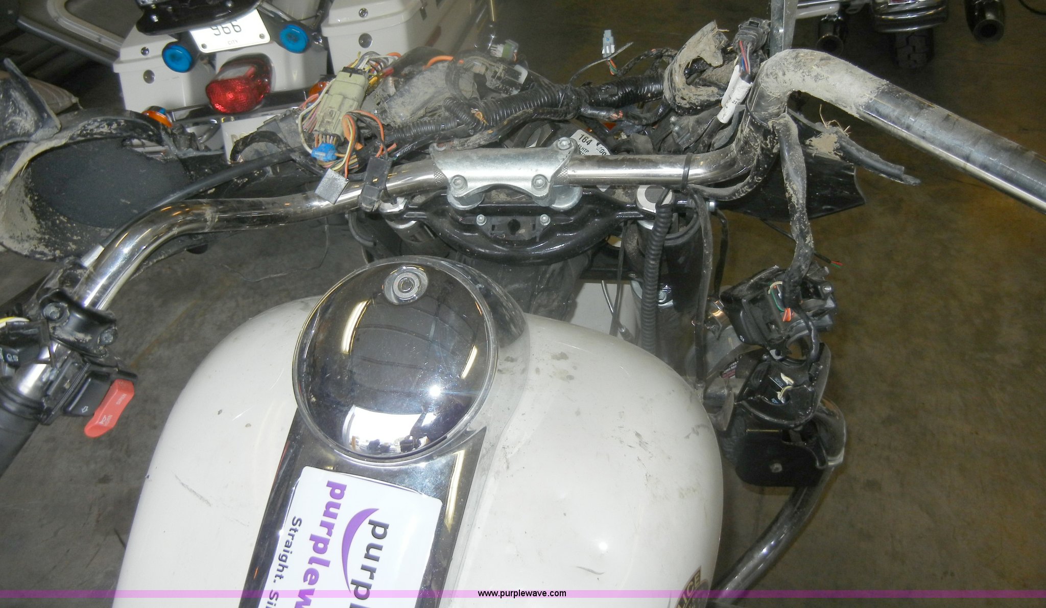 Purple Wave is selling a used Motorcycle in Kansas. This item is a 2008 Harley Davidson FLHTPI motorcycle with the following: 13,971 miles, No odometer, Six speed transmission, Disk brakes, MT90B16 M/C tires, Keys, Non-operational, has been wrecked, No seat, No electrical system, Missing parts, Saddlebags damaged