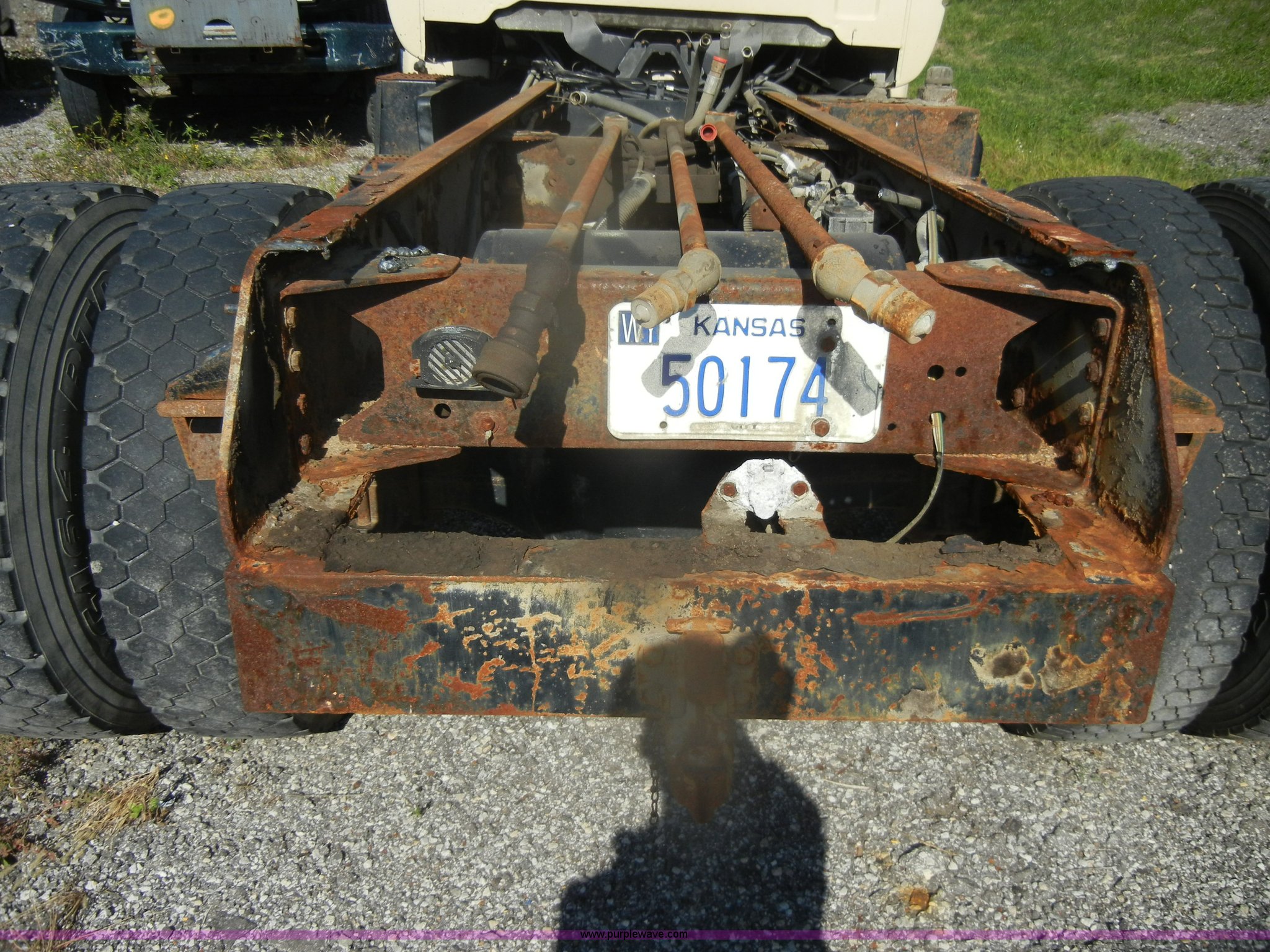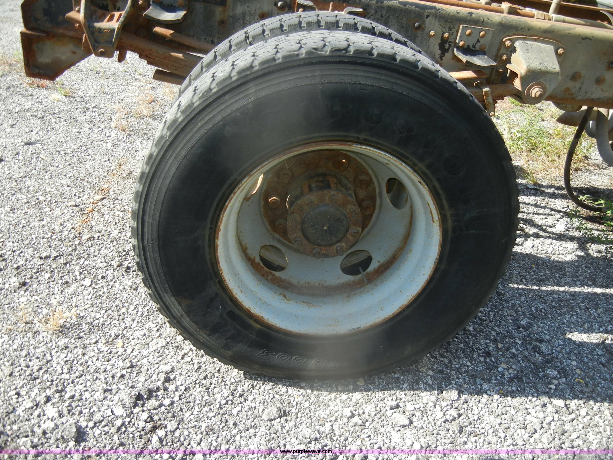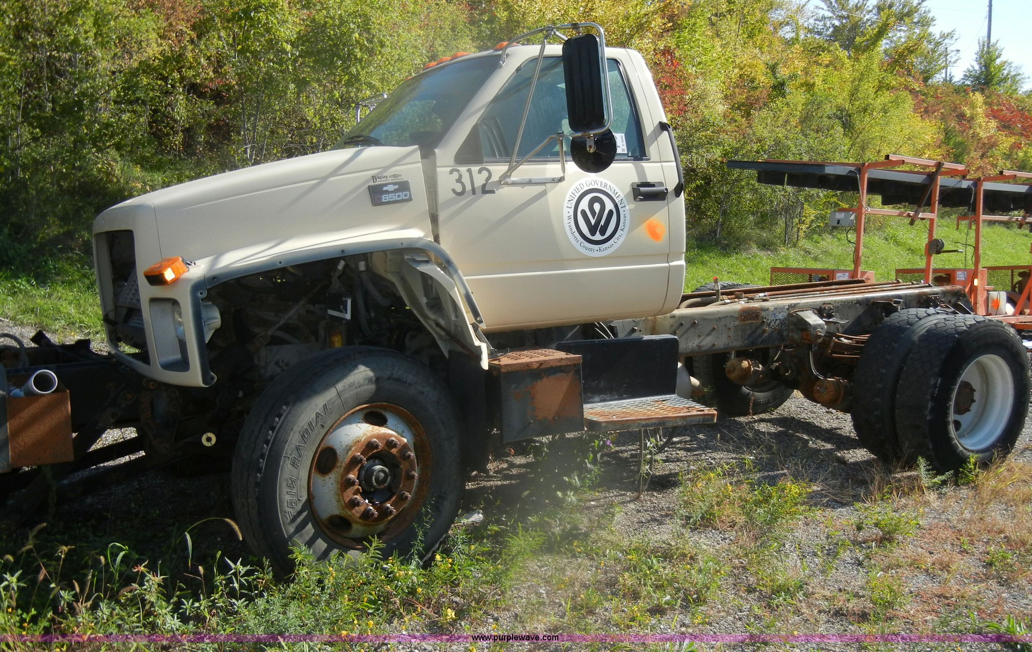 Purple Wave is selling a used Truck Chassis in Kansas. This item is a 1999 Chevrolet C8500 dump truck with the following: No engine or transmission, Vinyl bench seat, Baker snow plow frame, Trailer wiring, Pintle hitch, 50 gallon fuel tank, Spring suspension, Air brakes, 11R22.5 tires, Flat tires, GVWR 35,350 lbs, FAWR 12,350 lbs, RAWR 23,000 lbs, Interior/exterior cosmetic damage, Non-operational, parts only, Must be towed, No keys, Dashboard missing, Hood disconnected, Unit# 312
