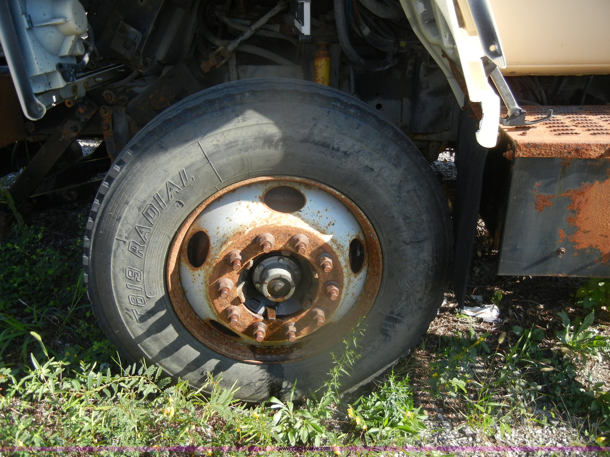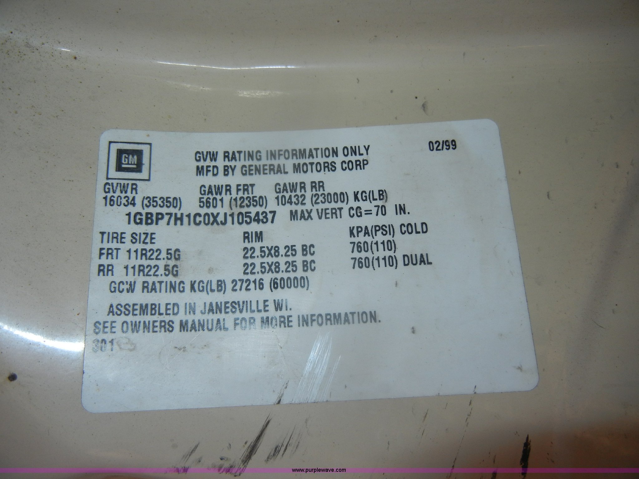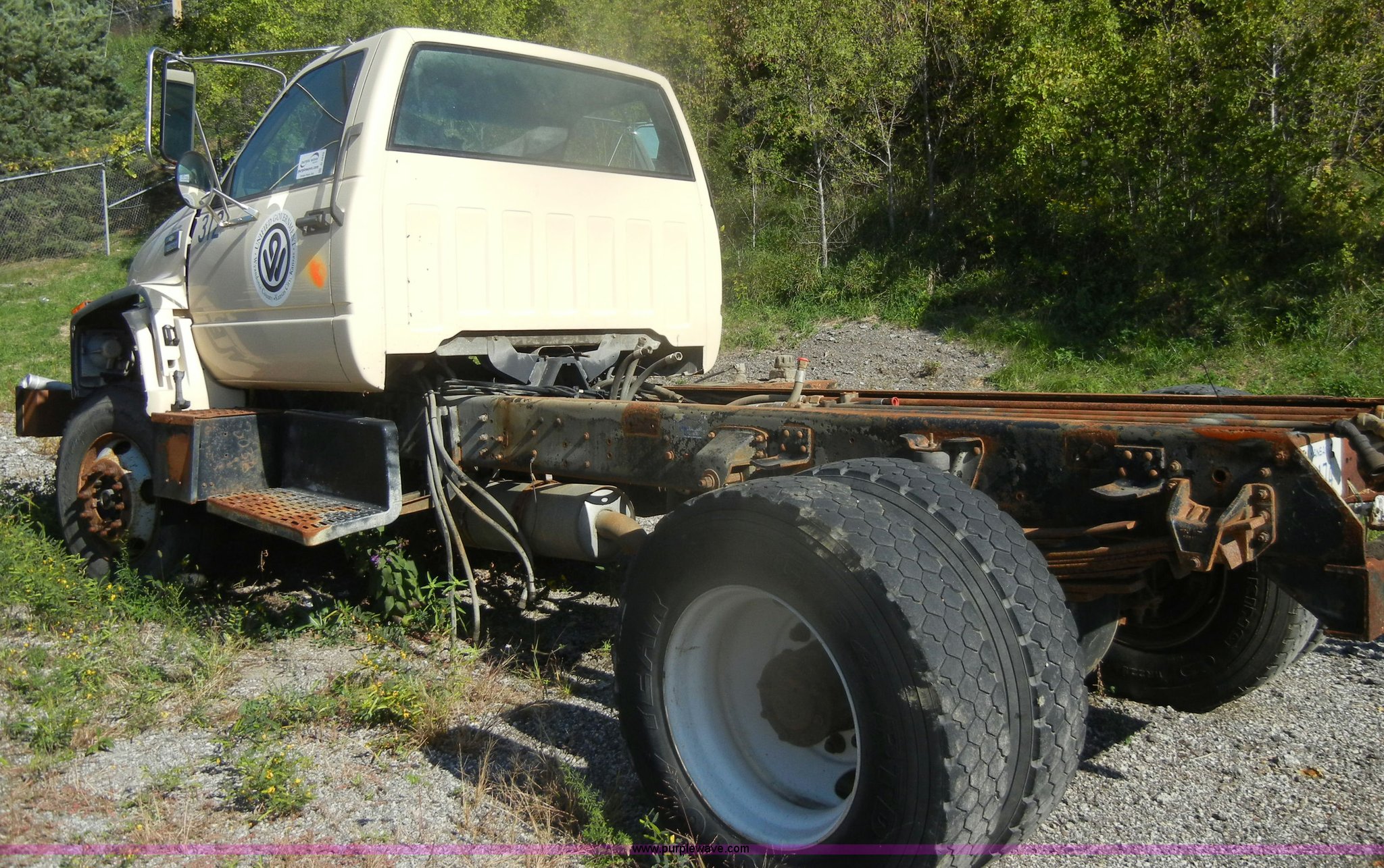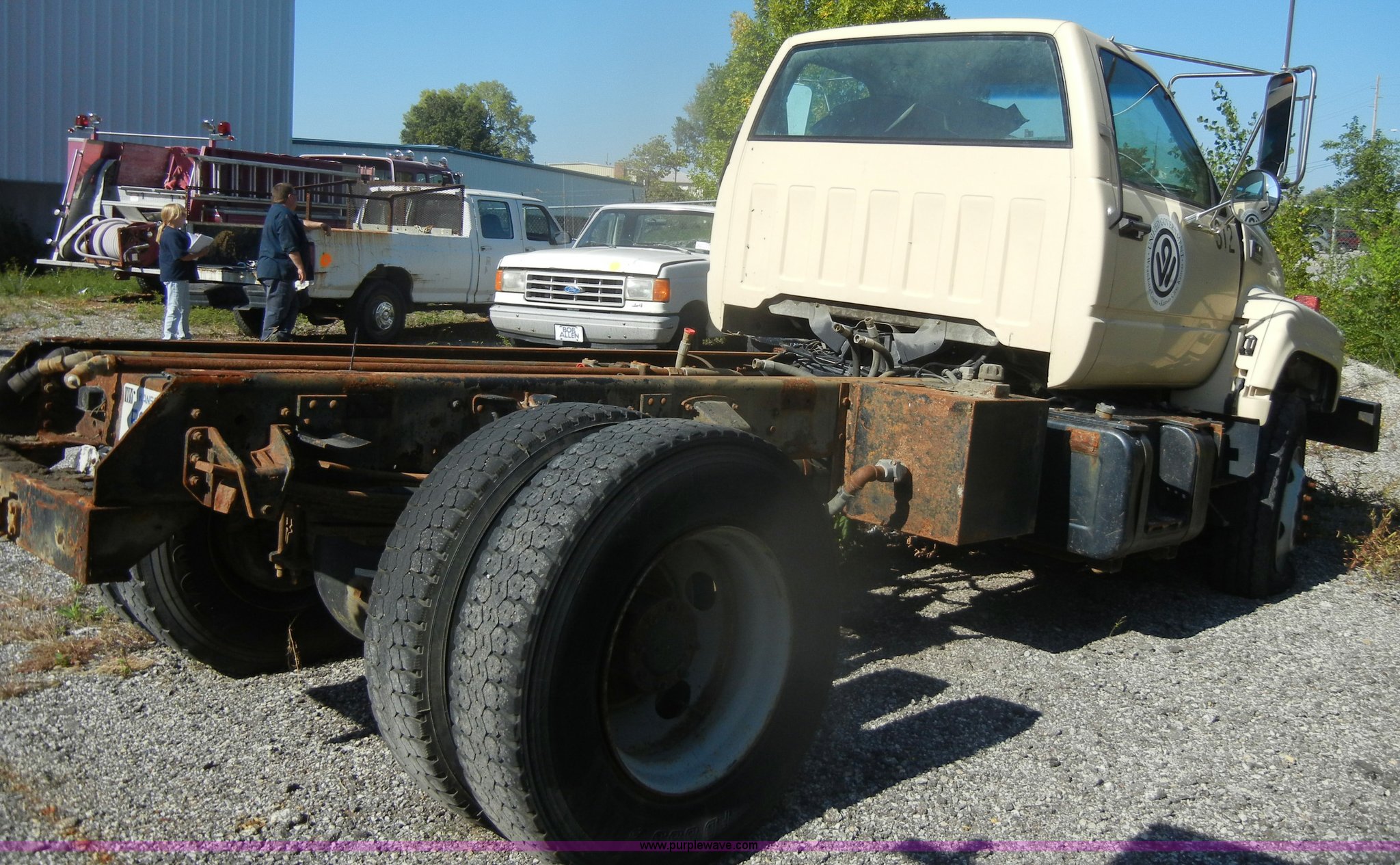 Purple Wave is selling a used Truck Chassis in Kansas. This item is a 1999 Chevrolet C8500 dump truck with the following: No engine or transmission, Vinyl bench seat, Baker snow plow frame, Trailer wiring, Pintle hitch, 50 gallon fuel tank, Spring suspension, Air brakes, 11R22.5 tires, Flat tires, GVWR 35,350 lbs, FAWR 12,350 lbs, RAWR 23,000 lbs, Interior/exterior cosmetic damage, Non-operational, parts only, Must be towed, No keys, Dashboard missing, Hood disconnected, Unit# 312