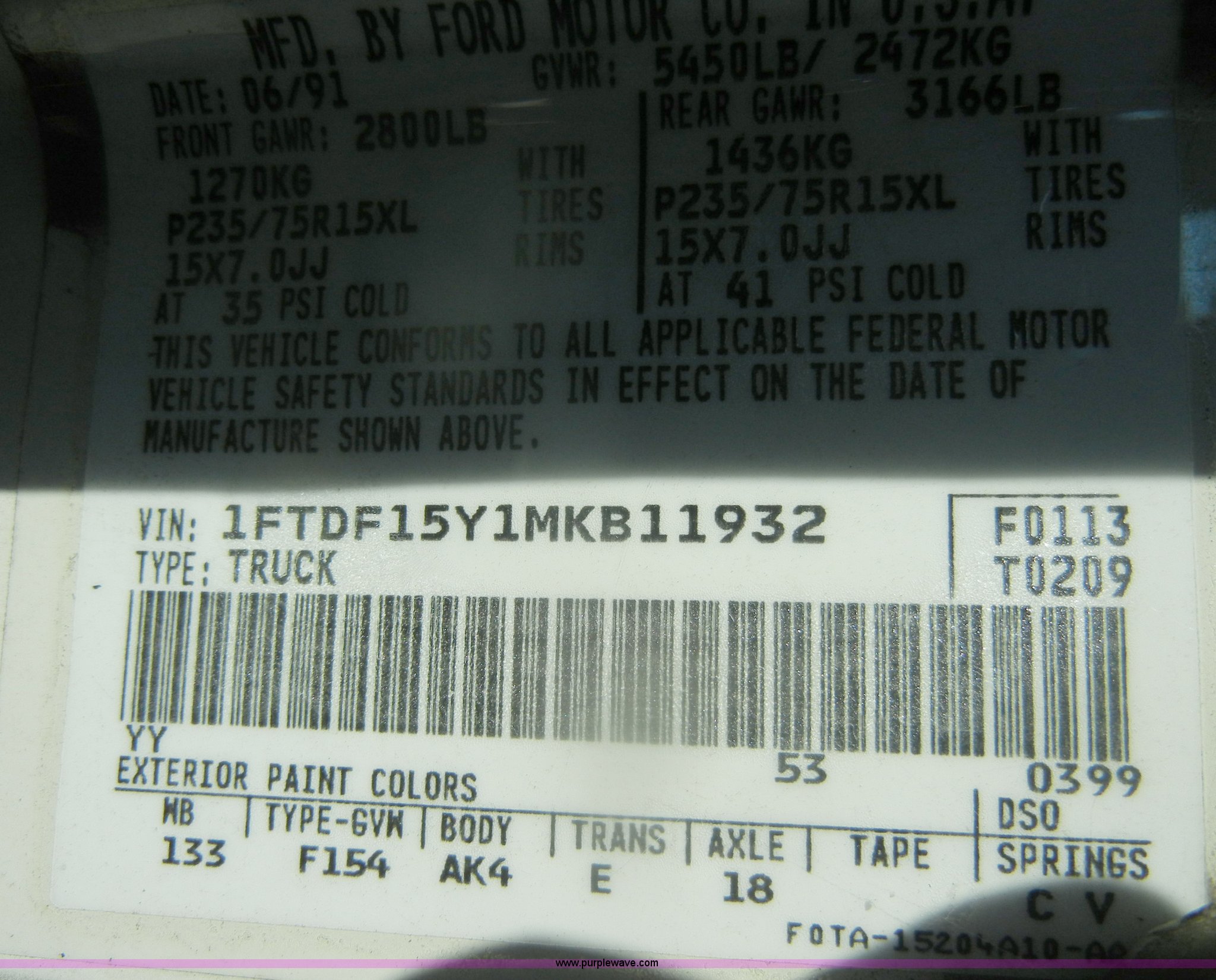 1991 Ford F150 Custom pickup truck. 72,205 miles on odometer, 4.9L I6 EFI gas engine, Automatic transmission, Heat, AM/FM, Manual windows and locks, Vinyl interior, Dual fuel tanks, Rugged bed liner, Ball hitch, 235/75R15 tires, Flat tires, Interior/exterior cosmetic damage, Cracked windshield, No tailgate, Dents and scratches, Paint peeling/chipping, Missing side mirrors, Will not start, must be towed, No keys. View Disclosure. 1FTDF15Y1MKB11932. Shipping quotes available. Unified Government of Wyandotte Co/KC KS. 5033 State Ave. Kansas City, KS 66102