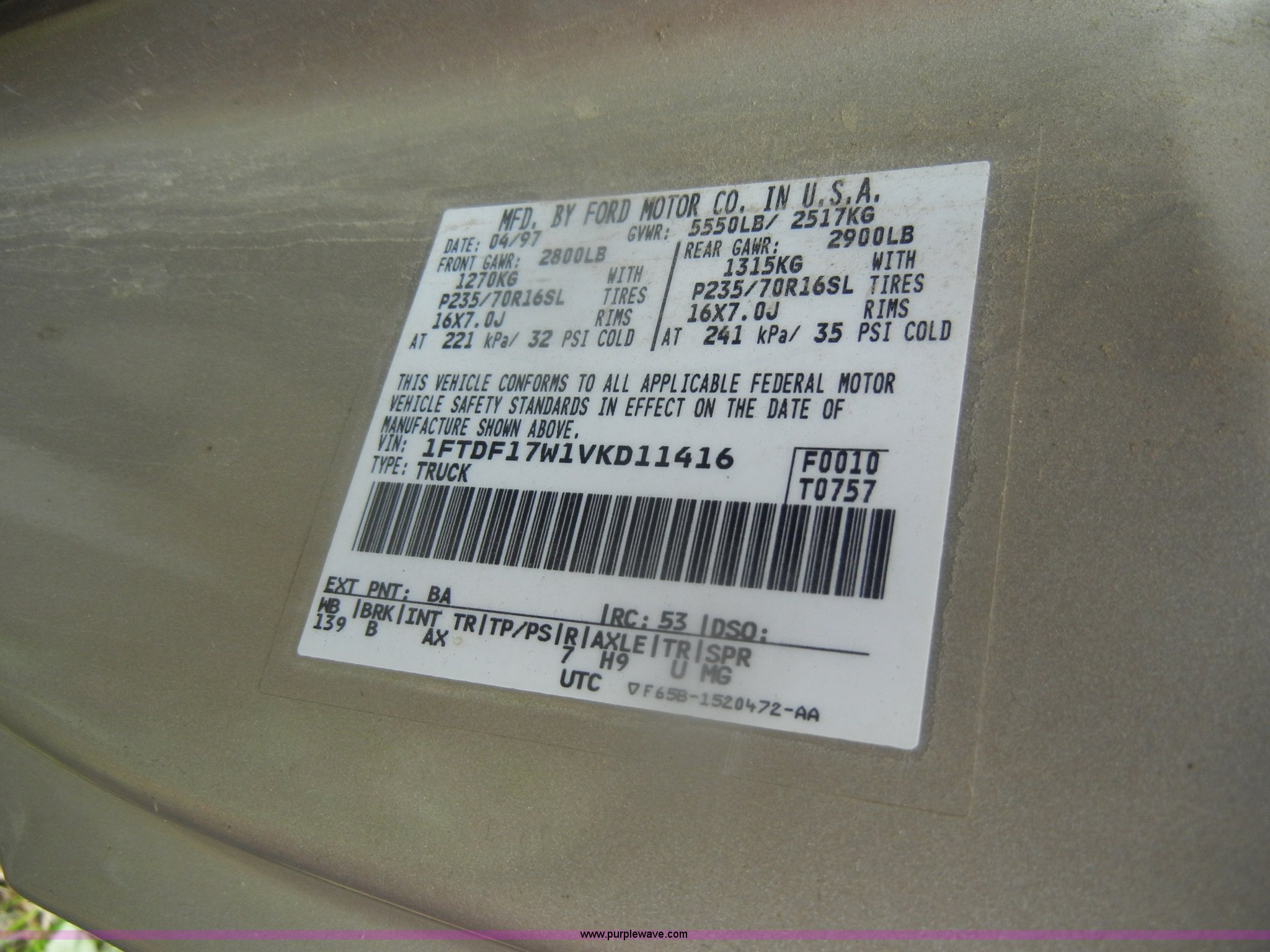 Purple Wave is selling a used Passenger Vehicle in Kansas. This item is a 1997 Ford F150 pickup truck with the following: 162,410 miles on odometer, 4.6L V8 EFI gas engine, Automatic transmission, AC and heat, AM/FM, Manual windows and locks, Vinyl interior, 225/75R16 tires, Dead battery, Bad brakes, Rust