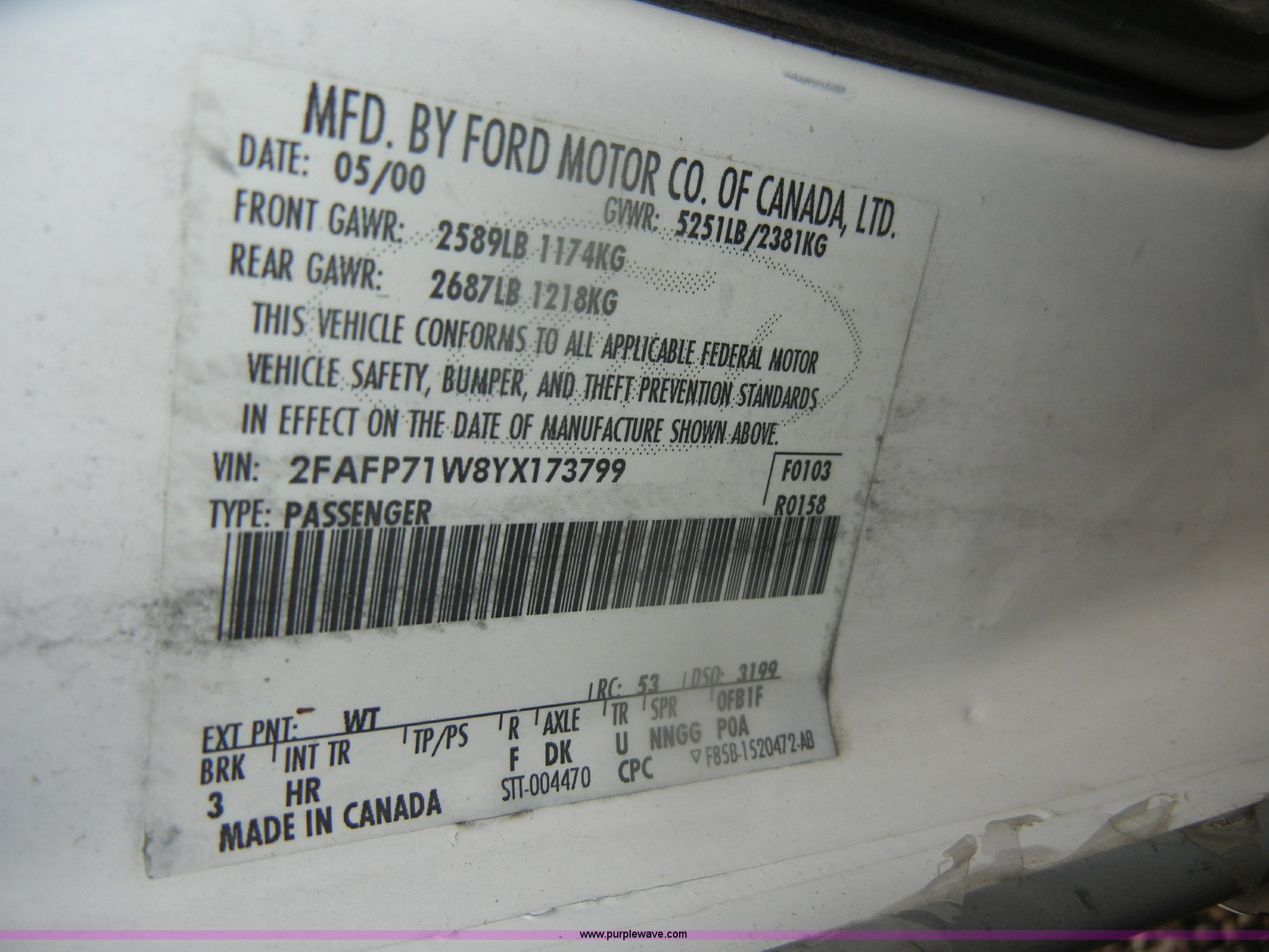2000 Ford Crown Victoria Police Interceptor. 138,865 miles on odometer, 4.6L V8 EFI gas engine, Automatic transmission, AC and heat, Tilt, Cruise, AM/FM, Power windows, locks, mirrors, and seats, Cloth interior, 225/60R16 tires, Rust, Dead battery, Unit# 21934B. View Disclosure. Title distribution may be delayed up to 14 days from verification of funds. 2FAFP71W8YX173799. Shipping quotes available. Unified Government of Wyandotte Co/KC KS. 5033 State Ave. Kansas City, KS 66102