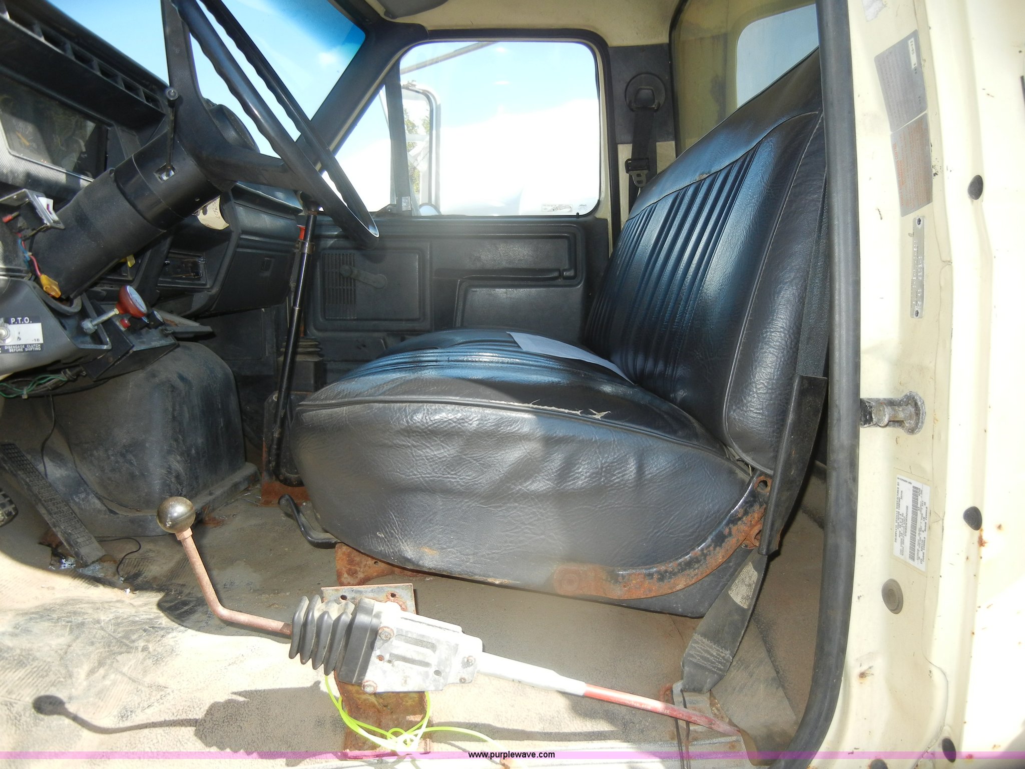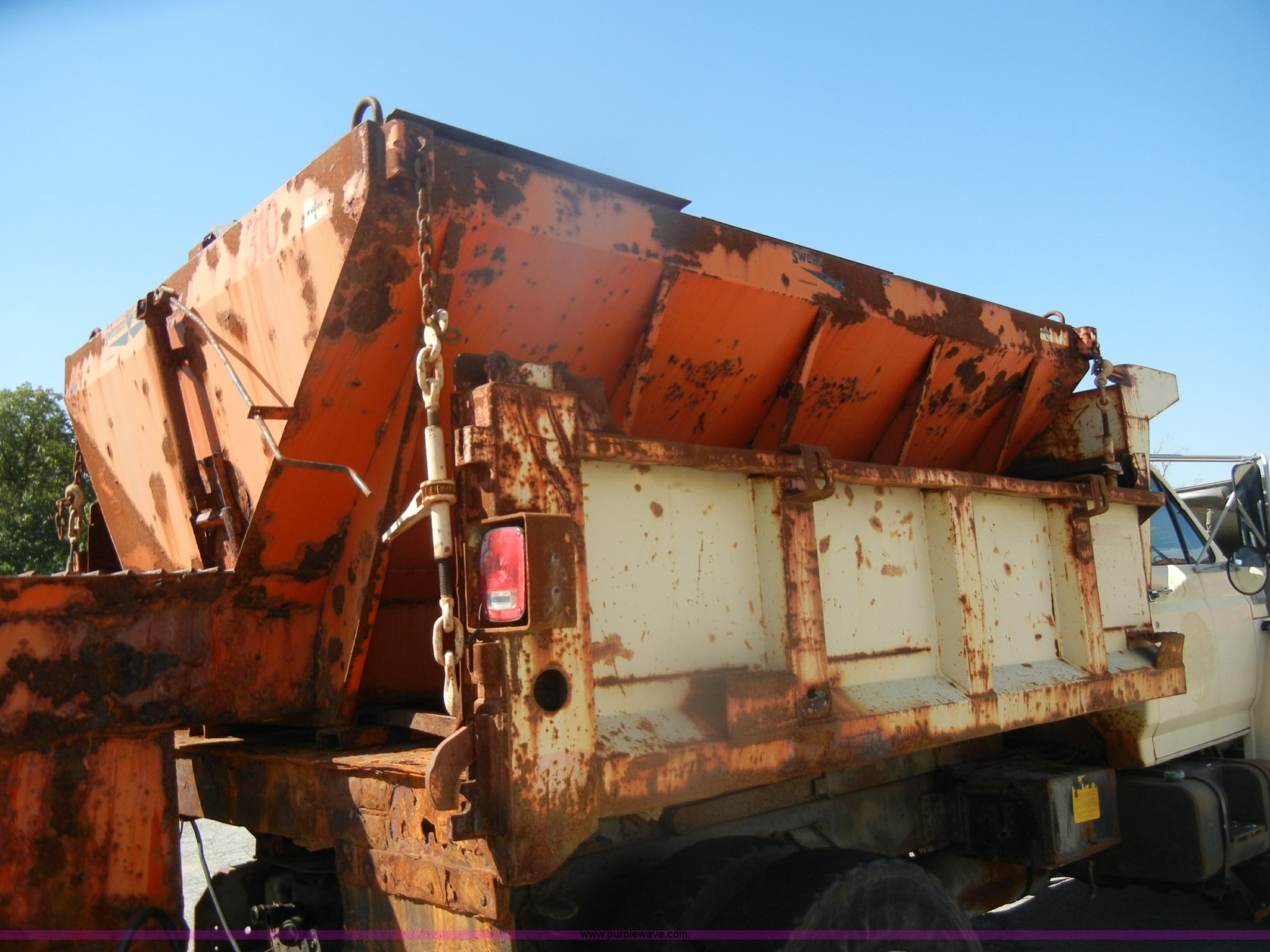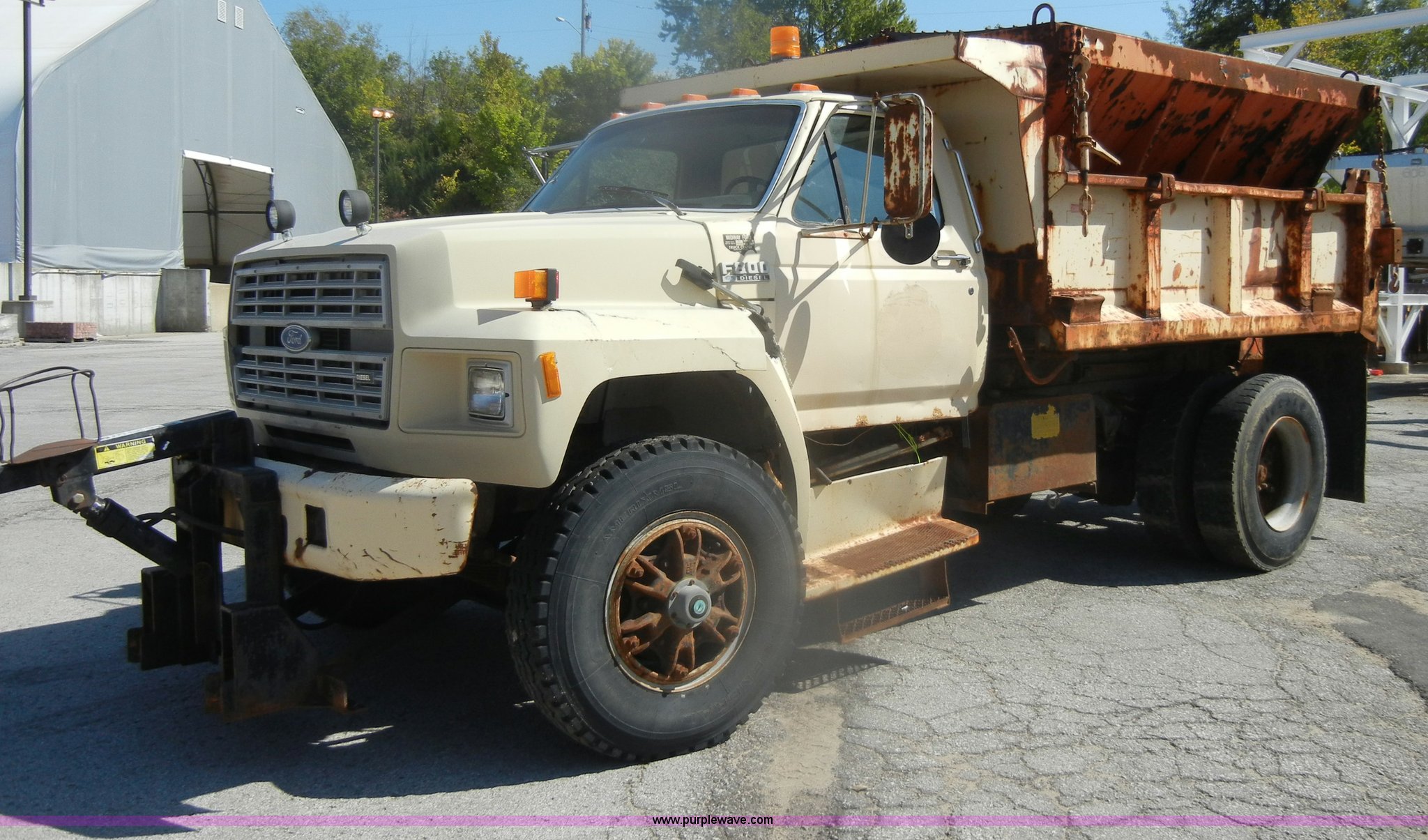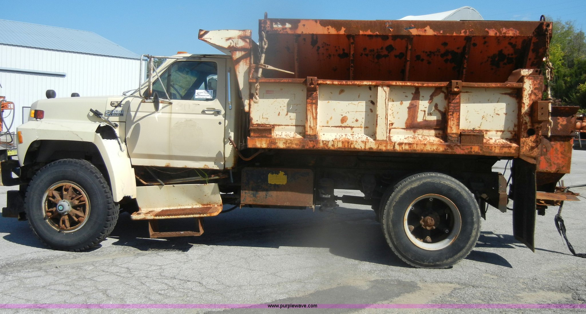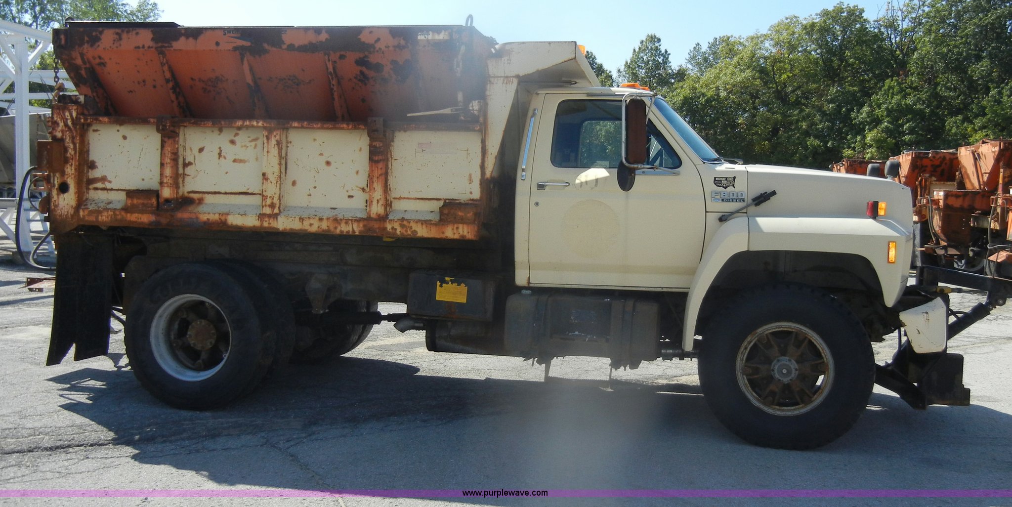 Purple Wave is selling a used Construction Dump Truck in Kansas. This item is a 1994 Ford F800 dump truck with the following: 104,514 miles on odometer, Cummins ISC 8.3L L6 diesel engine, Five speed manual transmission, Two speed axle, Heat, Warren 10' bed, Manual end gate, Flink plow bracket, Swenson 10' spreader, Pintle hitch, 50 gallon fuel tank, Spring suspension, PTO, Air brakes, 10.00R20 front tires, 11R22.5 rear tires, GVWR 33,000 lbs, Rust, Drivers step and floorboard rusted