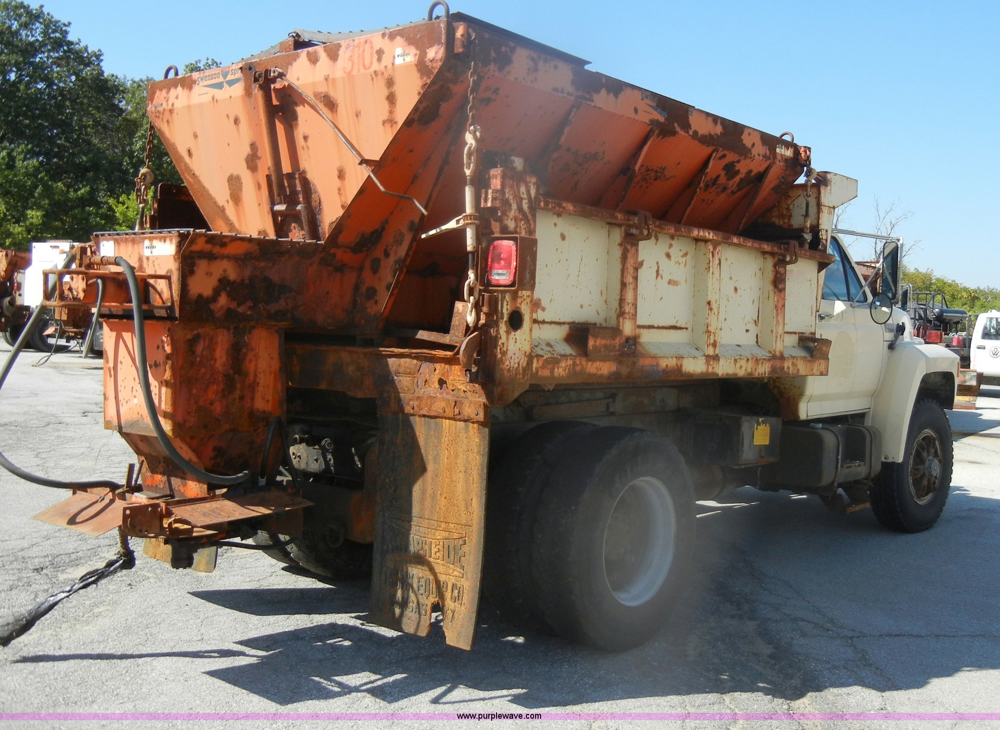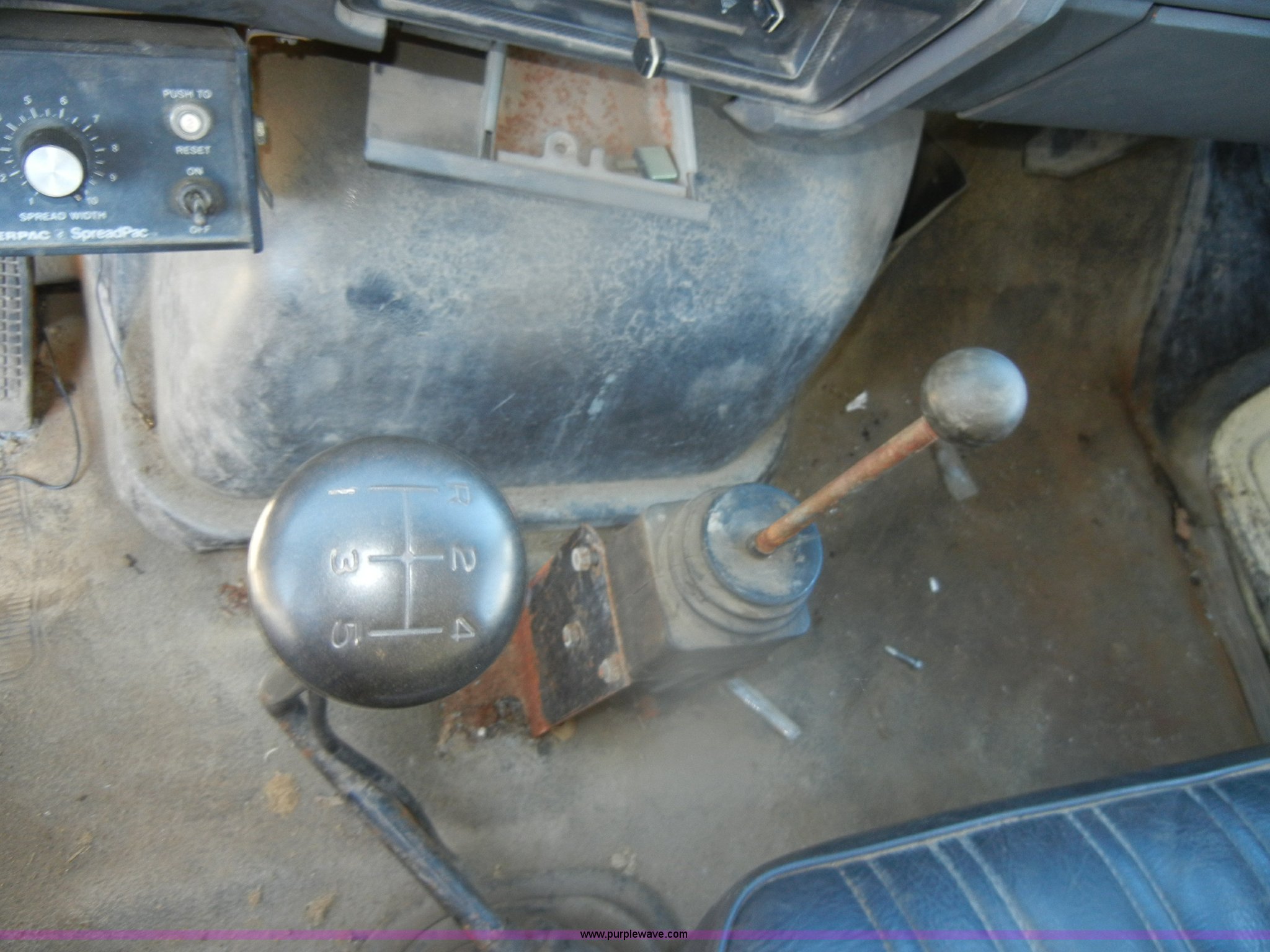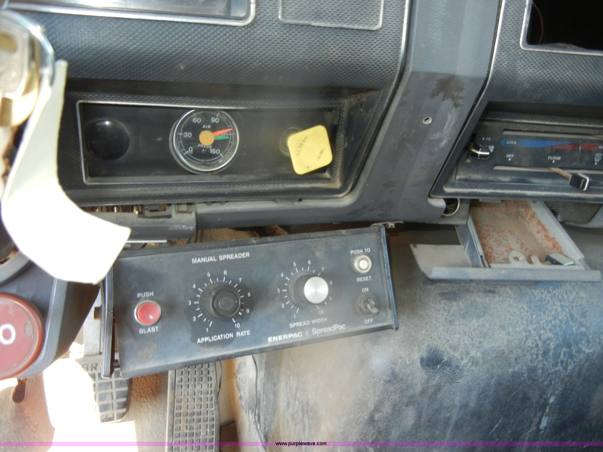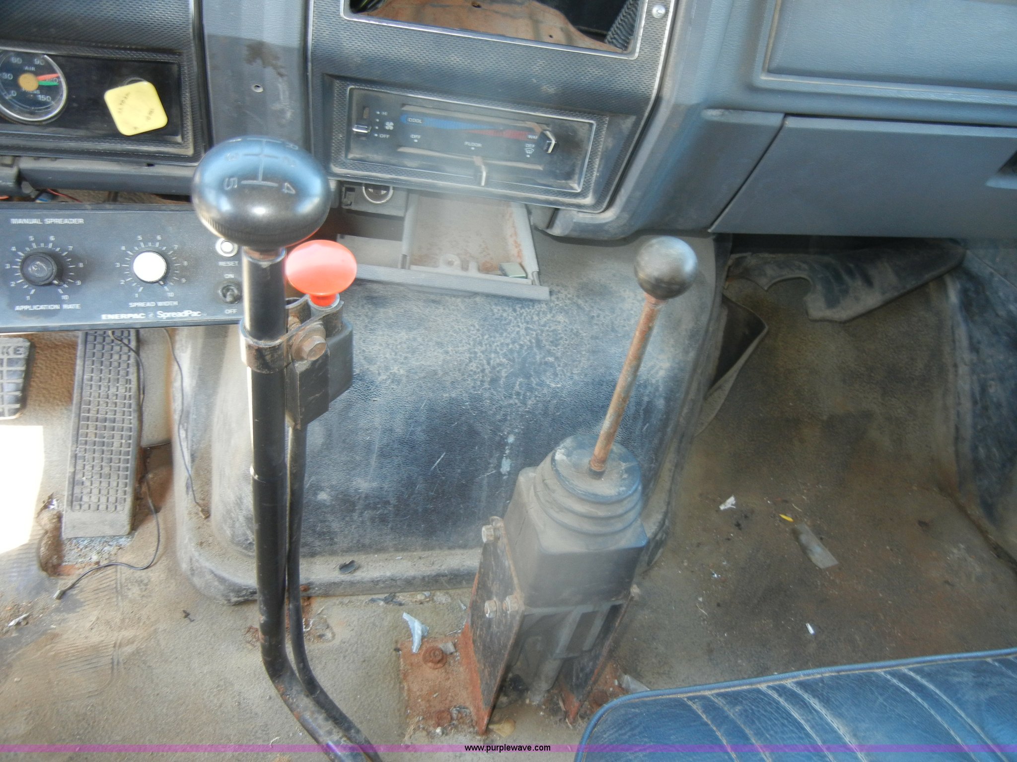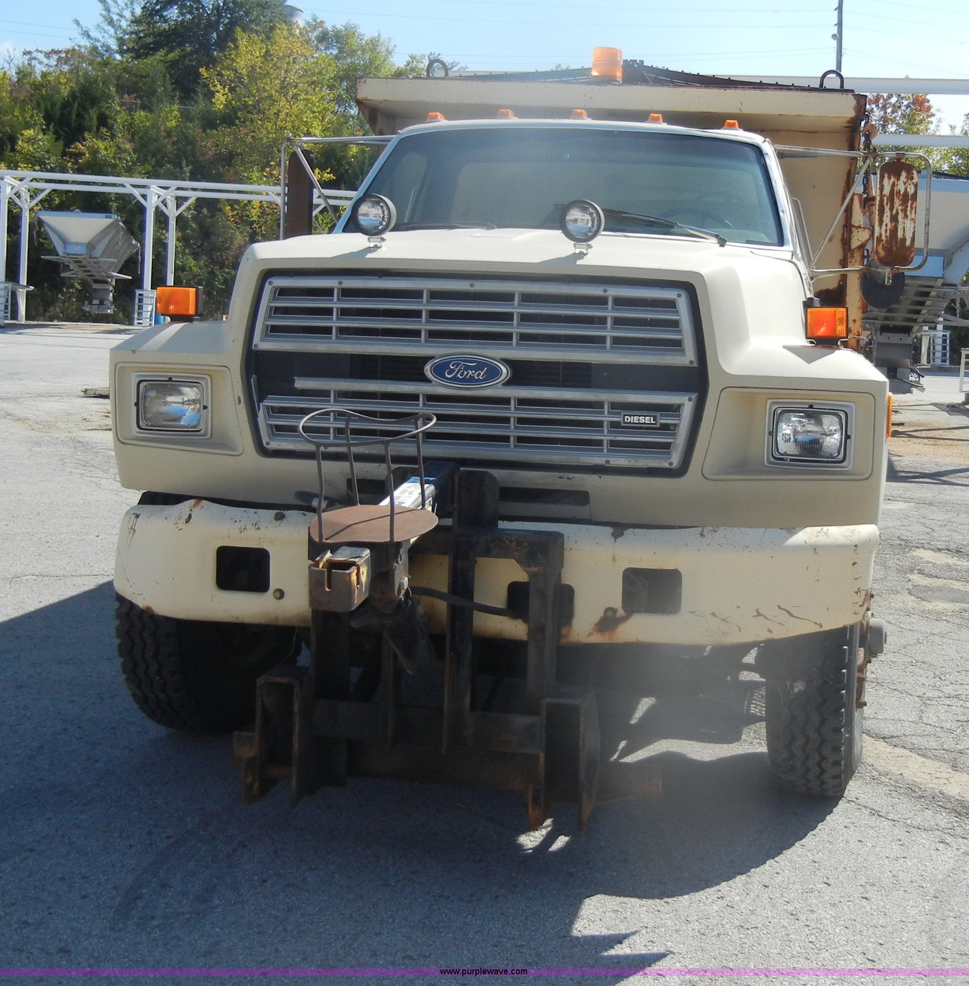 Purple Wave is selling a used Construction Dump Truck in Kansas. This item is a 1994 Ford F800 dump truck with the following: 104,514 miles on odometer, Cummins ISC 8.3L L6 diesel engine, Five speed manual transmission, Two speed axle, Heat, Warren 10' bed, Manual end gate, Flink plow bracket, Swenson 10' spreader, Pintle hitch, 50 gallon fuel tank, Spring suspension, PTO, Air brakes, 10.00R20 front tires, 11R22.5 rear tires, GVWR 33,000 lbs, Rust, Drivers step and floorboard rusted