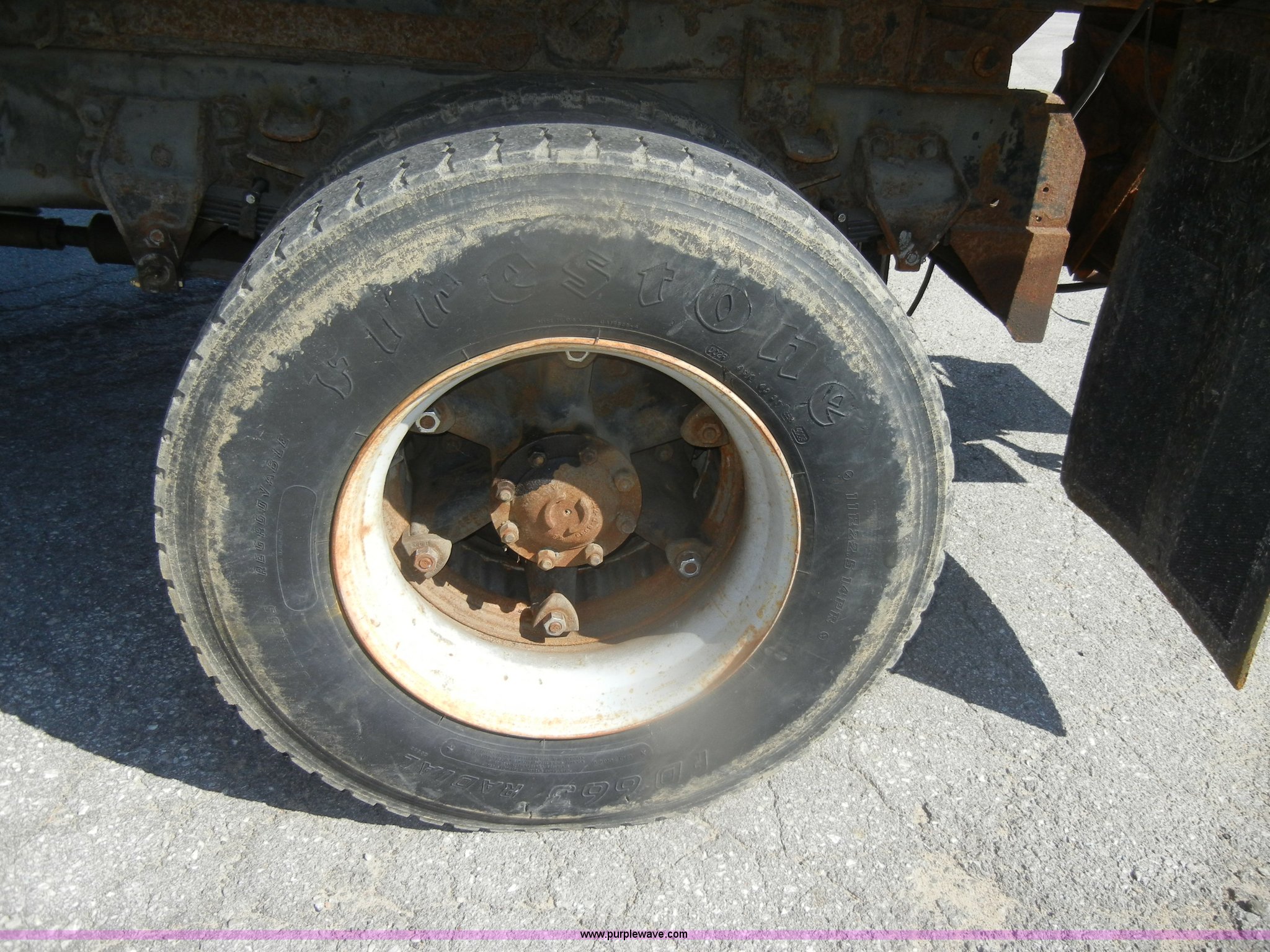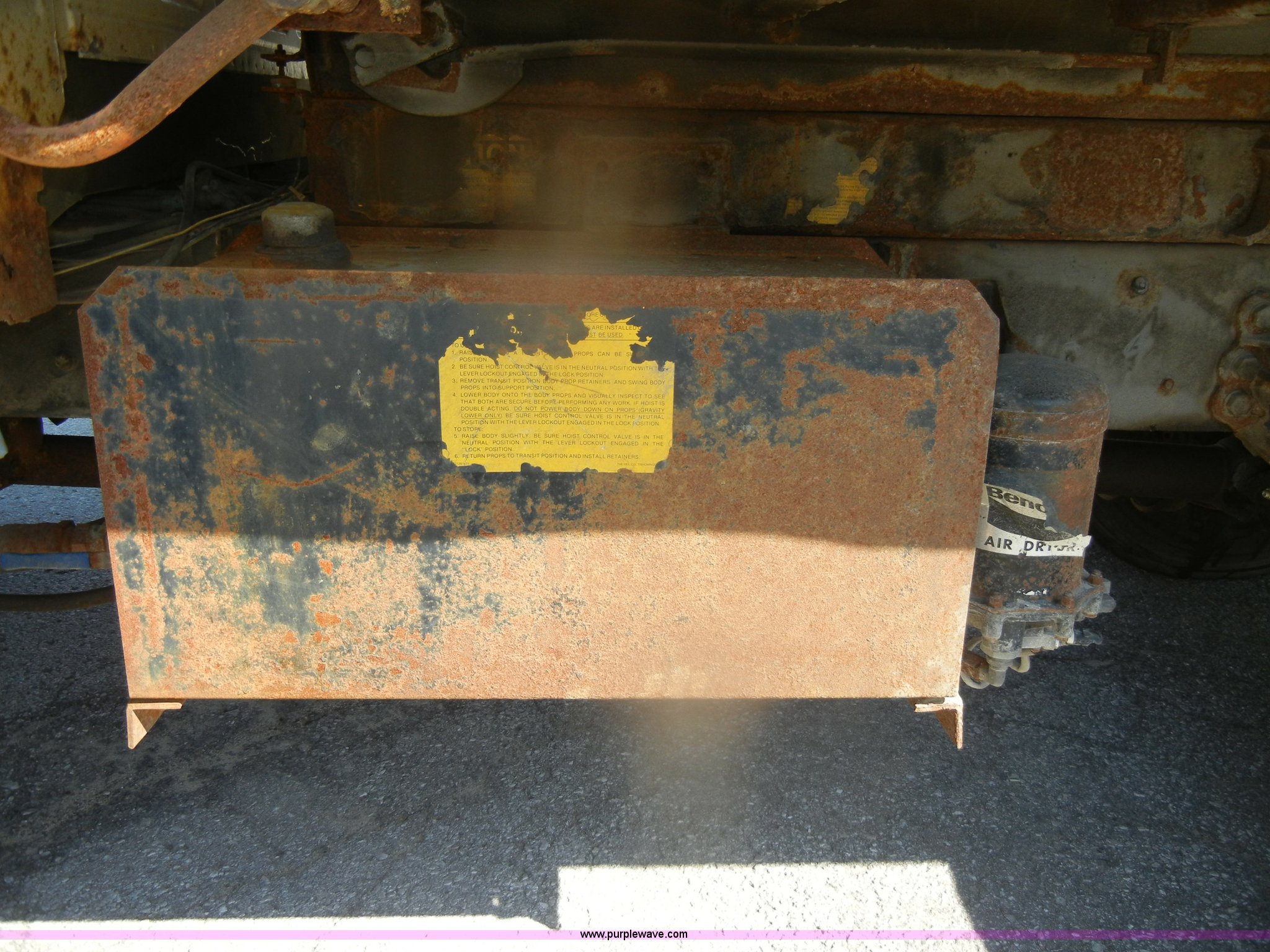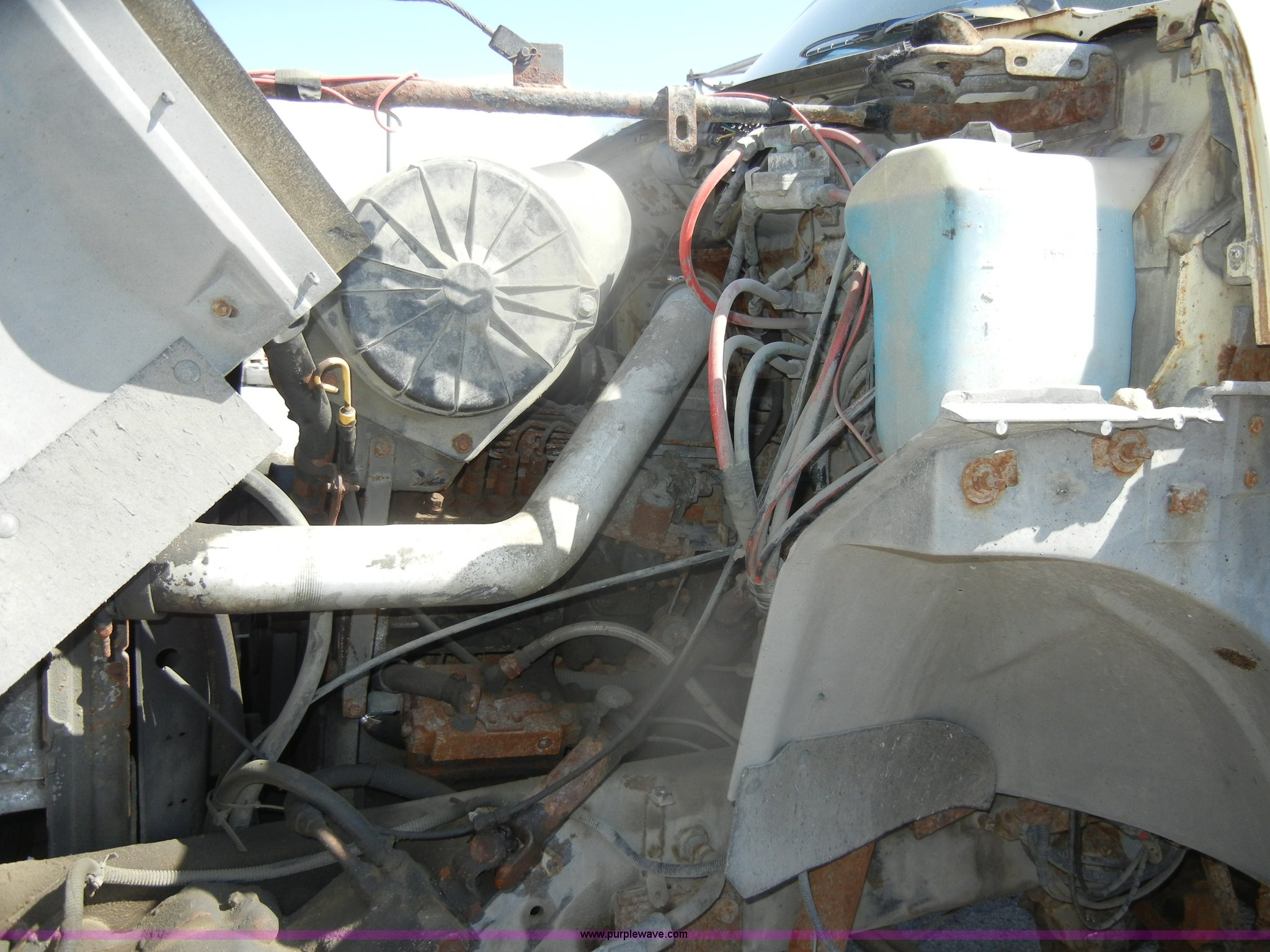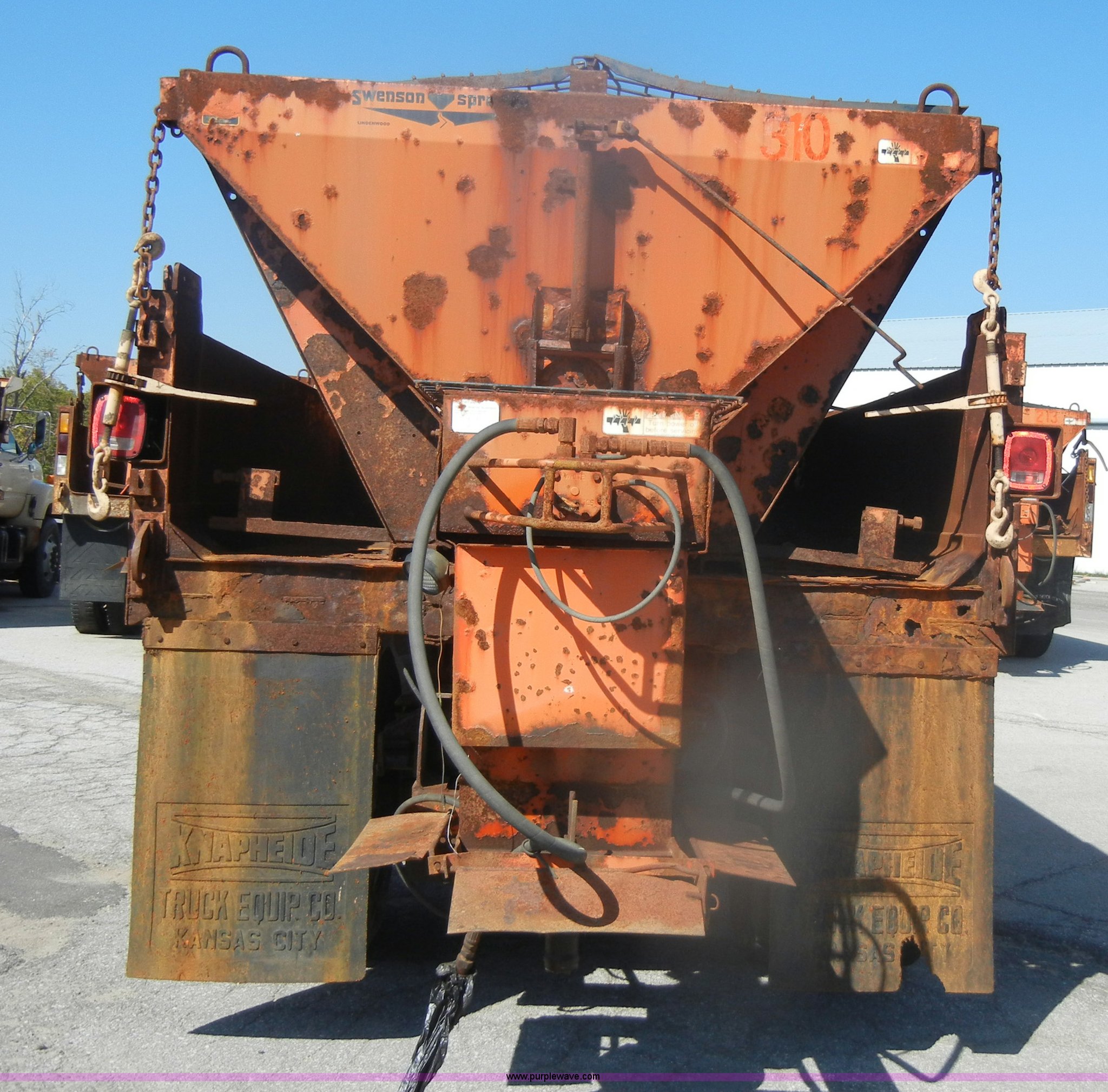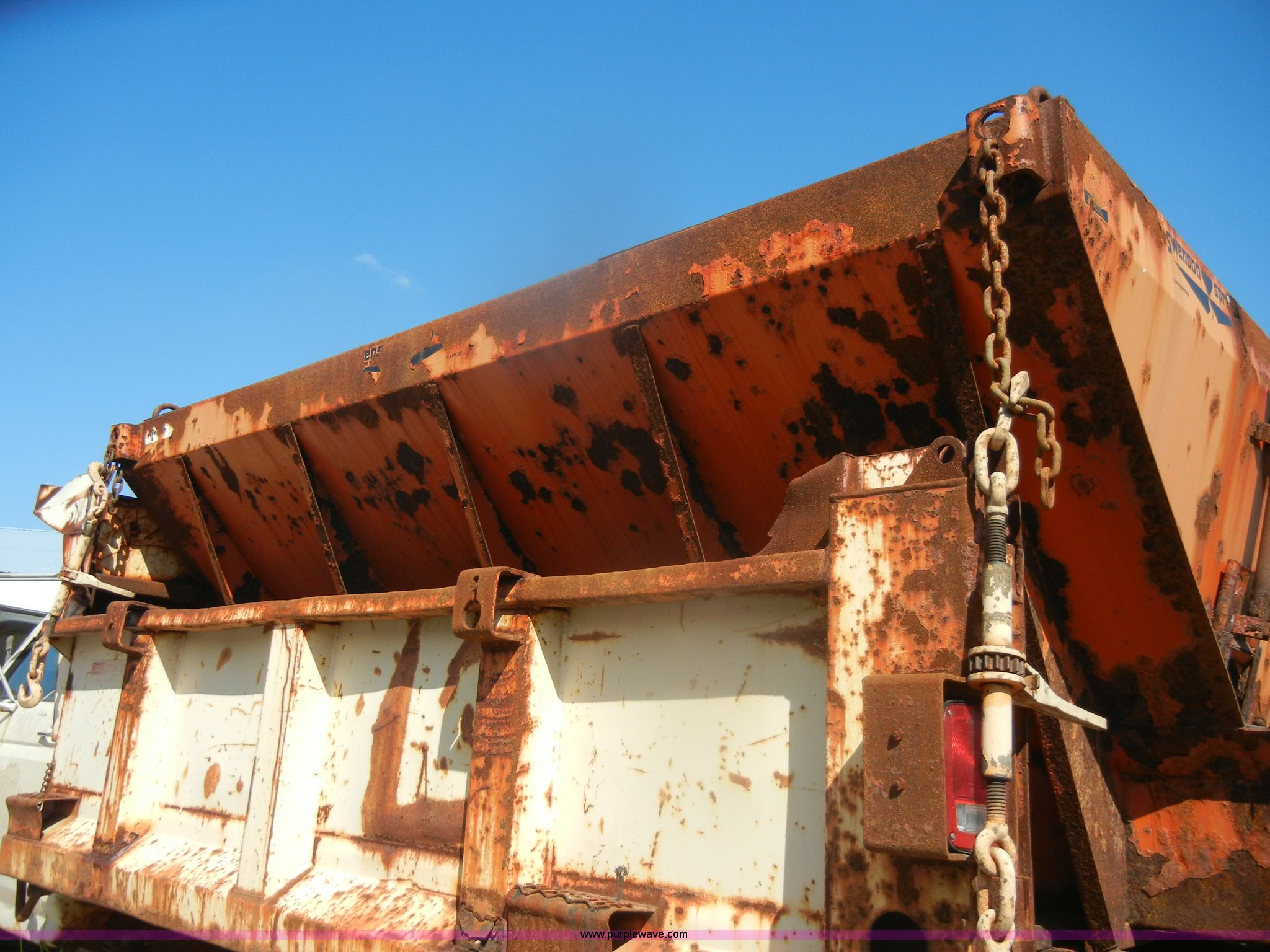 Purple Wave is selling a used Construction Dump Truck in Kansas. This item is a 1994 Ford F800 dump truck with the following: 104,514 miles on odometer, Cummins ISC 8.3L L6 diesel engine, Five speed manual transmission, Two speed axle, Heat, Warren 10' bed, Manual end gate, Flink plow bracket, Swenson 10' spreader, Pintle hitch, 50 gallon fuel tank, Spring suspension, PTO, Air brakes, 10.00R20 front tires, 11R22.5 rear tires, GVWR 33,000 lbs, Rust, Drivers step and floorboard rusted