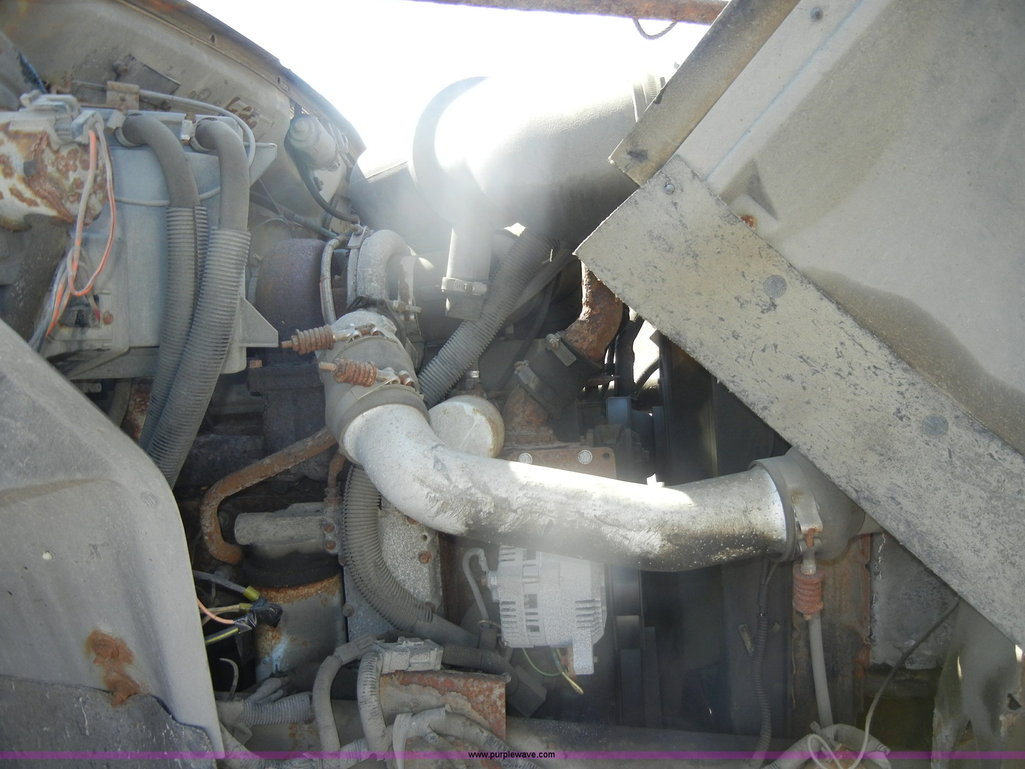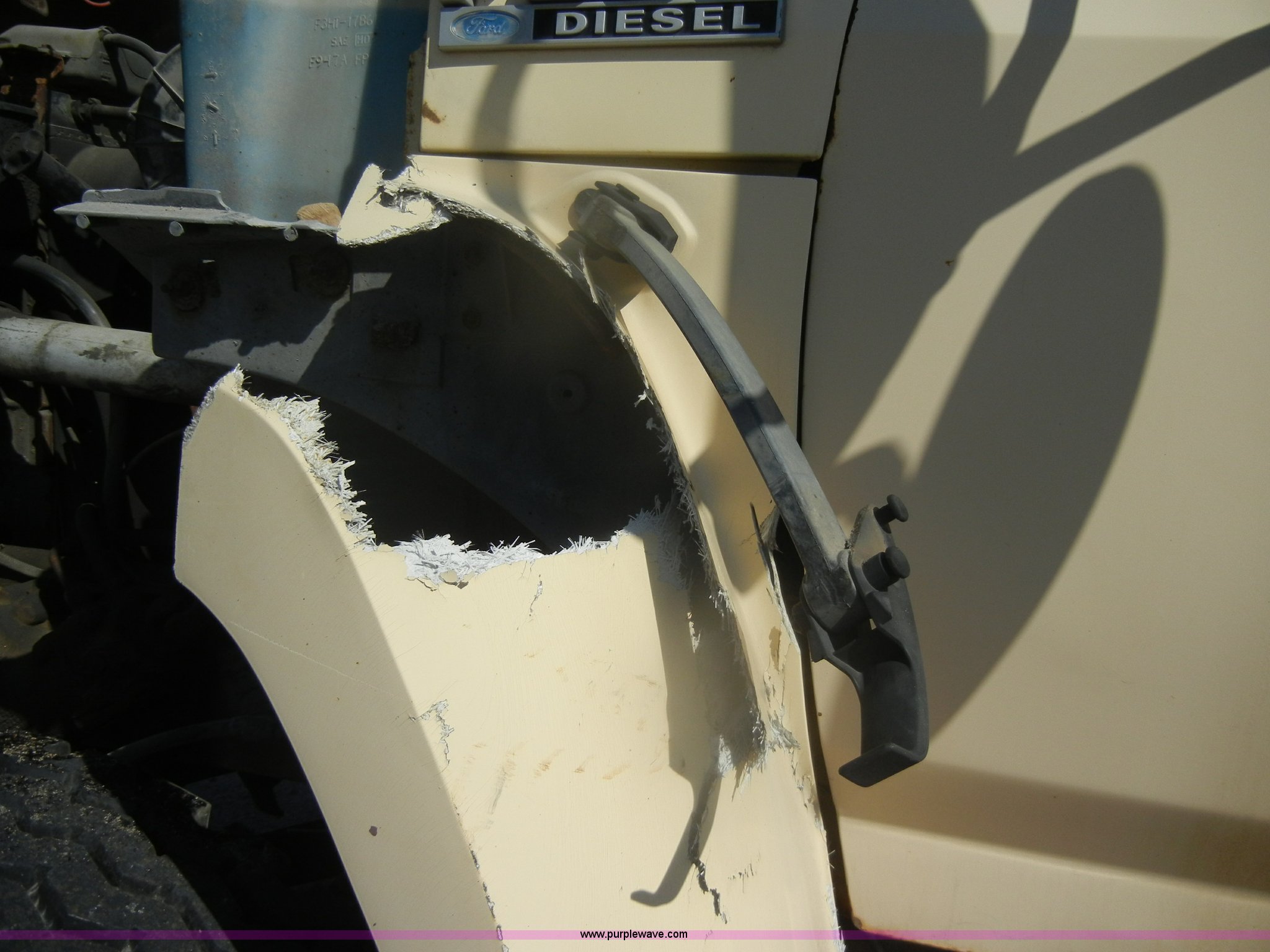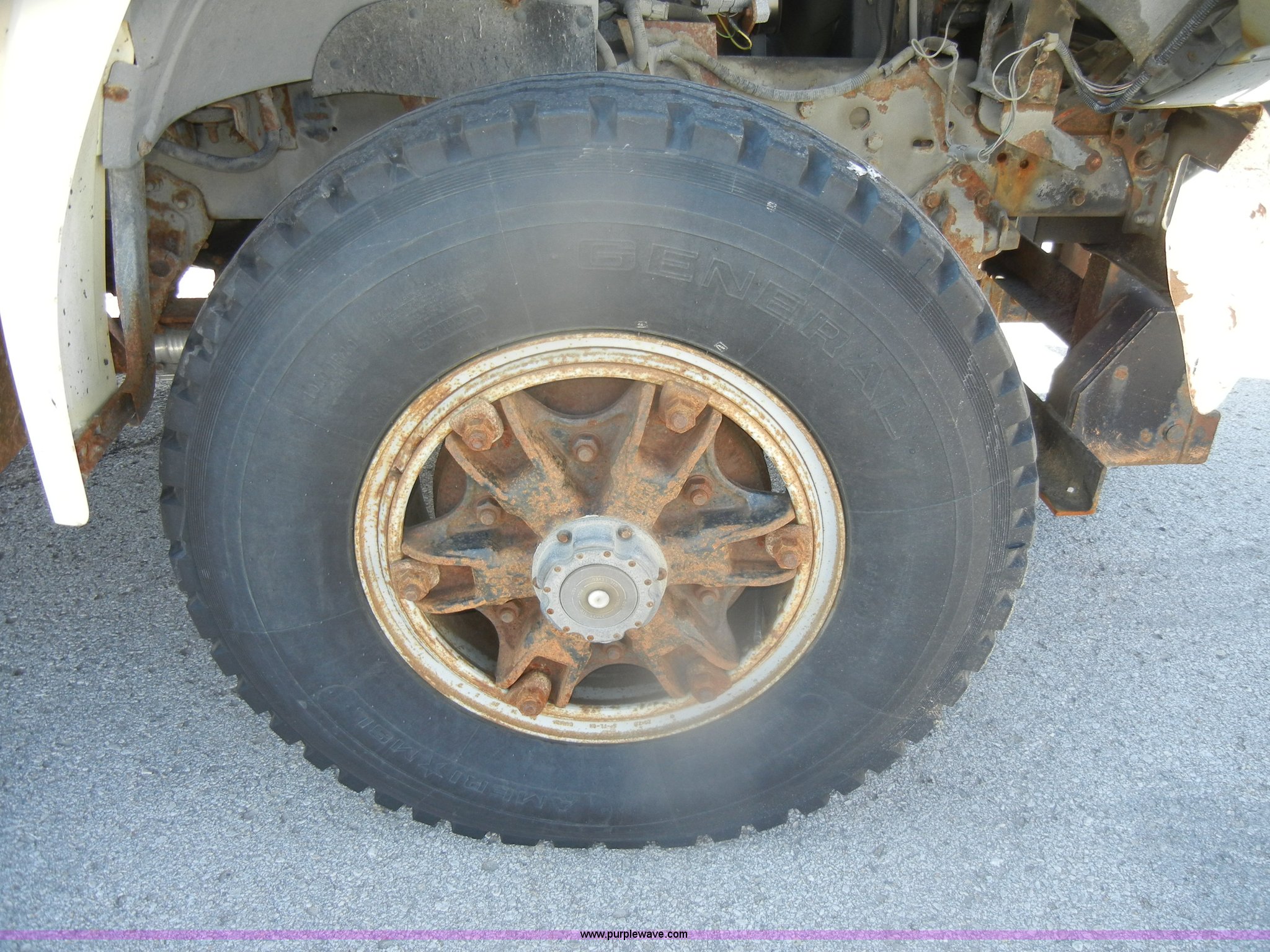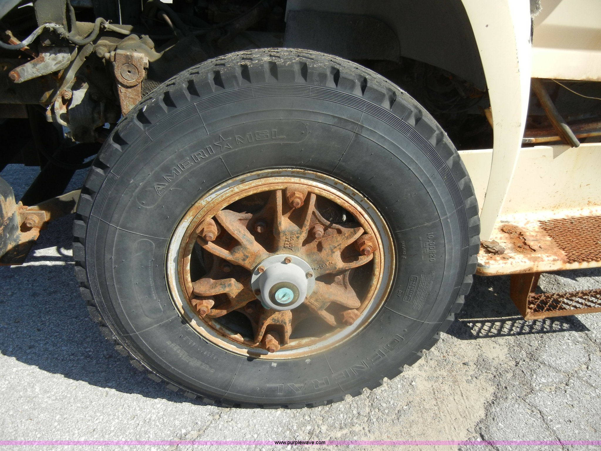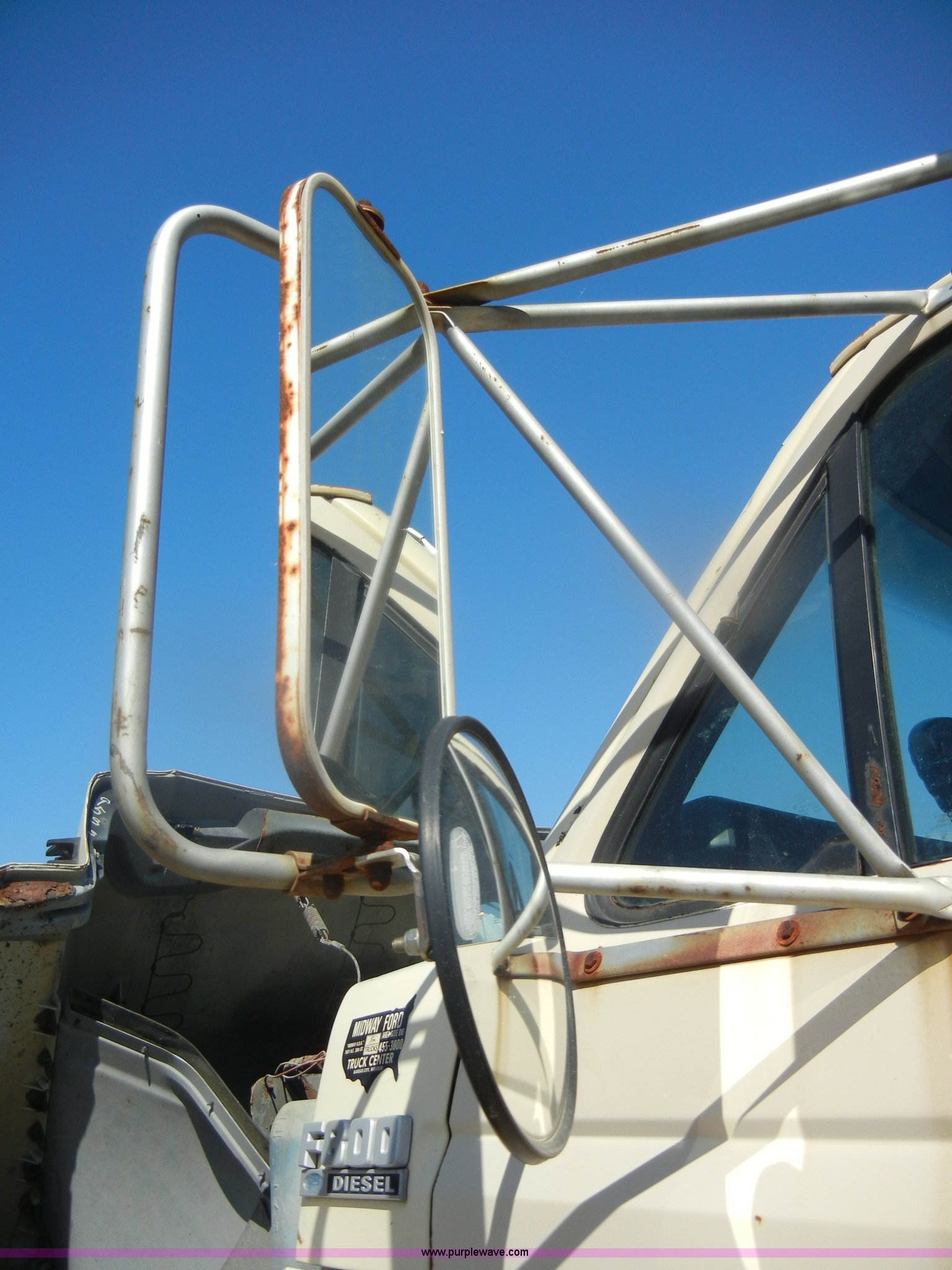Purple Wave is selling a used Construction Dump Truck in Kansas. This item is a 1994 Ford F800 dump truck with the following: 104,514 miles on odometer, Cummins ISC 8.3L L6 diesel engine, Five speed manual transmission, Two speed axle, Heat, Warren 10' bed, Manual end gate, Flink plow bracket, Swenson 10' spreader, Pintle hitch, 50 gallon fuel tank, Spring suspension, PTO, Air brakes, 10.00R20 front tires, 11R22.5 rear tires, GVWR 33,000 lbs, Rust, Drivers step and floorboard rusted