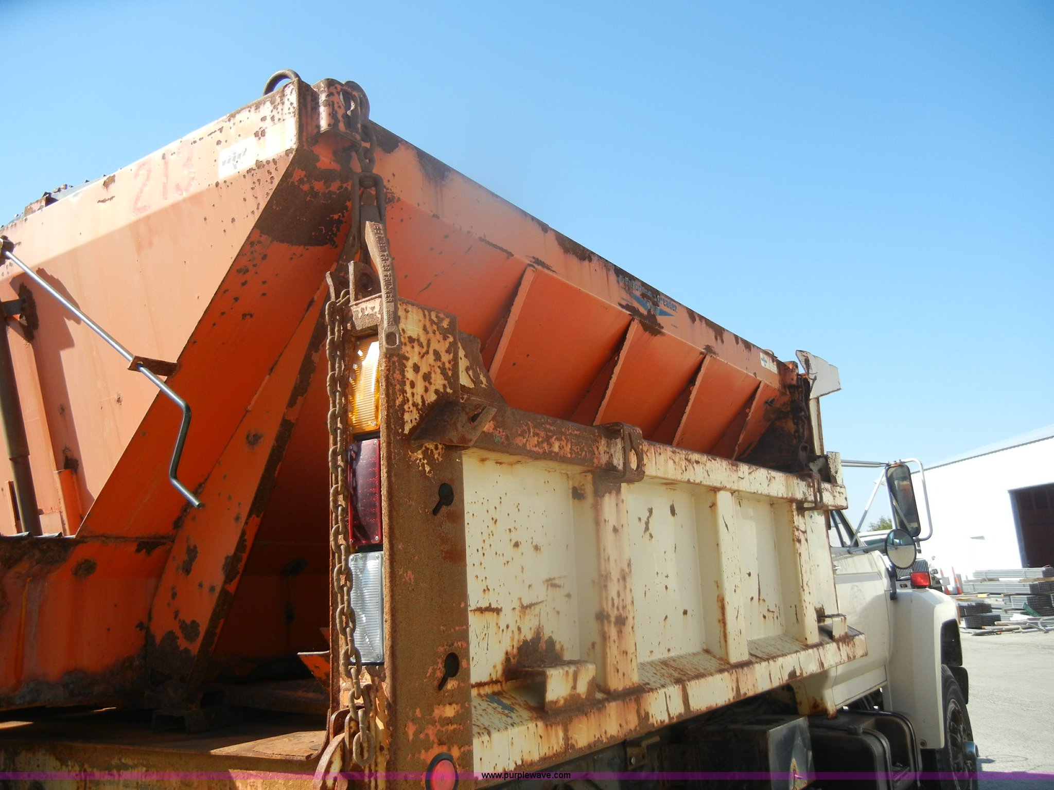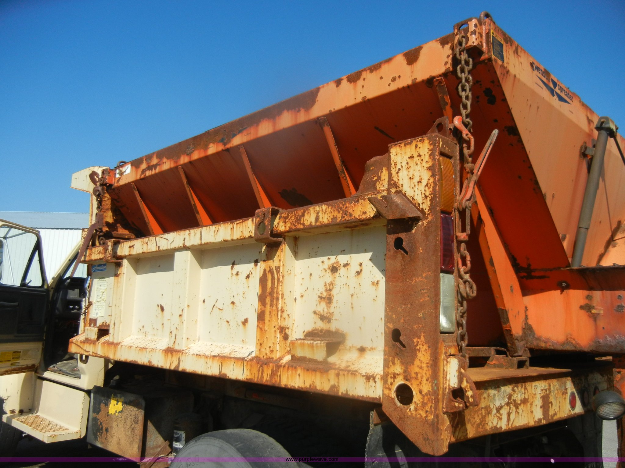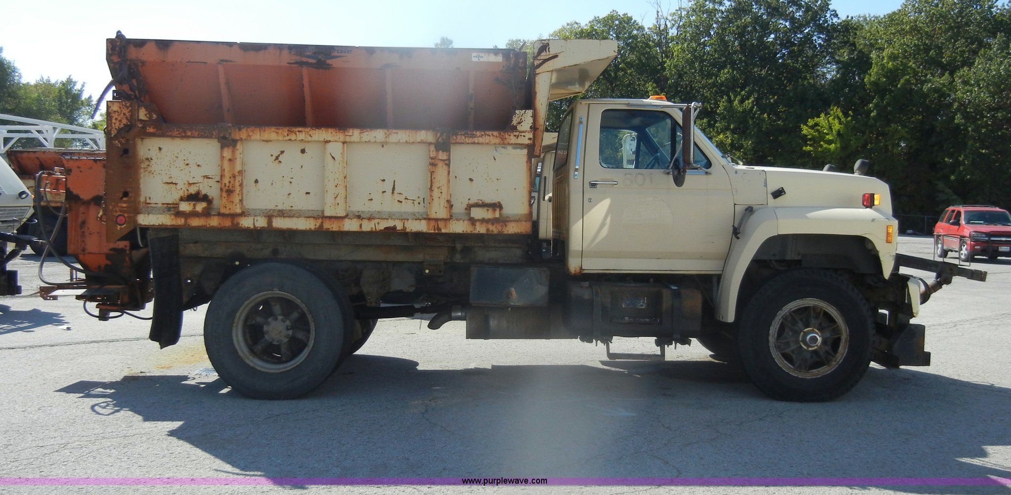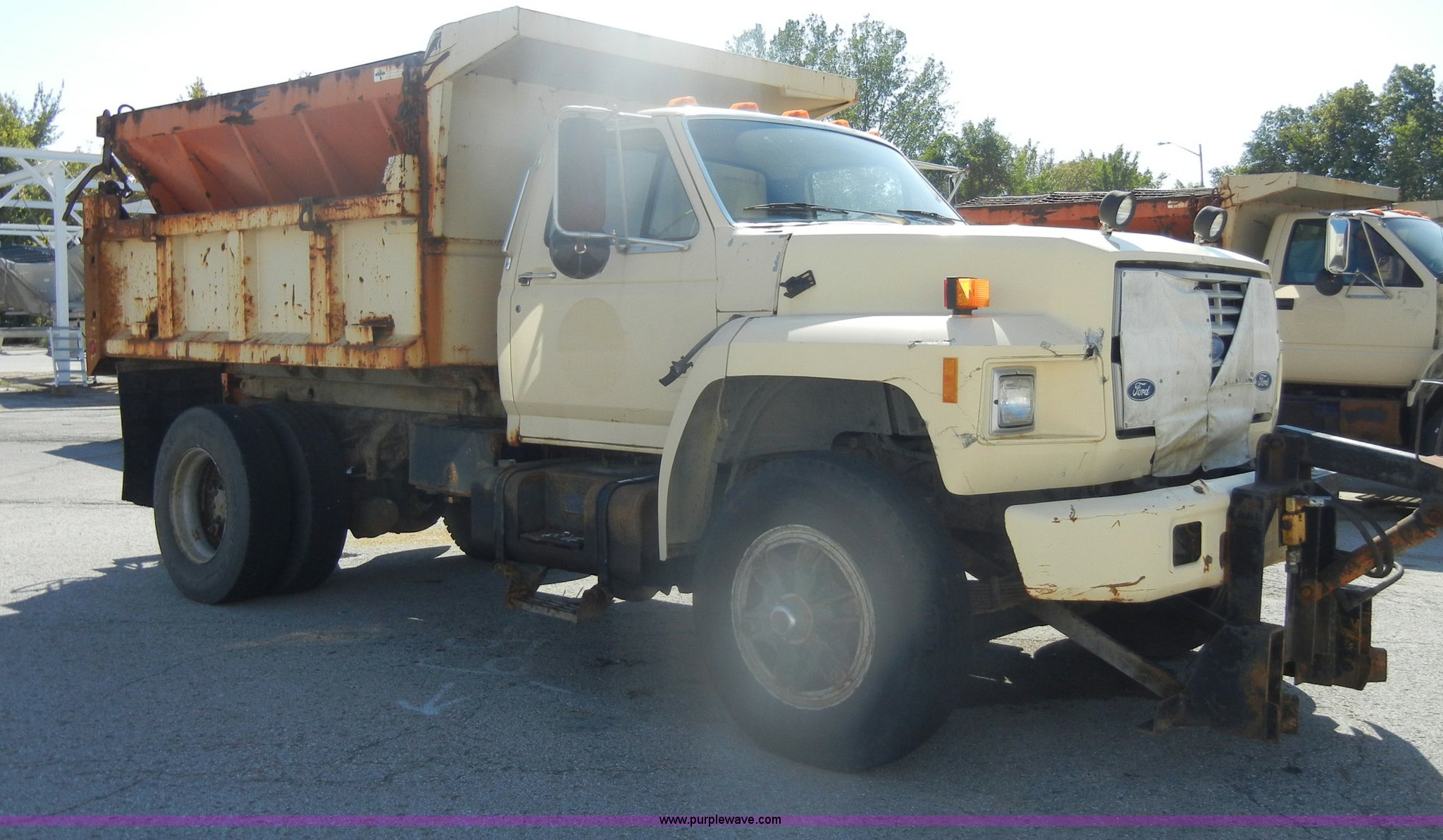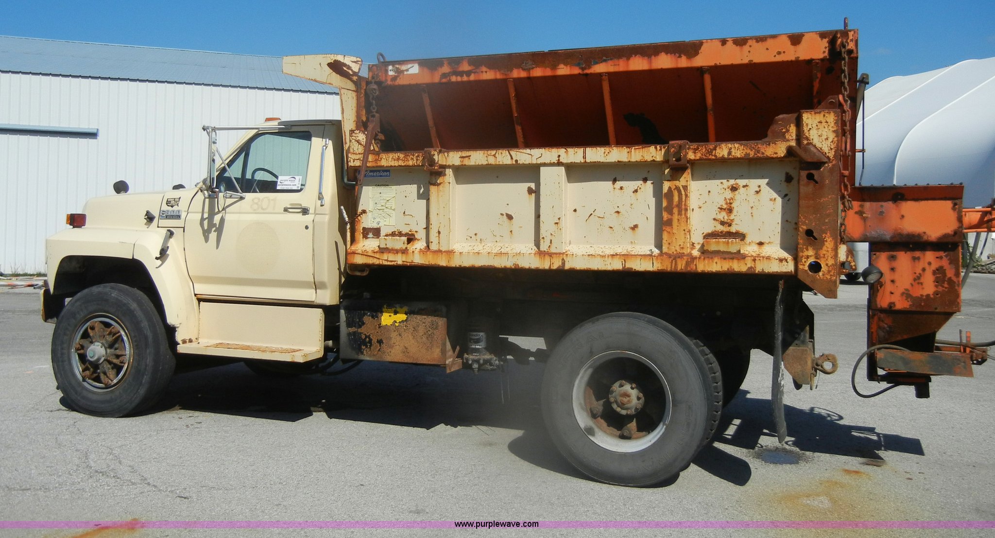 Purple Wave is selling a used Construction Dump Truck in Kansas. This item is a 1994 Ford F800 dump truck with the following: 84,444 miles on odometer, Cummins ISC 8.3L L6 diesel engine, Five speed manual transmission, Two speed axle, Heat, Warren 10' bed, Manual end gate, Flink plow bracket, Swenson 10' spreader, Pintle hitch, 50 gallon fuel tank, Spring suspension, PTO, Air brakes, 11R22.5 tires, GVWR 33,000 lbs, Rust, Interior/exterior cosmetic damage