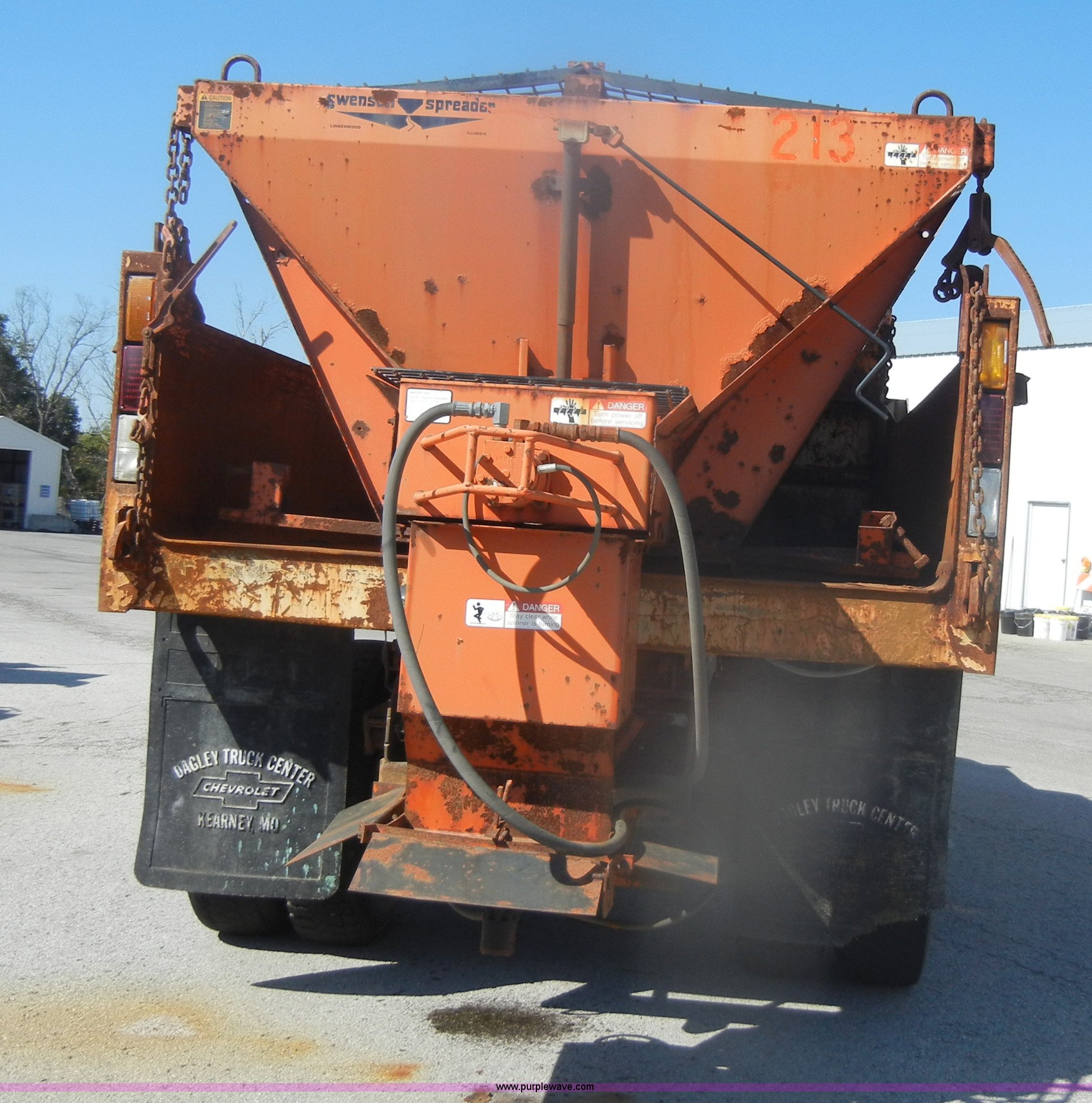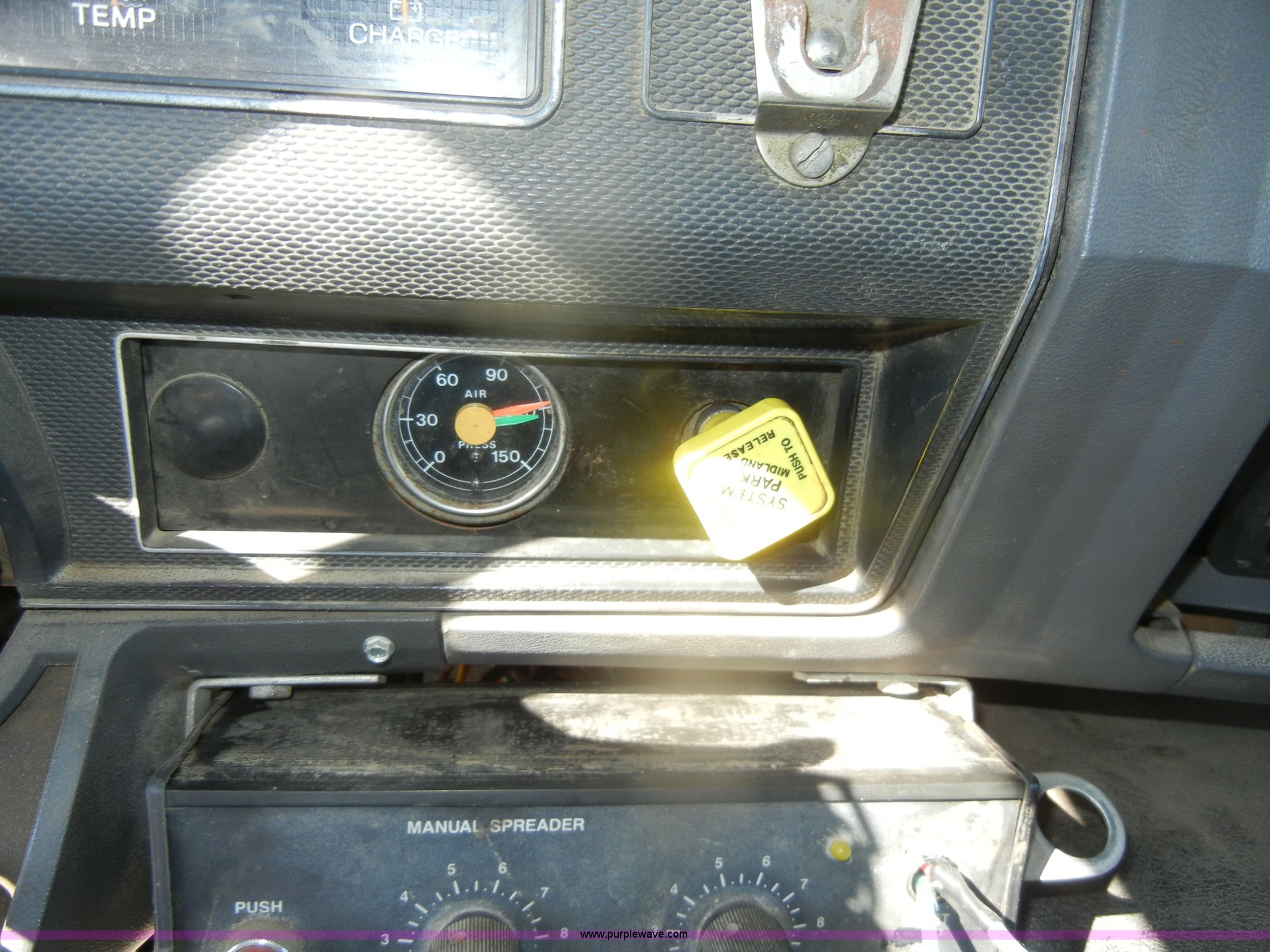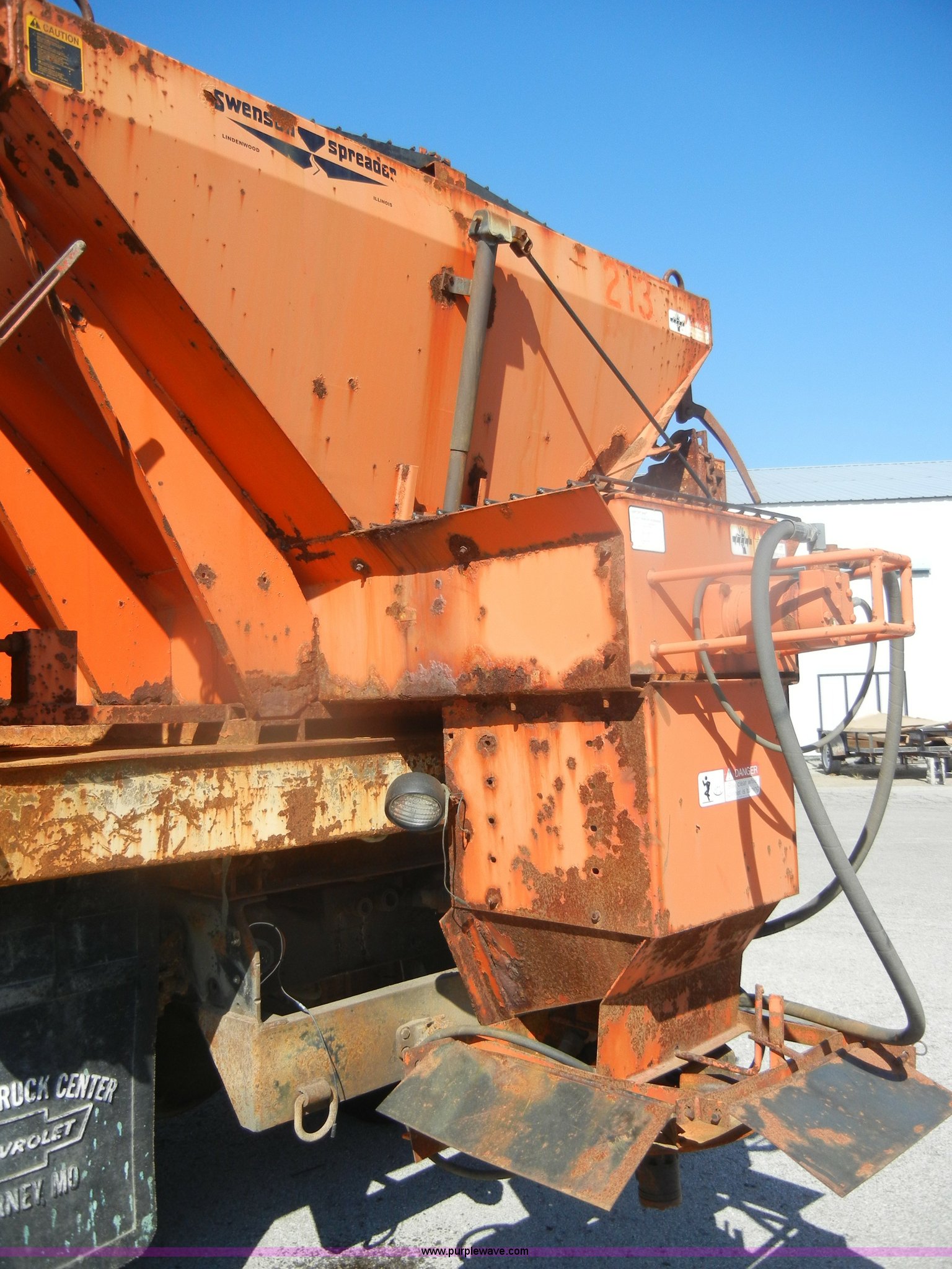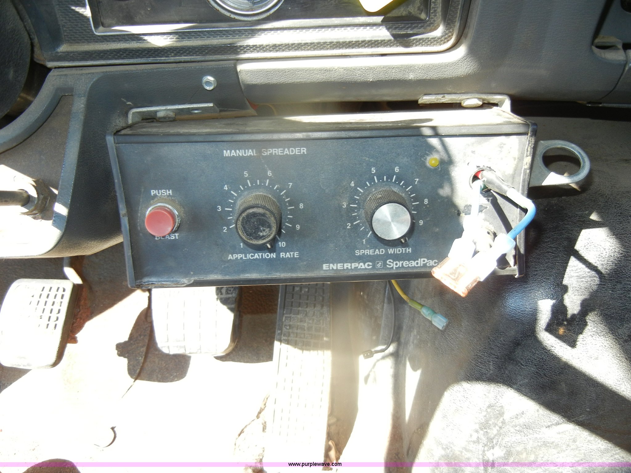 Purple Wave is selling a used Construction Dump Truck in Kansas. This item is a 1994 Ford F800 dump truck with the following: 84,444 miles on odometer, Cummins ISC 8.3L L6 diesel engine, Five speed manual transmission, Two speed axle, Heat, Warren 10' bed, Manual end gate, Flink plow bracket, Swenson 10' spreader, Pintle hitch, 50 gallon fuel tank, Spring suspension, PTO, Air brakes, 11R22.5 tires, GVWR 33,000 lbs, Rust, Interior/exterior cosmetic damage