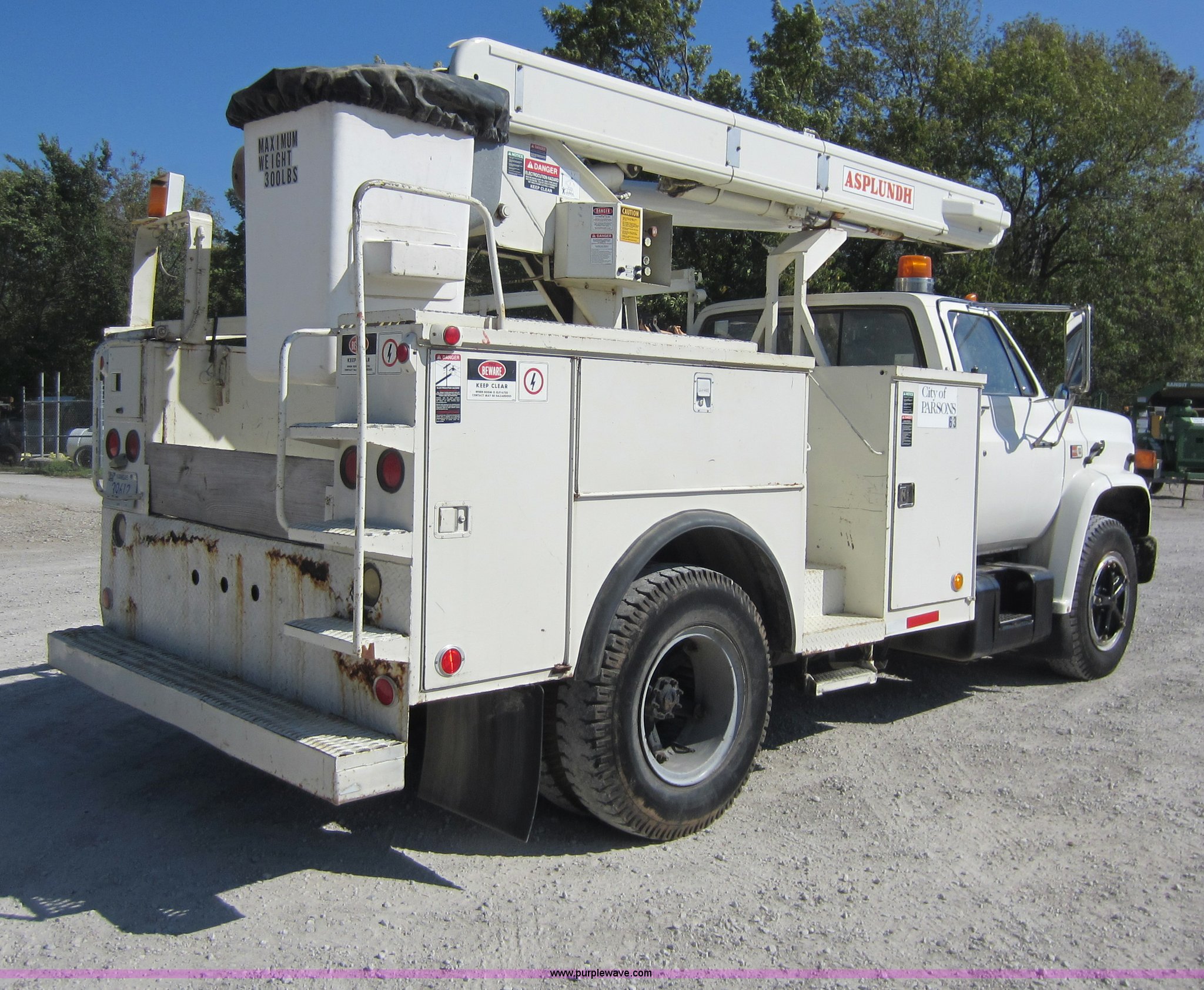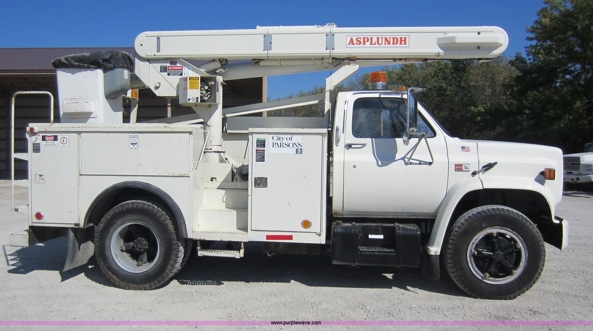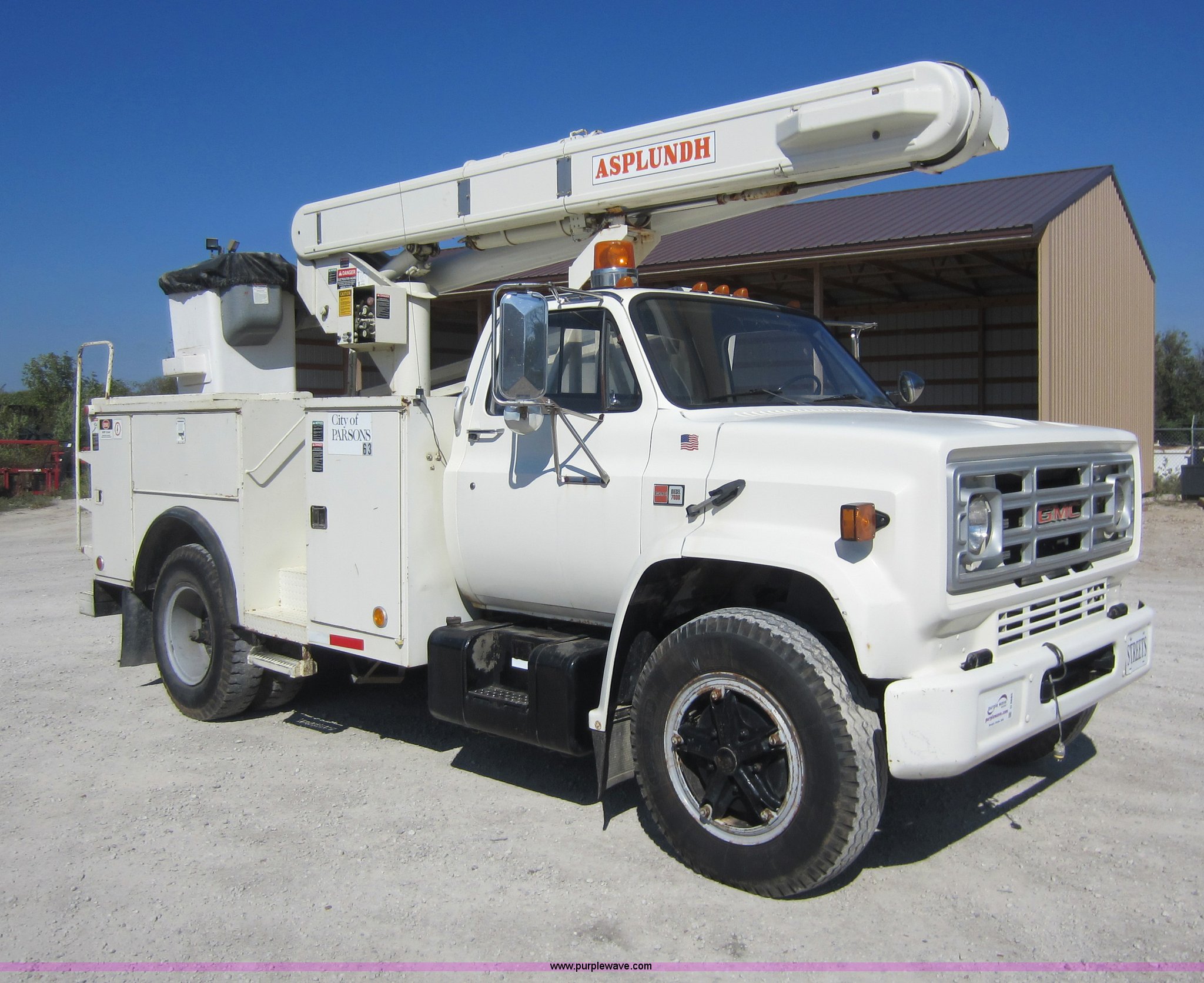 Purple Wave is selling a used Bucket Truck in Kansas. This item is a 1986 GMC TopKick 7000 bucket truck with the following: 119,065 miles on odometer, 7,451 hours on meter, Detroit 8.2L V8 diesel engine, Allison automatic transmission, Asplundh L36 lift, Serial 872833, 300 lbs max lift, 36' max height, PTO, Air brakes, 9.00-20 tires, GVW 23,160 lbs, FAWR 7,000 lbs, RAWR 16,160 lbs, Spotlight, AM/FM, and two way radio inoperable