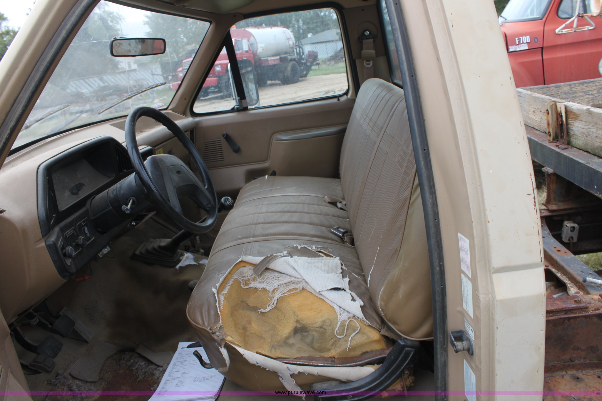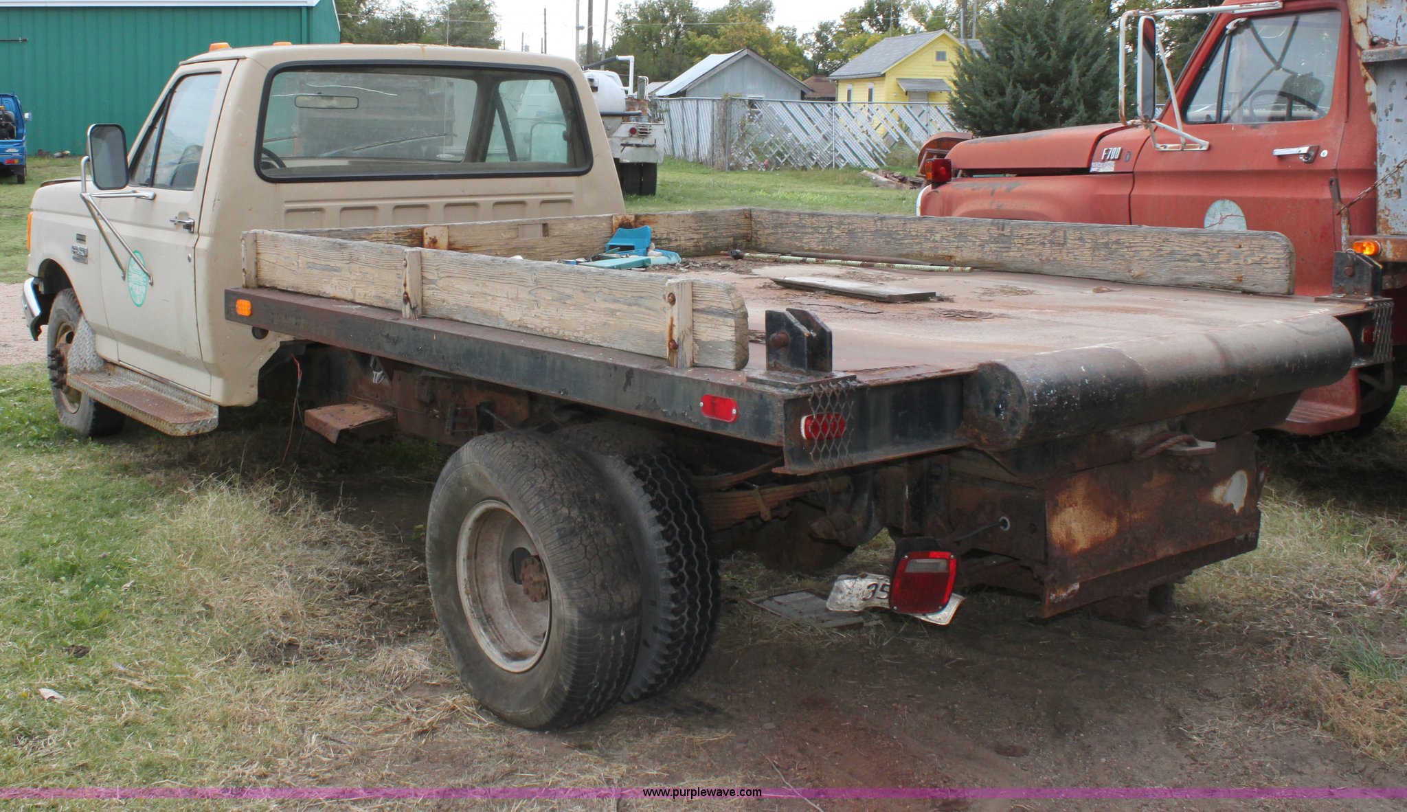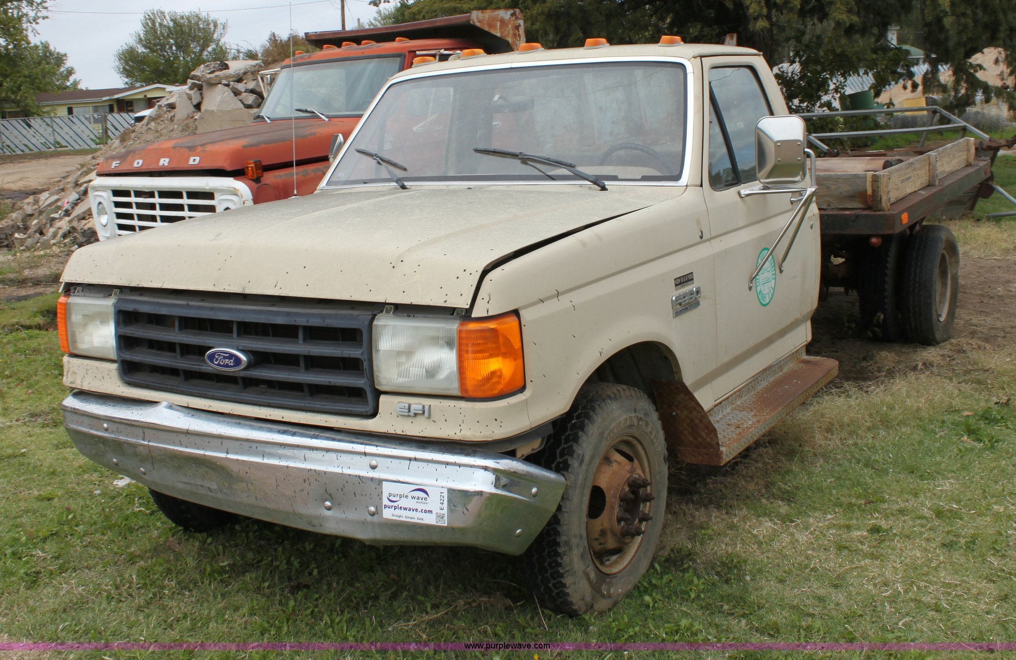 Purple Wave is selling a used Passenger Vehicle in Kansas. This item is a 1988 Ford F350 XL flatbed pickup truck with the following: 62,292 miles on odometer, 5.8L V8 gas engine, Five speed manual transmission, AC and heat, AM/FM, Manual windows and locks, Vinyl interior, Two way PTO, 215/85R16 tires, Interior/exterior cosmetic damage, Cracked windshield, Damage to front bumper, One tire cracked, Has not ran in five years