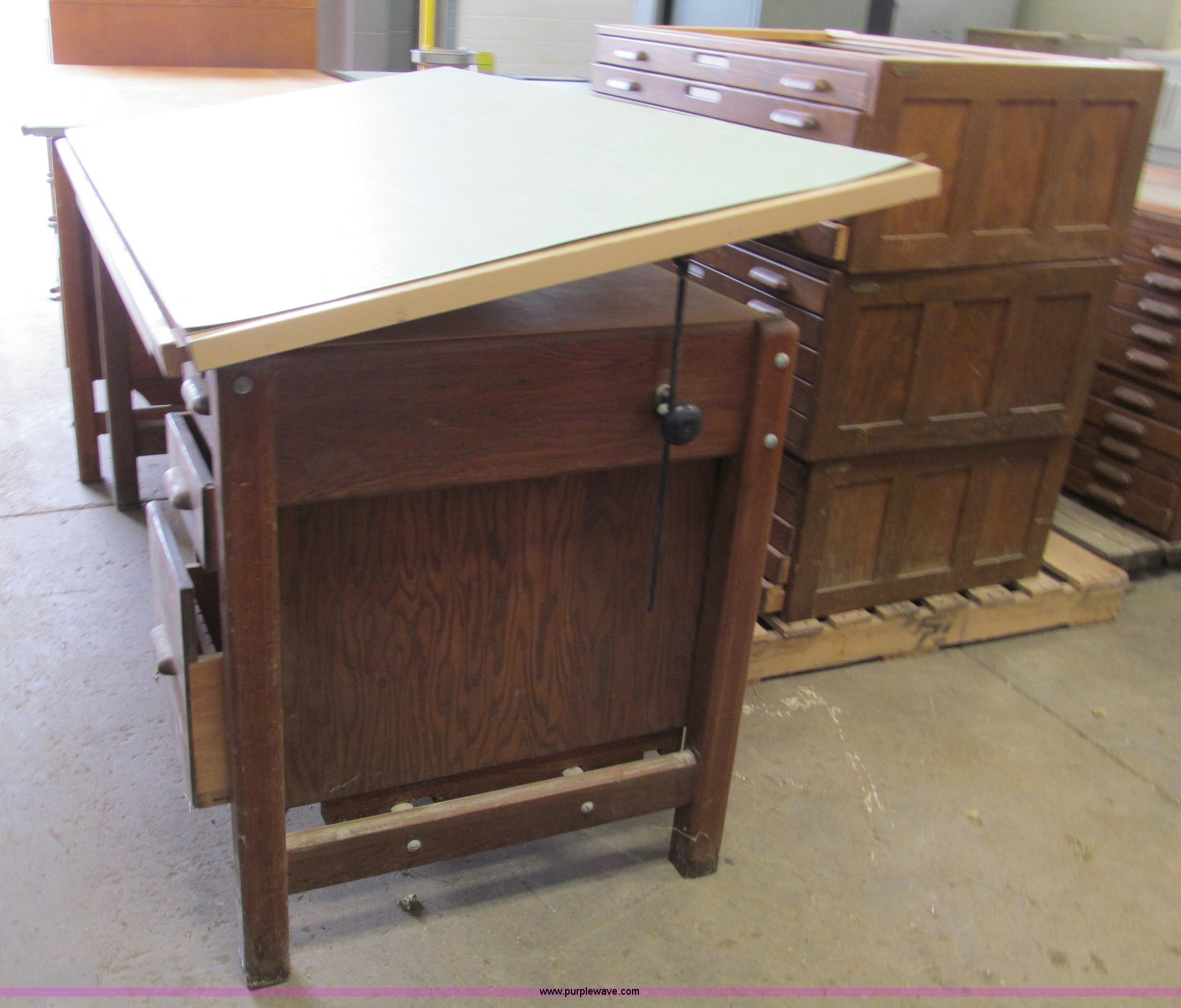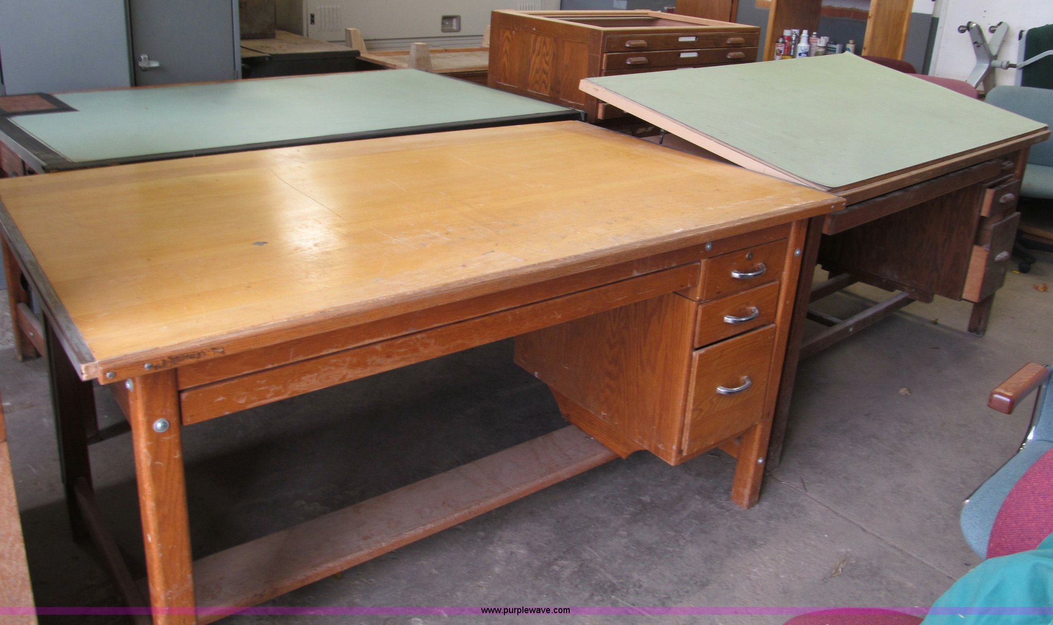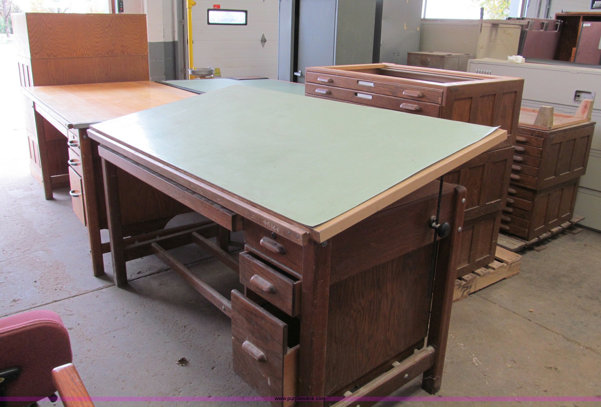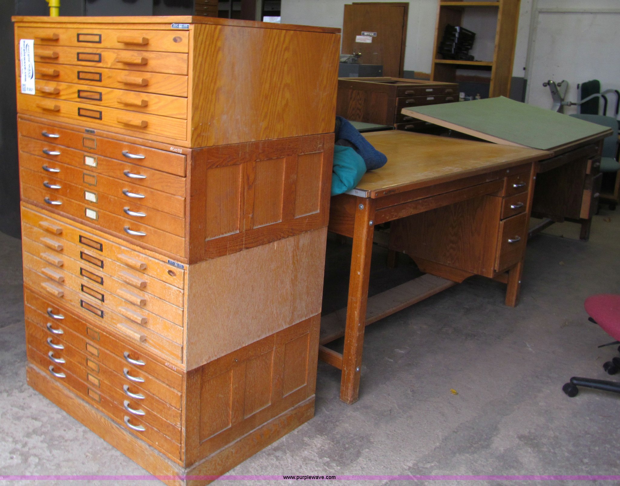 Purple Wave is selling a used Office Supplies and Equip. in Missouri. This item is a Assorted office supplies with the following: (3) wood drafting tables, (9) sections of map/plans drawers, (5) drawers per section