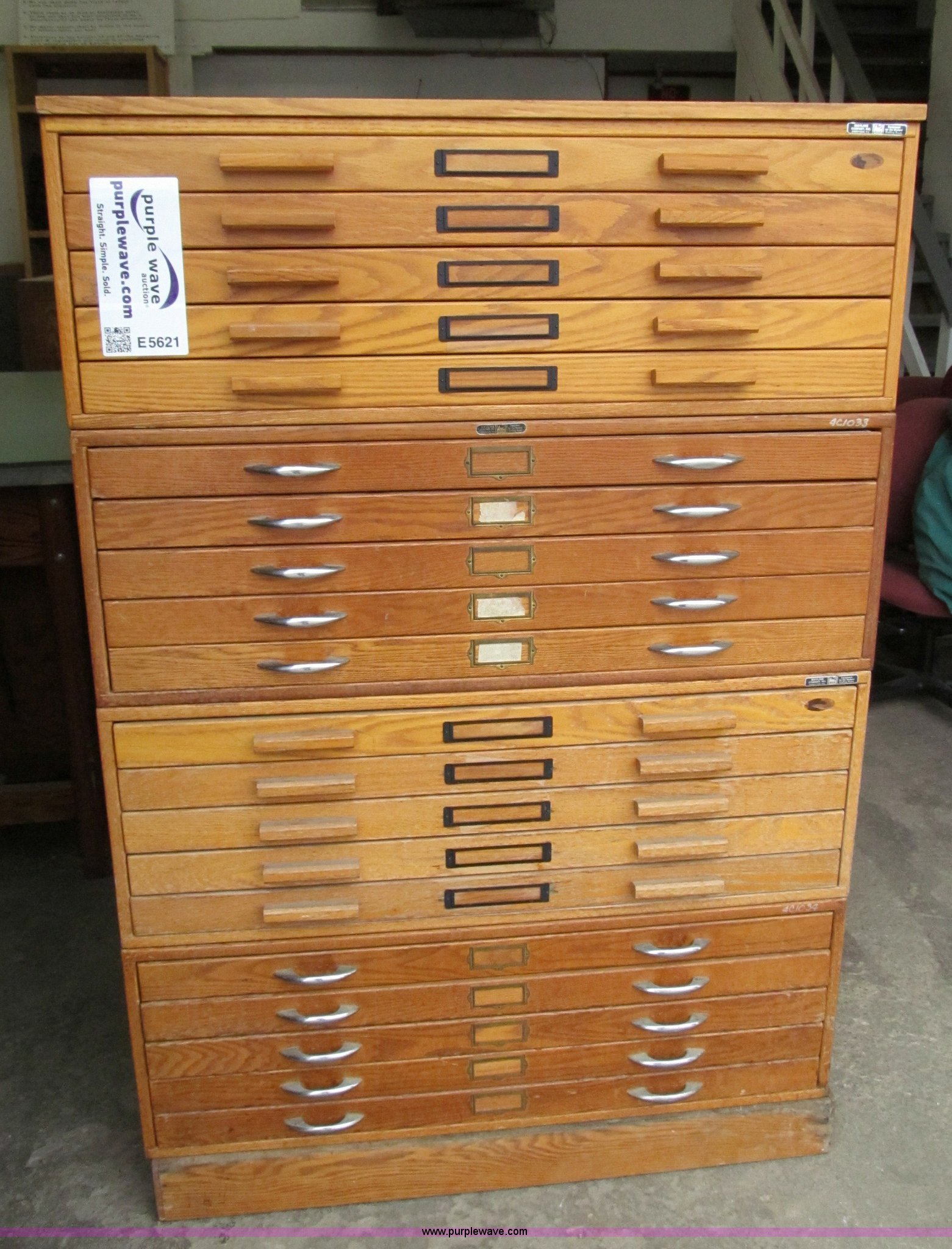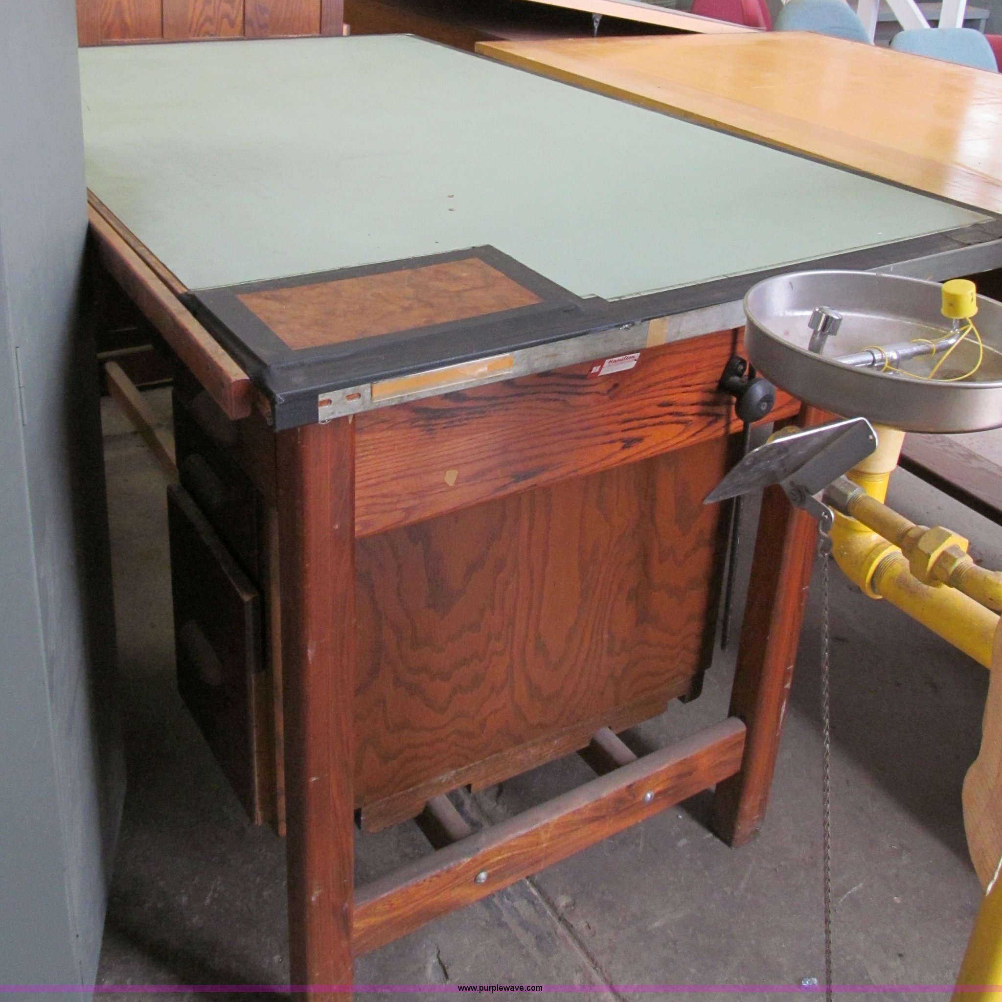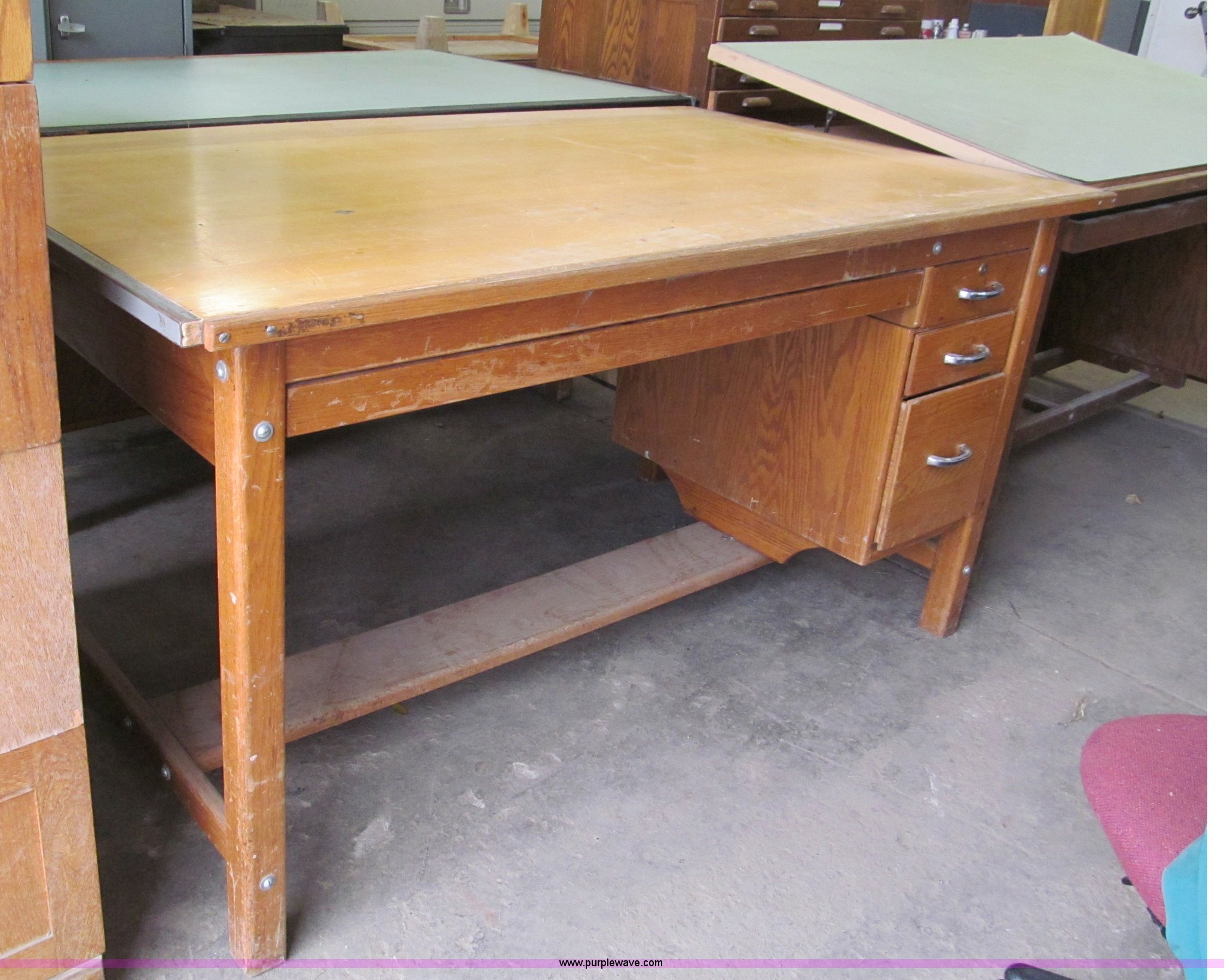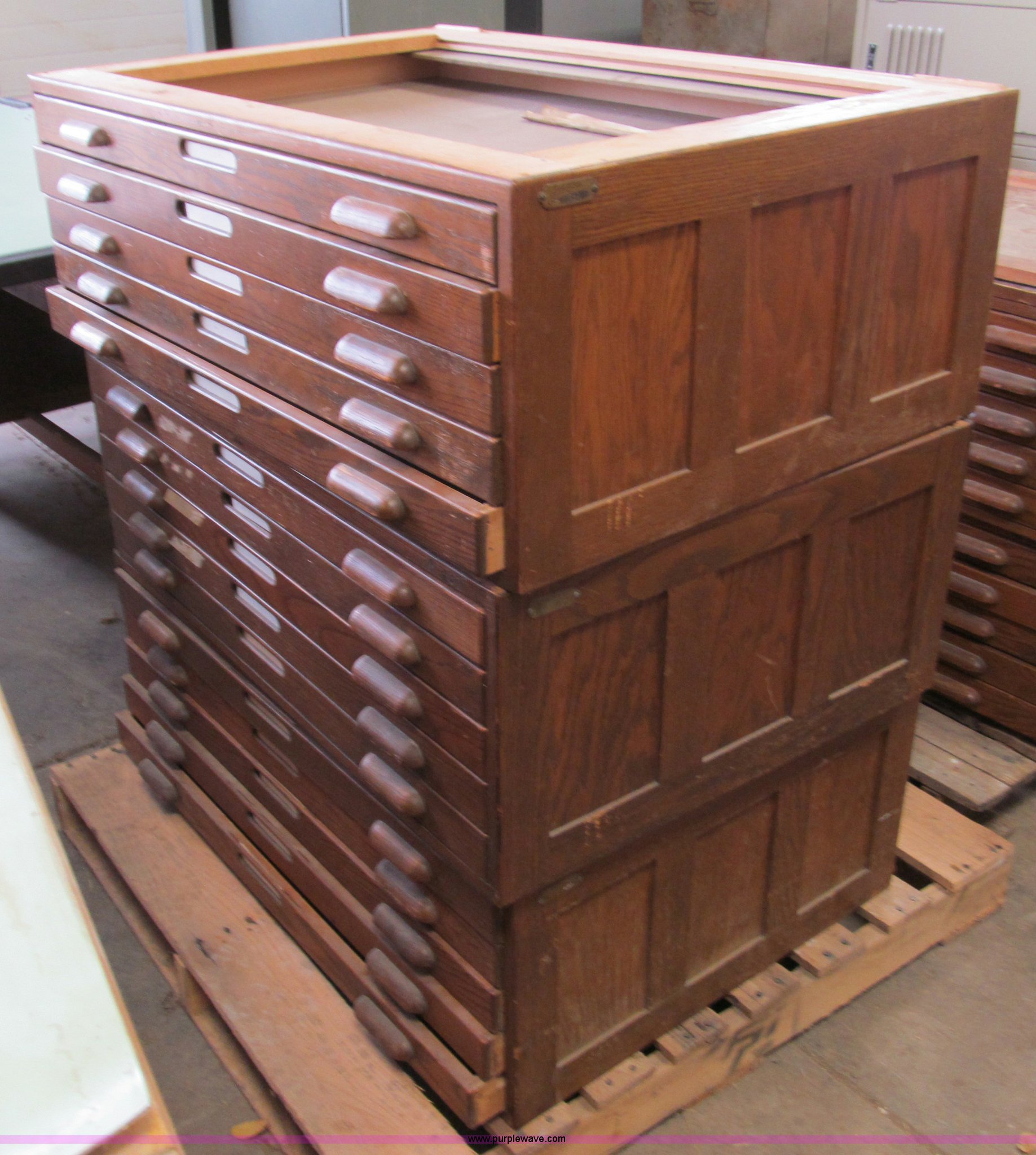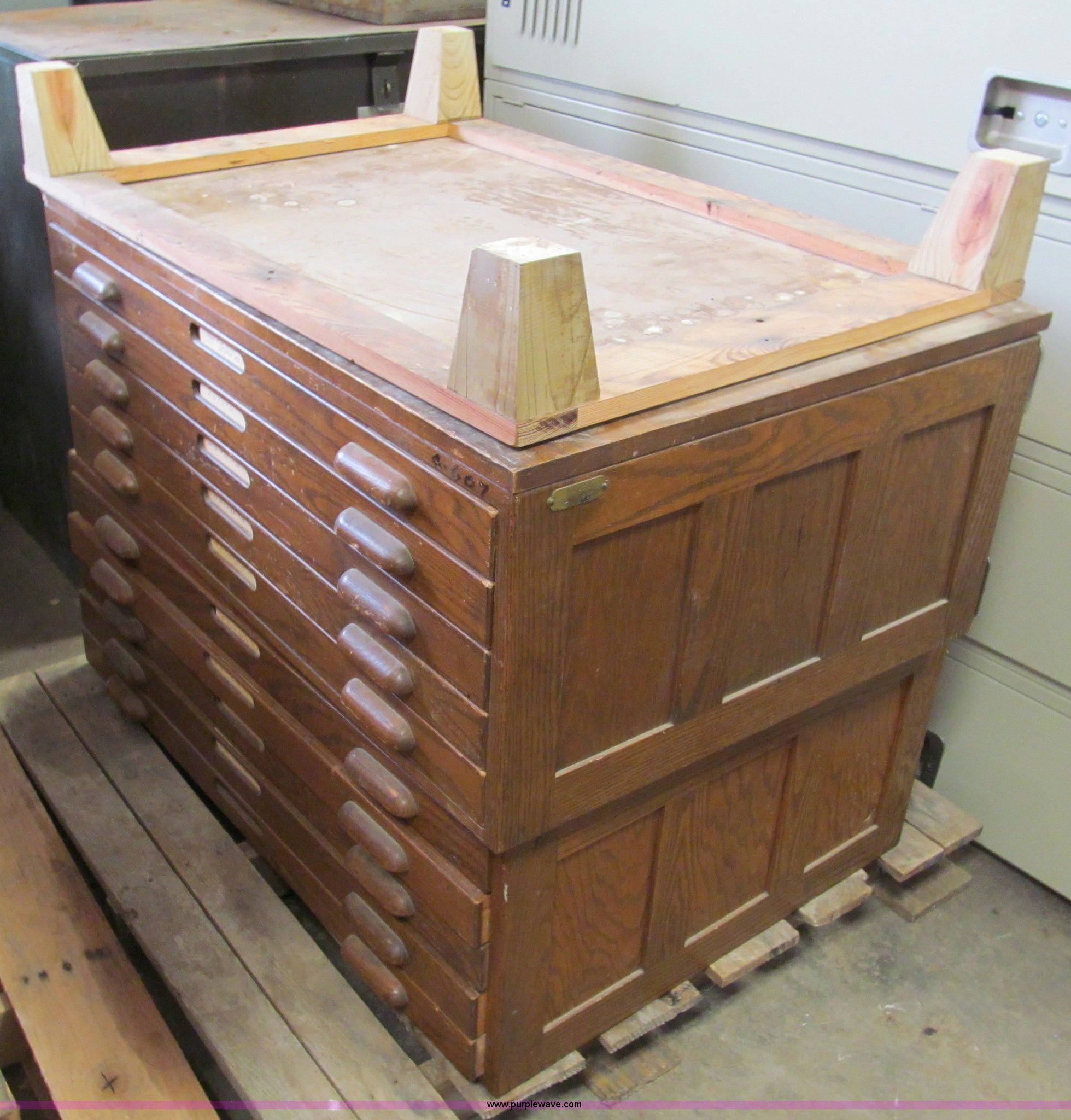 Purple Wave is selling a used Office Supplies and Equip. in Missouri. This item is a Assorted office supplies with the following: (3) wood drafting tables, (9) sections of map/plans drawers, (5) drawers per section