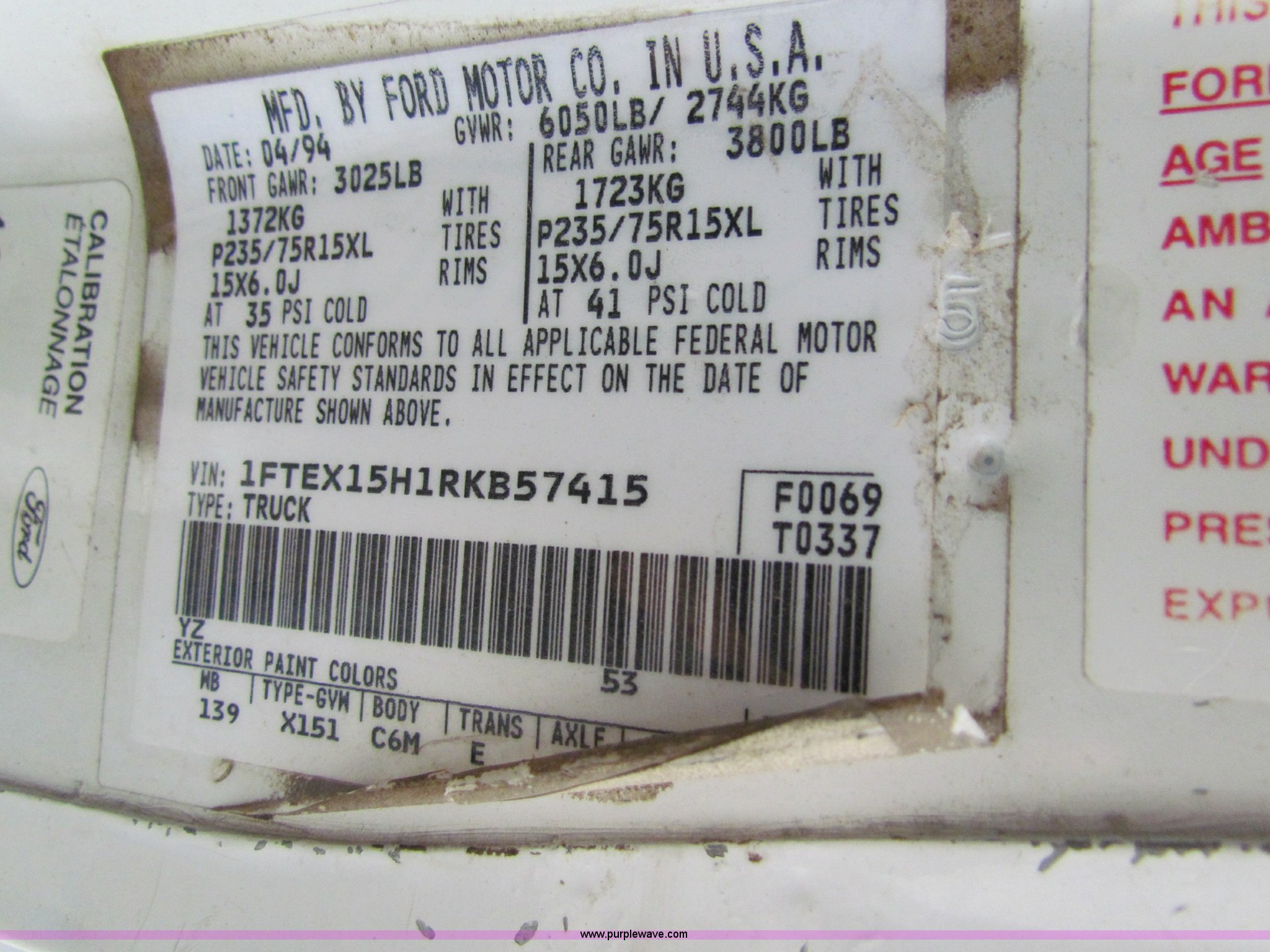 Purple Wave is selling a used Passenger Vehicle in Kansas. This item is a 1994 Ford F150 pickup truck with the following: 150,367 miles on odometer, 5.8L V8 EFI gas engine, Automatic transmission, Tilt, Cruise, AM/FM, 235/75R15 tires, Interior/exterior cosmetic damage, Equip# 0007103