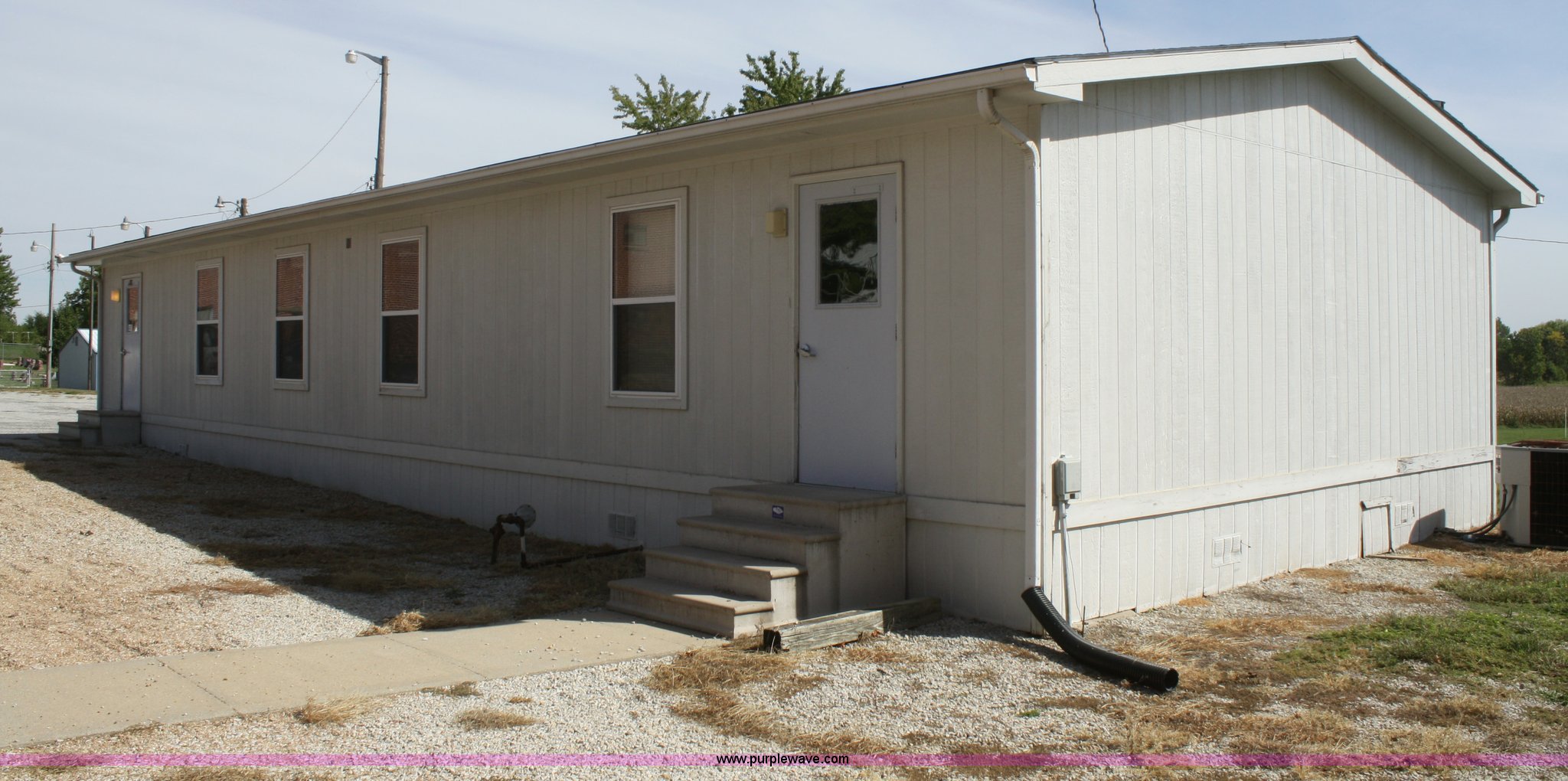 Purple Wave is selling a used Manufactured Home or Office in Kansas. This item is a Mobile classroom with step with the following: 60'L x 24'W, (2) rooms, 43.5'L x 22'W, 15'L x 22'W, Carrier AC and furnace, (2) entry doors, (2) door steps, Sitting on concrete blocks, Contents not included, Electricity will be unhooked