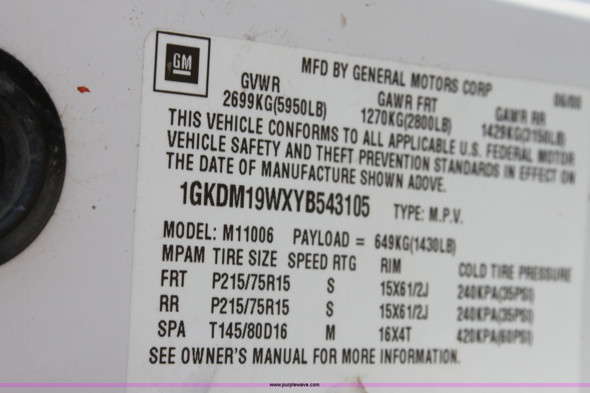 Purple Wave is selling a used Passenger Vehicle in Kansas. This item is a 2000 GMC Safari van with the following: 158,831 miles on odometer, 4.3L V6 CPI gas engine, Automatic transmission, AC and heat, Tilt, Cruise, AM/FM/CD, Power windows, locks, and mirrors, 215/75R15 tires, Rear door does not open