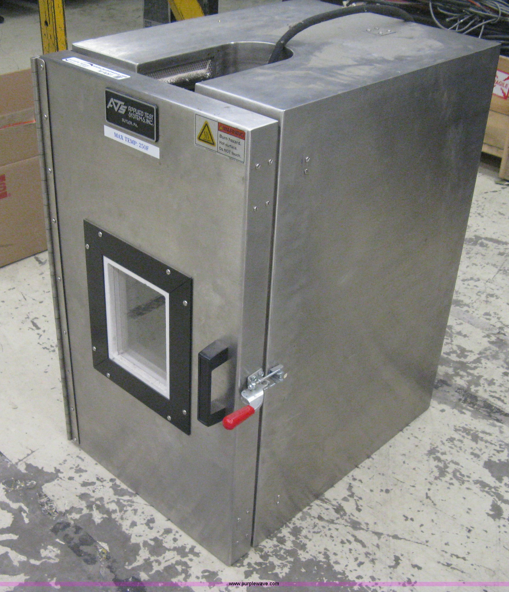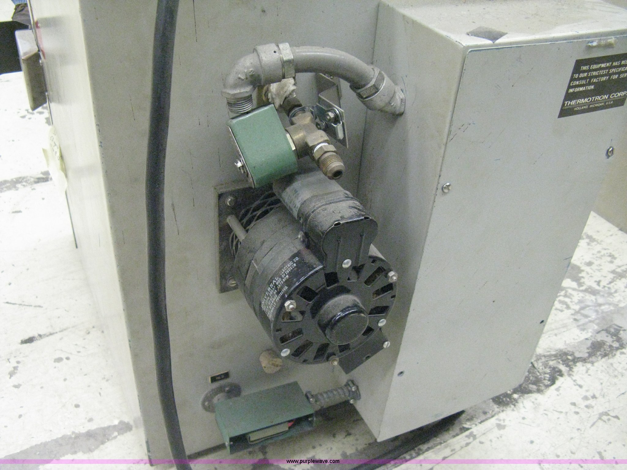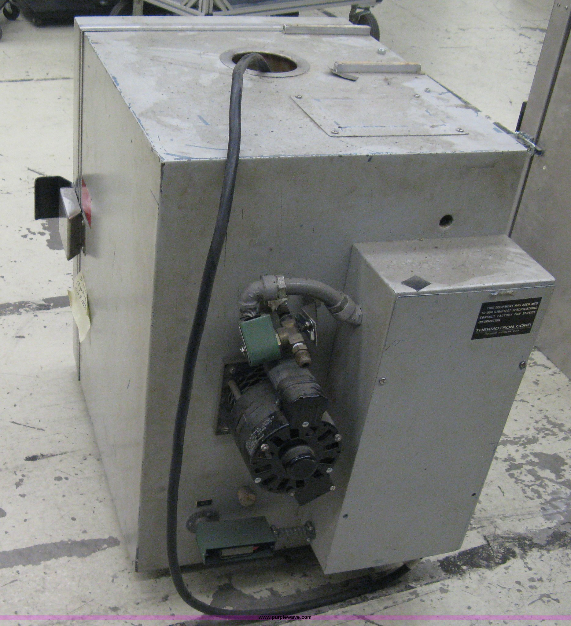 Purple Wave is selling a used Tools in Kansas. This item is a (2) Environmental test chambers with the following: 2006 Applied Test Systems, Series 3710, 1,100 watts, 110V, 250 degrees Fahrenheit max temperature, 19.5"W x 27.5"D x 35"H, Serial 06-0816-1, 1981 Thermo Tron, 230/115V, Single phase, Wiring Schematic E-21-8819-22-1-Y, Heat and cold test system, 20"W x 24.5"D x 29.5"H, Serial 21-8819