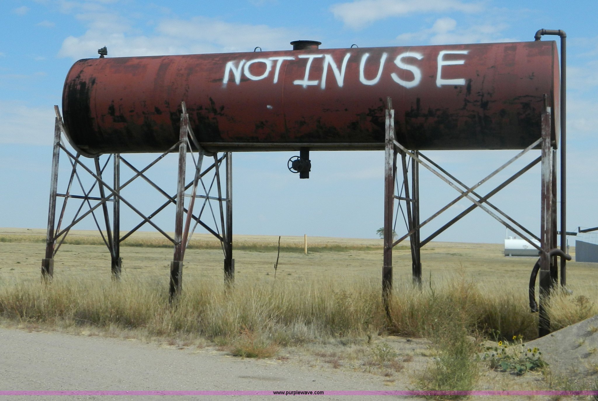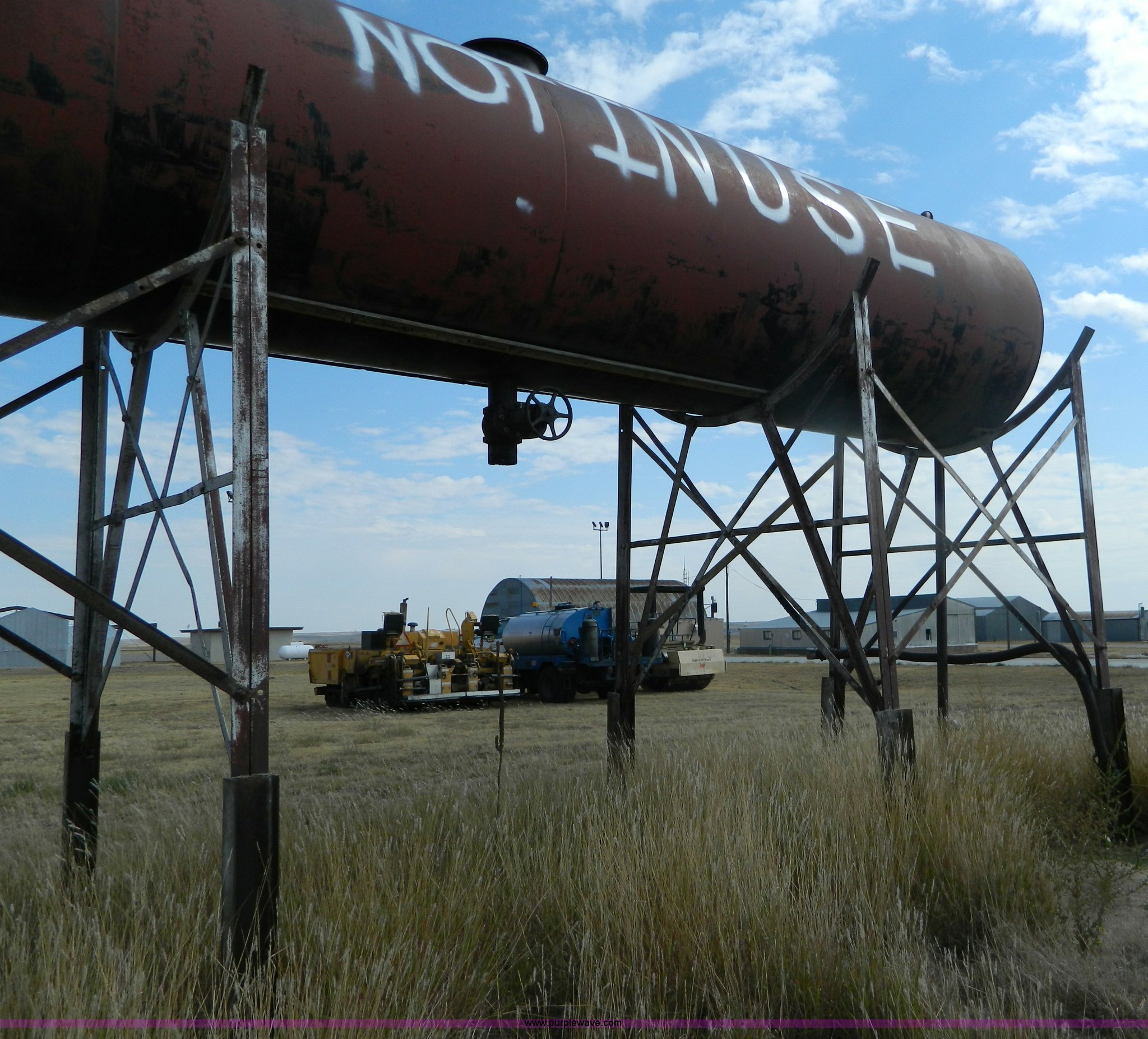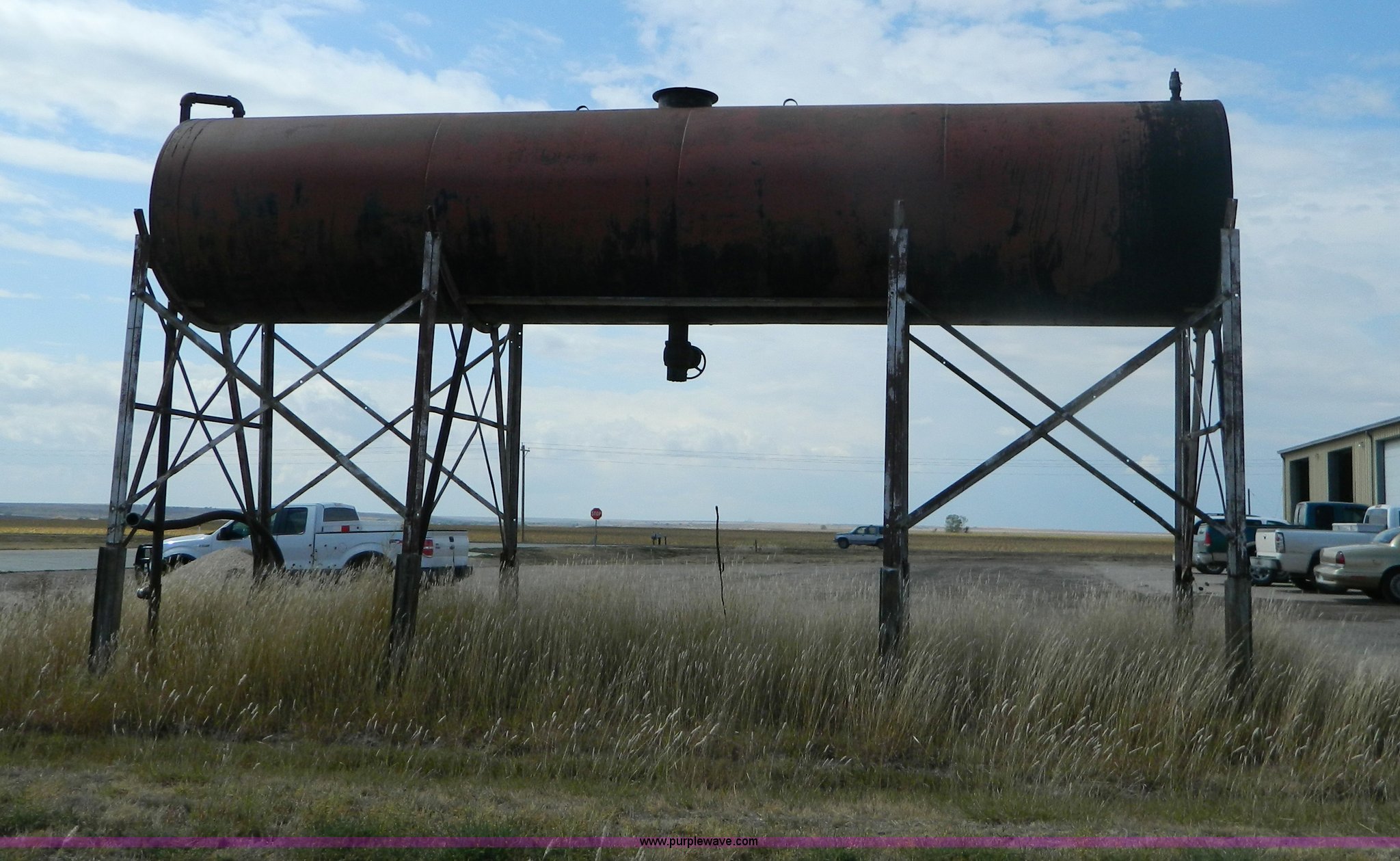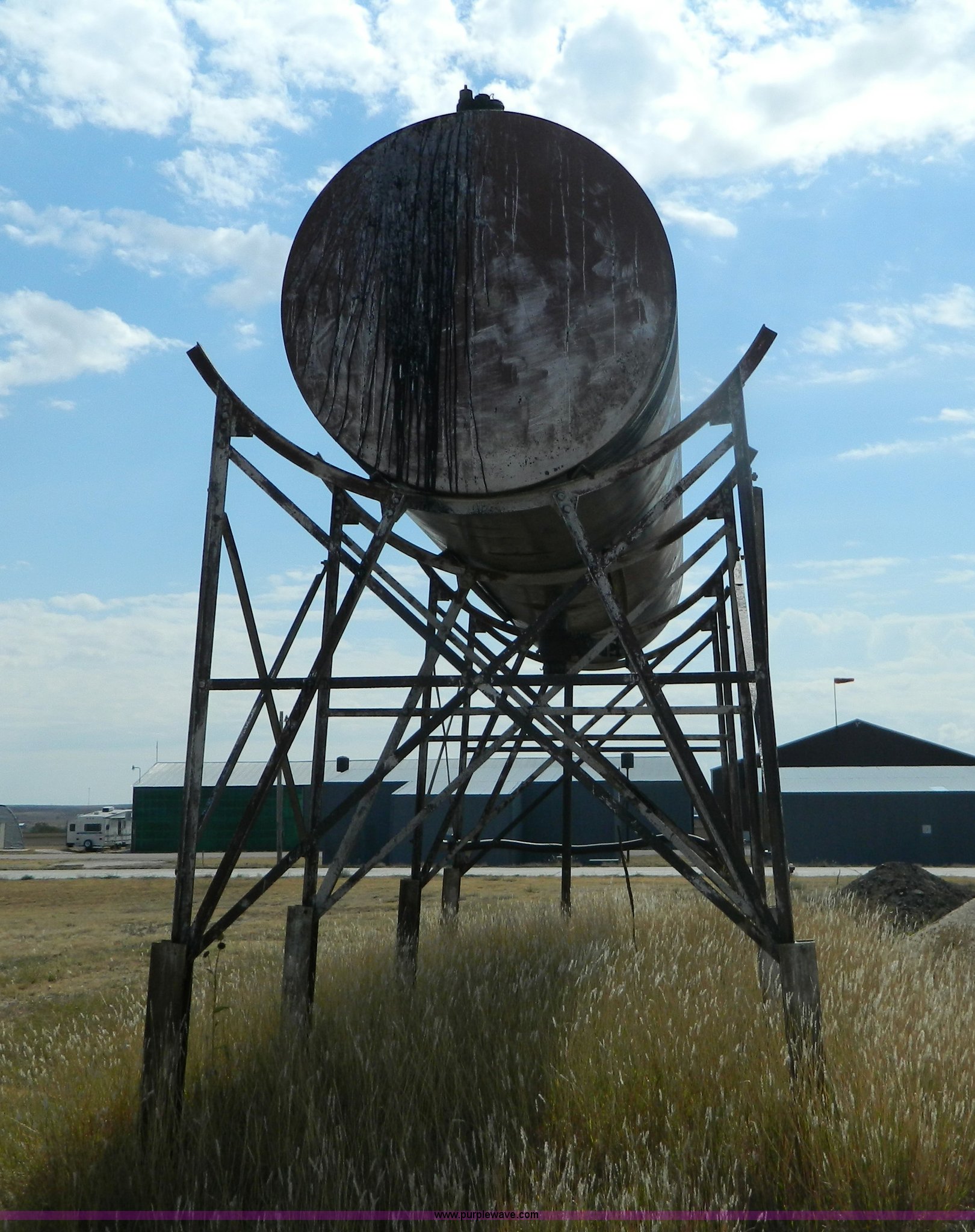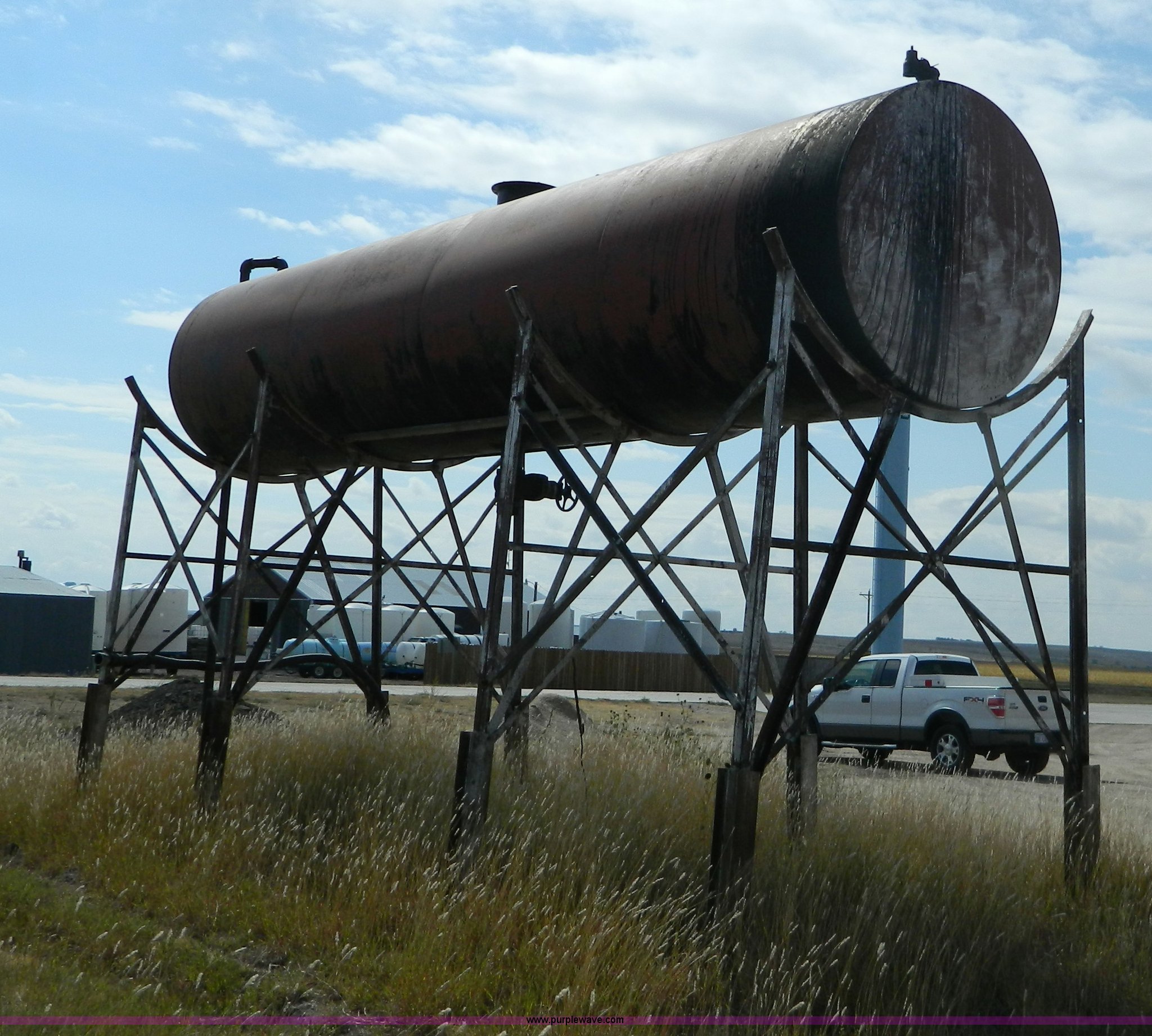Purple Wave is selling a used Fuel and Lube in Kansas. This item is a Bulk oil storage tank and stand with the following: 28.5'L x 6' diameter tank, 10'H stand from ground to tank bottom