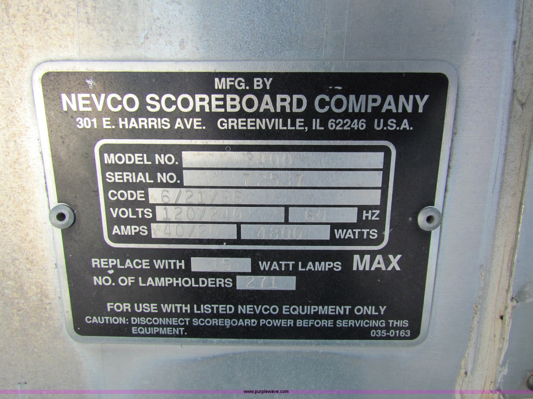 NEVCO 2400 scoreboard. 18' x 8', Working when removed from service, Controller included, 120/240V, 60 Hz, 4,800 watts, Serial 72537. Shipping quotes available. USD 286. Sedan, KS 67361