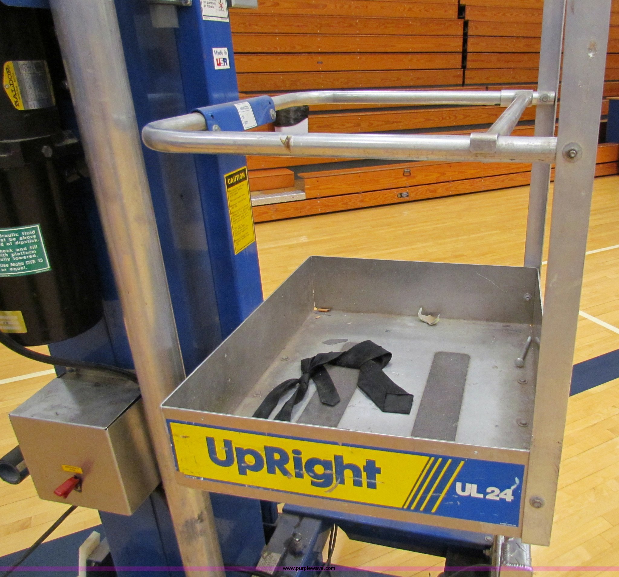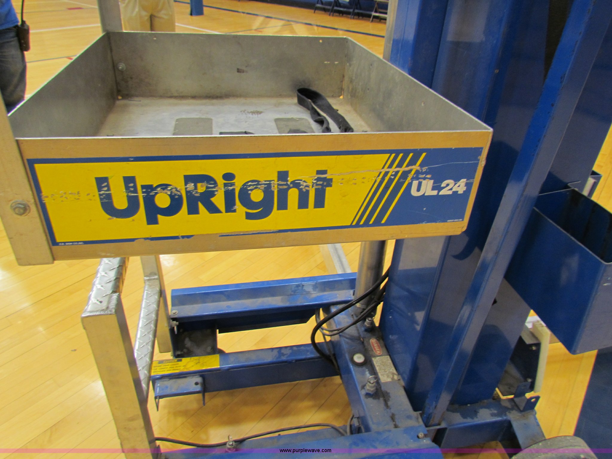 Purple Wave is selling a used Scissor or Vertical Lift in Kansas. This item is a Upright man lift with the following: Model UL24, 24' max height, 110V, Broken sprocket on one chain drive