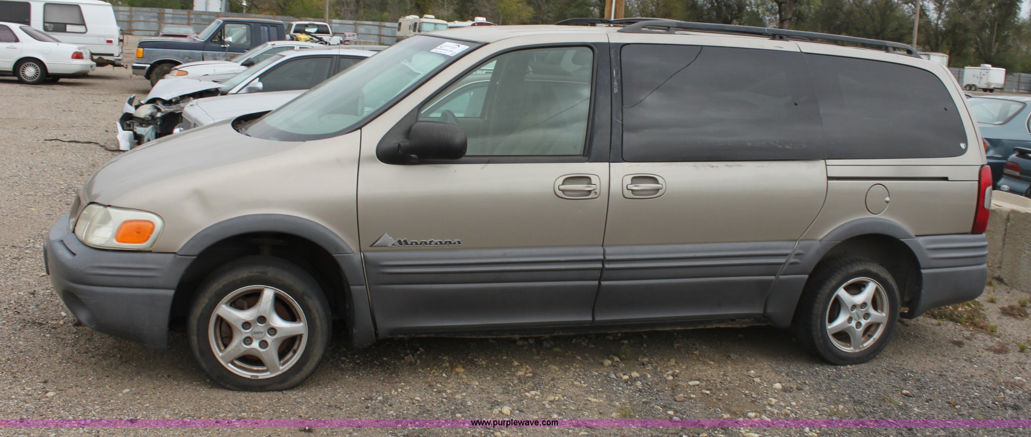 Purple Wave is selling a used Wrecked and Abandoned in Kansas. This item is a 1999 Pontiac Montana minivan with the following: 3.4L V6 SFI gas engine, Automatic transmission, AC and heat, Tilt, Cruise, AM/FM/cassette, Power windows, locks, and mirrors, Cloth interior, 185/65R15 tires, Interior/exterior cosmetic damage, Vehicle locked, Paint peeling, Body damage to rear hatch, Case# 12C049823