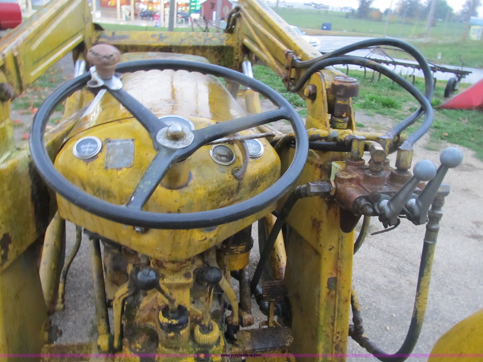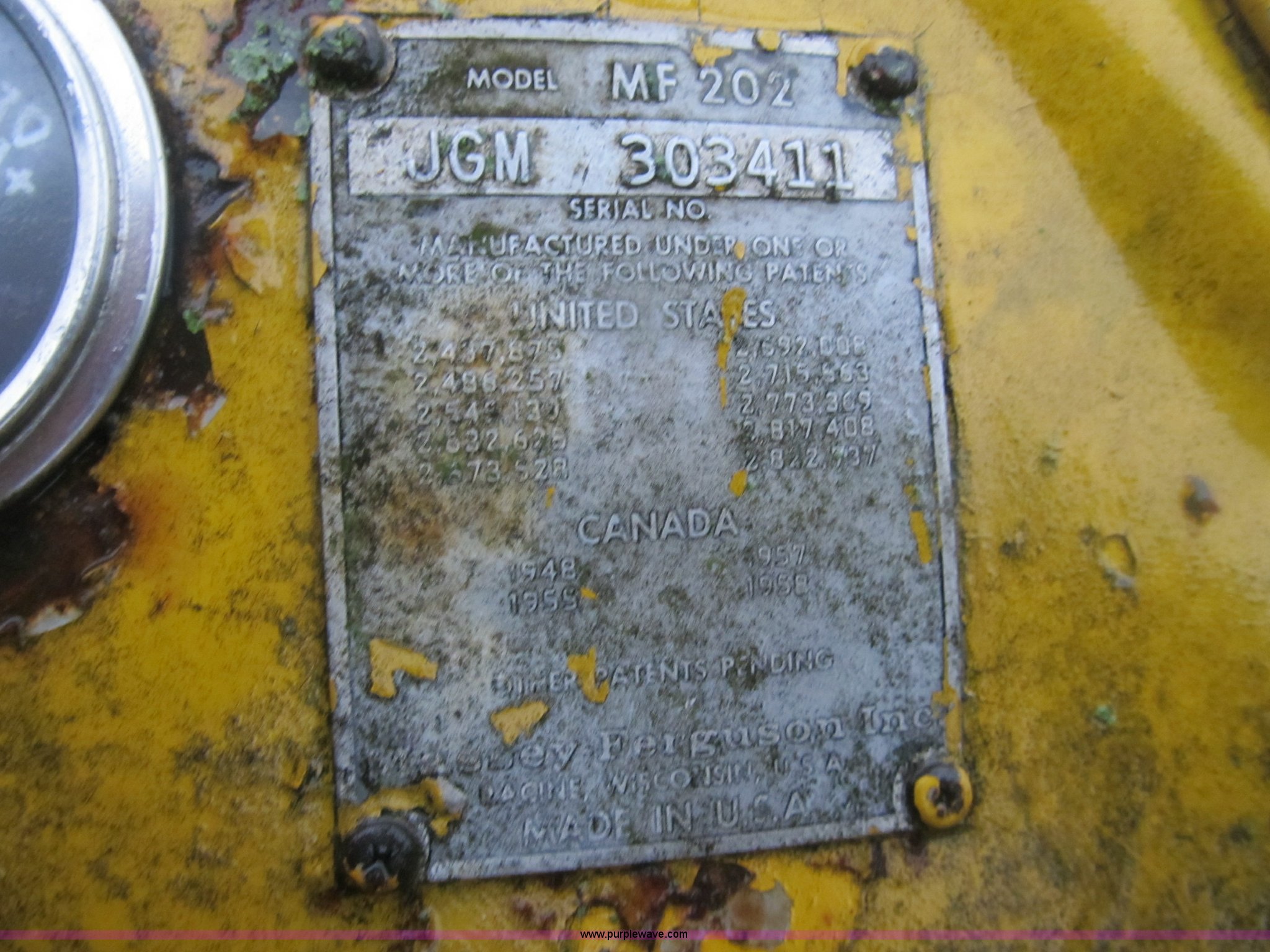 Purple Wave is selling a used Tractor in Missouri. This item is a 1959 Massey-Ferguson 202 Industrial Work Bull tractor with the following: 1,277 hours on meter, Continental 2134 four cylinder gas engine, 35 HP, Serial 6854, Manual transmission, 6F-2R gears, Power steering, Massey Ferguson 99 loader, Serial 32191, GP 60" bucket, Two-lever control, Three point hitch with top link, Draw bar, 540 PTO, 7.00-16 front tires, 16.9-24 rear tires, Recently replaced battery, power steering hose, and starter solenoid, Fresh tune-up, Rebuilt front hydraulic pump, Fresh hydraulic fluid, Slight exhaust leak, Serial JGM303411
