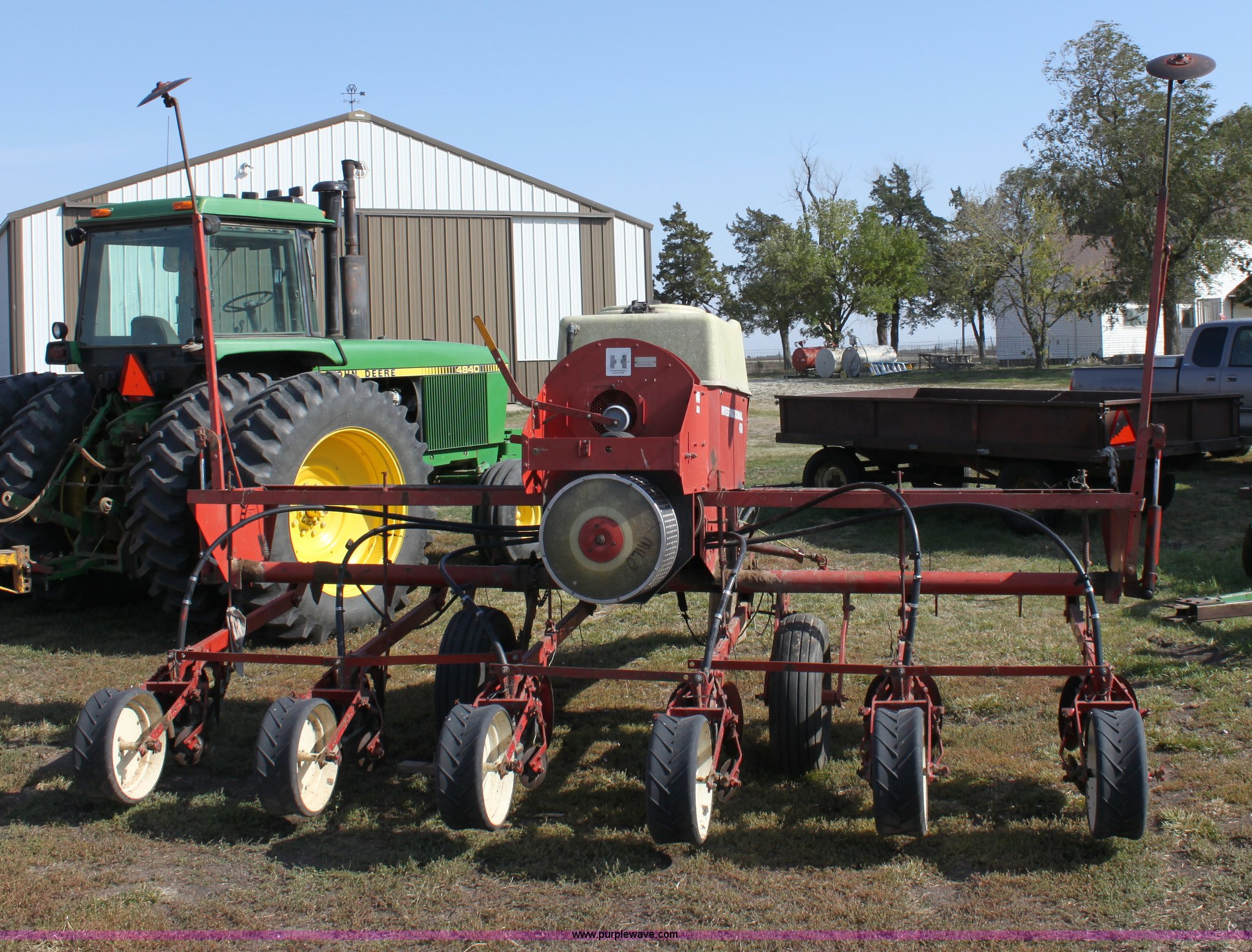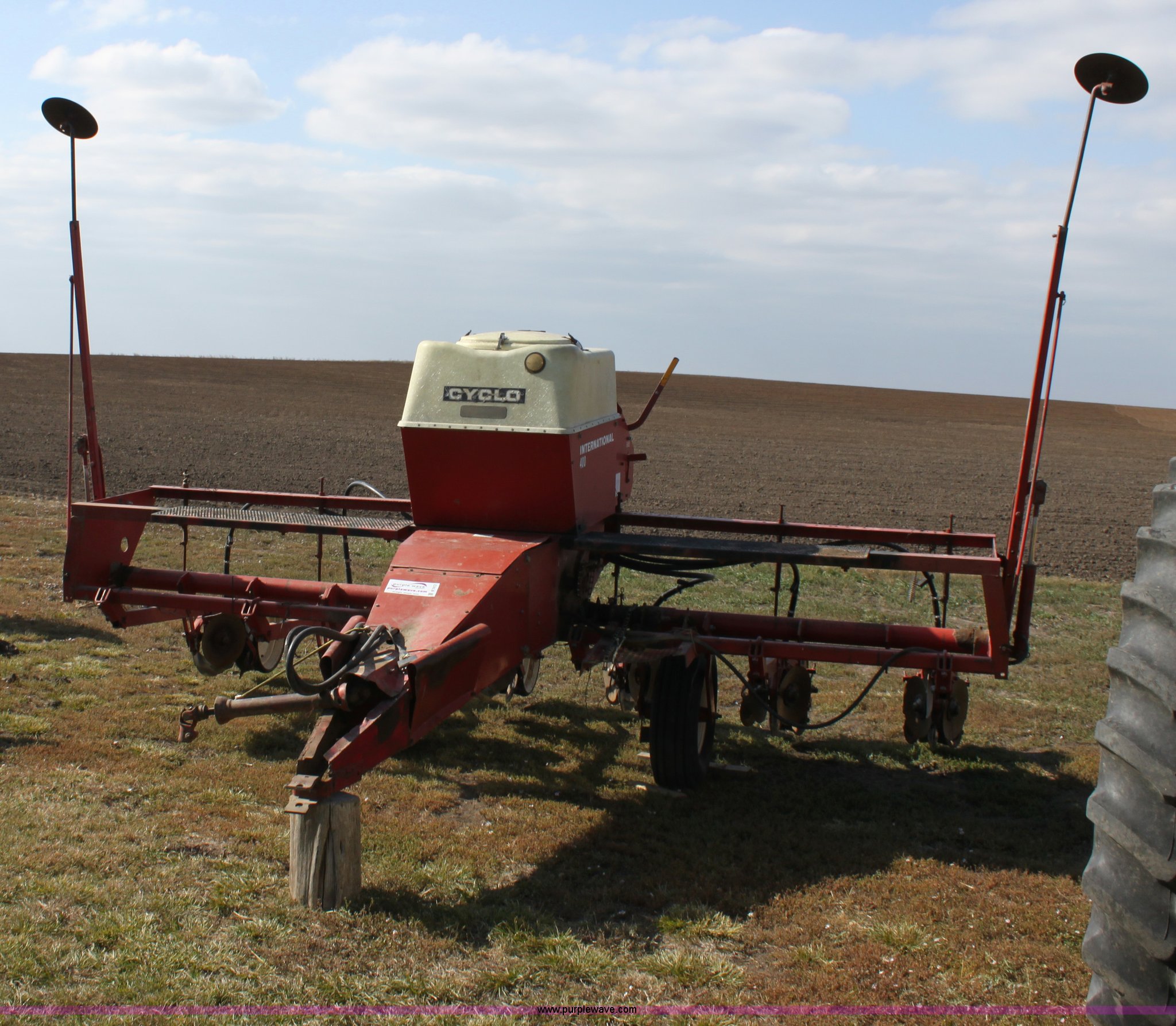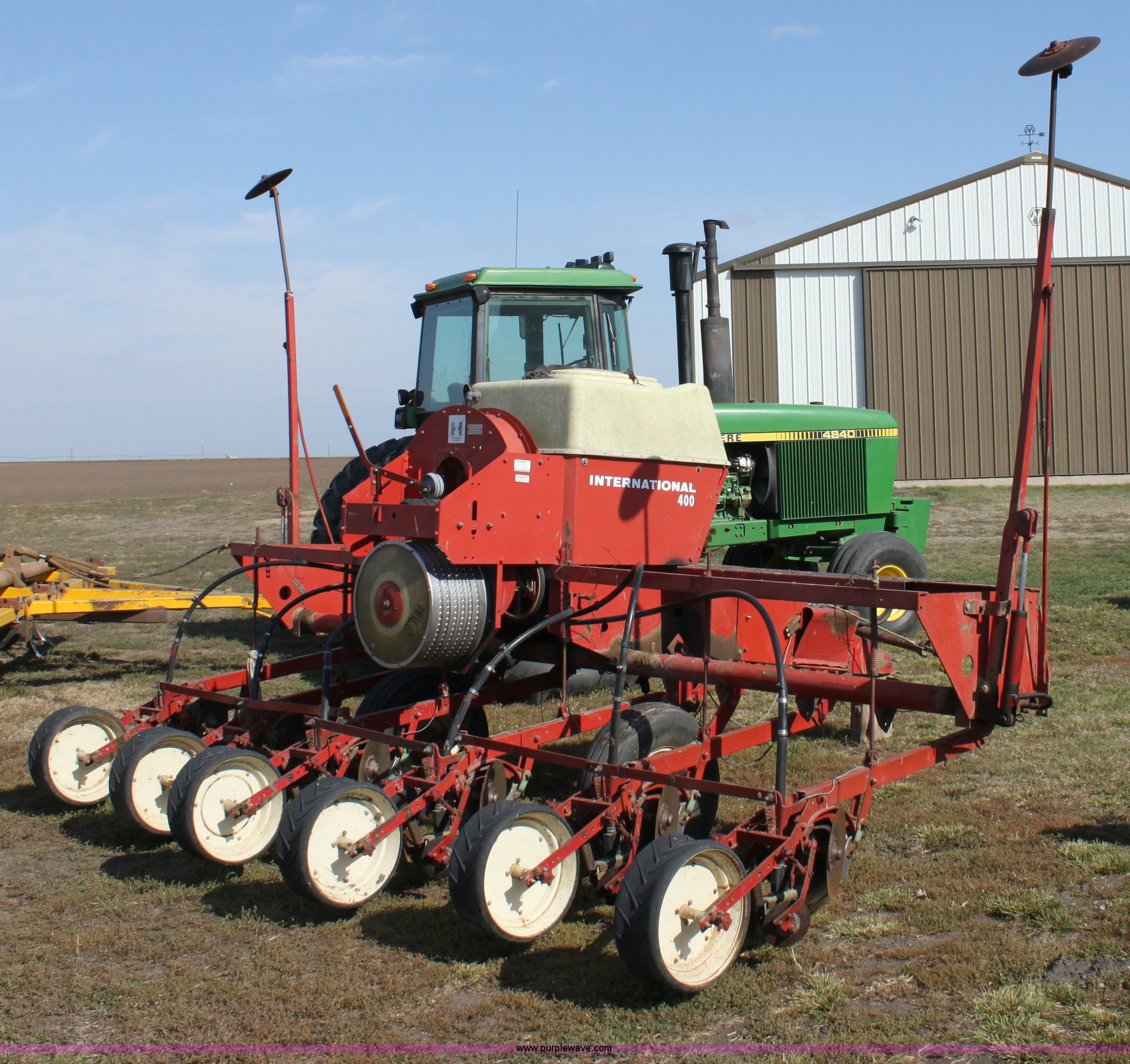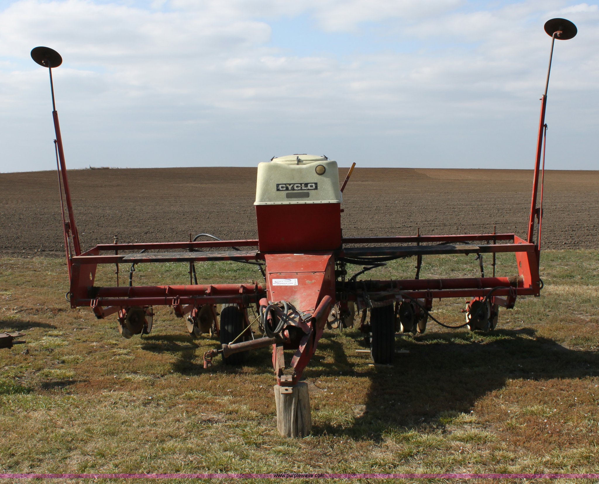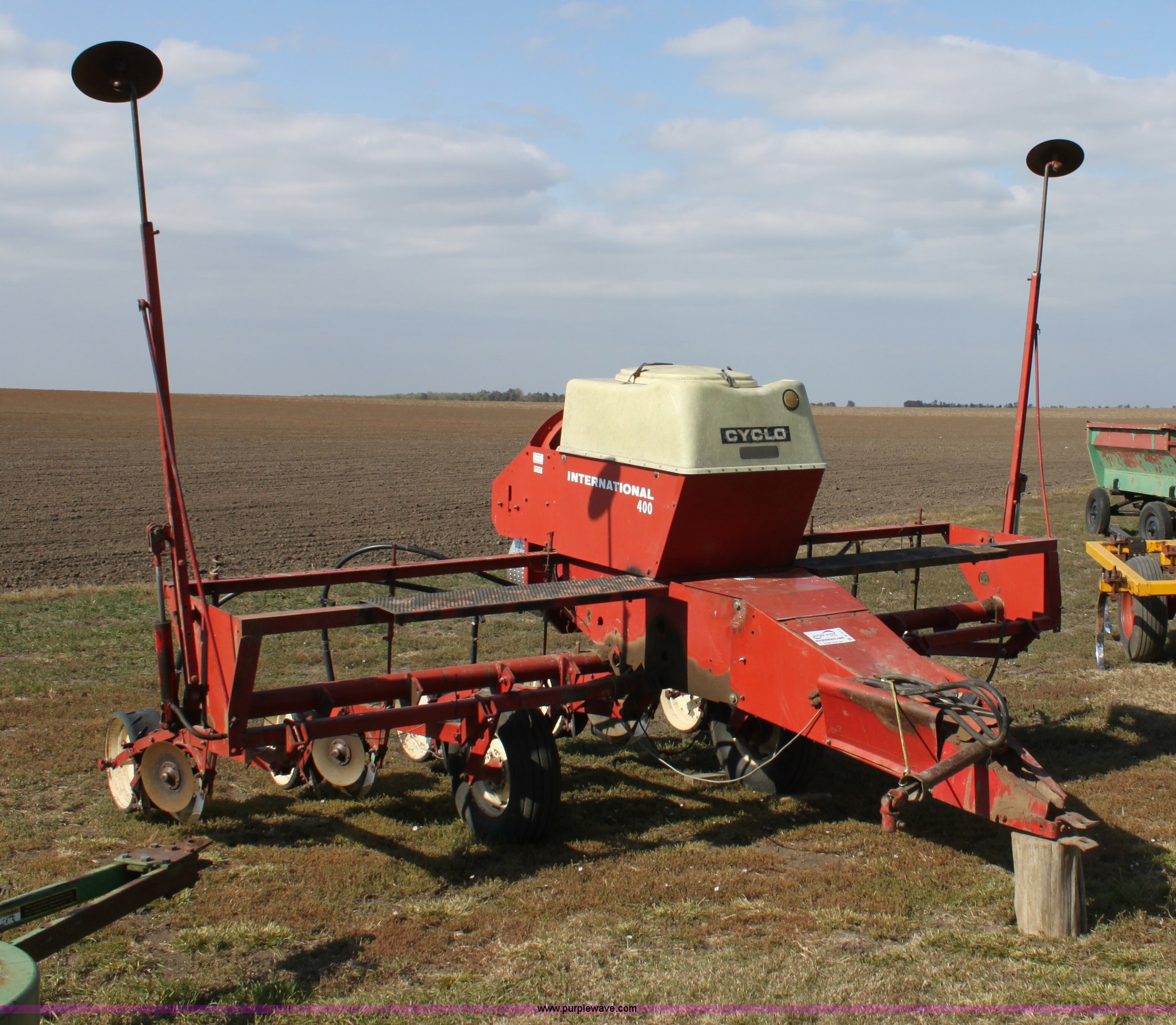Purple Wave is selling a used Planter in Kansas. This item is a International 400 Cyclo planter with the following: Six row, 30" spacing, Double disk openers, Ground driven metering system, Dual side markers, Hydraulic height adjustment, Pin hitch, Corn, bean, and milo drums