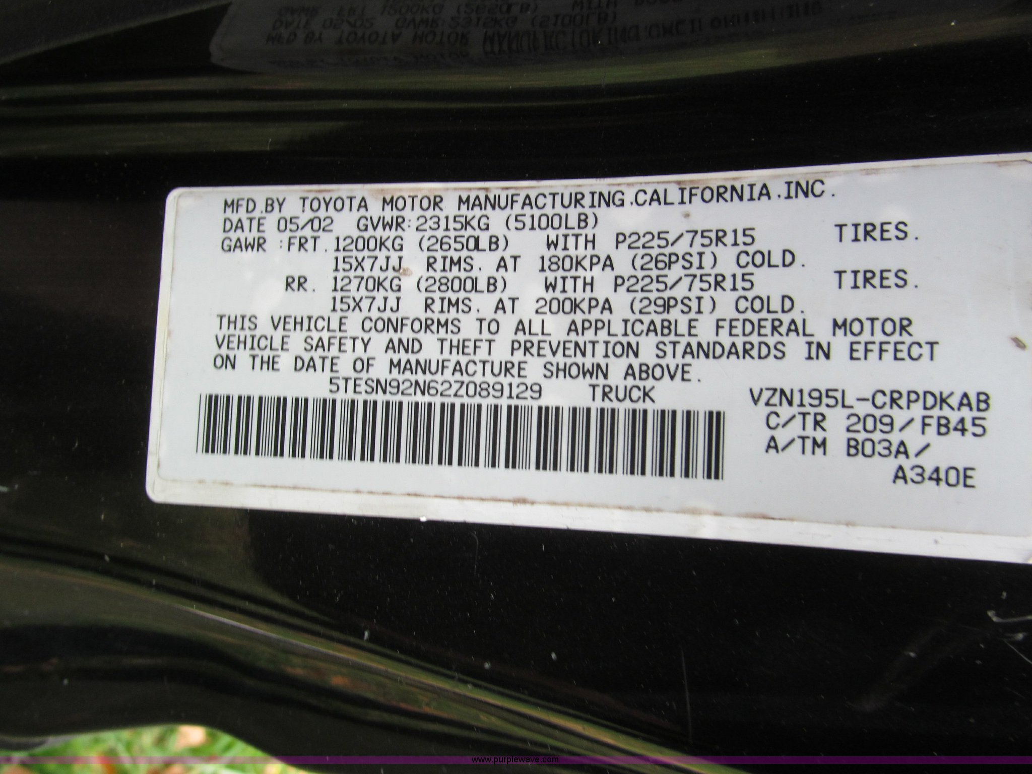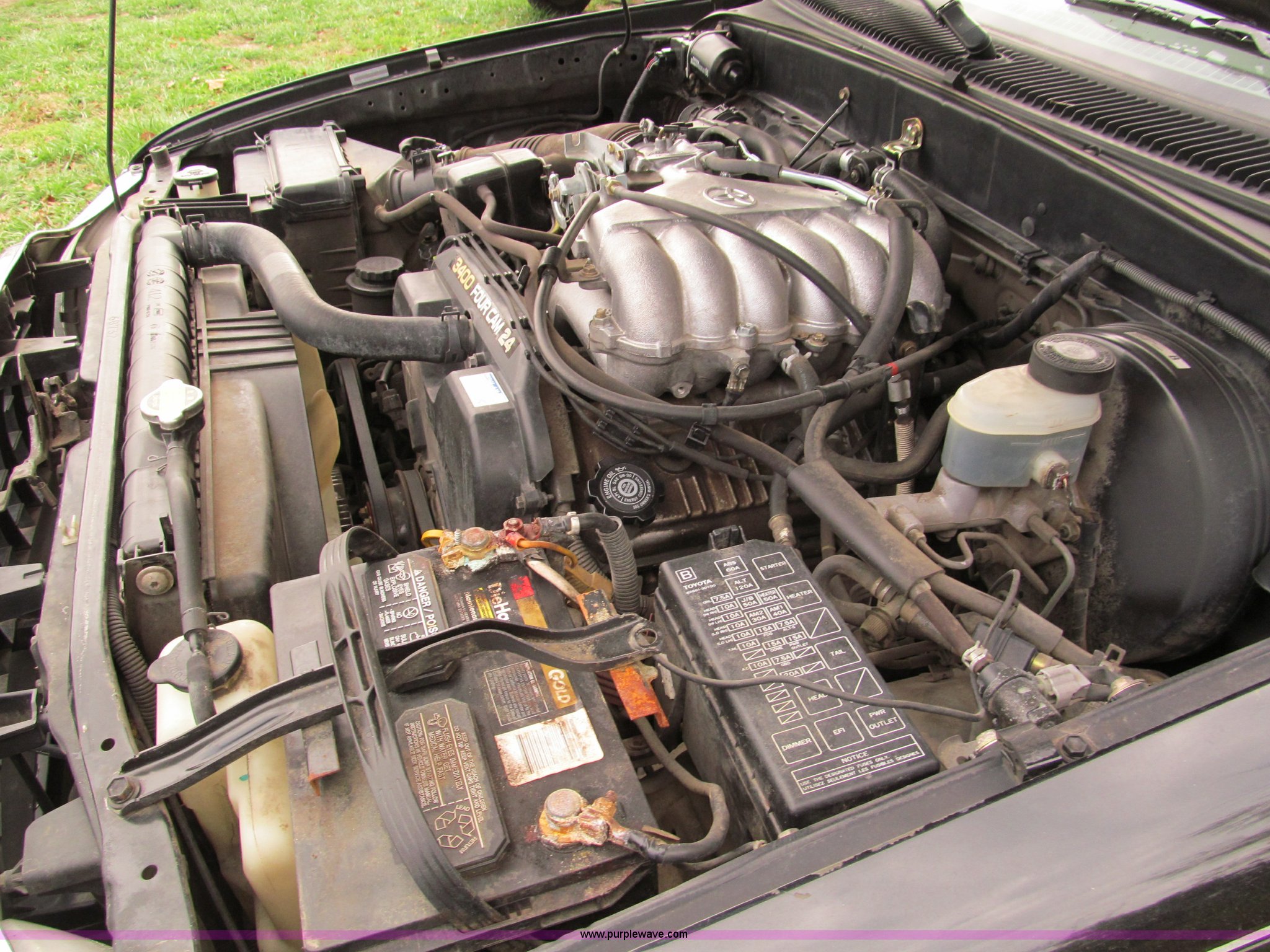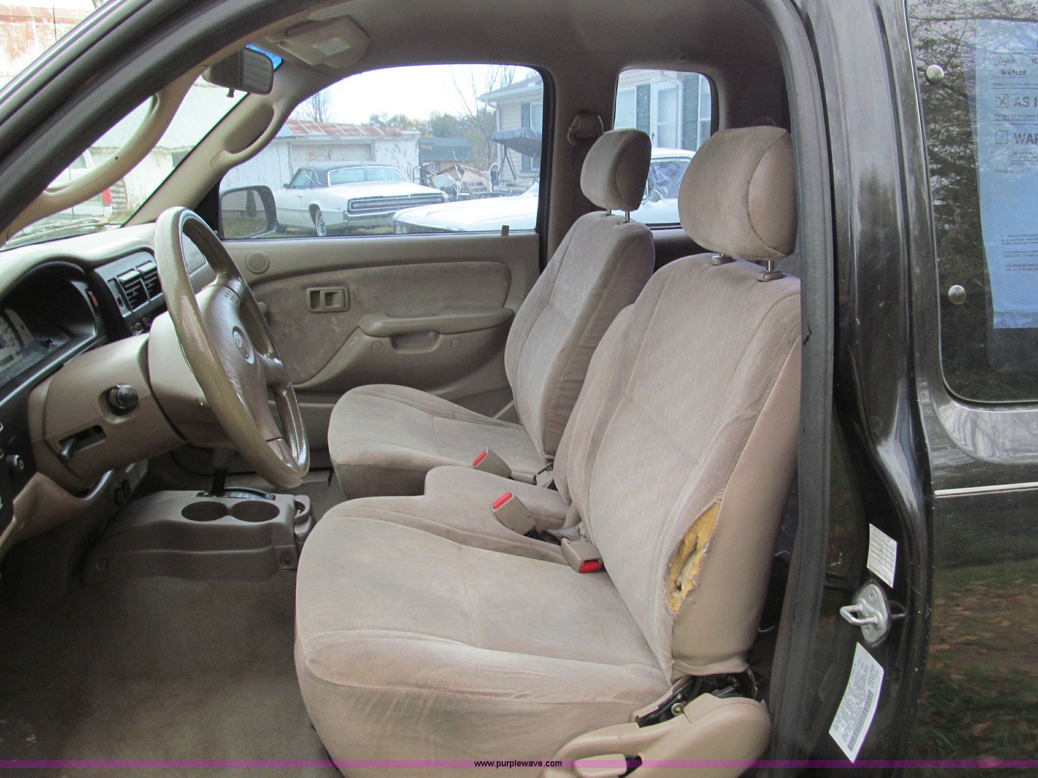 Purple Wave is selling a used Compact Pickup or Van in Missouri. This item is a 2002 Toyota Tacoma Prerunner SR5 Xtra Cab pickup truck with the following: 152,628 actual miles, 3.4L V6 EFI gas engine, Automatic transmission, AC and heat, Tilt, AM/FM/CD/cassette, Manual windows and locks, Cloth interior, Tinted windows, Keyless entry, Fender flares, Bed liner, Receiver hitch, Trailer wiring, Aluminum wheels, 265/70R16 tires, Dents and scratches