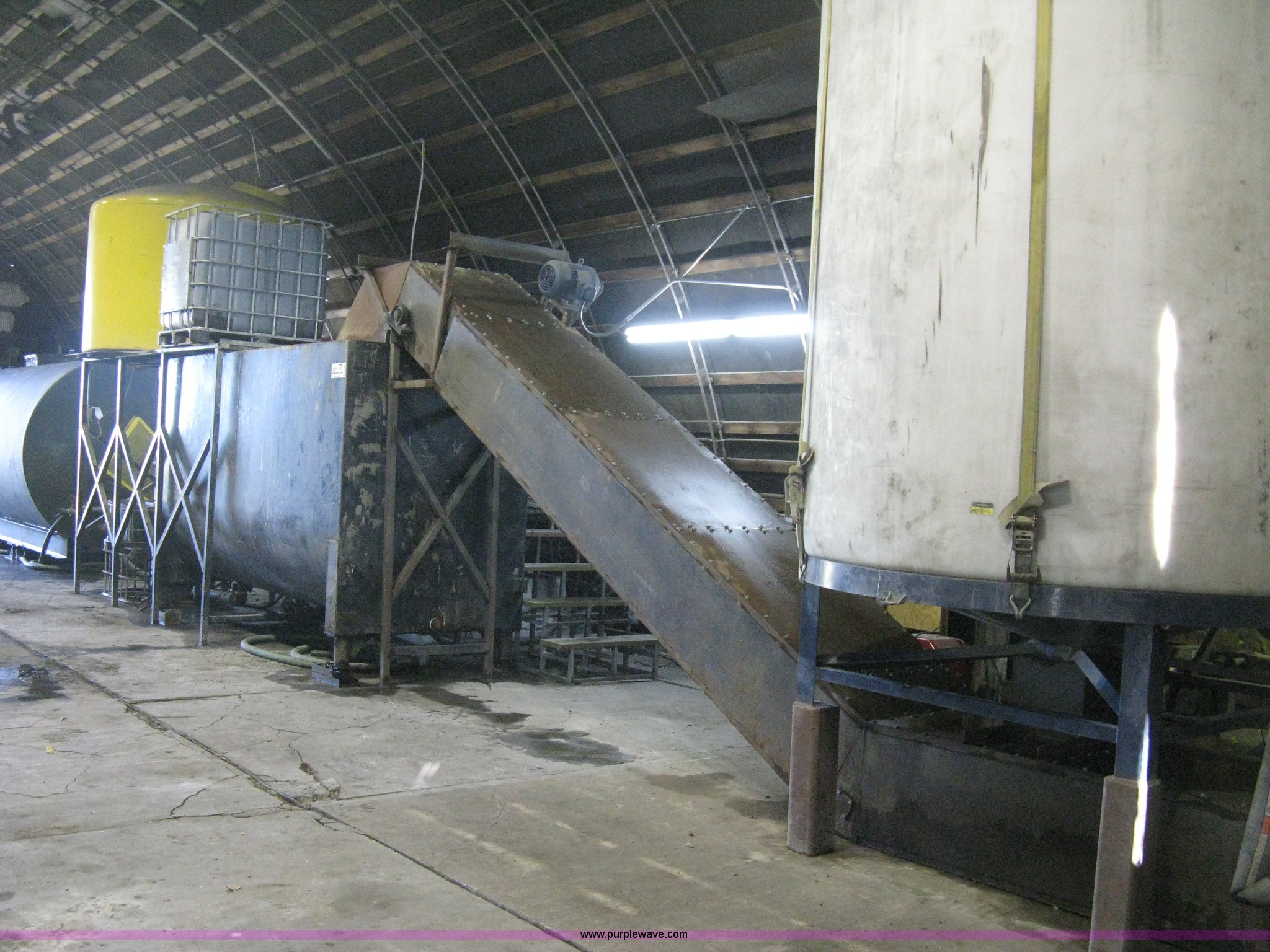 Asphalt seal coating plant. (2) 3,000 gallon aggregate bins Poly construction, On stands, Gravity flow trap doors Drill motor activated, (2) Kice CE18LH 18" cyclones, (14) dust control bags per bin, 4" pneumatic material transfer hose, Ratchet strap tie downs, Aggregate conveyor system Leeson 7.5 HP three phase electric motor, 30" flat bottom belt, Adjustable belt tensioner Twin belt 4-1 reduction, 14'L flat bottom, 16'L incline, 36"W, 9.4'H at blender, 4'L access doors on incline leg, Chemical tote stand atop conveyor, 3,000 gallon Ribbon blender/hydraulic drive 12'L x 7.5'H x 5'W, (4) scale heads under legs Digi-Star EZ400 electronic scale monitor, Work platform 5' x 9', Staircase, Water outlet, (4) 110V electric outlets and junction box, Water and storage chemical stand Holds two 275 gallon chemical totes, Hose/valve drops to blender, 1,500 gallon water tank Auto top fill, (2) 3" outlets with valves, Mounted on 8'H stand, Hydraulic power pack for blender and tank Control valve, Cooling bath container, 8,000 gallon steel storage tank 10.5" I-beam skids, 22'L x 8'H, Hydraulic drive agitation system, John Blue 3" transfer pump Honda GX390 gas engine Electric start, Mounted on four scale platforms Mettler Toledo 100,000 lb digital scale monitor, Ladder access, 30" access lid, 24" x 24" clean-out panel, 10,000 gallon emulsion storage tank Dayton centrifugal pump Automatic circulation valves with control timer, Lenze AC Tech variable speed controller for hydraulic system Single or three phase, Lenze AC Tech variable speed controller for conveyor Single or three phase, Plant in operation. Shipping quotes available. CPB Materials. 5114 W 87th St. South. Haysville, KS 67060