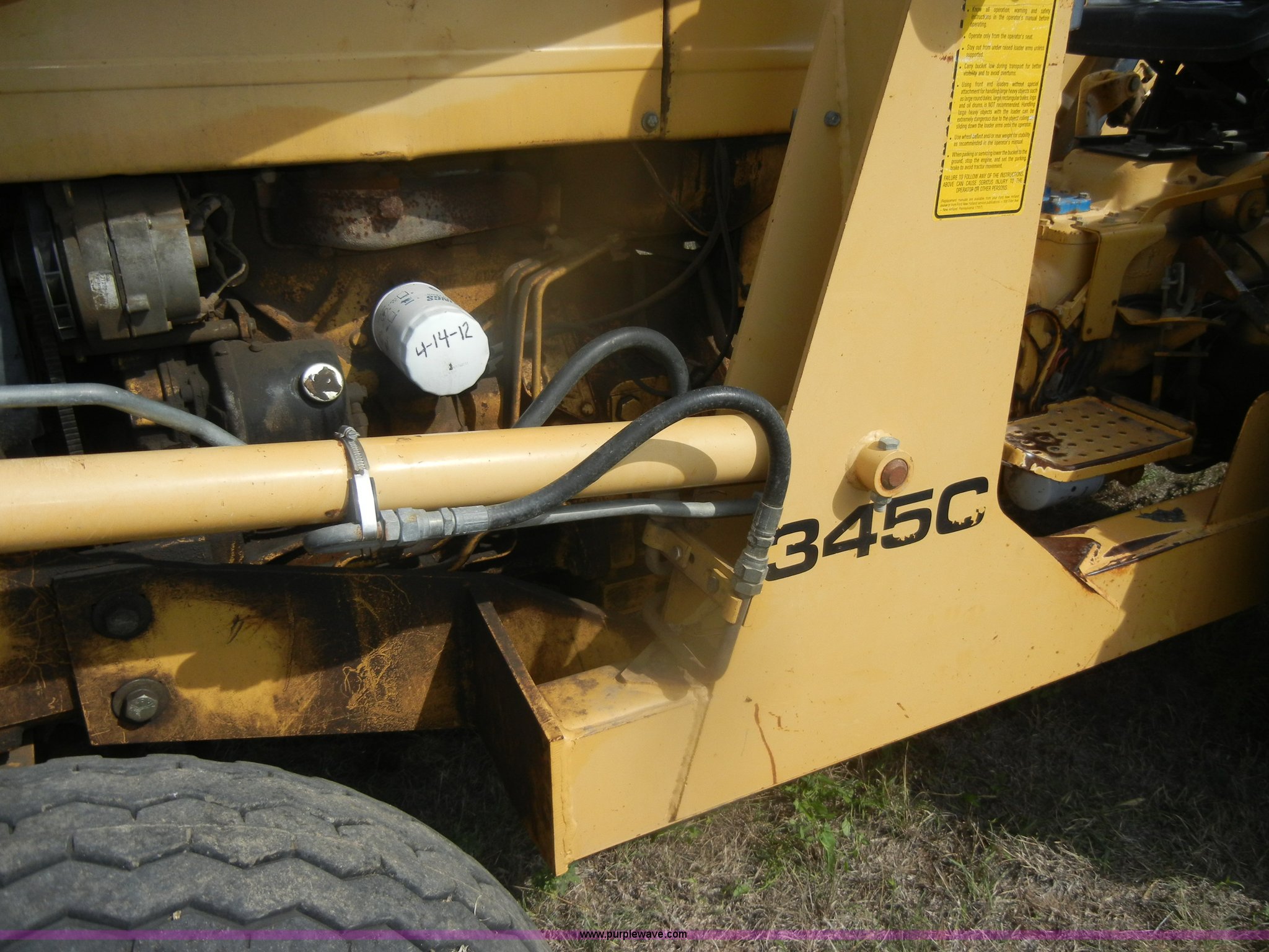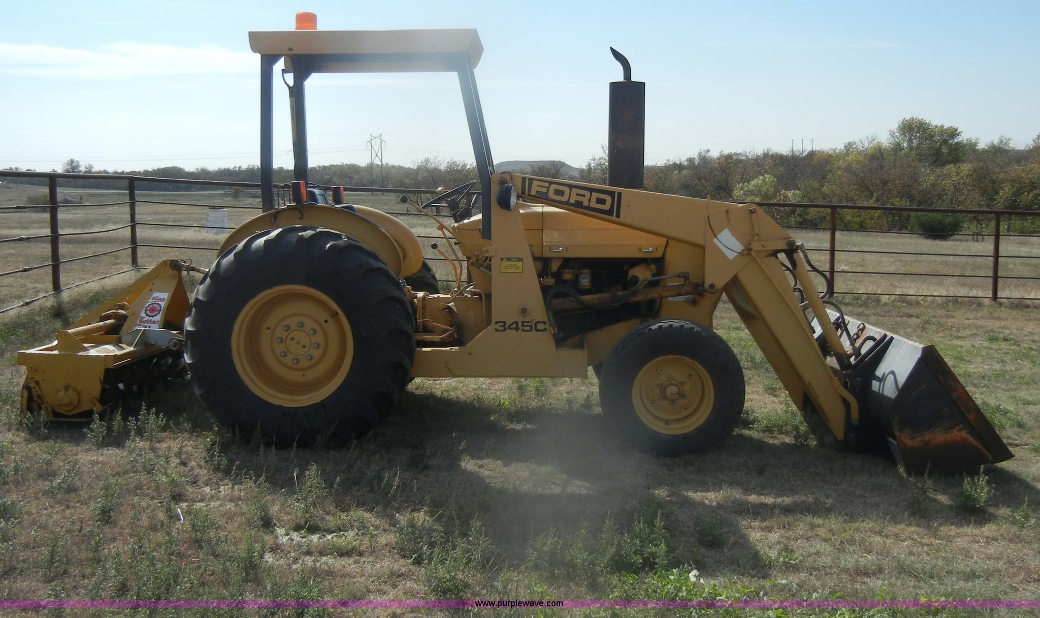 Purple Wave is selling a used Tractor in Kansas. This item is a Ford 345C tractor with the following: 1,532 hours on meter, Ford three cylinder diesel engine, 52 HP, Serial C2644V30F28A, Manual transmission, 8F-2R gears, Canopy, Loader with 83"W bucket, Smooth edge, Three point, 540 PTO, 11L-16 front tires, 16.9-24 rear tires, Tiller not included, Serial A412730