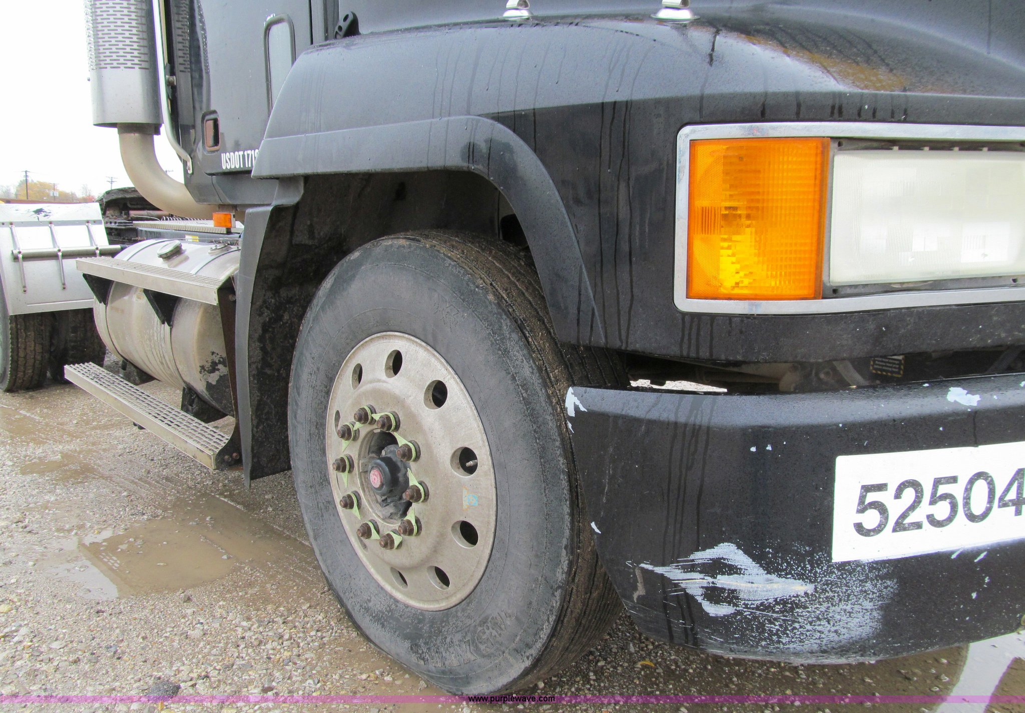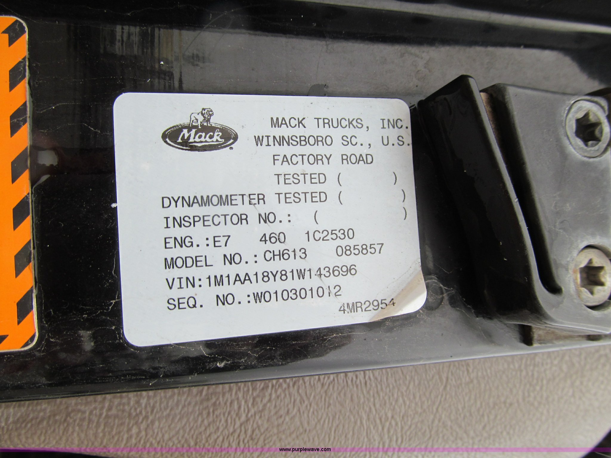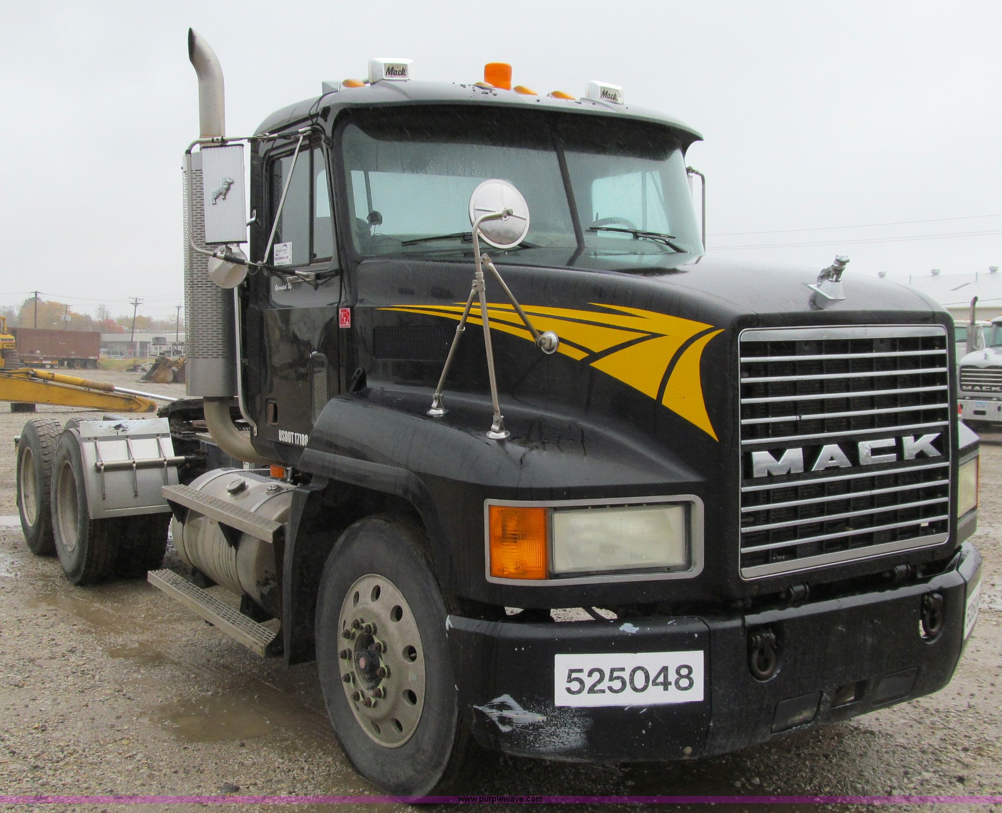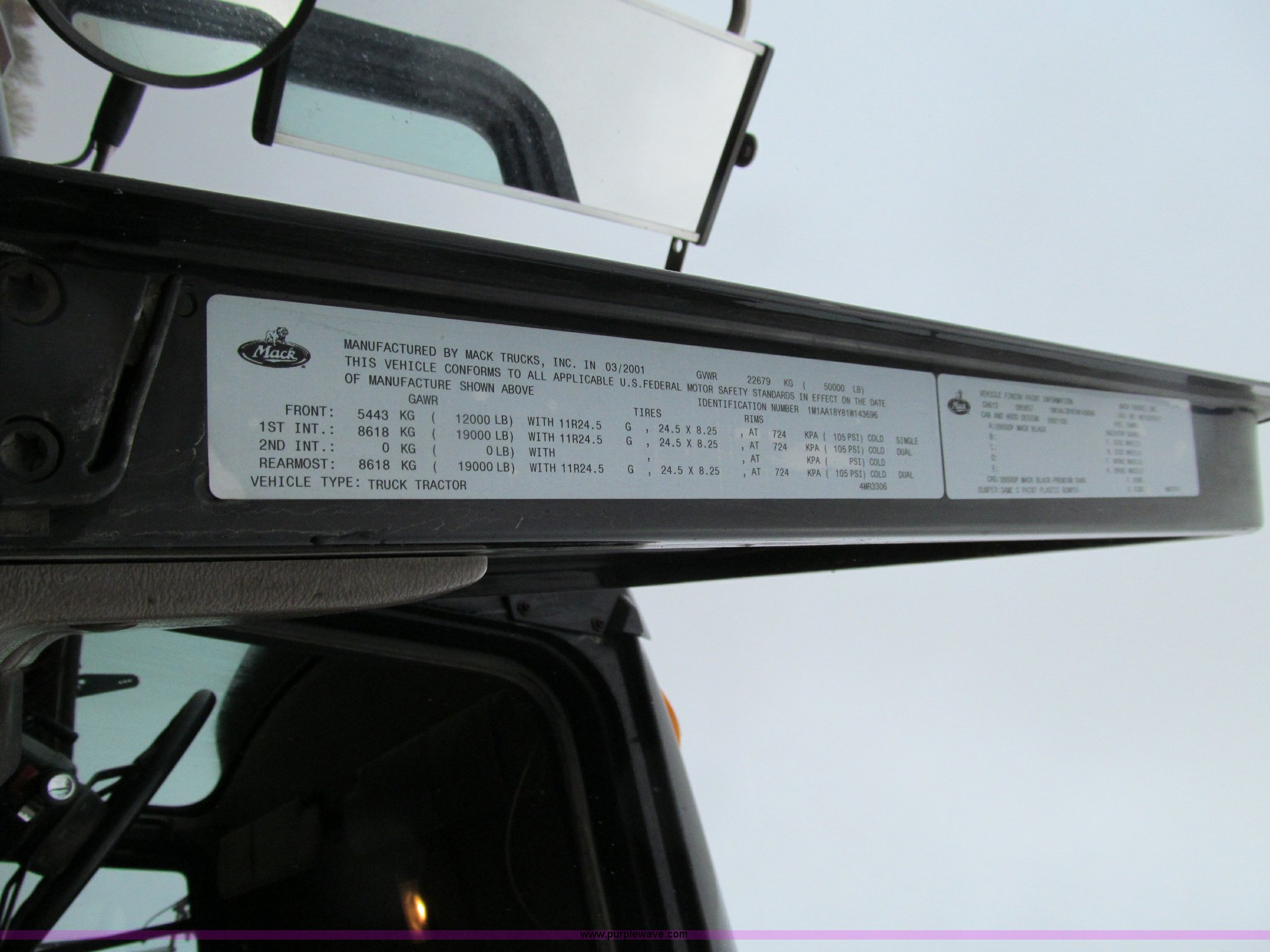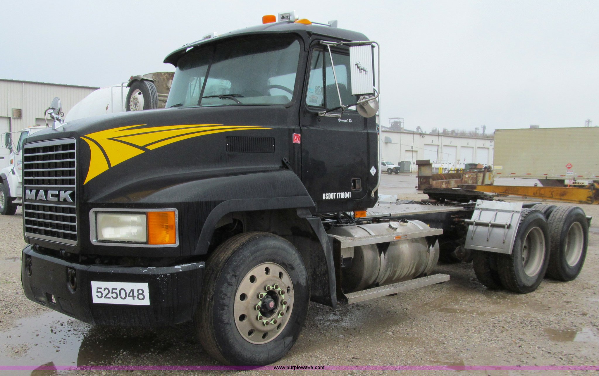 Purple Wave is selling a used Truck Tractor in Iowa. This item is a 2001 Mack CH613 semi truck with the following: 450,105 miles on odometer, 16,865 hours on meter, Mack E7-460 12.0L L6 diesel engine, Fuller 8LL manual transmission, AC and heat, Tilt, Cruise, AM/FM/cassette, Passenger daylight door, Telescoping steering wheel, Air suspension seat, Power windows, Visor, Bumper, Block heater, Dual 96 gallon fuel tanks, Single rear exhaust stack, Aluminum deck plate, Stainless steel quarter fenders, Air slide fifth wheel, Dump valves, Air suspension, Air brakes, Brake controller, Mack Carriers inter-axle differential, 4.17 gear ratio, 208" wheelbase, Aluminum Budd wheels, 11R24.5 tires, GVWR 50,000 lbs, FAWR 12,000 lbs, IAWR 19,000 lbs, RAWR 19,000 lbs, Unit# 525048