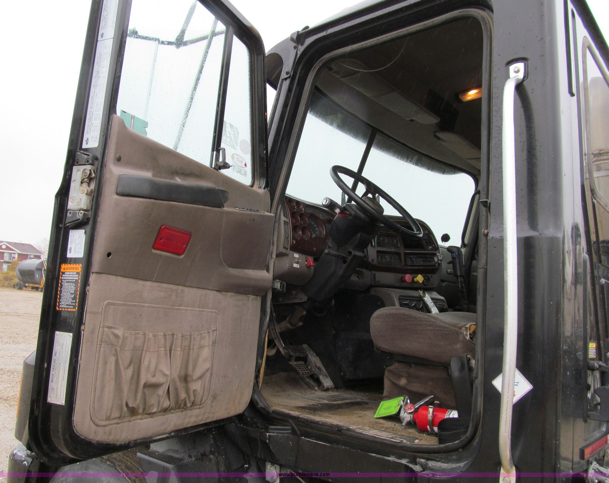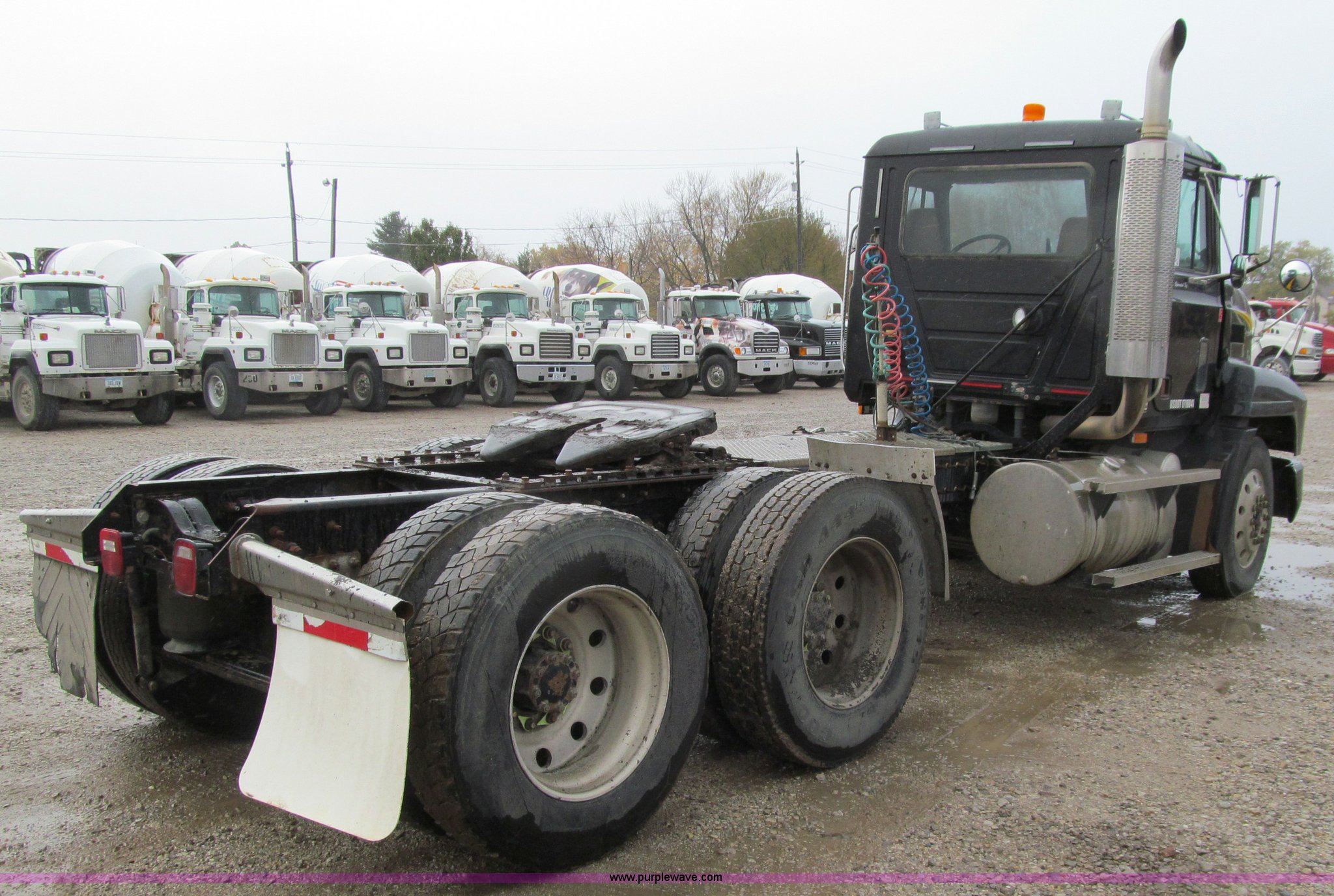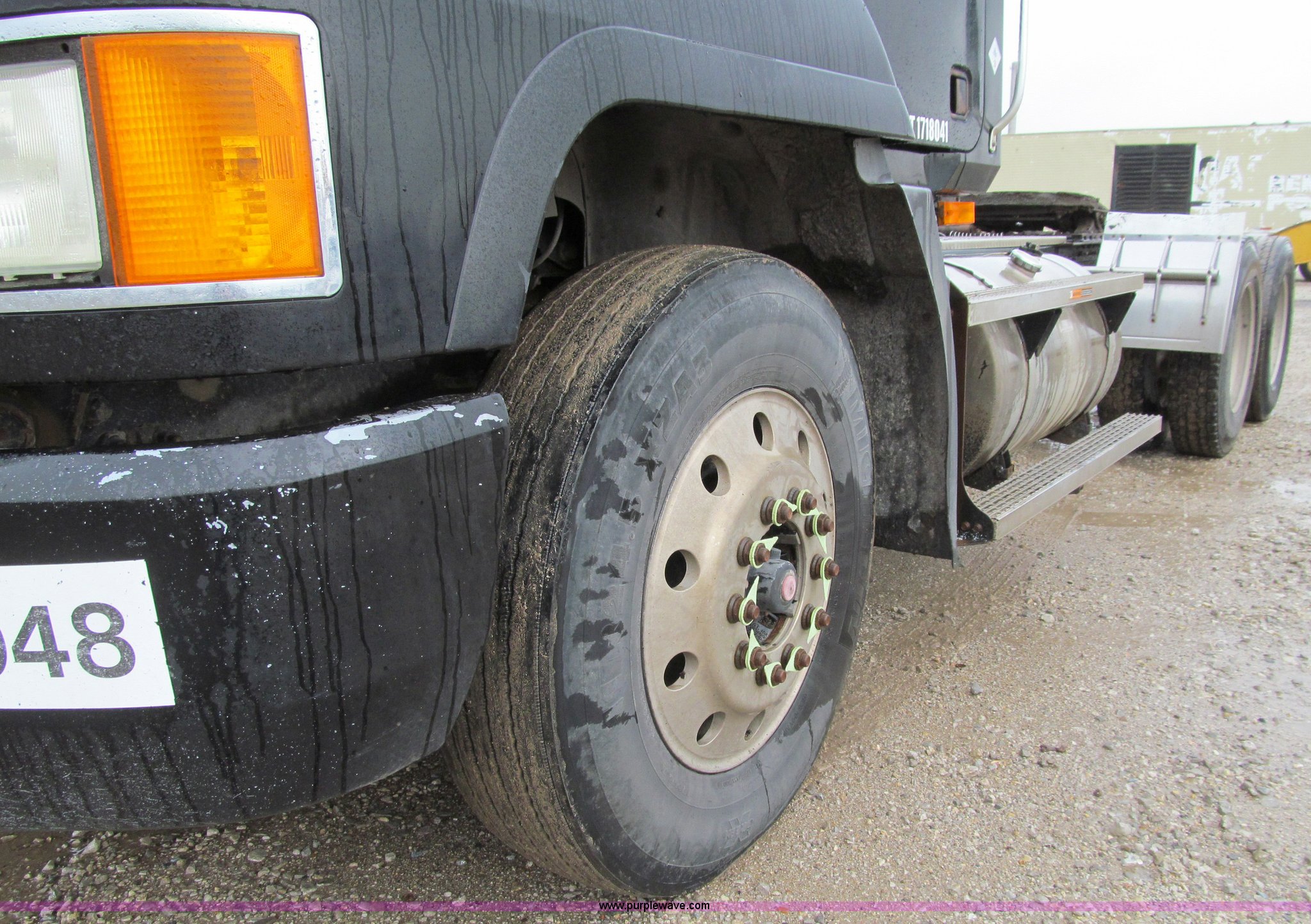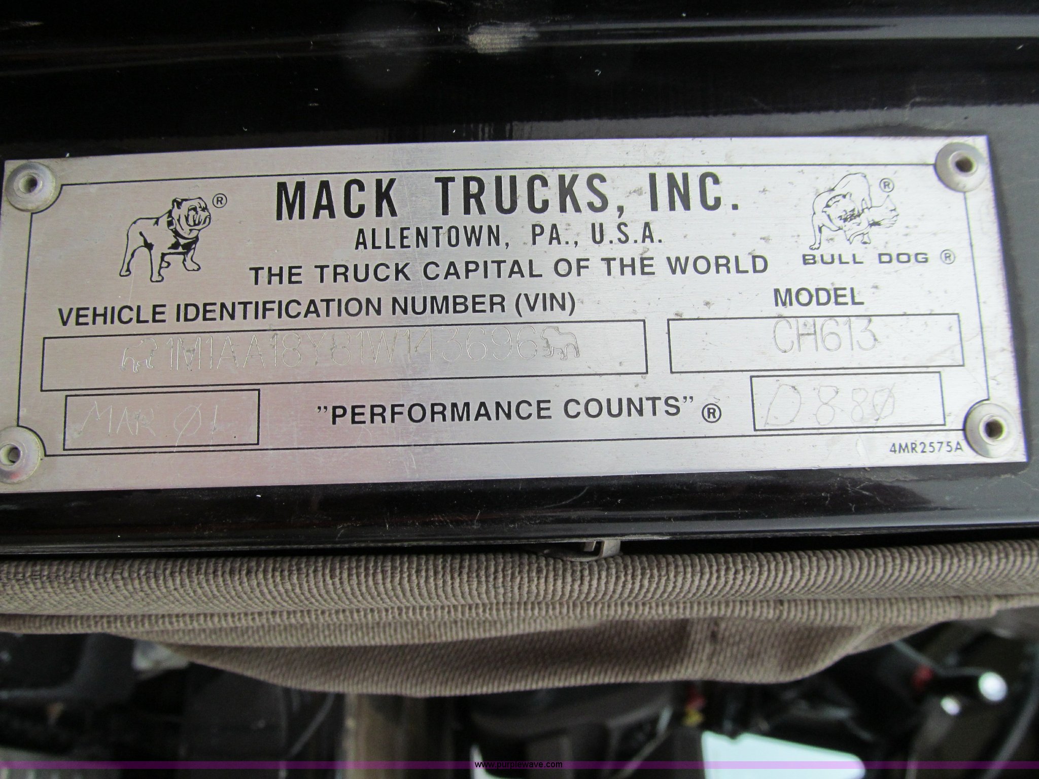 Purple Wave is selling a used Truck Tractor in Iowa. This item is a 2001 Mack CH613 semi truck with the following: 450,105 miles on odometer, 16,865 hours on meter, Mack E7-460 12.0L L6 diesel engine, Fuller 8LL manual transmission, AC and heat, Tilt, Cruise, AM/FM/cassette, Passenger daylight door, Telescoping steering wheel, Air suspension seat, Power windows, Visor, Bumper, Block heater, Dual 96 gallon fuel tanks, Single rear exhaust stack, Aluminum deck plate, Stainless steel quarter fenders, Air slide fifth wheel, Dump valves, Air suspension, Air brakes, Brake controller, Mack Carriers inter-axle differential, 4.17 gear ratio, 208" wheelbase, Aluminum Budd wheels, 11R24.5 tires, GVWR 50,000 lbs, FAWR 12,000 lbs, IAWR 19,000 lbs, RAWR 19,000 lbs, Unit# 525048