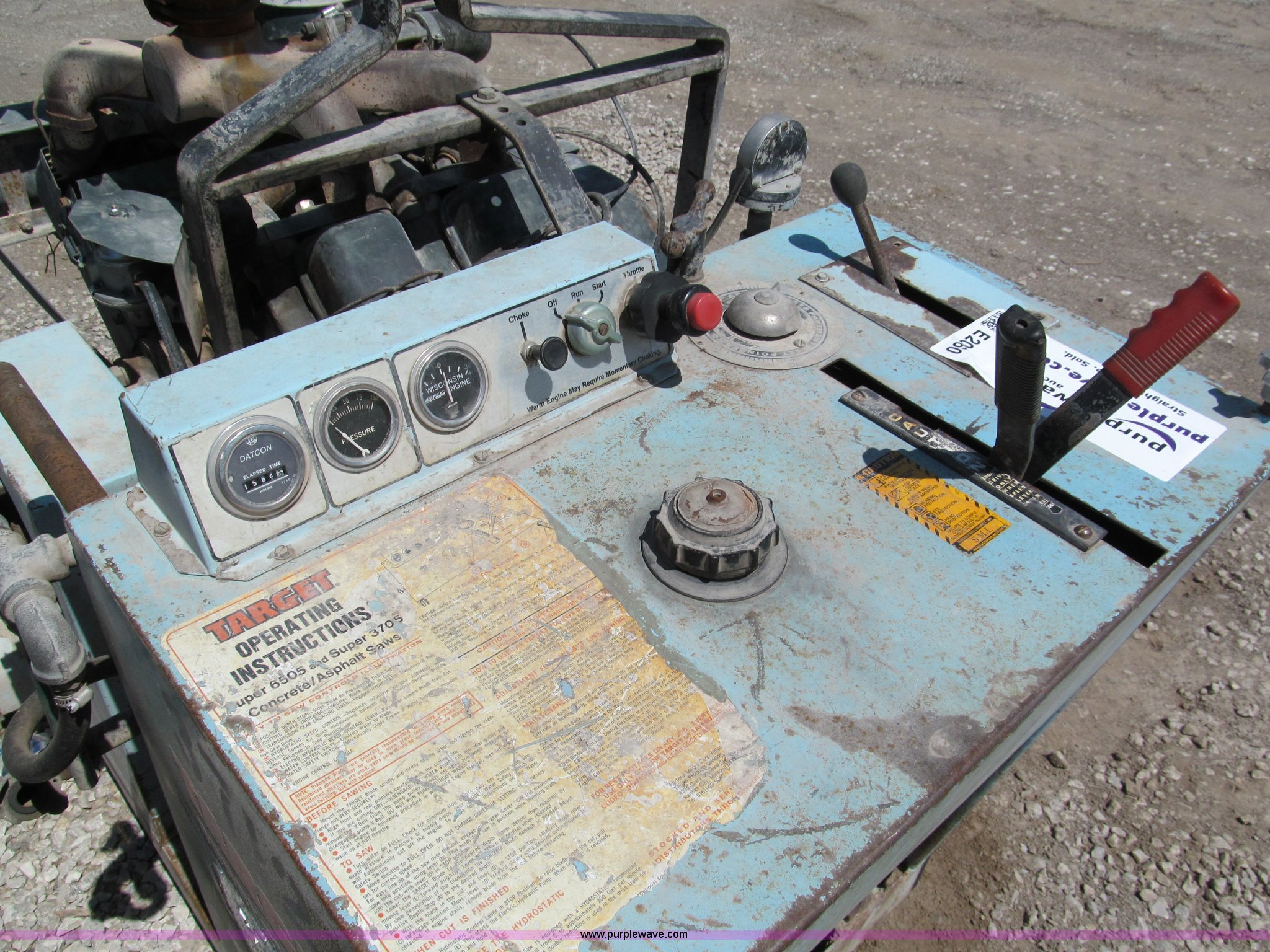 Purple Wave is selling a used Concrete Equip. or Acces. in Missouri. This item is a Target walk-behind concrete saw with the following: 1,582 hours on meter, Wisconsin four cylinder gas engine, 65 HP, Self-propelled, Lifting eye, 28" blade capacity, Water system, Unknown operating condition, Serial 6505QM300BC-8608E