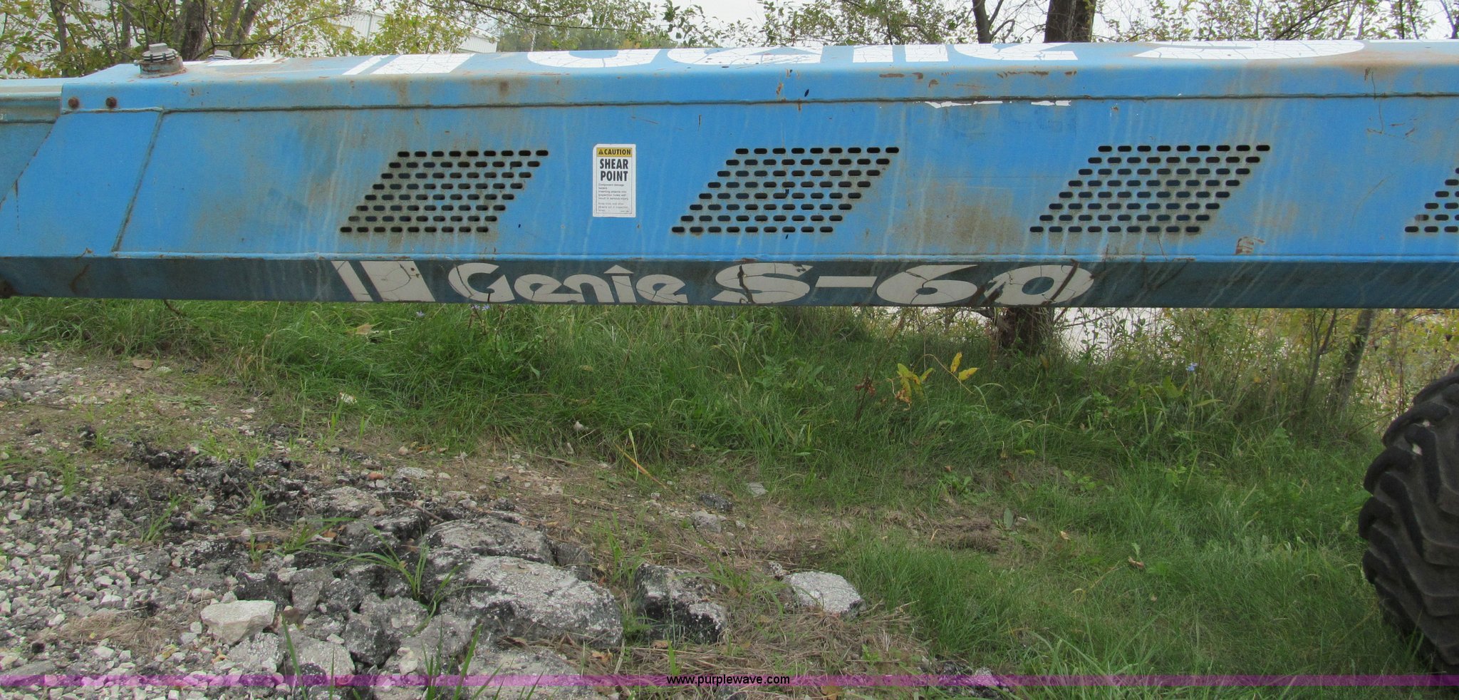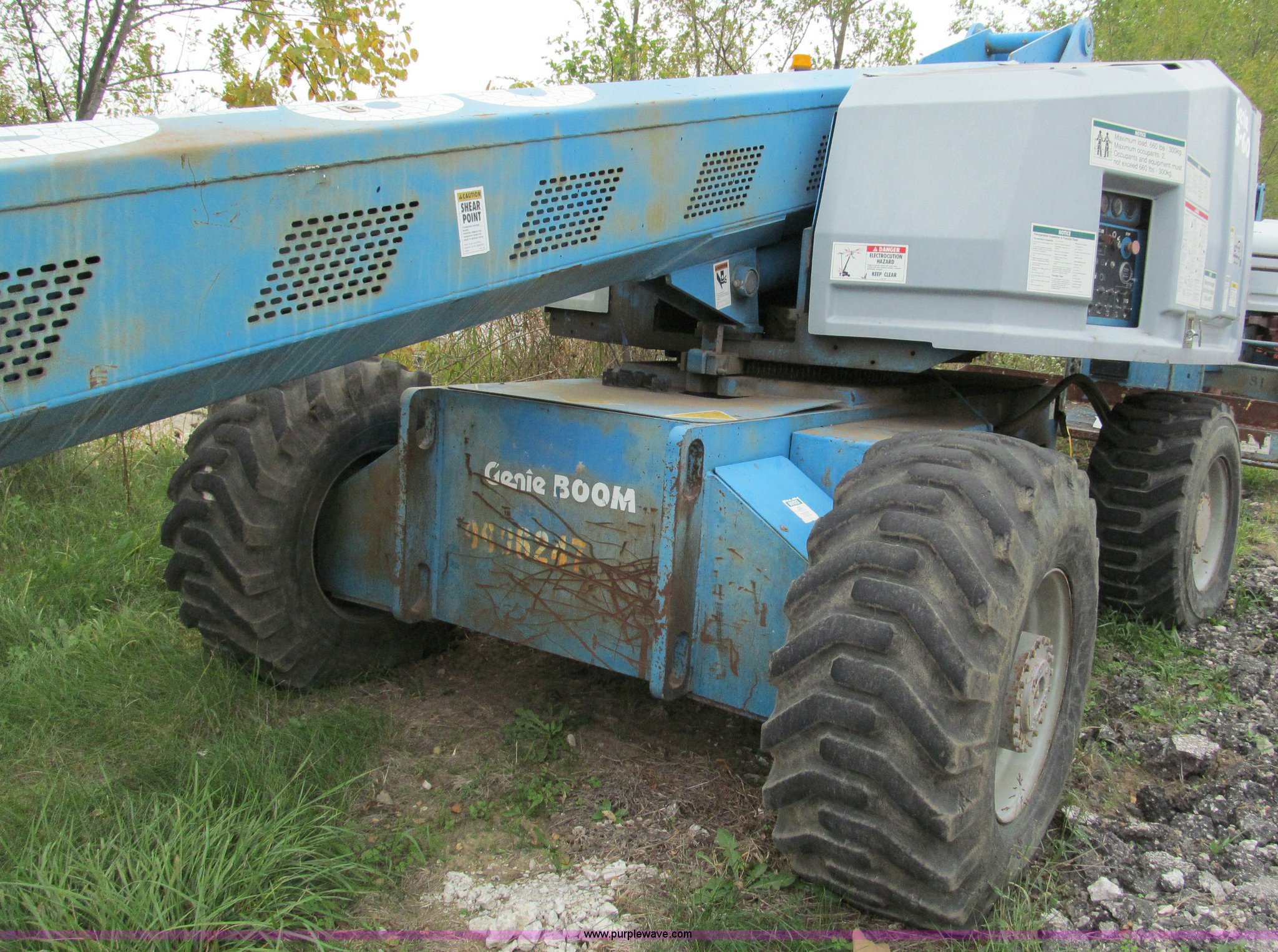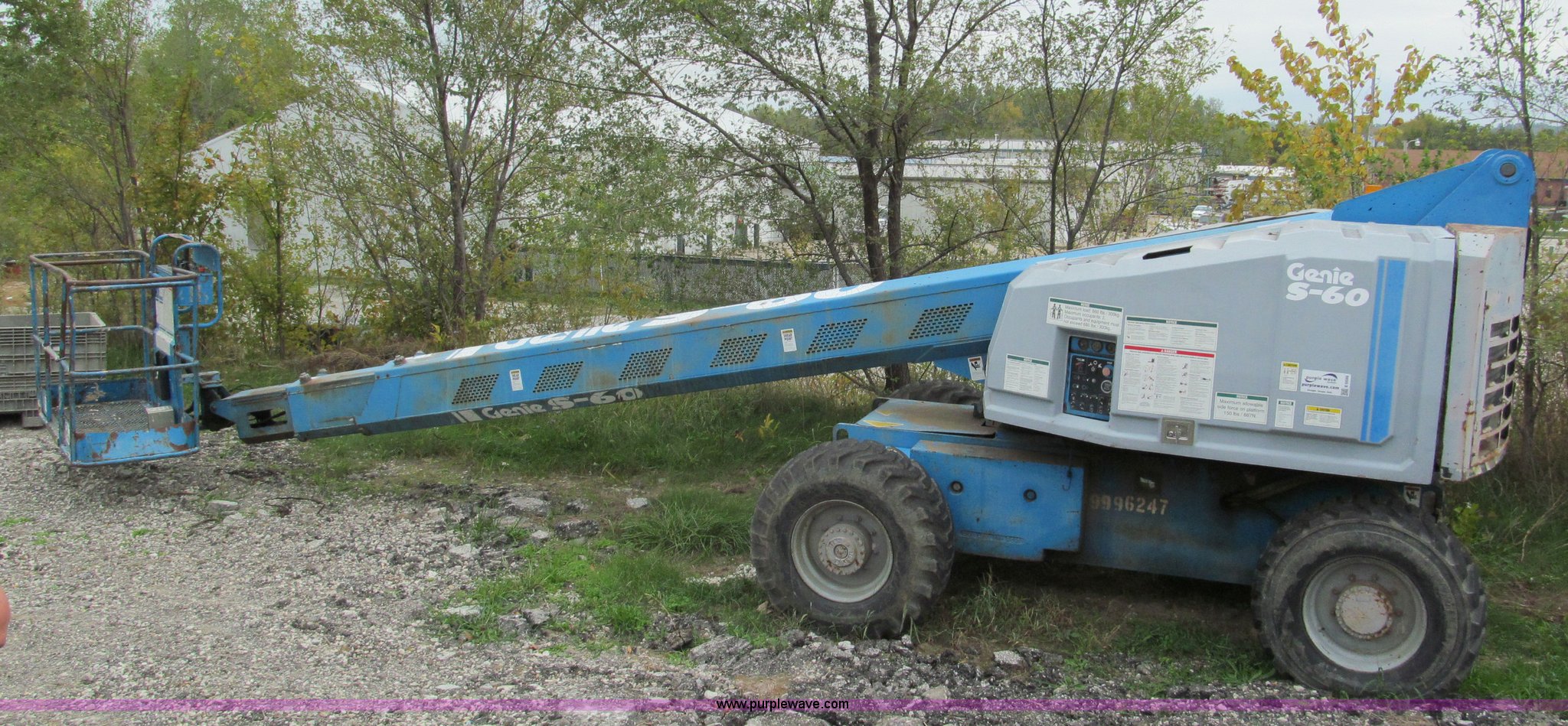 Purple Wave is selling a used Boom Lift in Missouri. This item is a 1994 Genie S60 boom lift with the following: 2,665 hours on meter, Hours meter replaced at 3,136 hours, 5,801 total hours, Deutz diesel engine, Four wheel drive, Upper and lower controls, 60' max platform reach, 70" x 3' platform, Power to platform, 660 lbs lift capacity, 25,900 lbs. base operating weight, Operational, track bracket needs repair, Serial 538